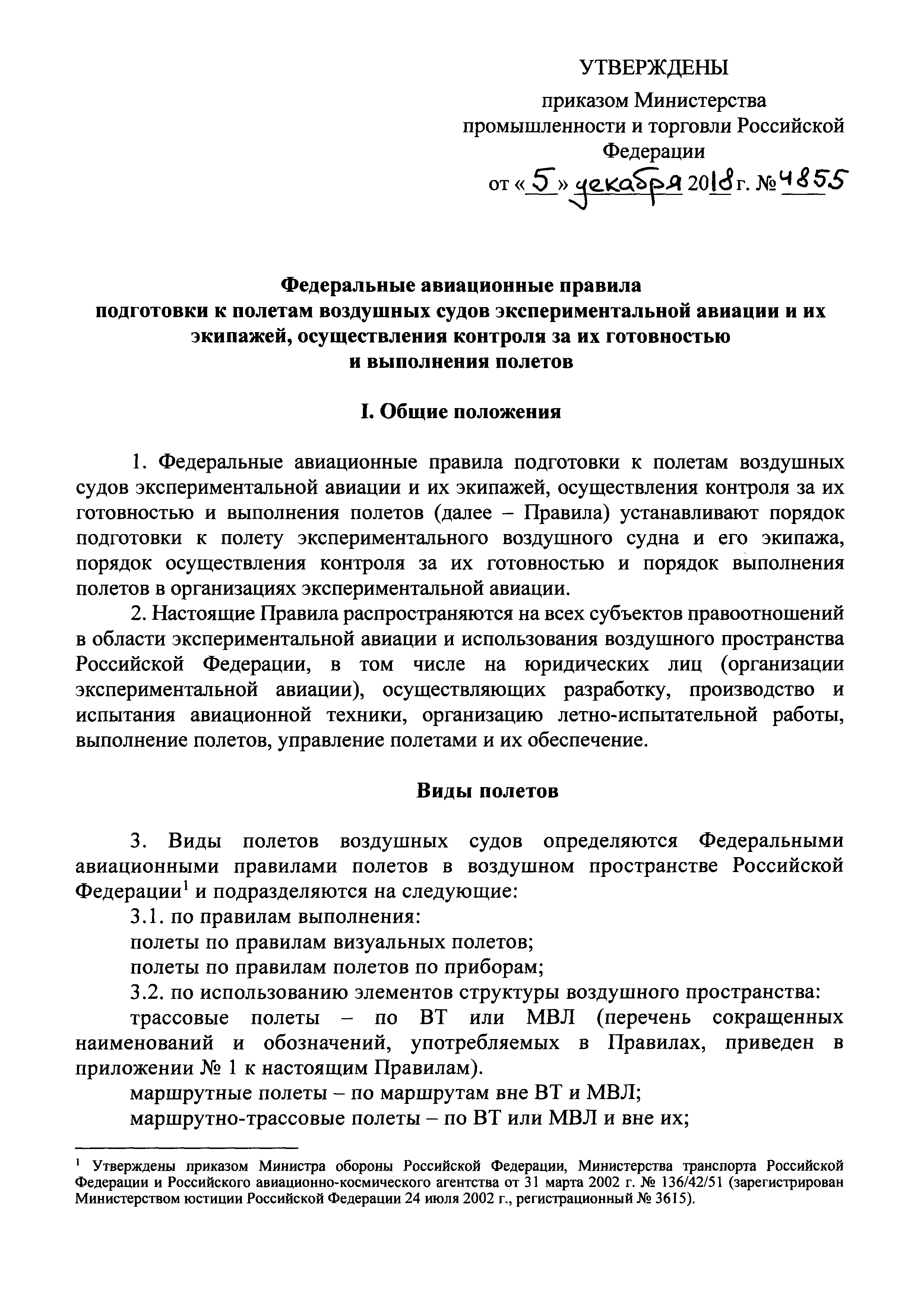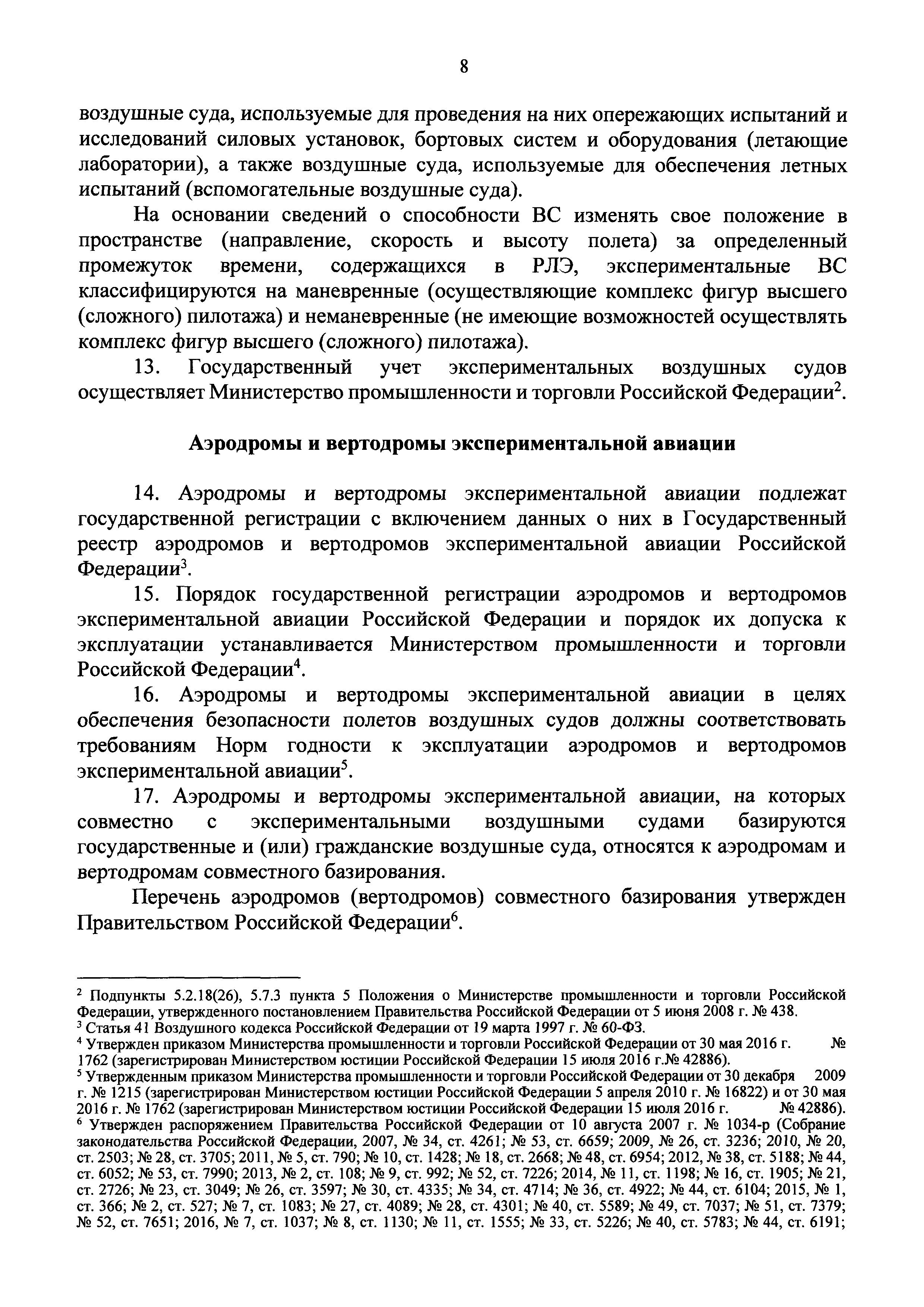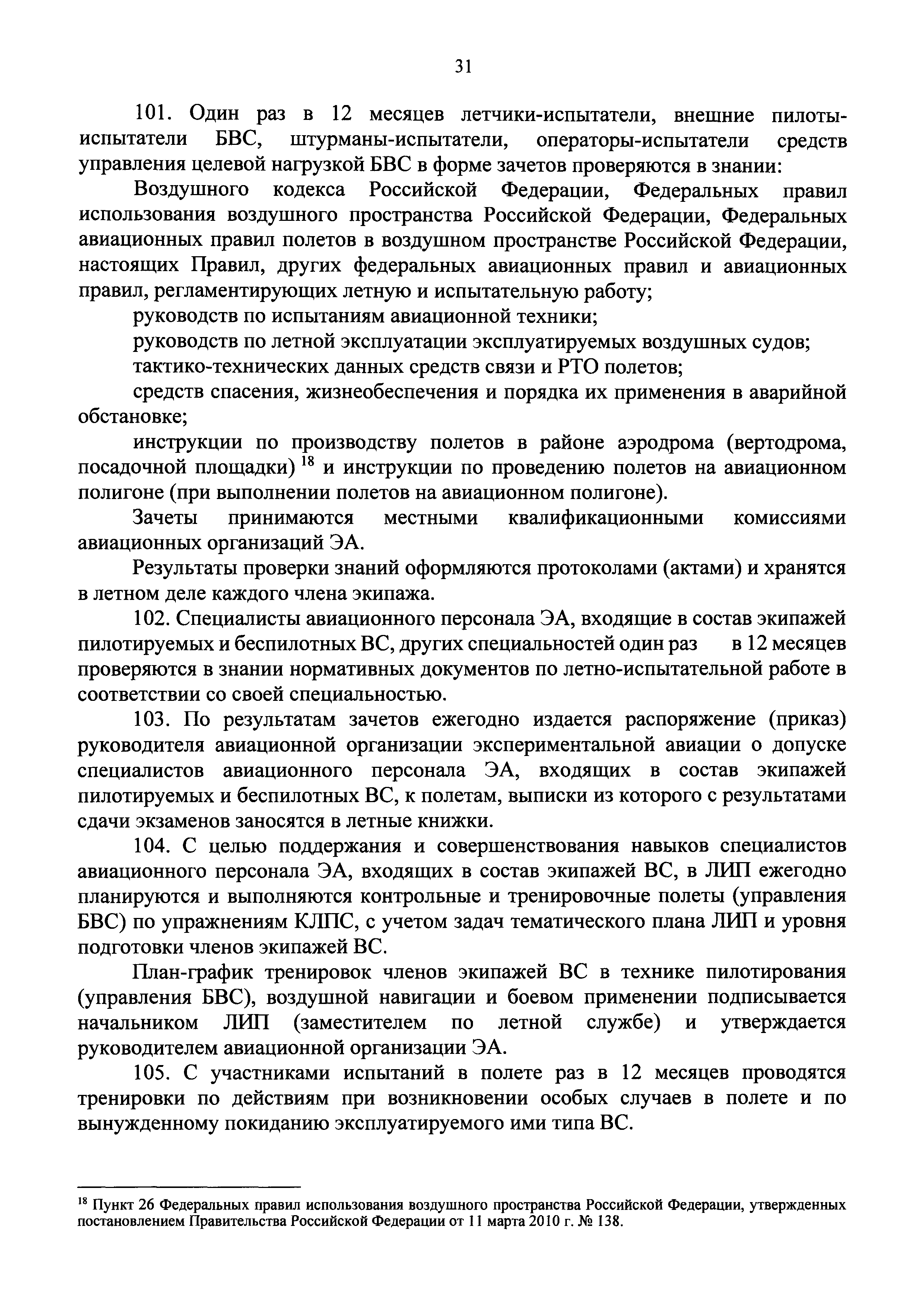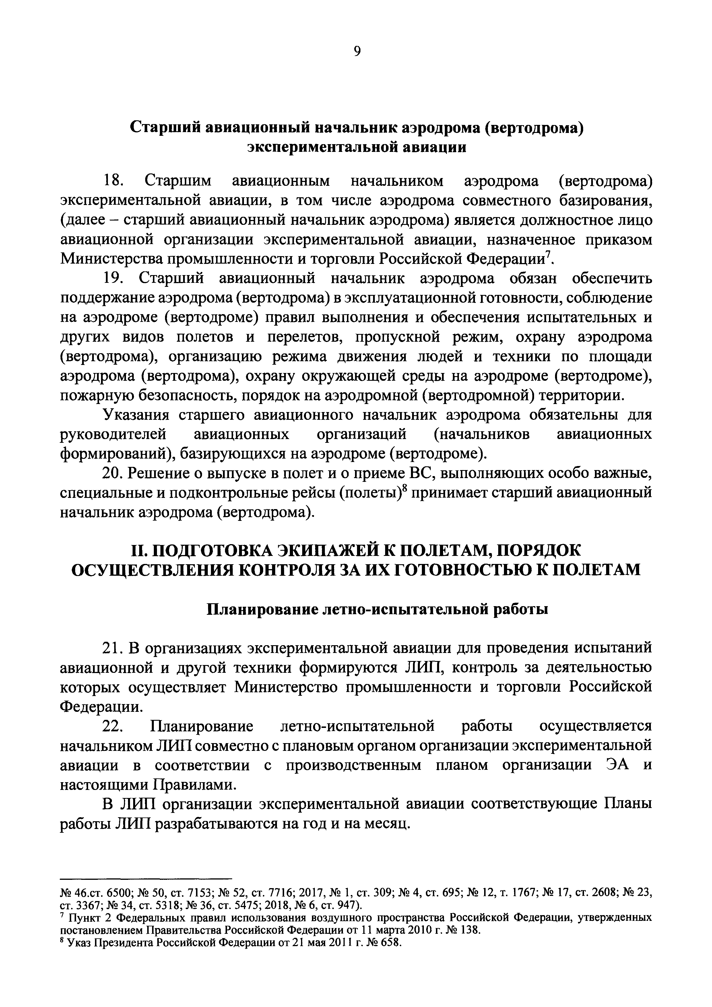 | Область применения: | Федеральные авиационные правила подготовки к полетам воздушных судов экспериментальной авиации и их экипажей, осуществления контроля за их готовностью и выполнения полетов устанавливают порядок подготовки к полету экспериментального воздушного судна и его экипажа, порядок осуществления контроля за их готовностью и порядок выполнения полетов в организациях экспериментальной авиации |
