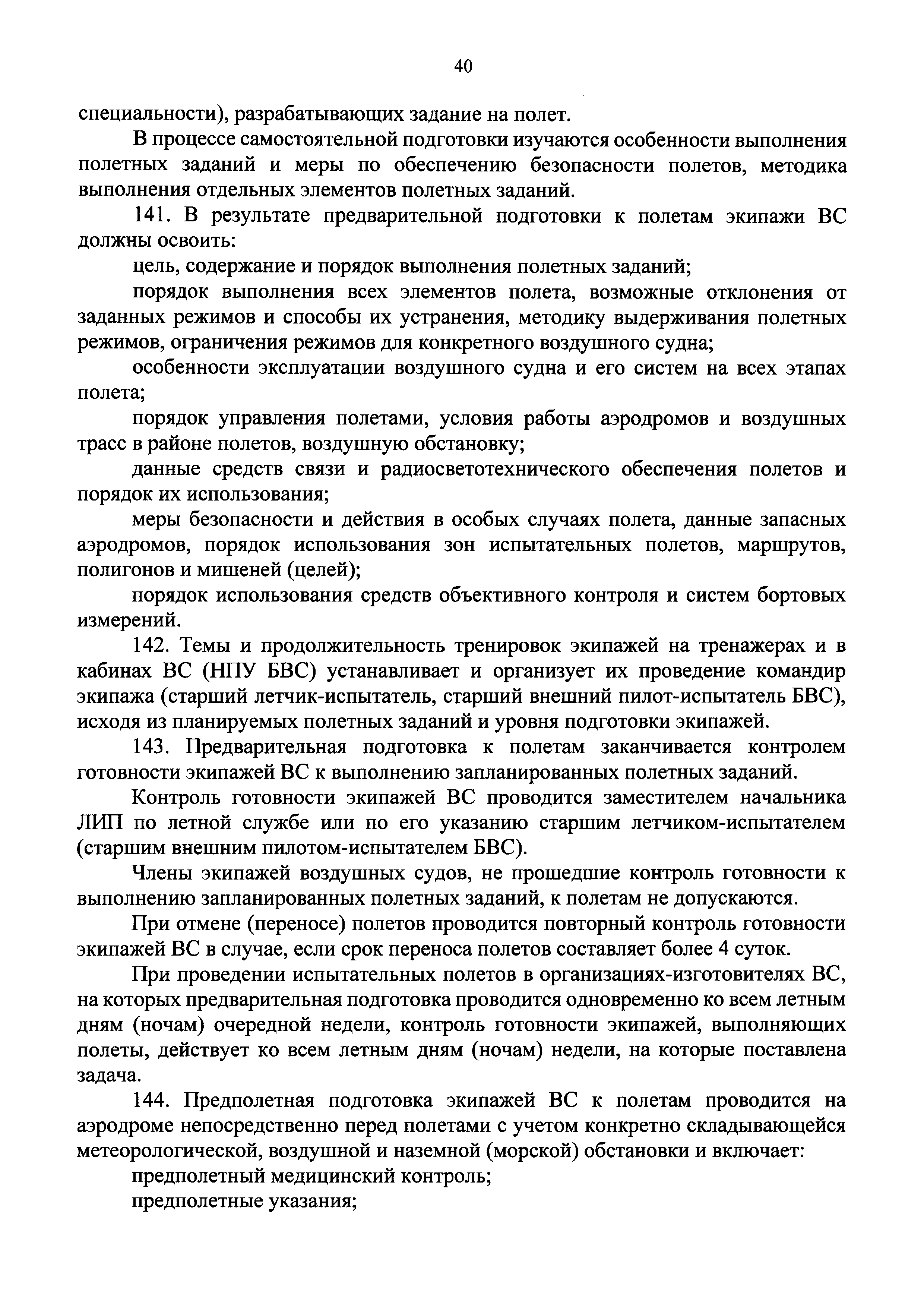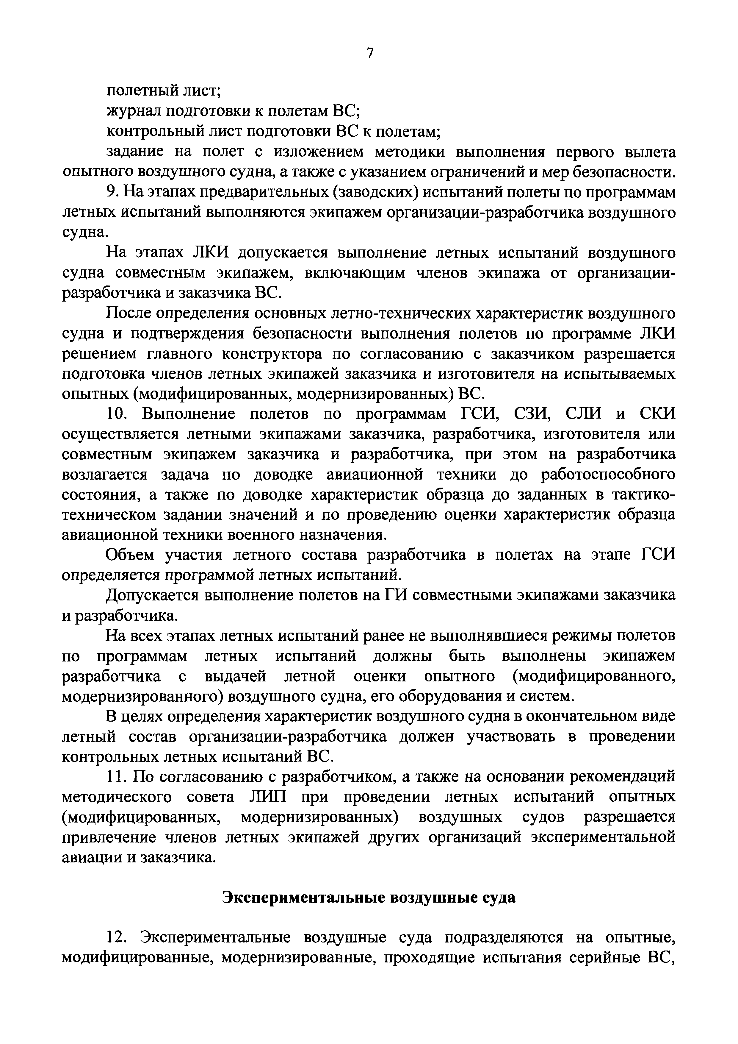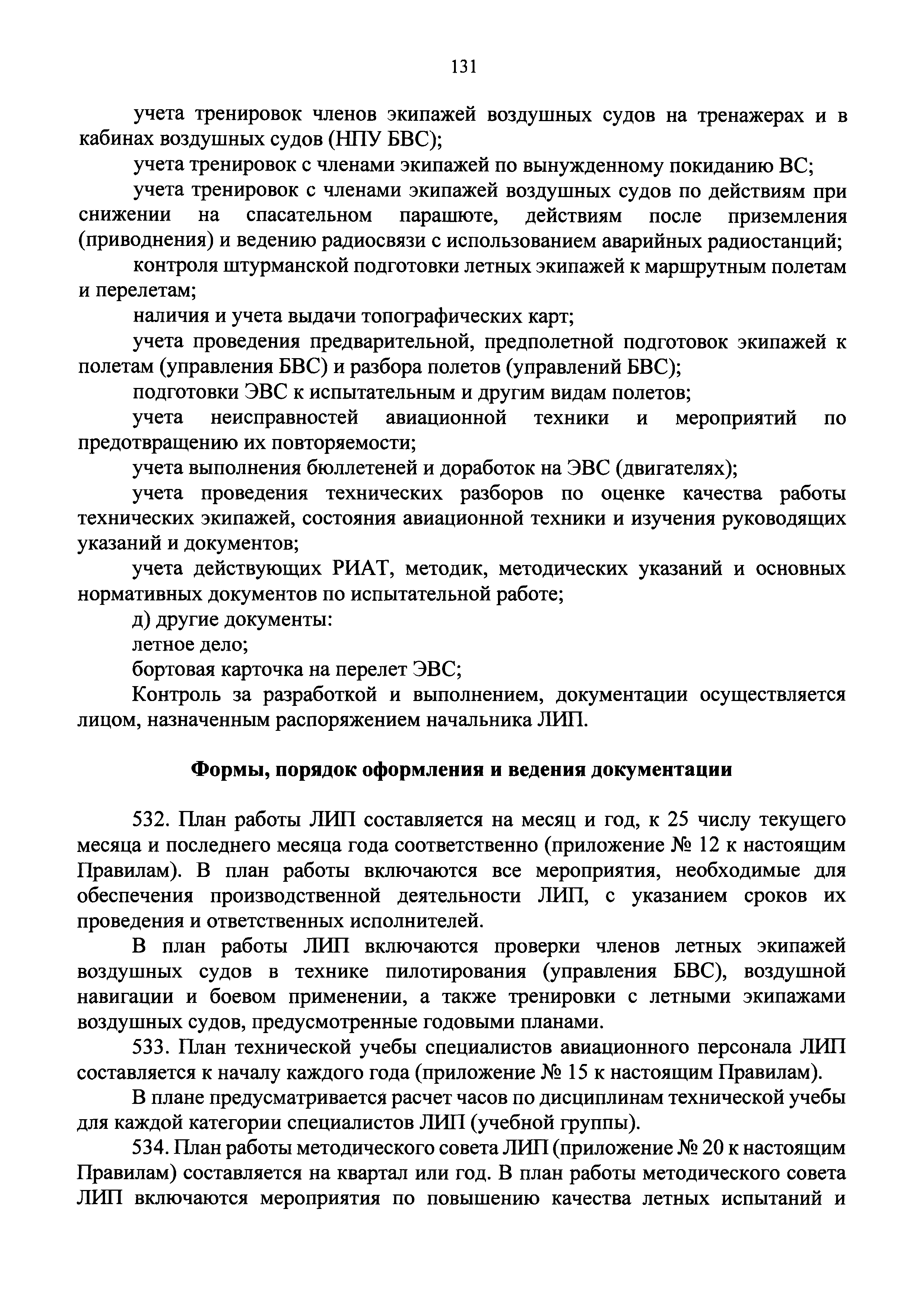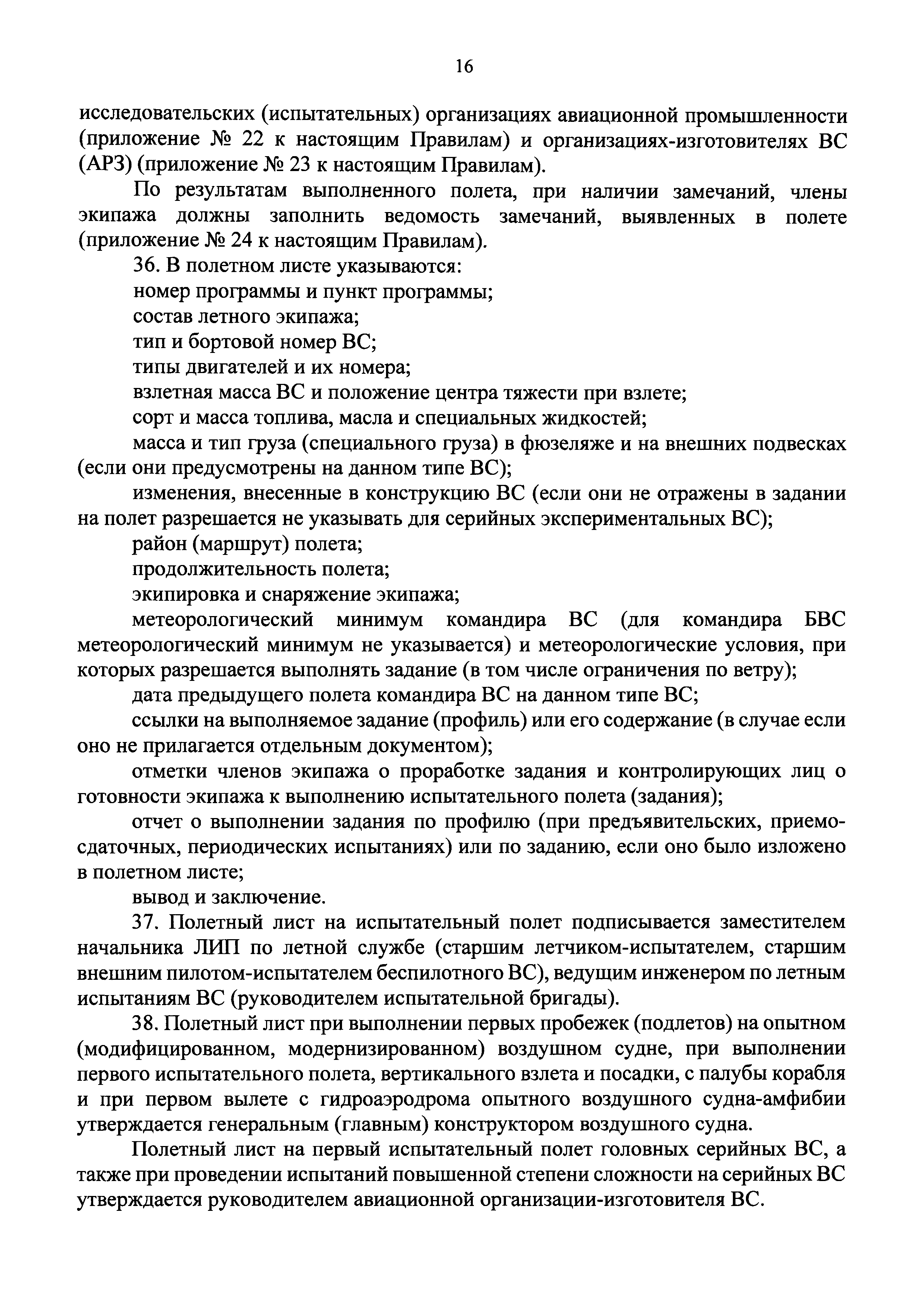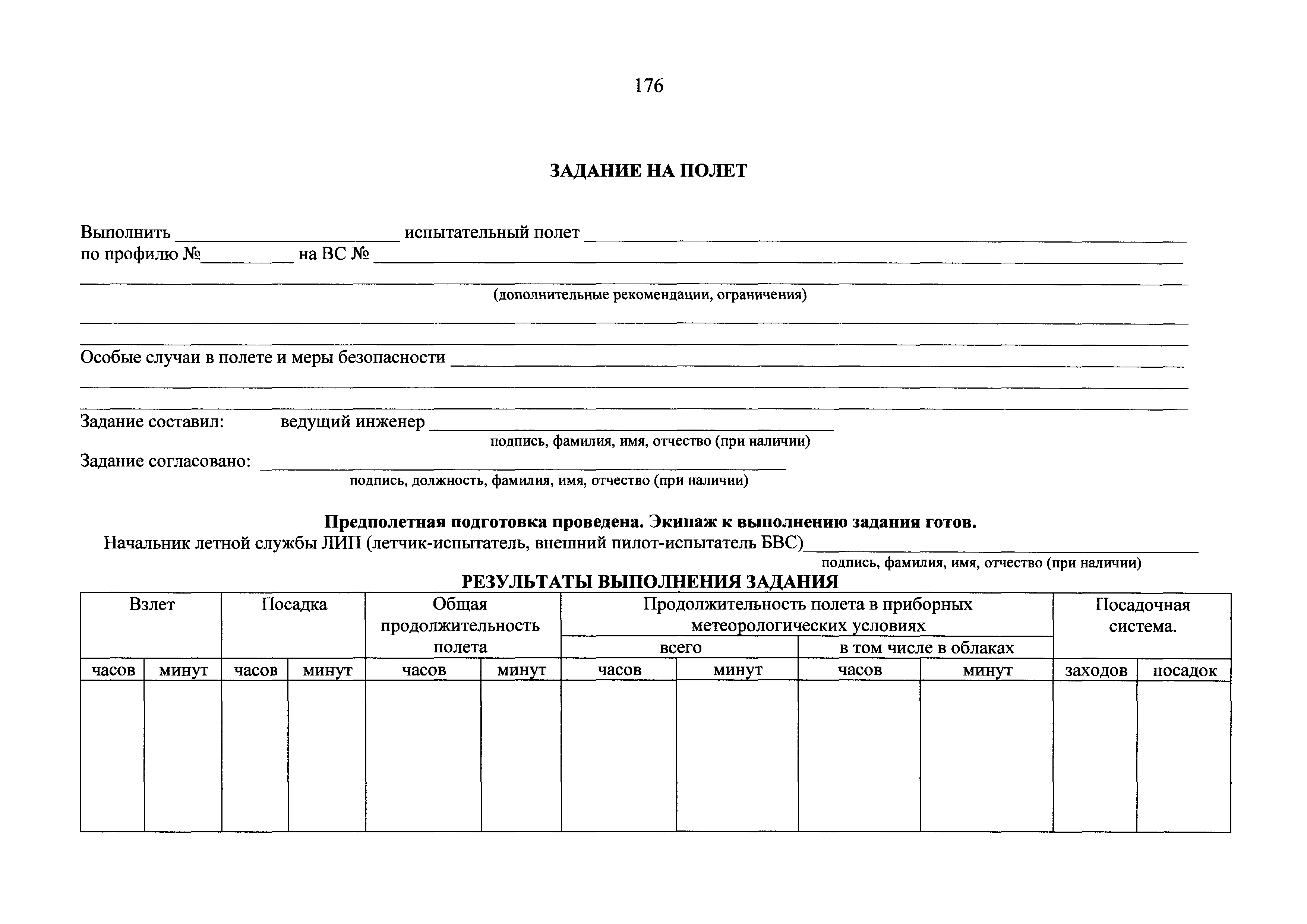 | Оглавление: | I. Общие положения II. Подготовка экипажей к полетам, порядок осуществления контроля за их готовностью к полетам III. Подготовка экспериментальных воздушных судов к полетам и порядок осуществления контроля за их готовностью к полетам IV. Порядок управления полетами V. Порядок выполнения полетов экспериментальных воздушных судов и их экипажей VI. Порядок оформления и ведения документации по летно-испытательной работе в летно-испытательных подразделениях организаций экспериментальной авиации Приложение № 1. Перечень сокращенных наименований и обозначений Приложение № 2. Плановая таблица полетов Приложение № 3. Условные знаки для оформления плановых таблиц полетов и других документов Приложение № 4. Максимальные перерывы в выполнении полетов (в месяцах) Приложение № 5. Условия, при которых полет выполняется по правилам визуальных полетов (ПВП) Приложение № 6. Максимальные значения параметров метеорологических элементов, полеты при которых считаются выполненными в приборных метеорологических условиях (ПМУ) и заходы на посадку при метеорологическом минимуме погоды Приложение № 7. Сигналы (команды), подаваемые эволюциями самолета при управлении группой Приложение № 8. Порядок передачи сигнала и сообщения о бедствии Приложение № 9. Сигналы (команды), подаваемые экипажам воздушных судов при отсутствии радиосвязи Приложение № 10. Журнал старшего руководителя полетов Приложение № 11. Журнал диспетчерских разрешений и решений командиров воздушных судов на вылет Приложение № 12. План работы летно-испытательного подразделения Приложение № 13. План-график тренировок членов экипажей воздушных судов в технике пилотирования (управления БВС), воздушной навигации и боевом применении Приложение № 14. План-график проверок членов экипажей воздушных судов в технике пилотирования (управления БВС), воздушной навигации и боевом применении, отпусков и прохождения врачебно-летной экспертизы Приложение № 15. План технической учебы специалистов авиационного персонала летно-испытательного подразделения Приложение № 16. Журнал технической учебы Приложение № 17. Журнал учета проведения предварительной, предполетной подготовок экипажей к полетам и разбора полетов Приложение № 18. Журнал подготовки экспериментального воздушного судна к испытательным и другим видам полетов Приложение № 19. Бортовая карточка на перелет экспериментального ВС Приложение № 20. План работы методического совета ЛИП Приложение № 21. Задание на испытательный полет Приложение № 22. Полетный лист для организаций-разработчиков ВС, научно-исследовательских (испытательных) организациях авиационной промышленности Приложение № 23. Полетный лист для организаций-изготовителей ВС (АРЗ) Приложение № 24. Ведомость замечаний, выявленных экипажем в полете |