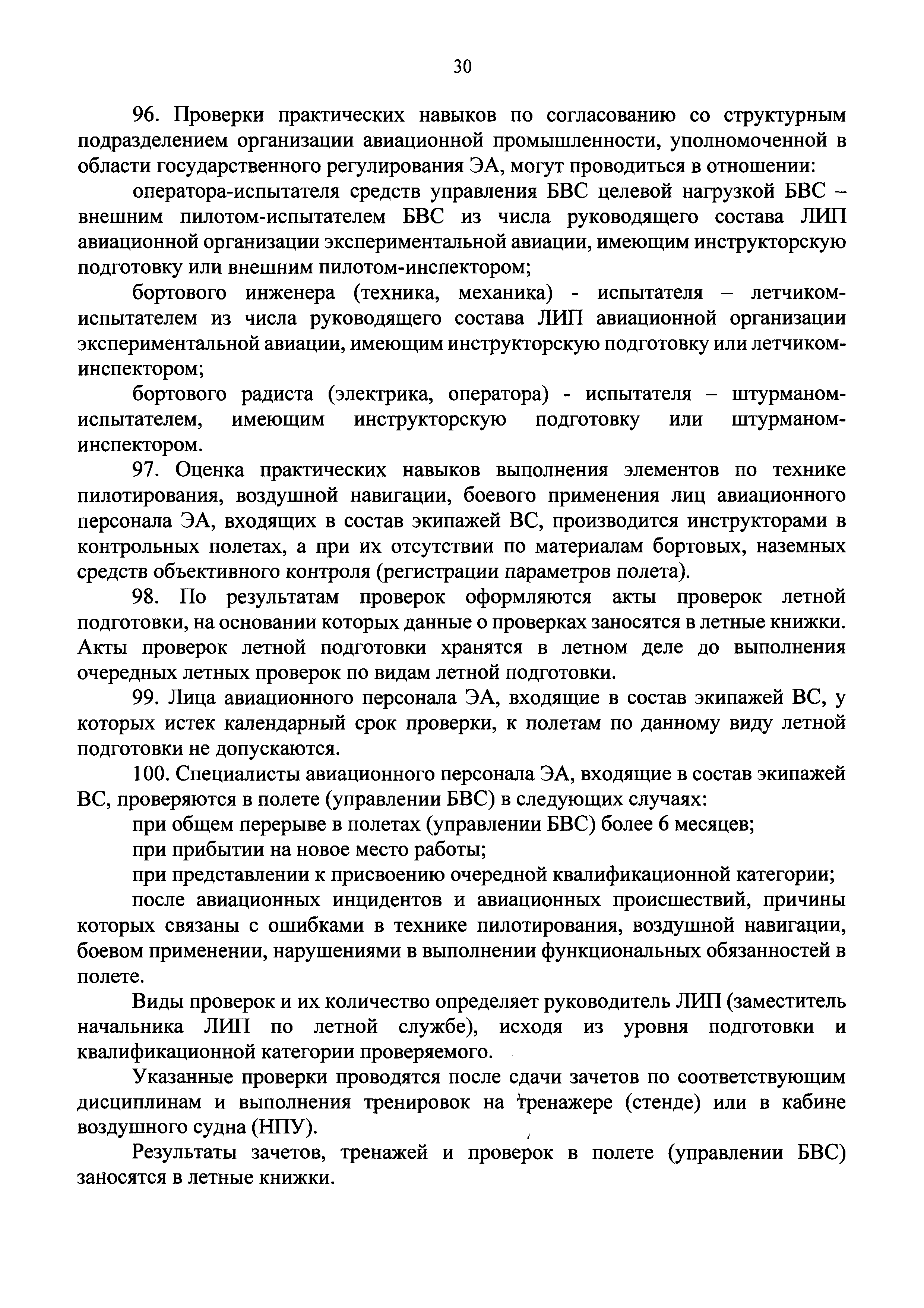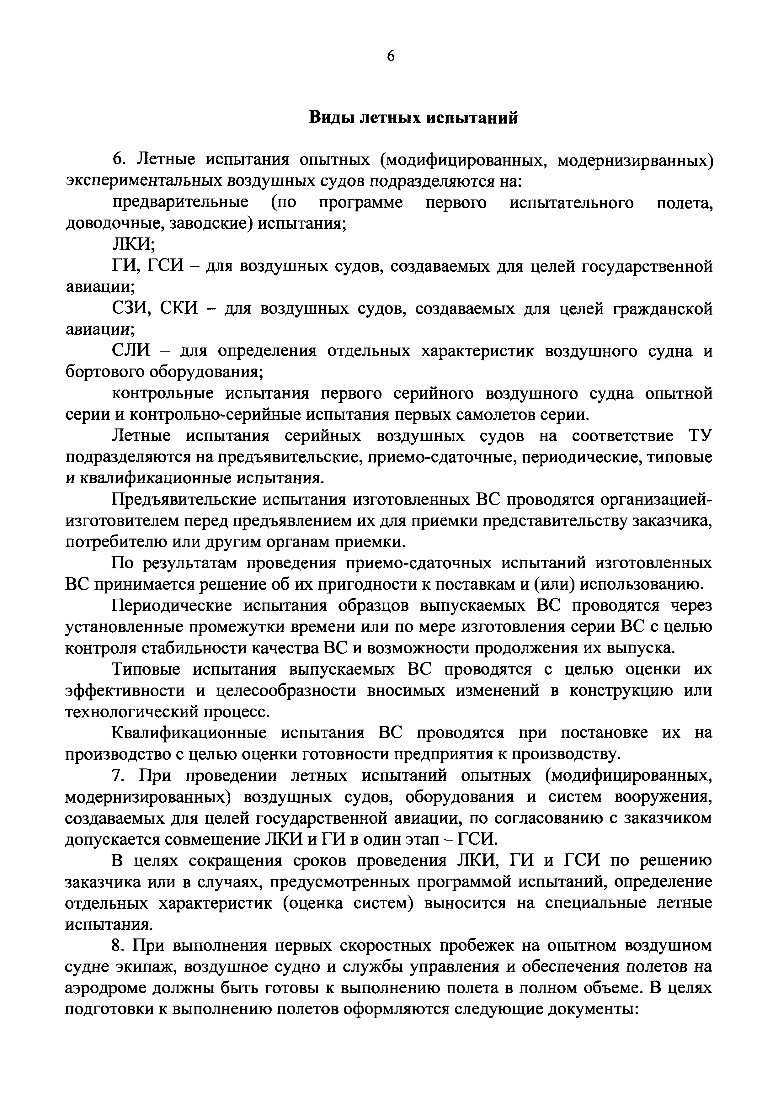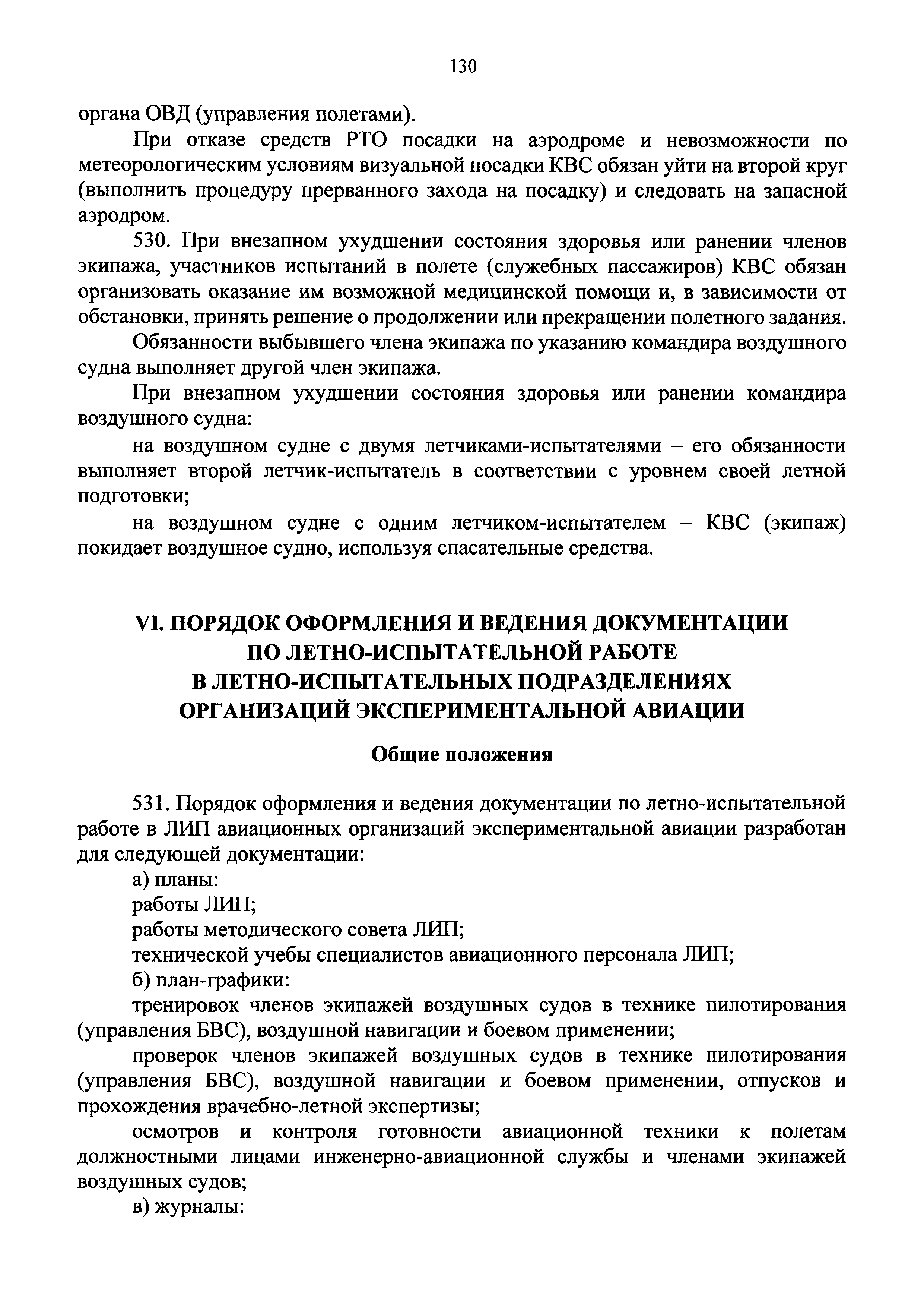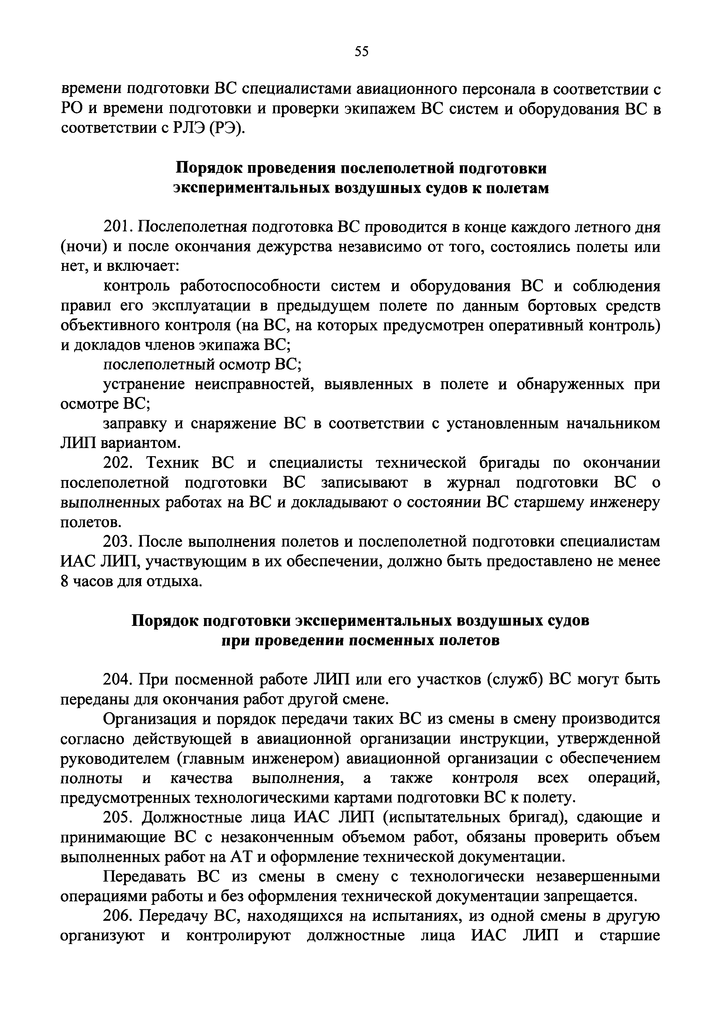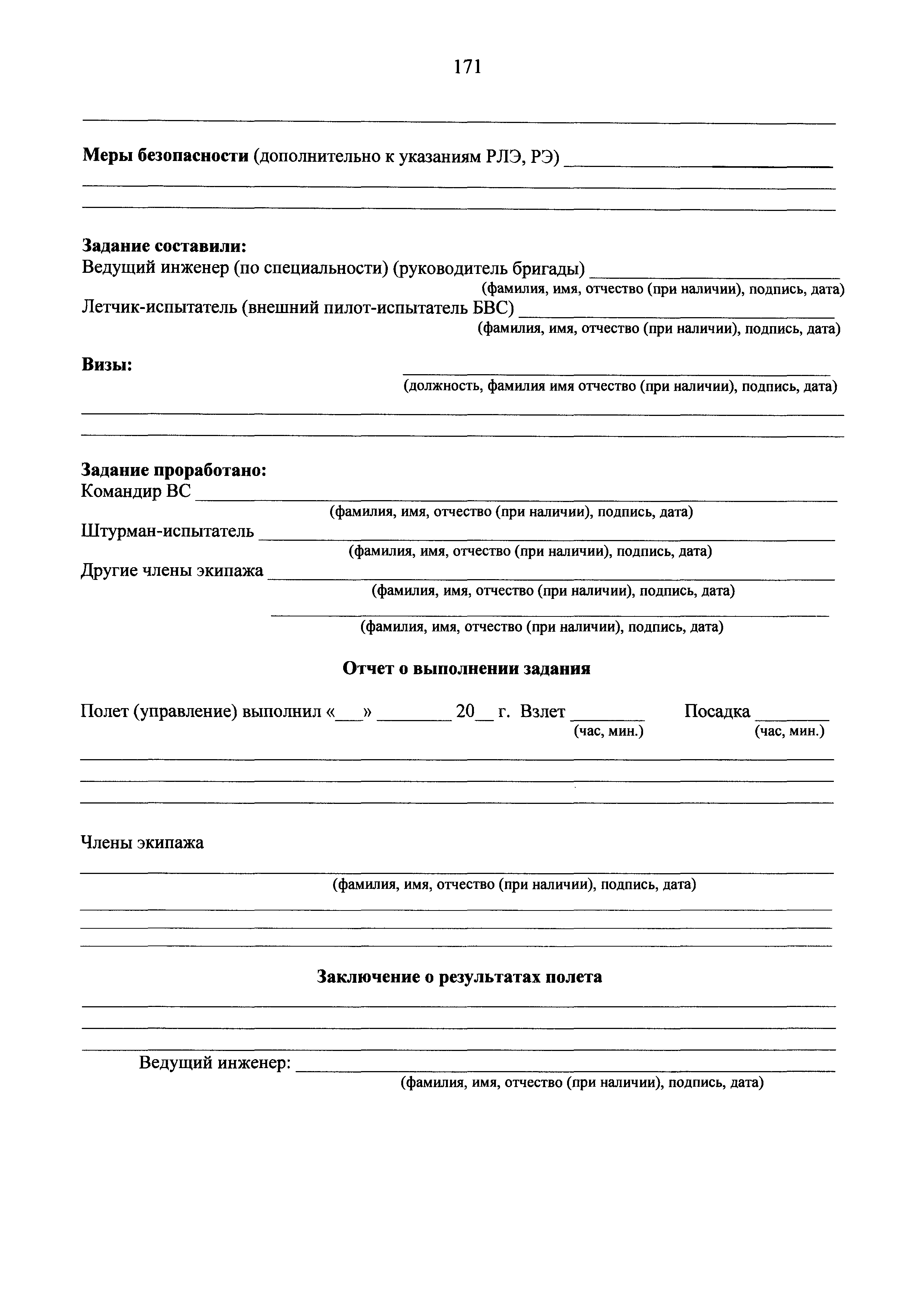 | Оглавление: | I. Общие положения II. Подготовка экипажей к полетам, порядок осуществления контроля за их готовностью к полетам III. Подготовка экспериментальных воздушных судов к полетам и порядок осуществления контроля за их готовностью к полетам IV. Порядок управления полетами V. Порядок выполнения полетов экспериментальных воздушных судов и их экипажей VI. Порядок оформления и ведения документации по летно-испытательной работе в летно-испытательных подразделениях организаций экспериментальной авиации Приложение № 1. Перечень сокращенных наименований и обозначений Приложение № 2. Плановая таблица полетов Приложение № 3. Условные знаки для оформления плановых таблиц полетов и других документов Приложение № 4. Максимальные перерывы в выполнении полетов (в месяцах) Приложение № 5. Условия, при которых полет выполняется по правилам визуальных полетов (ПВП) Приложение № 6. Максимальные значения параметров метеорологических элементов, полеты при которых считаются выполненными в приборных метеорологических условиях (ПМУ) и заходы на посадку при метеорологическом минимуме погоды Приложение № 7. Сигналы (команды), подаваемые эволюциями самолета при управлении группой Приложение № 8. Порядок передачи сигнала и сообщения о бедствии Приложение № 9. Сигналы (команды), подаваемые экипажам воздушных судов при отсутствии радиосвязи Приложение № 10. Журнал старшего руководителя полетов Приложение № 11. Журнал диспетчерских разрешений и решений командиров воздушных судов на вылет Приложение № 12. План работы летно-испытательного подразделения Приложение № 13. План-график тренировок членов экипажей воздушных судов в технике пилотирования (управления БВС), воздушной навигации и боевом применении Приложение № 14. План-график проверок членов экипажей воздушных судов в технике пилотирования (управления БВС), воздушной навигации и боевом применении, отпусков и прохождения врачебно-летной экспертизы Приложение № 15. План технической учебы специалистов авиационного персонала летно-испытательного подразделения Приложение № 16. Журнал технической учебы Приложение № 17. Журнал учета проведения предварительной, предполетной подготовок экипажей к полетам и разбора полетов Приложение № 18. Журнал подготовки экспериментального воздушного судна к испытательным и другим видам полетов Приложение № 19. Бортовая карточка на перелет экспериментального ВС Приложение № 20. План работы методического совета ЛИП Приложение № 21. Задание на испытательный полет Приложение № 22. Полетный лист для организаций-разработчиков ВС, научно-исследовательских (испытательных) организациях авиационной промышленности Приложение № 23. Полетный лист для организаций-изготовителей ВС (АРЗ) Приложение № 24. Ведомость замечаний, выявленных экипажем в полете |