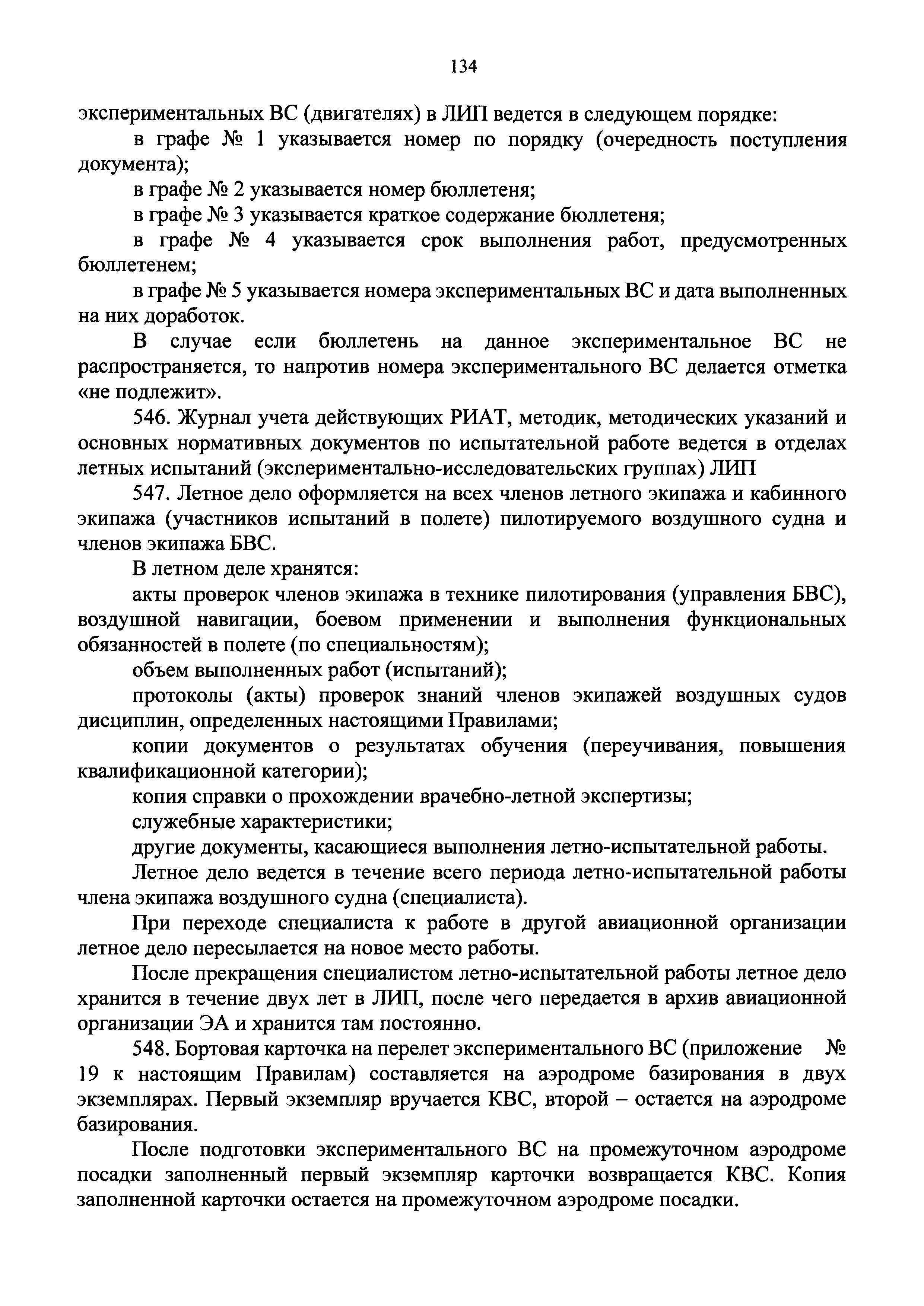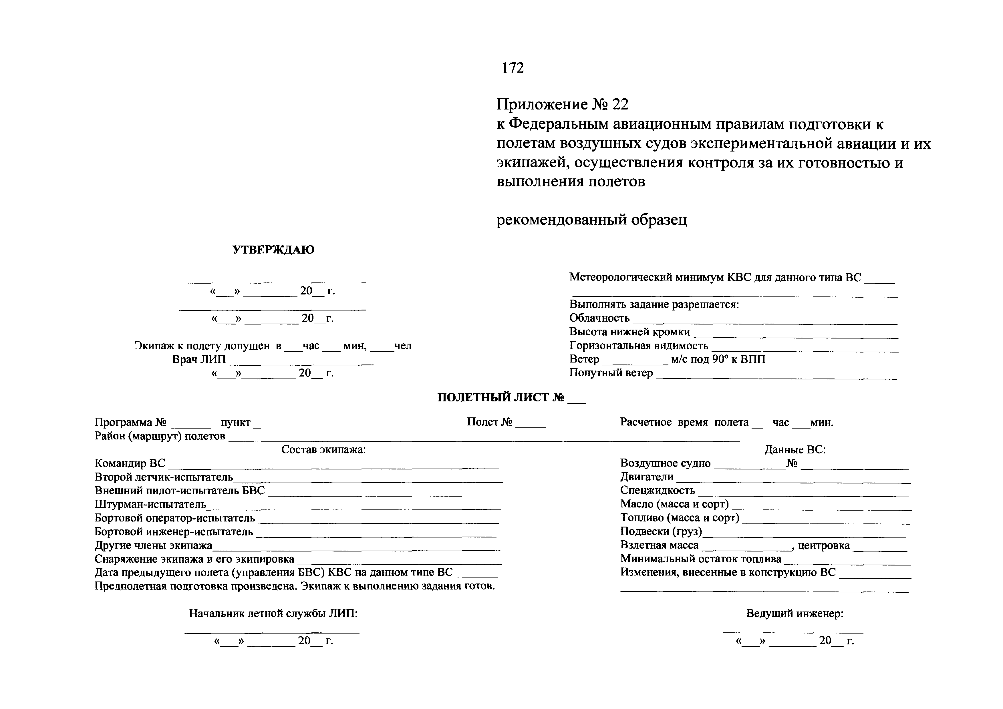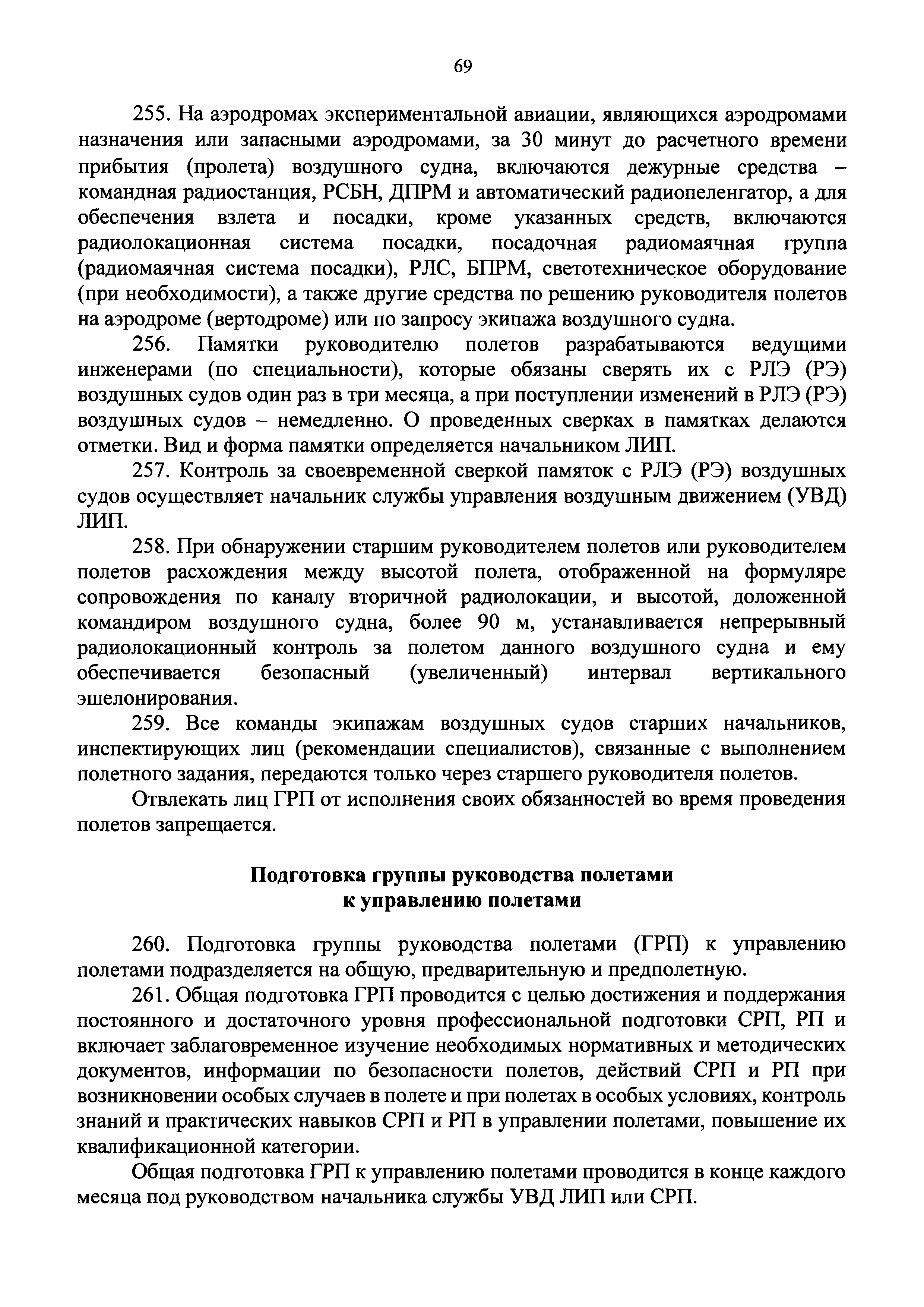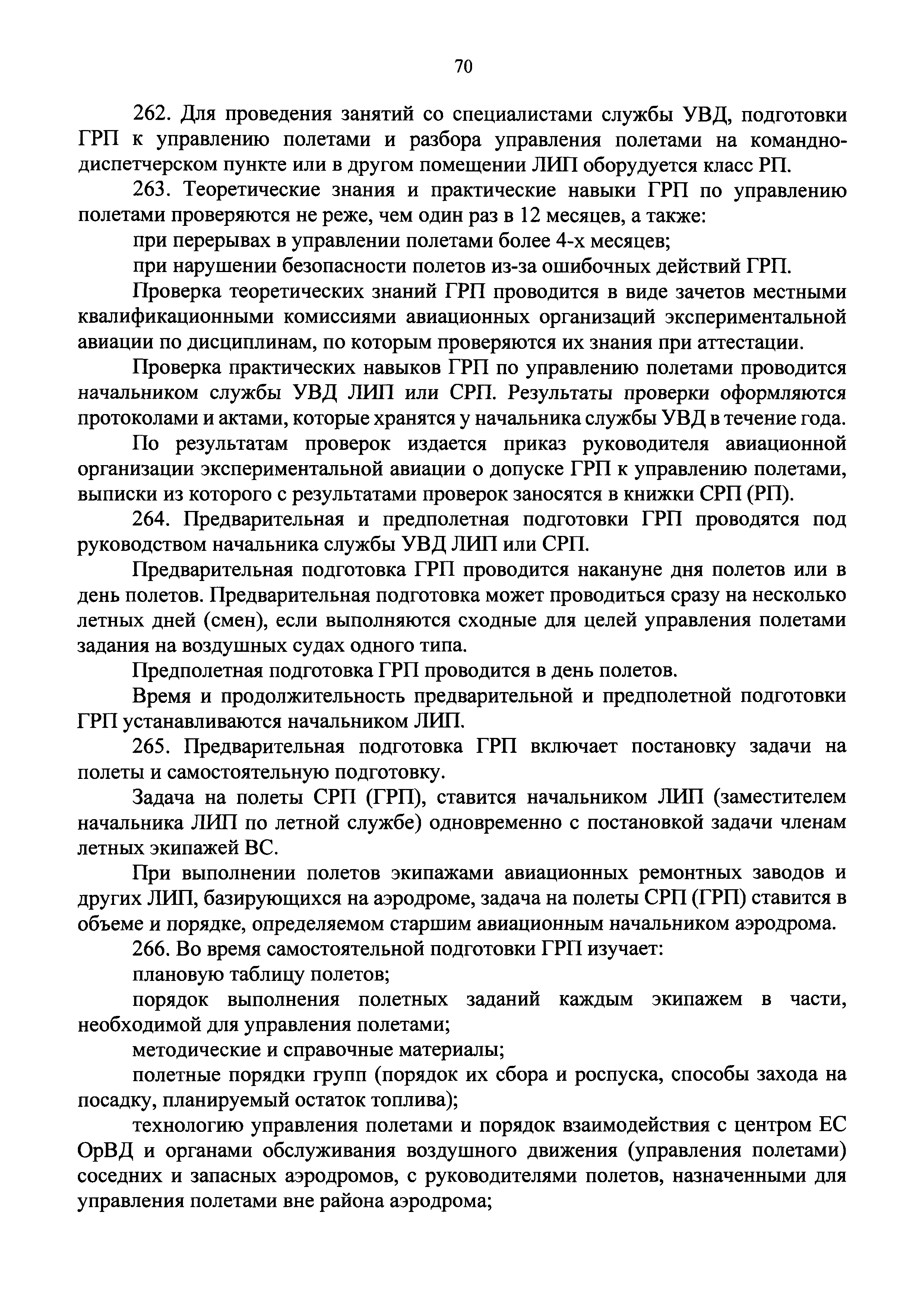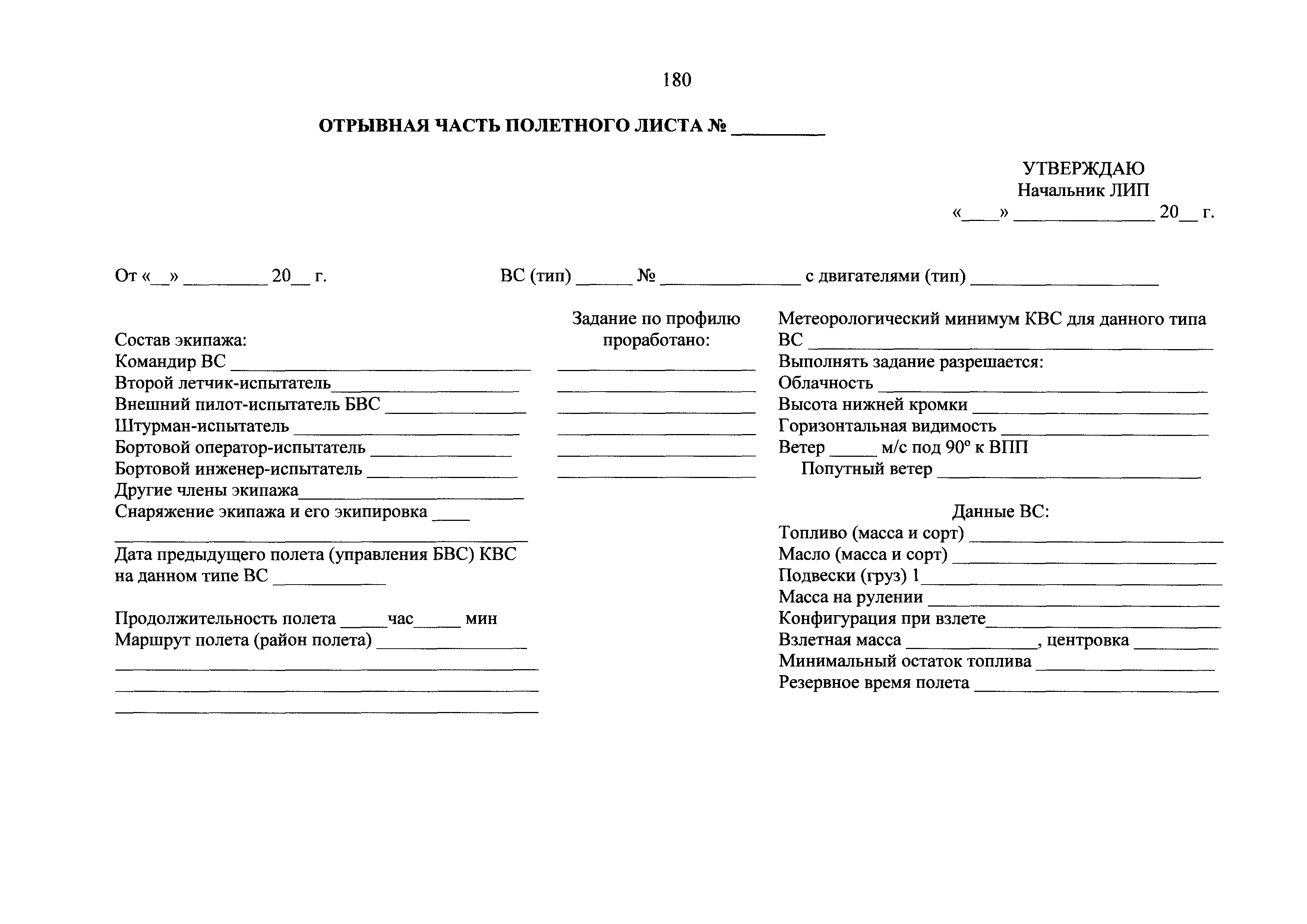| Оглавление: | I. Общие положения II. Подготовка экипажей к полетам, порядок осуществления контроля за их готовностью к полетам III. Подготовка экспериментальных воздушных судов к полетам и порядок осуществления контроля за их готовностью к полетам IV. Порядок управления полетами V. Порядок выполнения полетов экспериментальных воздушных судов и их экипажей VI. Порядок оформления и ведения документации по летно-испытательной работе в летно-испытательных подразделениях организаций экспериментальной авиации Приложение № 1. Перечень сокращенных наименований и обозначений Приложение № 2. Плановая таблица полетов Приложение № 3. Условные знаки для оформления плановых таблиц полетов и других документов Приложение № 4. Максимальные перерывы в выполнении полетов (в месяцах) Приложение № 5. Условия, при которых полет выполняется по правилам визуальных полетов (ПВП) Приложение № 6. Максимальные значения параметров метеорологических элементов, полеты при которых считаются выполненными в приборных метеорологических условиях (ПМУ) и заходы на посадку при метеорологическом минимуме погоды Приложение № 7. Сигналы (команды), подаваемые эволюциями самолета при управлении группой Приложение № 8. Порядок передачи сигнала и сообщения о бедствии Приложение № 9. Сигналы (команды), подаваемые экипажам воздушных судов при отсутствии радиосвязи Приложение № 10. Журнал старшего руководителя полетов Приложение № 11. Журнал диспетчерских разрешений и решений командиров воздушных судов на вылет Приложение № 12. План работы летно-испытательного подразделения Приложение № 13. План-график тренировок членов экипажей воздушных судов в технике пилотирования (управления БВС), воздушной навигации и боевом применении Приложение № 14. План-график проверок членов экипажей воздушных судов в технике пилотирования (управления БВС), воздушной навигации и боевом применении, отпусков и прохождения врачебно-летной экспертизы Приложение № 15. План технической учебы специалистов авиационного персонала летно-испытательного подразделения Приложение № 16. Журнал технической учебы Приложение № 17. Журнал учета проведения предварительной, предполетной подготовок экипажей к полетам и разбора полетов Приложение № 18. Журнал подготовки экспериментального воздушного судна к испытательным и другим видам полетов Приложение № 19. Бортовая карточка на перелет экспериментального ВС Приложение № 20. План работы методического совета ЛИП Приложение № 21. Задание на испытательный полет Приложение № 22. Полетный лист для организаций-разработчиков ВС, научно-исследовательских (испытательных) организациях авиационной промышленности Приложение № 23. Полетный лист для организаций-изготовителей ВС (АРЗ) Приложение № 24. Ведомость замечаний, выявленных экипажем в полете |