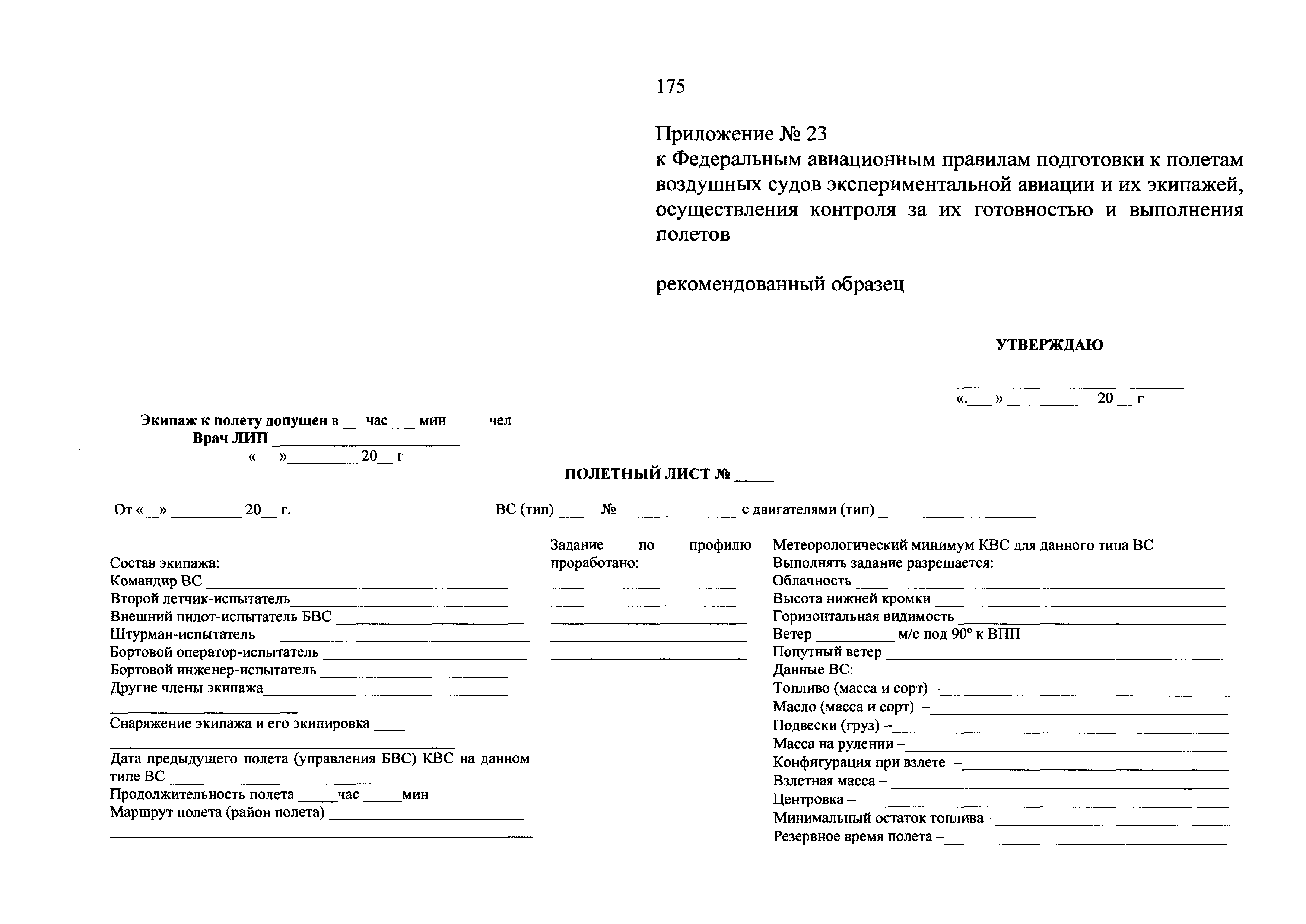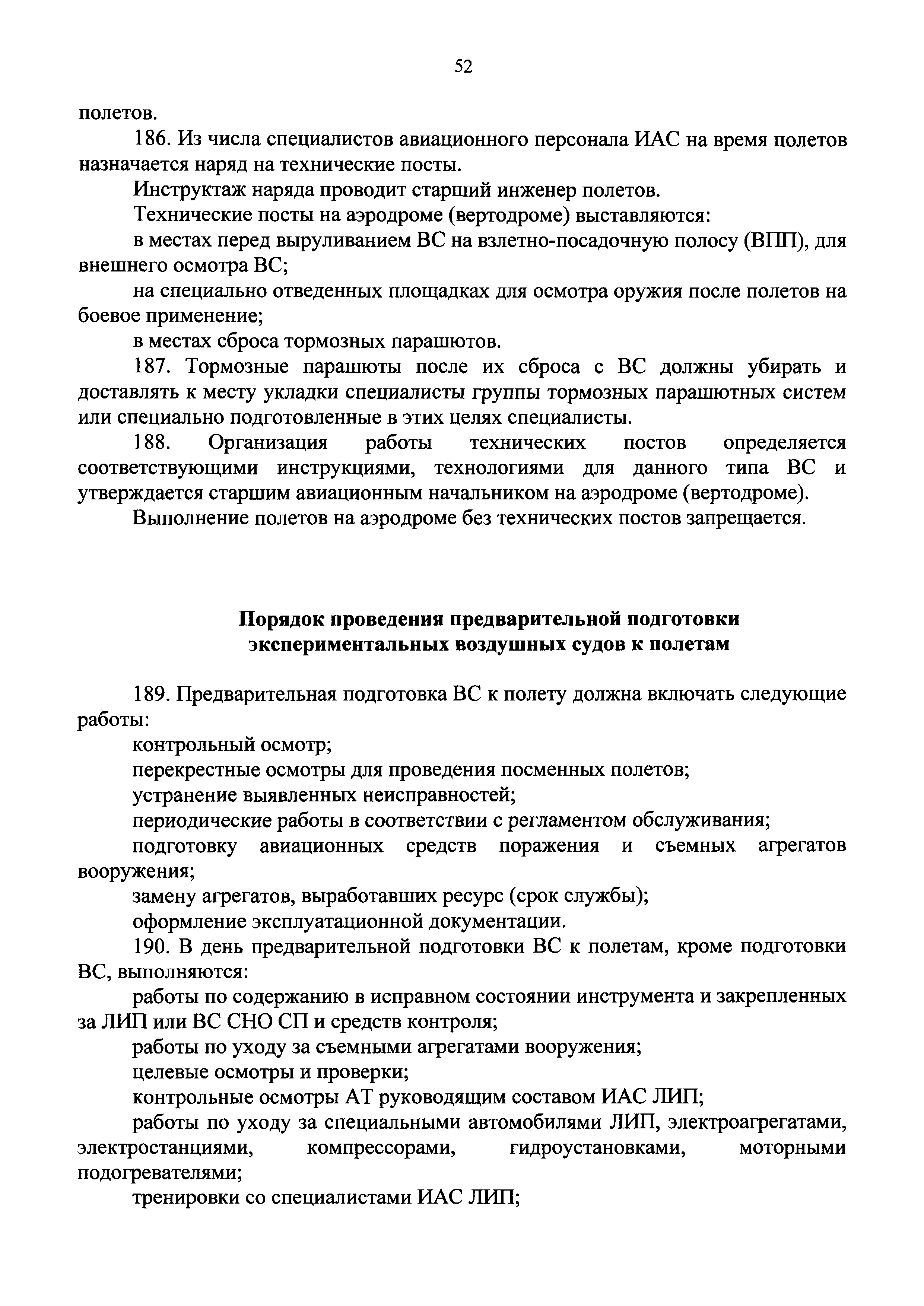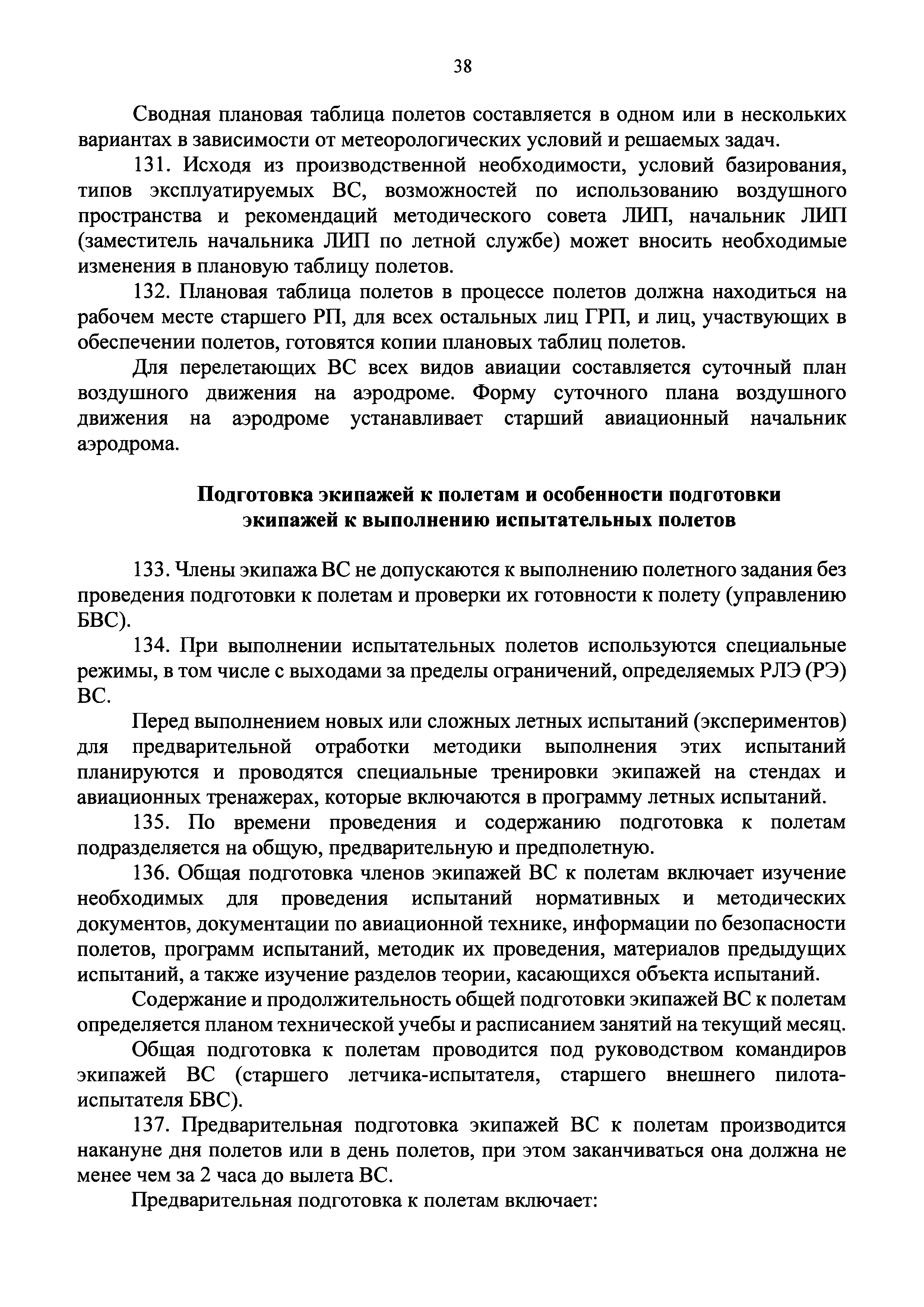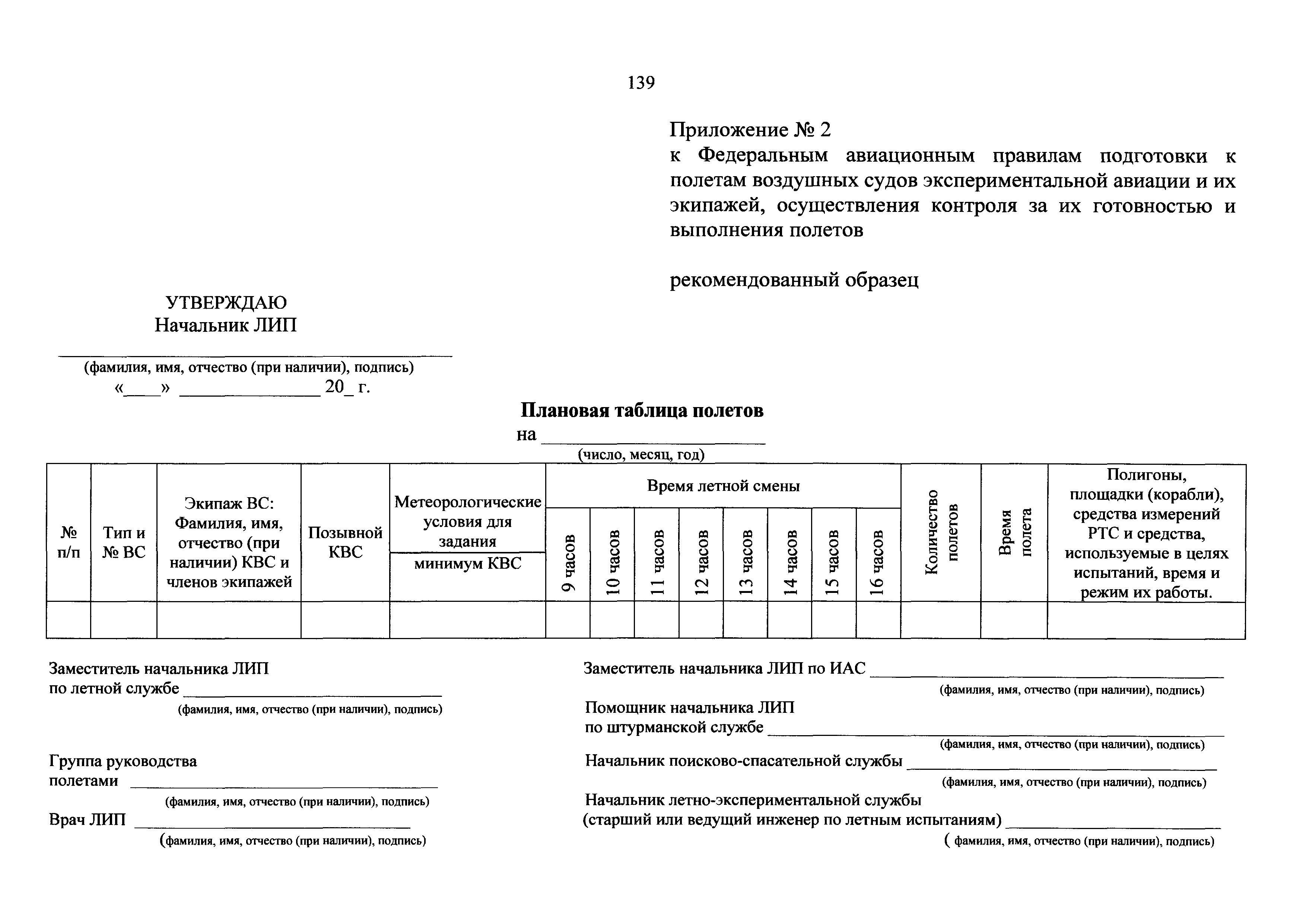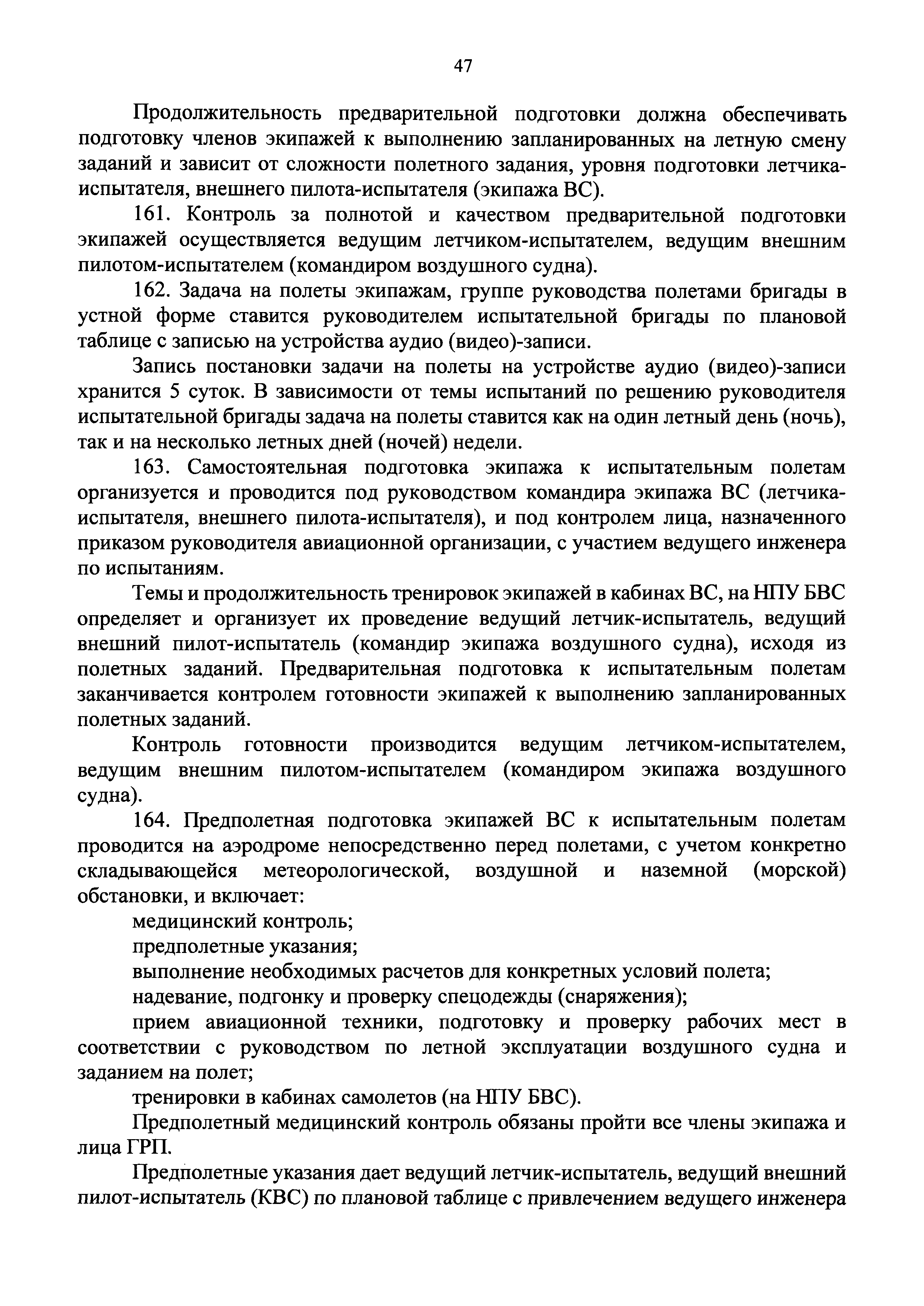 | Оглавление: | I. Общие положения II. Подготовка экипажей к полетам, порядок осуществления контроля за их готовностью к полетам III. Подготовка экспериментальных воздушных судов к полетам и порядок осуществления контроля за их готовностью к полетам IV. Порядок управления полетами V. Порядок выполнения полетов экспериментальных воздушных судов и их экипажей VI. Порядок оформления и ведения документации по летно-испытательной работе в летно-испытательных подразделениях организаций экспериментальной авиации Приложение № 1. Перечень сокращенных наименований и обозначений Приложение № 2. Плановая таблица полетов Приложение № 3. Условные знаки для оформления плановых таблиц полетов и других документов Приложение № 4. Максимальные перерывы в выполнении полетов (в месяцах) Приложение № 5. Условия, при которых полет выполняется по правилам визуальных полетов (ПВП) Приложение № 6. Максимальные значения параметров метеорологических элементов, полеты при которых считаются выполненными в приборных метеорологических условиях (ПМУ) и заходы на посадку при метеорологическом минимуме погоды Приложение № 7. Сигналы (команды), подаваемые эволюциями самолета при управлении группой Приложение № 8. Порядок передачи сигнала и сообщения о бедствии Приложение № 9. Сигналы (команды), подаваемые экипажам воздушных судов при отсутствии радиосвязи Приложение № 10. Журнал старшего руководителя полетов Приложение № 11. Журнал диспетчерских разрешений и решений командиров воздушных судов на вылет Приложение № 12. План работы летно-испытательного подразделения Приложение № 13. План-график тренировок членов экипажей воздушных судов в технике пилотирования (управления БВС), воздушной навигации и боевом применении Приложение № 14. План-график проверок членов экипажей воздушных судов в технике пилотирования (управления БВС), воздушной навигации и боевом применении, отпусков и прохождения врачебно-летной экспертизы Приложение № 15. План технической учебы специалистов авиационного персонала летно-испытательного подразделения Приложение № 16. Журнал технической учебы Приложение № 17. Журнал учета проведения предварительной, предполетной подготовок экипажей к полетам и разбора полетов Приложение № 18. Журнал подготовки экспериментального воздушного судна к испытательным и другим видам полетов Приложение № 19. Бортовая карточка на перелет экспериментального ВС Приложение № 20. План работы методического совета ЛИП Приложение № 21. Задание на испытательный полет Приложение № 22. Полетный лист для организаций-разработчиков ВС, научно-исследовательских (испытательных) организациях авиационной промышленности Приложение № 23. Полетный лист для организаций-изготовителей ВС (АРЗ) Приложение № 24. Ведомость замечаний, выявленных экипажем в полете |