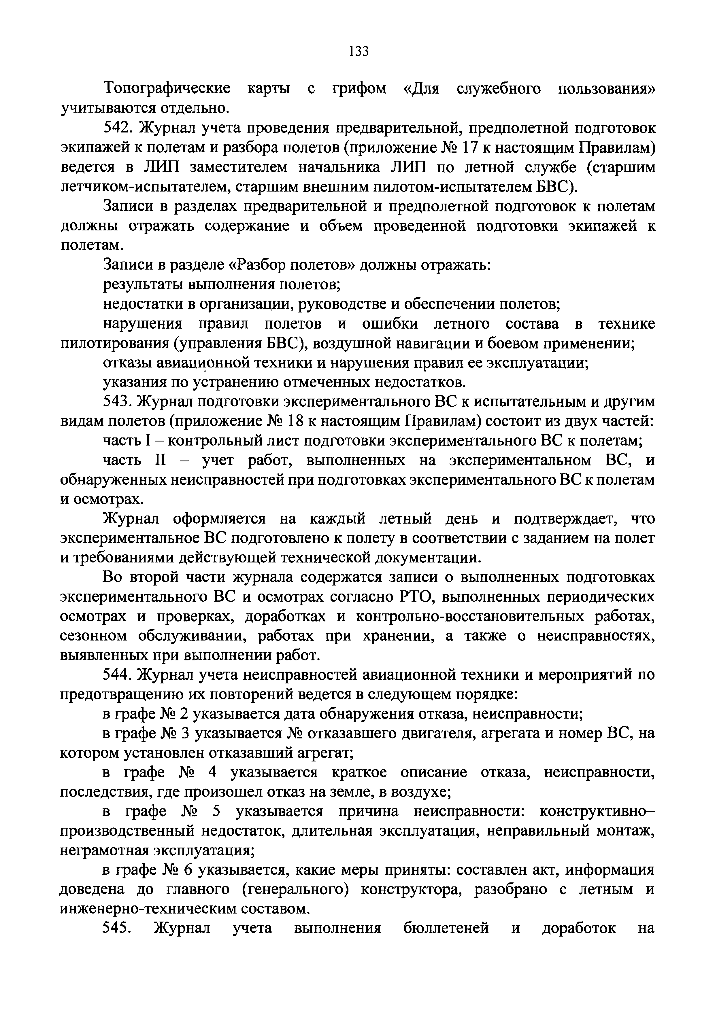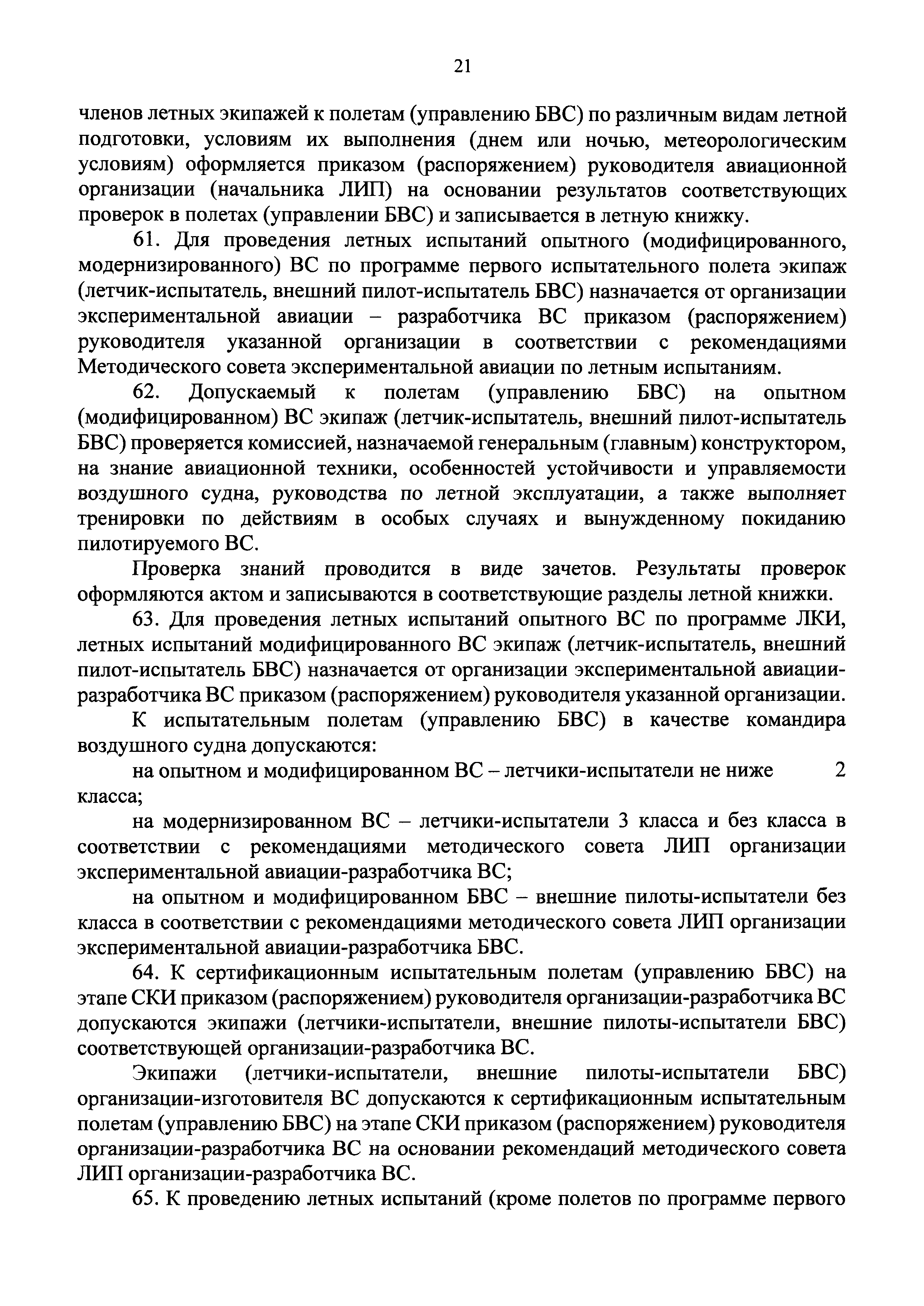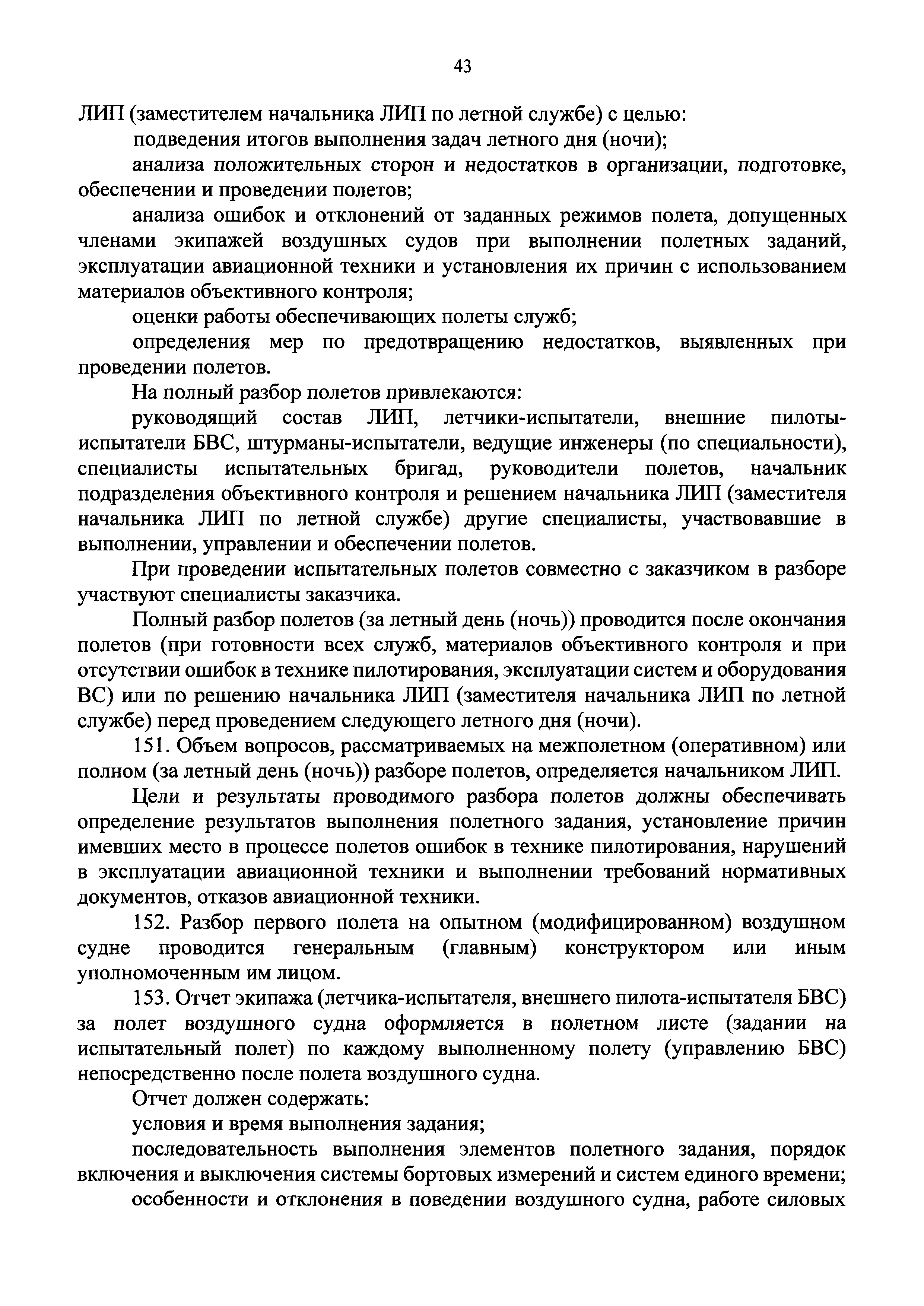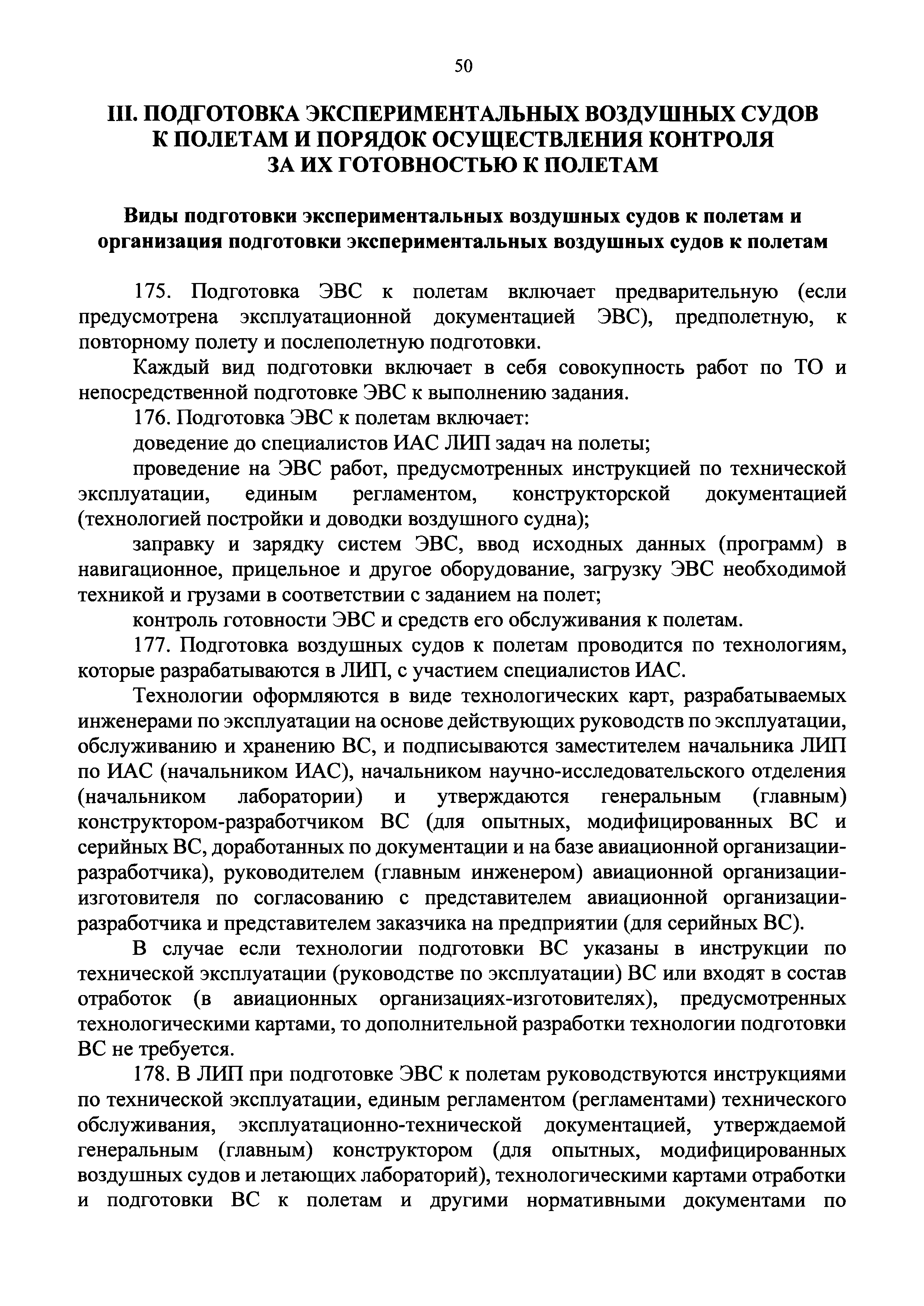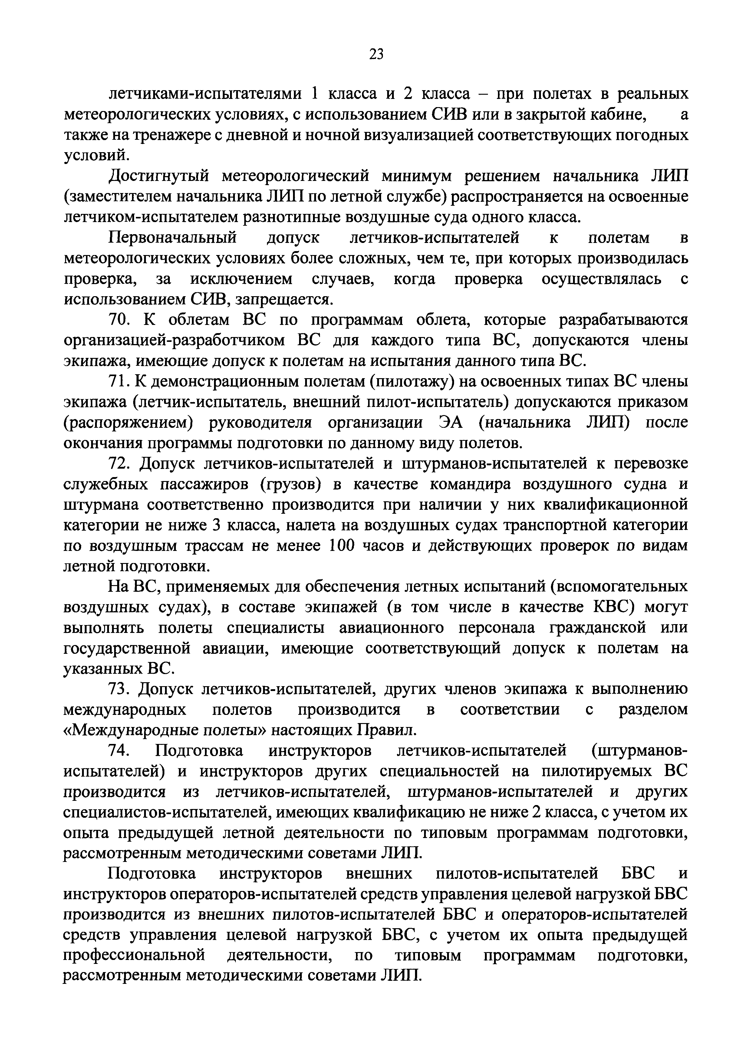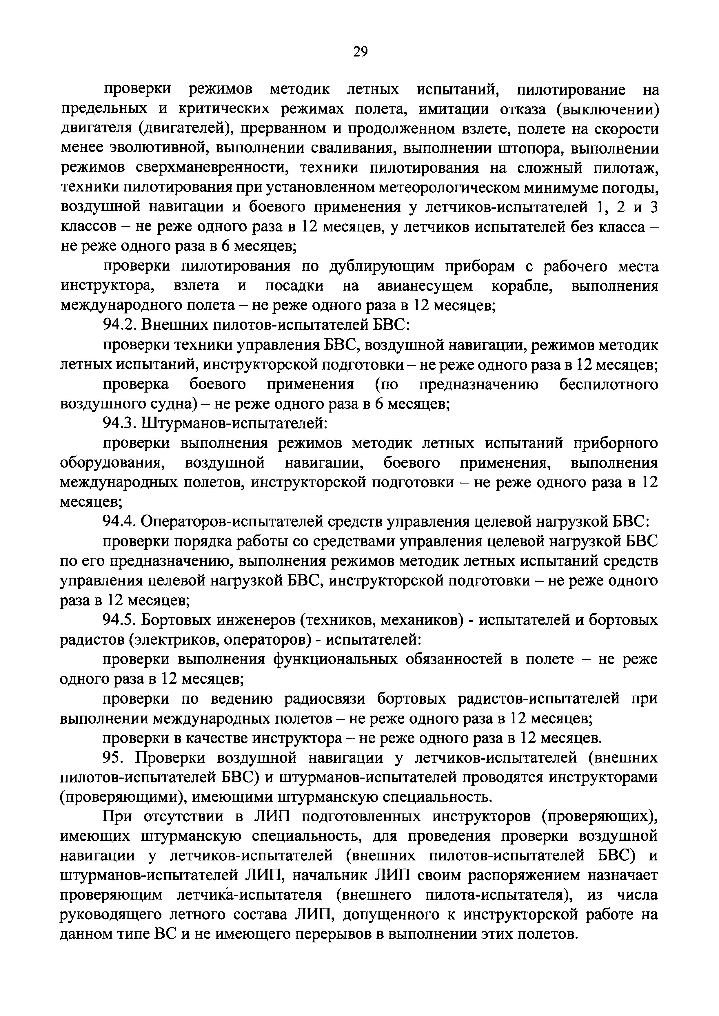 | Оглавление: | I. Общие положения II. Подготовка экипажей к полетам, порядок осуществления контроля за их готовностью к полетам III. Подготовка экспериментальных воздушных судов к полетам и порядок осуществления контроля за их готовностью к полетам IV. Порядок управления полетами V. Порядок выполнения полетов экспериментальных воздушных судов и их экипажей VI. Порядок оформления и ведения документации по летно-испытательной работе в летно-испытательных подразделениях организаций экспериментальной авиации Приложение № 1. Перечень сокращенных наименований и обозначений Приложение № 2. Плановая таблица полетов Приложение № 3. Условные знаки для оформления плановых таблиц полетов и других документов Приложение № 4. Максимальные перерывы в выполнении полетов (в месяцах) Приложение № 5. Условия, при которых полет выполняется по правилам визуальных полетов (ПВП) Приложение № 6. Максимальные значения параметров метеорологических элементов, полеты при которых считаются выполненными в приборных метеорологических условиях (ПМУ) и заходы на посадку при метеорологическом минимуме погоды Приложение № 7. Сигналы (команды), подаваемые эволюциями самолета при управлении группой Приложение № 8. Порядок передачи сигнала и сообщения о бедствии Приложение № 9. Сигналы (команды), подаваемые экипажам воздушных судов при отсутствии радиосвязи Приложение № 10. Журнал старшего руководителя полетов Приложение № 11. Журнал диспетчерских разрешений и решений командиров воздушных судов на вылет Приложение № 12. План работы летно-испытательного подразделения Приложение № 13. План-график тренировок членов экипажей воздушных судов в технике пилотирования (управления БВС), воздушной навигации и боевом применении Приложение № 14. План-график проверок членов экипажей воздушных судов в технике пилотирования (управления БВС), воздушной навигации и боевом применении, отпусков и прохождения врачебно-летной экспертизы Приложение № 15. План технической учебы специалистов авиационного персонала летно-испытательного подразделения Приложение № 16. Журнал технической учебы Приложение № 17. Журнал учета проведения предварительной, предполетной подготовок экипажей к полетам и разбора полетов Приложение № 18. Журнал подготовки экспериментального воздушного судна к испытательным и другим видам полетов Приложение № 19. Бортовая карточка на перелет экспериментального ВС Приложение № 20. План работы методического совета ЛИП Приложение № 21. Задание на испытательный полет Приложение № 22. Полетный лист для организаций-разработчиков ВС, научно-исследовательских (испытательных) организациях авиационной промышленности Приложение № 23. Полетный лист для организаций-изготовителей ВС (АРЗ) Приложение № 24. Ведомость замечаний, выявленных экипажем в полете |