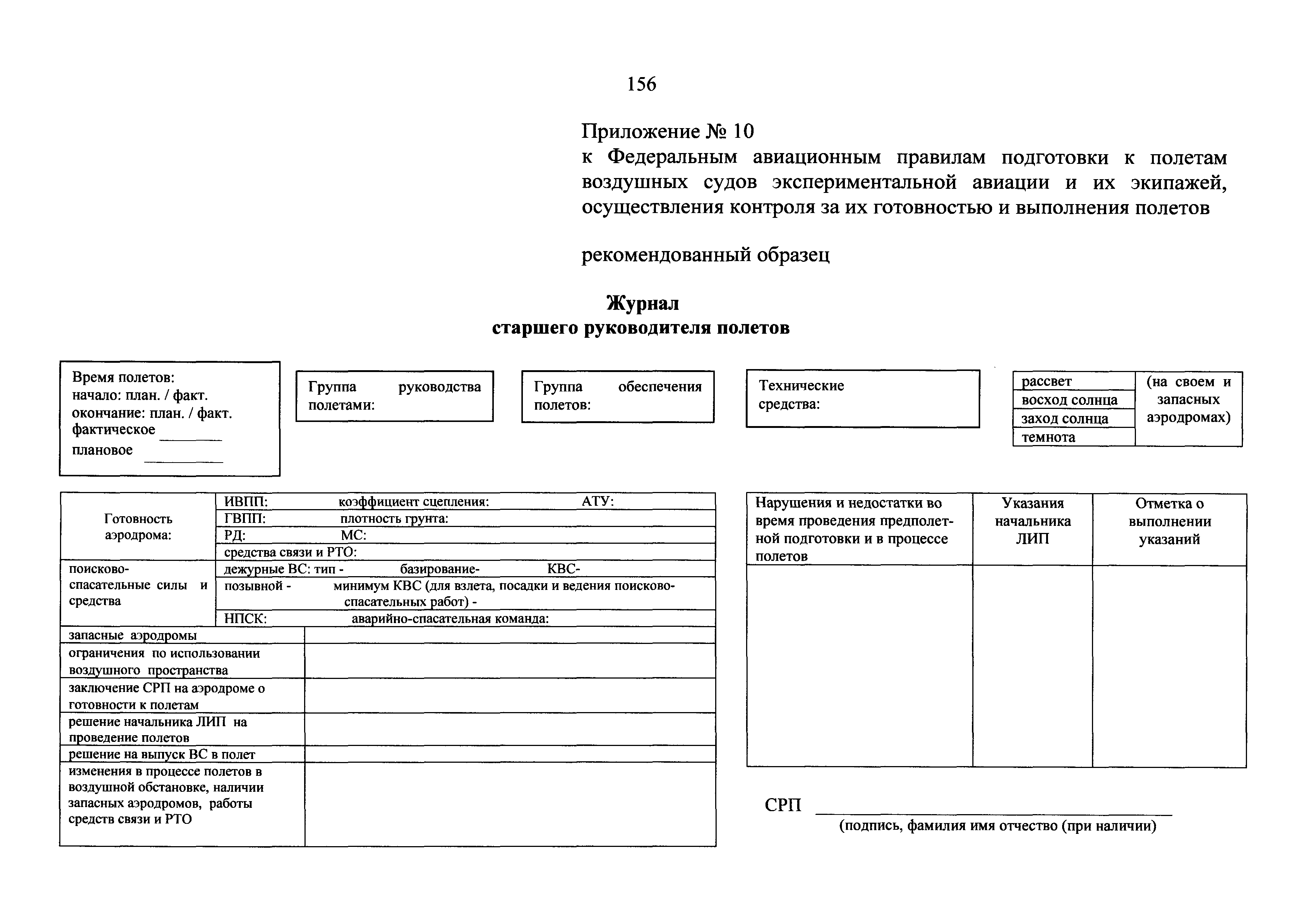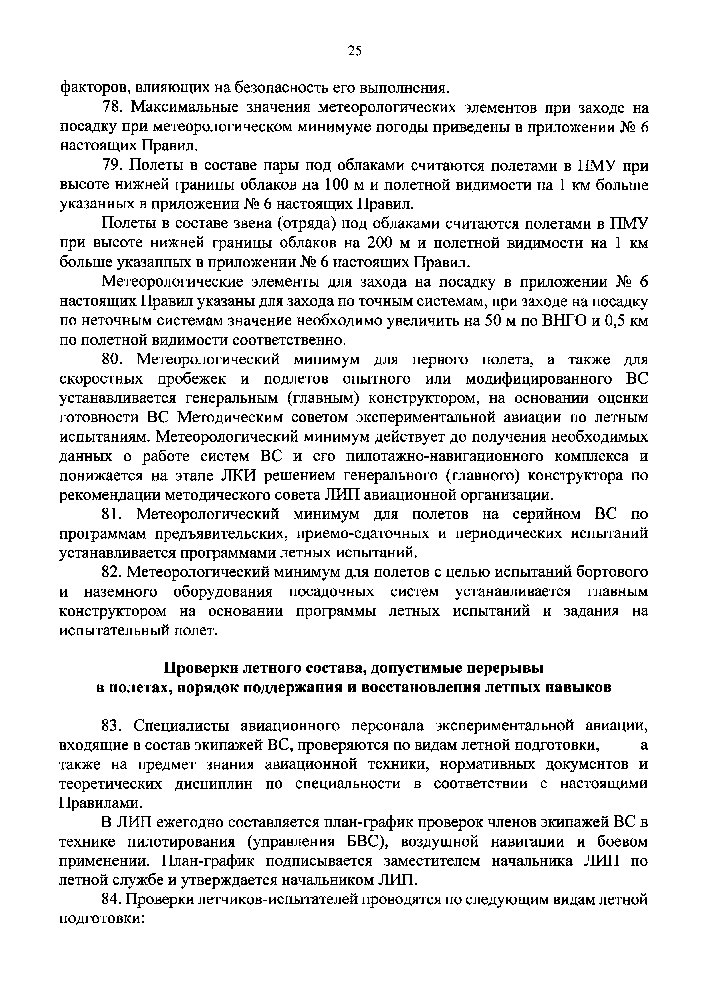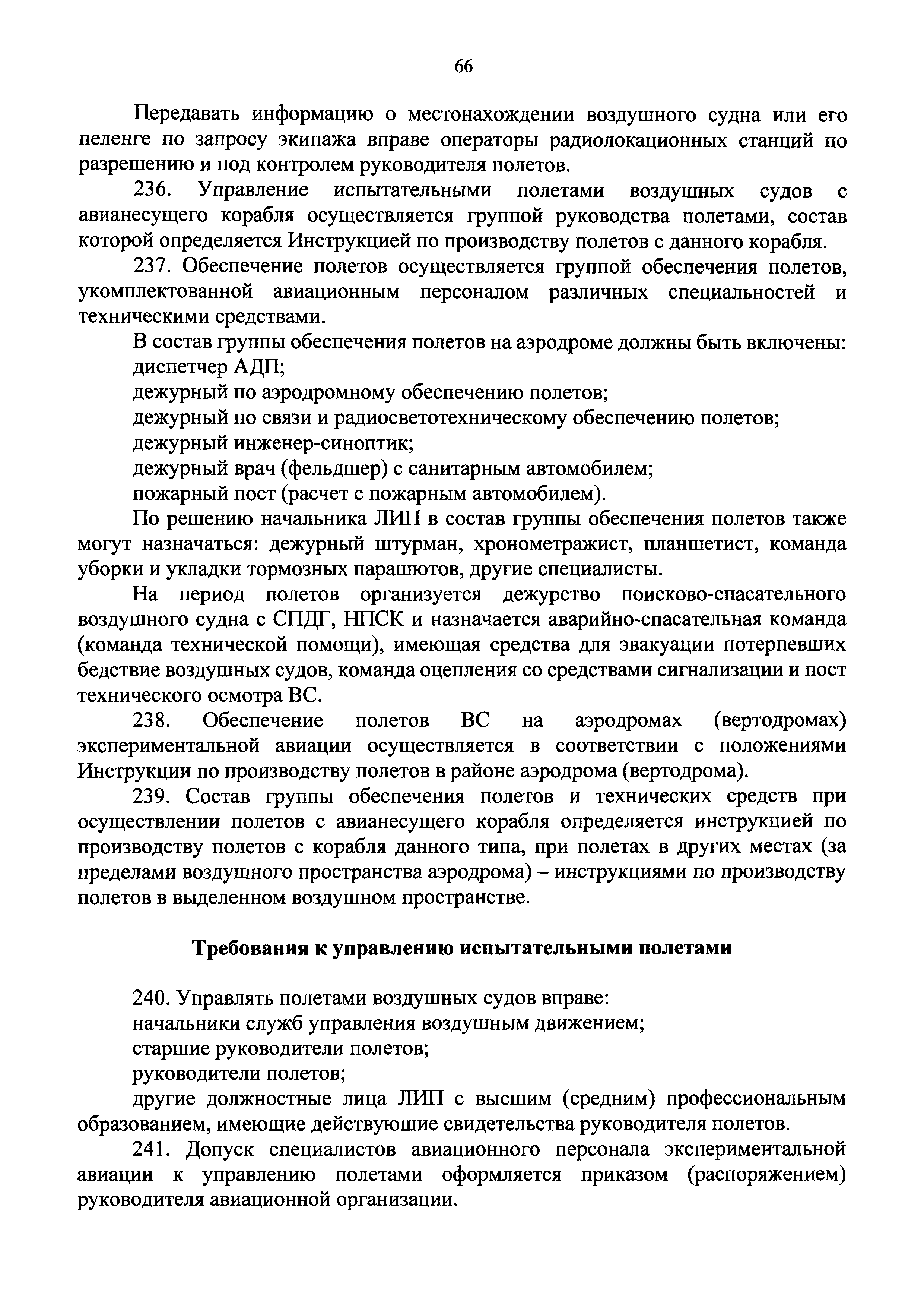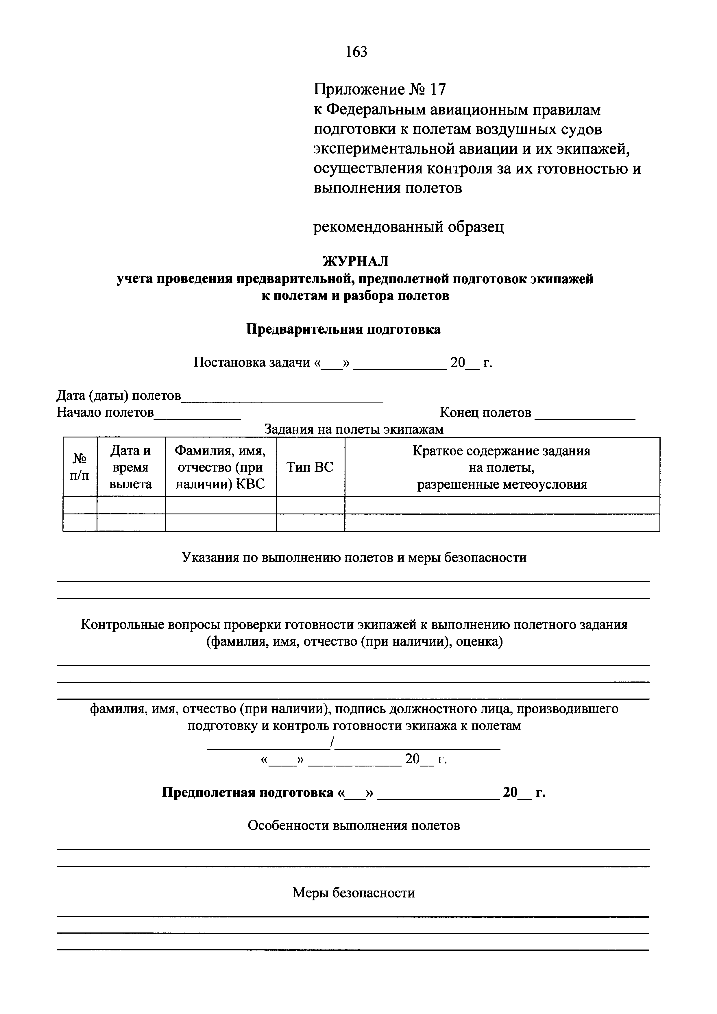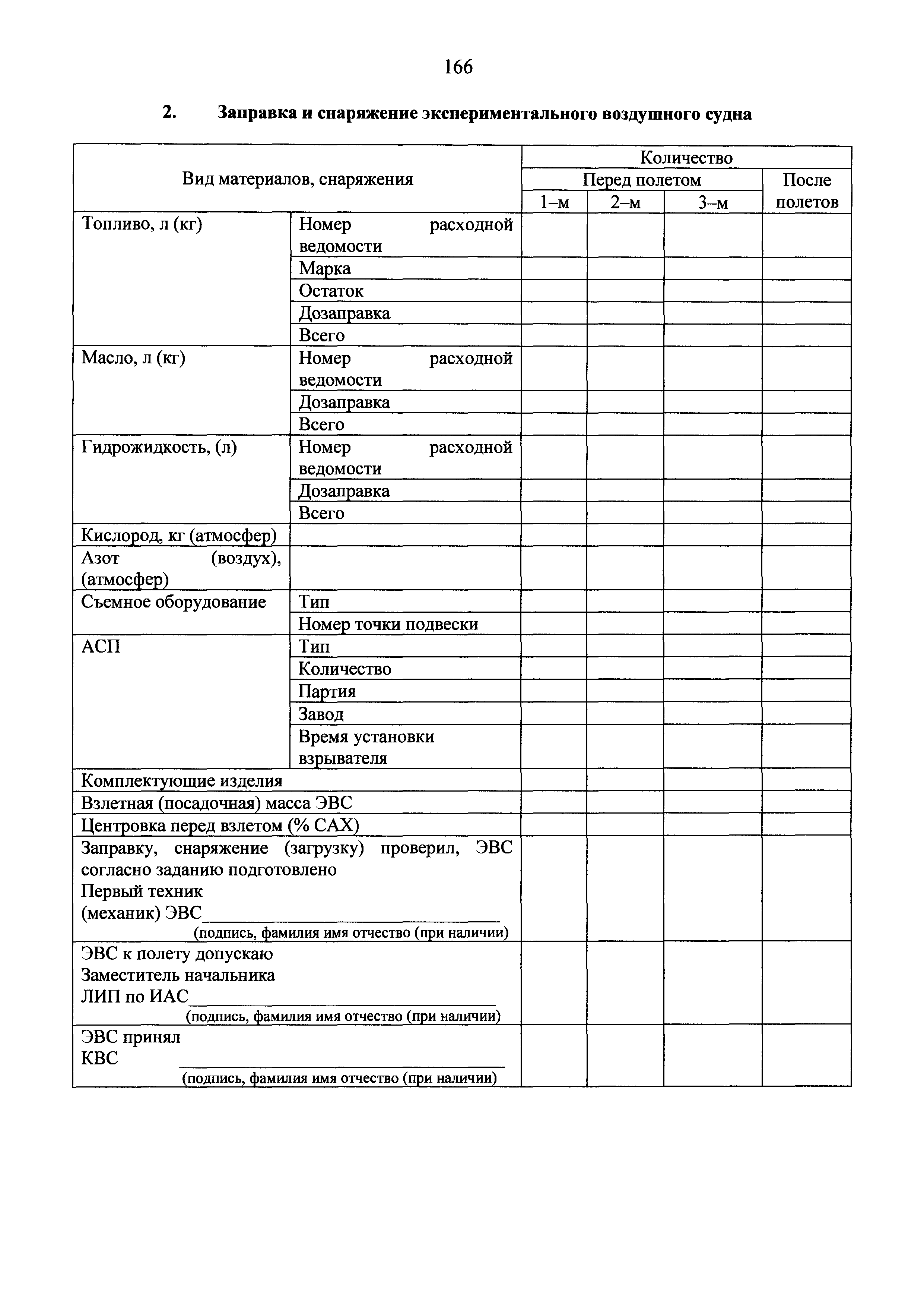 | Оглавление: | I. Общие положения II. Подготовка экипажей к полетам, порядок осуществления контроля за их готовностью к полетам III. Подготовка экспериментальных воздушных судов к полетам и порядок осуществления контроля за их готовностью к полетам IV. Порядок управления полетами V. Порядок выполнения полетов экспериментальных воздушных судов и их экипажей VI. Порядок оформления и ведения документации по летно-испытательной работе в летно-испытательных подразделениях организаций экспериментальной авиации Приложение № 1. Перечень сокращенных наименований и обозначений Приложение № 2. Плановая таблица полетов Приложение № 3. Условные знаки для оформления плановых таблиц полетов и других документов Приложение № 4. Максимальные перерывы в выполнении полетов (в месяцах) Приложение № 5. Условия, при которых полет выполняется по правилам визуальных полетов (ПВП) Приложение № 6. Максимальные значения параметров метеорологических элементов, полеты при которых считаются выполненными в приборных метеорологических условиях (ПМУ) и заходы на посадку при метеорологическом минимуме погоды Приложение № 7. Сигналы (команды), подаваемые эволюциями самолета при управлении группой Приложение № 8. Порядок передачи сигнала и сообщения о бедствии Приложение № 9. Сигналы (команды), подаваемые экипажам воздушных судов при отсутствии радиосвязи Приложение № 10. Журнал старшего руководителя полетов Приложение № 11. Журнал диспетчерских разрешений и решений командиров воздушных судов на вылет Приложение № 12. План работы летно-испытательного подразделения Приложение № 13. План-график тренировок членов экипажей воздушных судов в технике пилотирования (управления БВС), воздушной навигации и боевом применении Приложение № 14. План-график проверок членов экипажей воздушных судов в технике пилотирования (управления БВС), воздушной навигации и боевом применении, отпусков и прохождения врачебно-летной экспертизы Приложение № 15. План технической учебы специалистов авиационного персонала летно-испытательного подразделения Приложение № 16. Журнал технической учебы Приложение № 17. Журнал учета проведения предварительной, предполетной подготовок экипажей к полетам и разбора полетов Приложение № 18. Журнал подготовки экспериментального воздушного судна к испытательным и другим видам полетов Приложение № 19. Бортовая карточка на перелет экспериментального ВС Приложение № 20. План работы методического совета ЛИП Приложение № 21. Задание на испытательный полет Приложение № 22. Полетный лист для организаций-разработчиков ВС, научно-исследовательских (испытательных) организациях авиационной промышленности Приложение № 23. Полетный лист для организаций-изготовителей ВС (АРЗ) Приложение № 24. Ведомость замечаний, выявленных экипажем в полете |