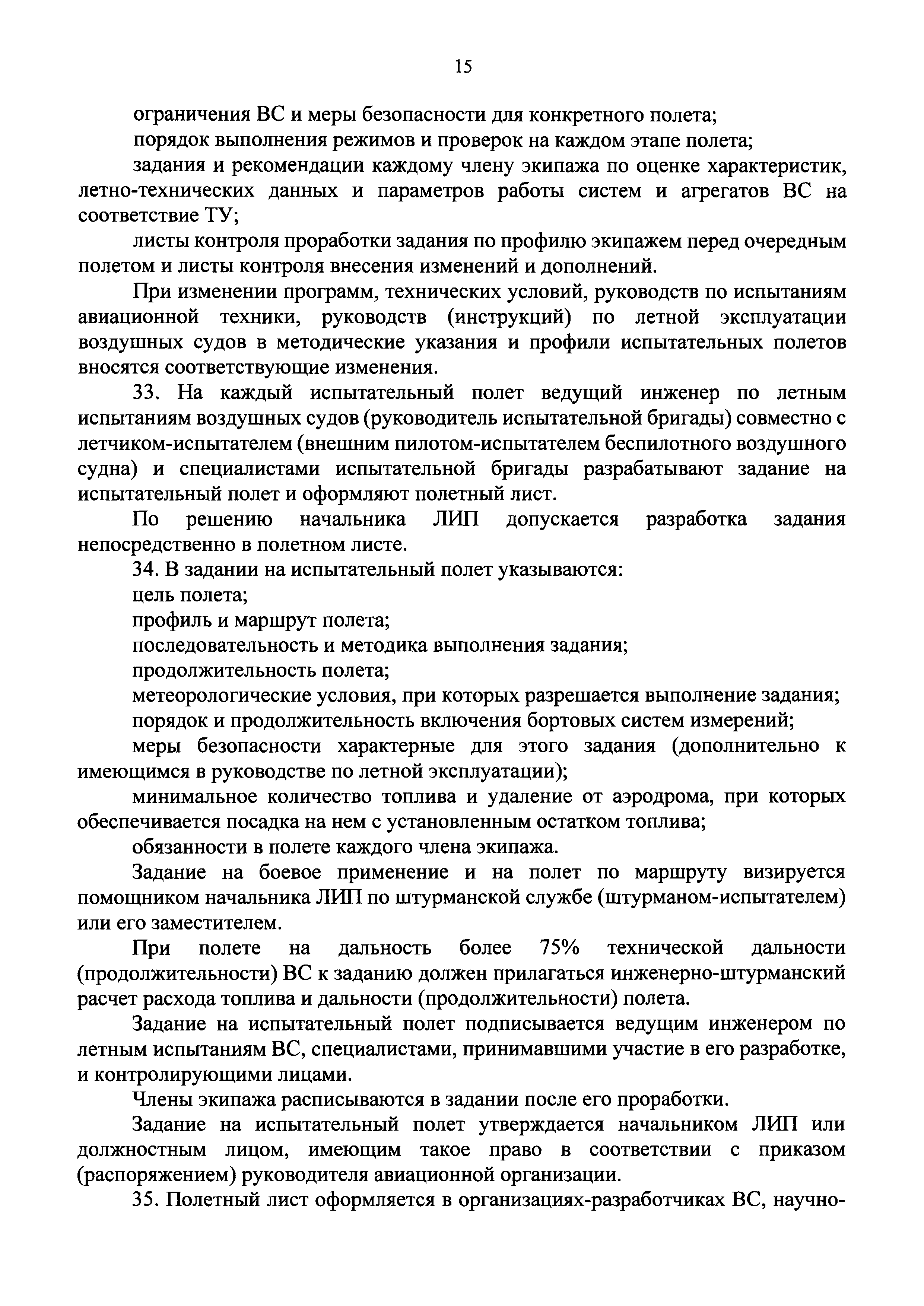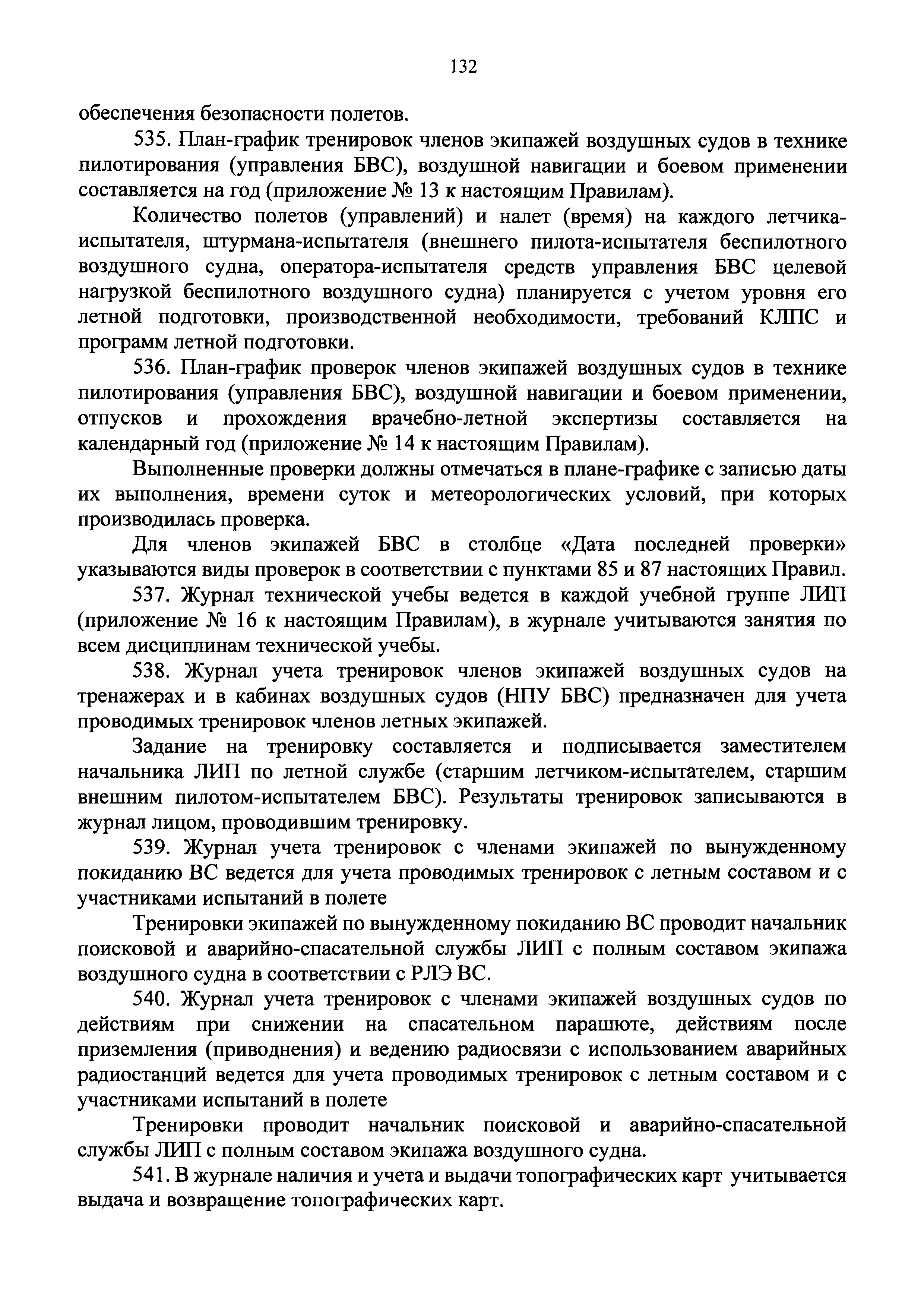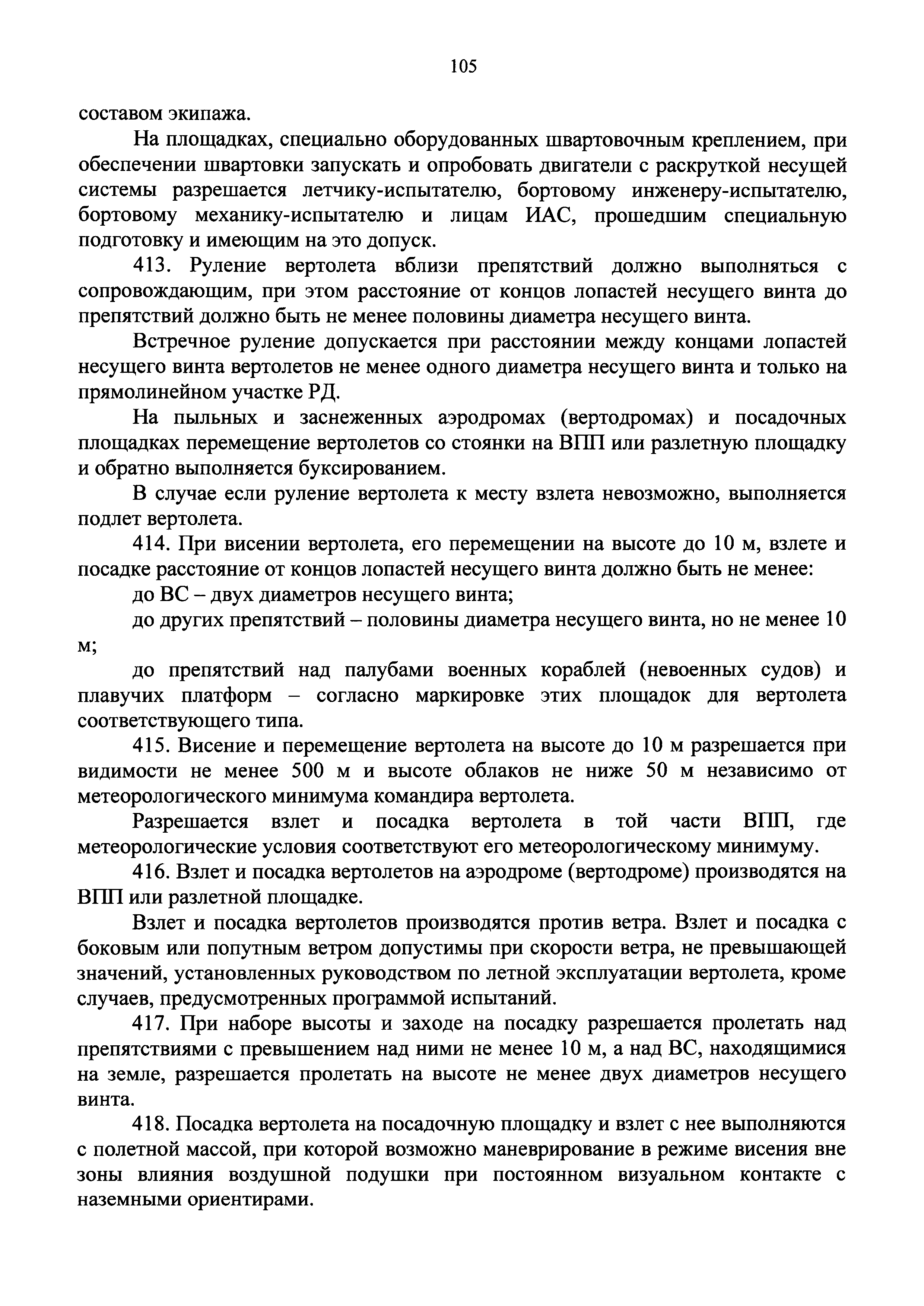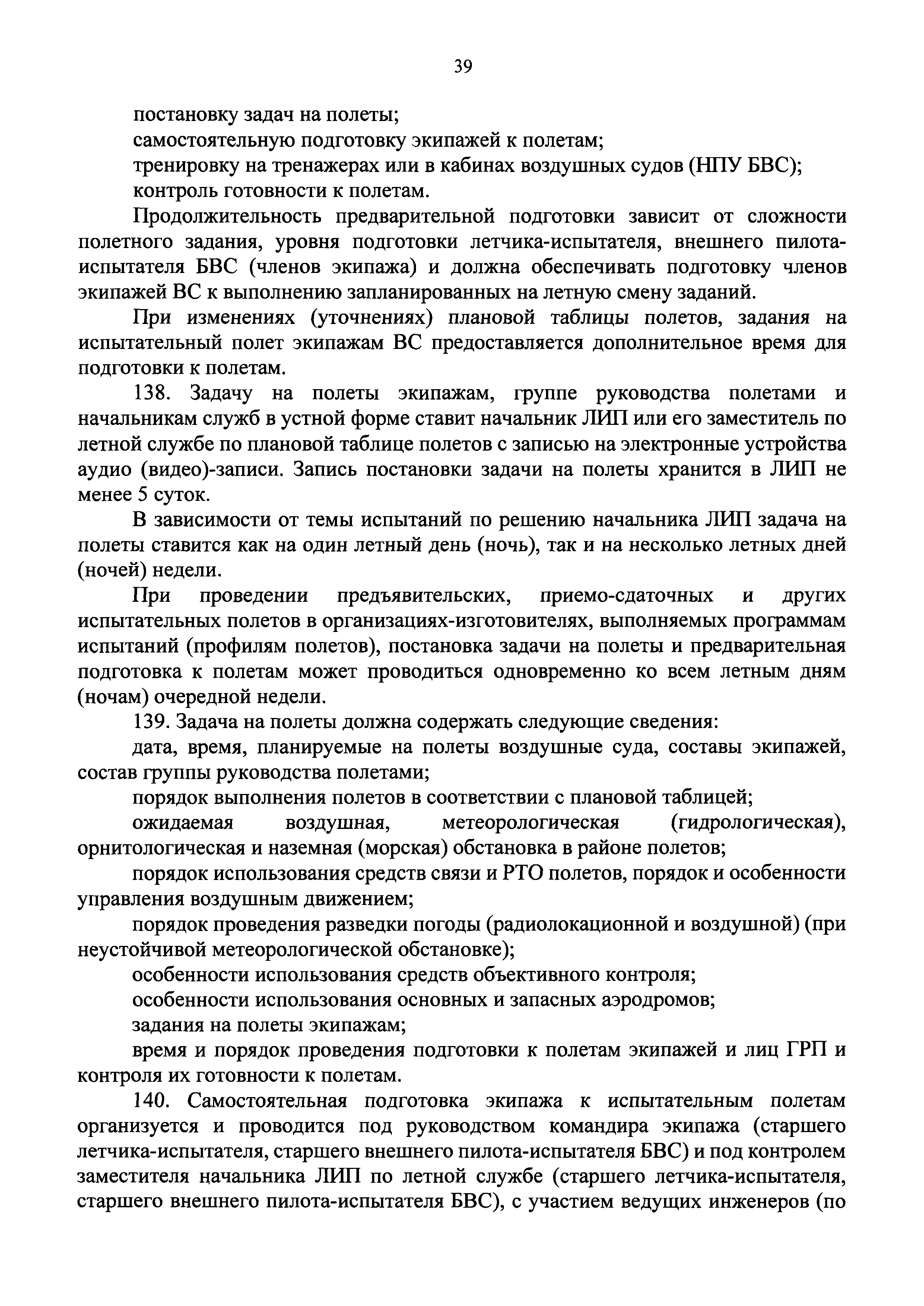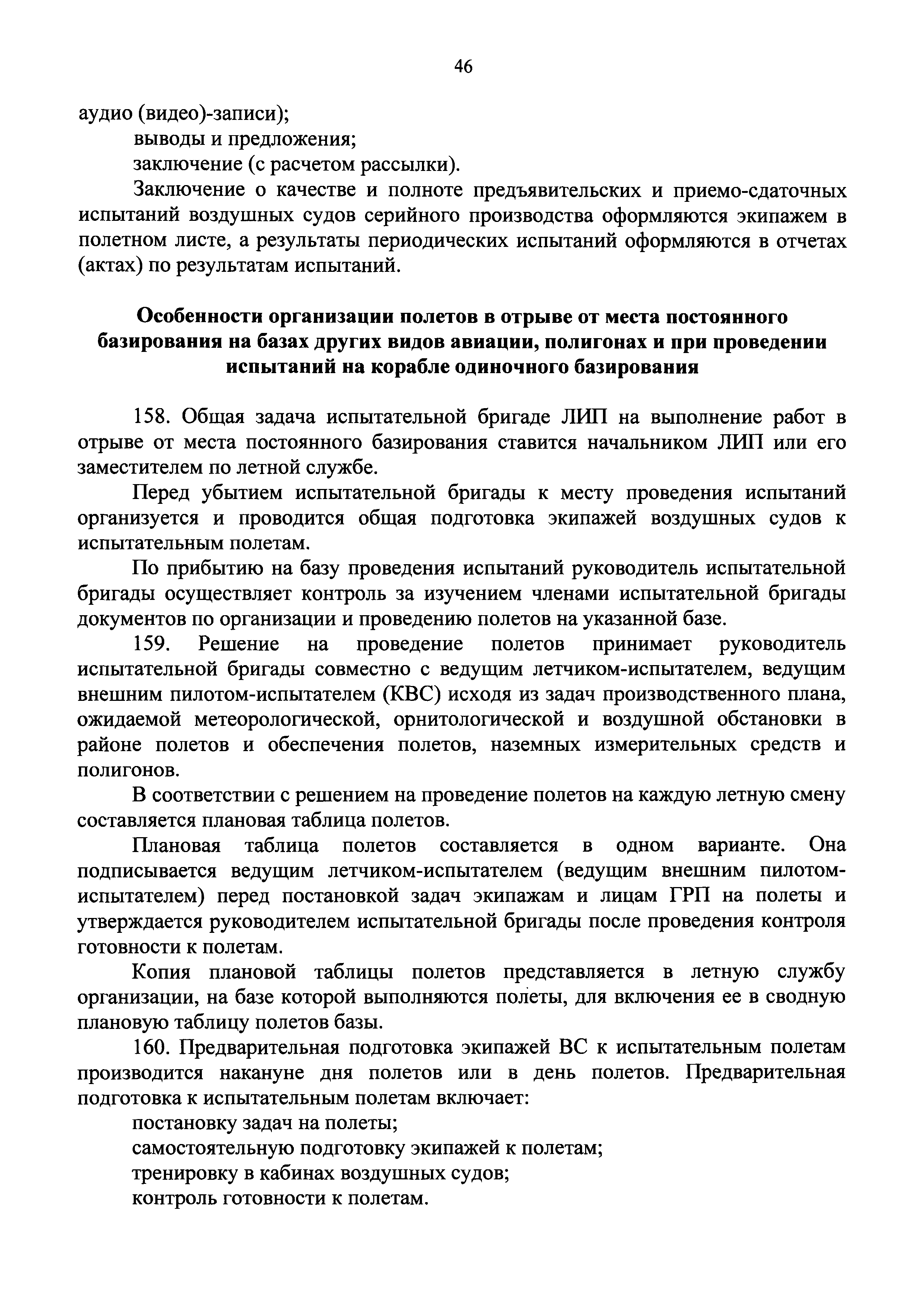 | Оглавление: | I. Общие положения II. Подготовка экипажей к полетам, порядок осуществления контроля за их готовностью к полетам III. Подготовка экспериментальных воздушных судов к полетам и порядок осуществления контроля за их готовностью к полетам IV. Порядок управления полетами V. Порядок выполнения полетов экспериментальных воздушных судов и их экипажей VI. Порядок оформления и ведения документации по летно-испытательной работе в летно-испытательных подразделениях организаций экспериментальной авиации Приложение № 1. Перечень сокращенных наименований и обозначений Приложение № 2. Плановая таблица полетов Приложение № 3. Условные знаки для оформления плановых таблиц полетов и других документов Приложение № 4. Максимальные перерывы в выполнении полетов (в месяцах) Приложение № 5. Условия, при которых полет выполняется по правилам визуальных полетов (ПВП) Приложение № 6. Максимальные значения параметров метеорологических элементов, полеты при которых считаются выполненными в приборных метеорологических условиях (ПМУ) и заходы на посадку при метеорологическом минимуме погоды Приложение № 7. Сигналы (команды), подаваемые эволюциями самолета при управлении группой Приложение № 8. Порядок передачи сигнала и сообщения о бедствии Приложение № 9. Сигналы (команды), подаваемые экипажам воздушных судов при отсутствии радиосвязи Приложение № 10. Журнал старшего руководителя полетов Приложение № 11. Журнал диспетчерских разрешений и решений командиров воздушных судов на вылет Приложение № 12. План работы летно-испытательного подразделения Приложение № 13. План-график тренировок членов экипажей воздушных судов в технике пилотирования (управления БВС), воздушной навигации и боевом применении Приложение № 14. План-график проверок членов экипажей воздушных судов в технике пилотирования (управления БВС), воздушной навигации и боевом применении, отпусков и прохождения врачебно-летной экспертизы Приложение № 15. План технической учебы специалистов авиационного персонала летно-испытательного подразделения Приложение № 16. Журнал технической учебы Приложение № 17. Журнал учета проведения предварительной, предполетной подготовок экипажей к полетам и разбора полетов Приложение № 18. Журнал подготовки экспериментального воздушного судна к испытательным и другим видам полетов Приложение № 19. Бортовая карточка на перелет экспериментального ВС Приложение № 20. План работы методического совета ЛИП Приложение № 21. Задание на испытательный полет Приложение № 22. Полетный лист для организаций-разработчиков ВС, научно-исследовательских (испытательных) организациях авиационной промышленности Приложение № 23. Полетный лист для организаций-изготовителей ВС (АРЗ) Приложение № 24. Ведомость замечаний, выявленных экипажем в полете |