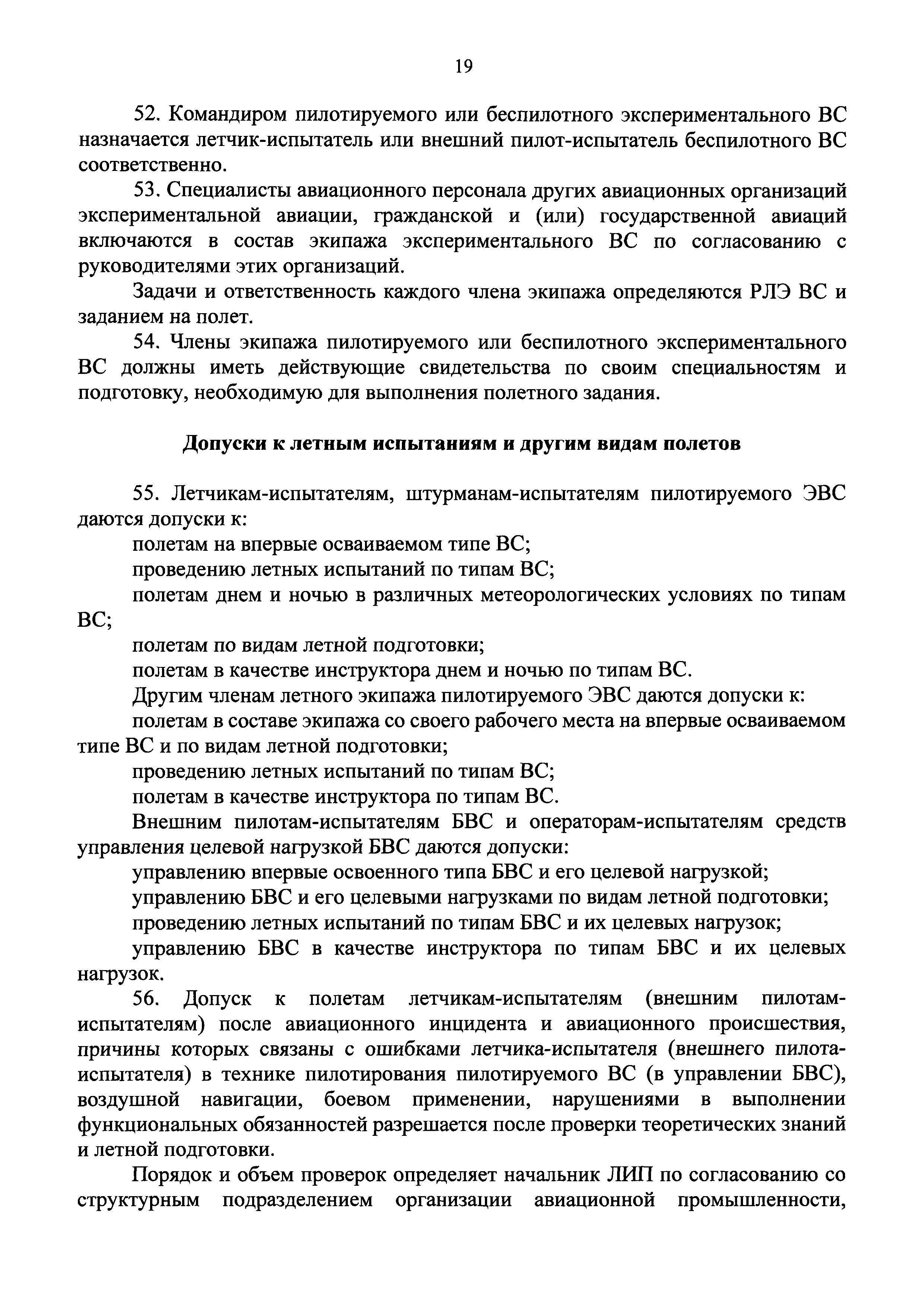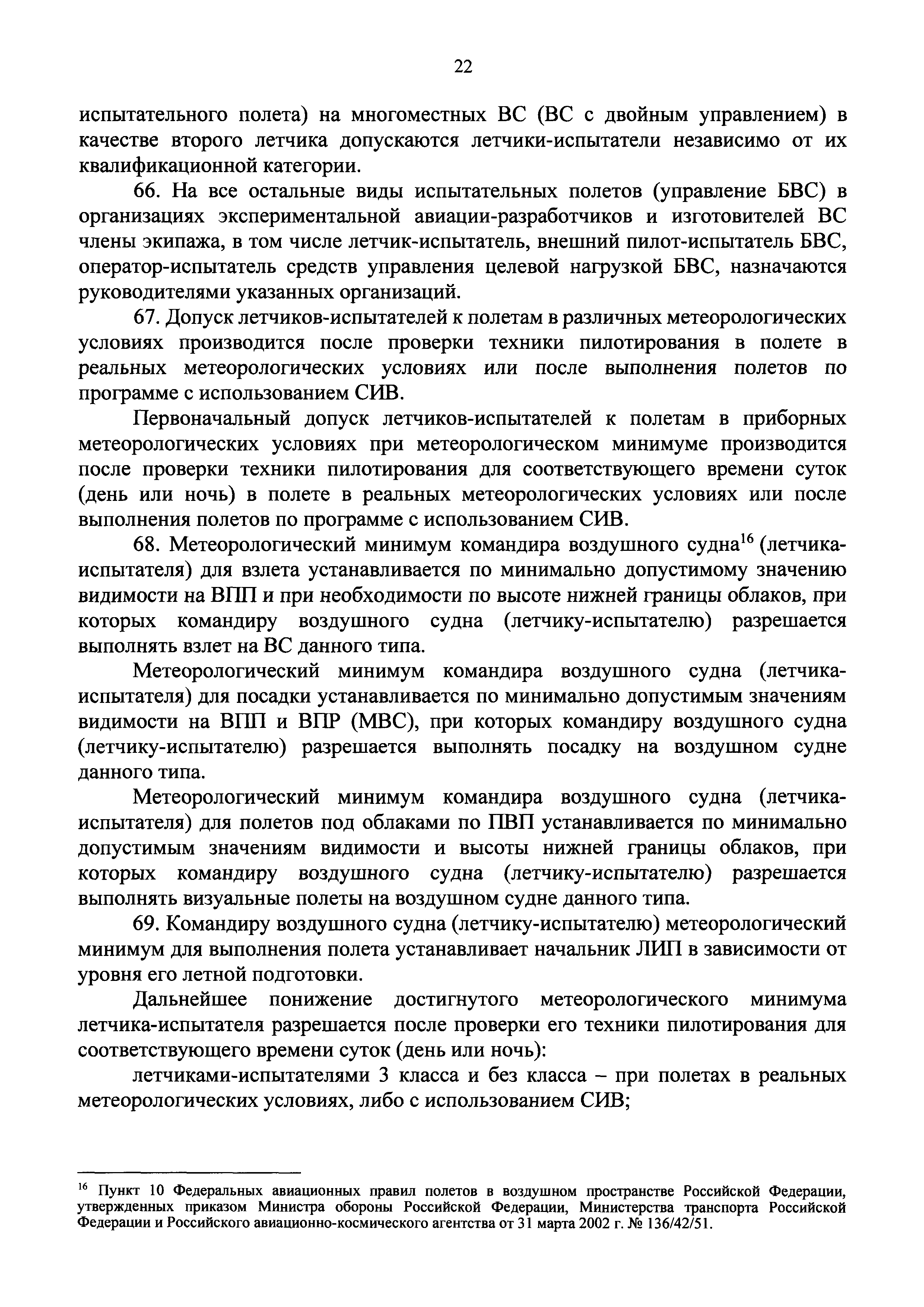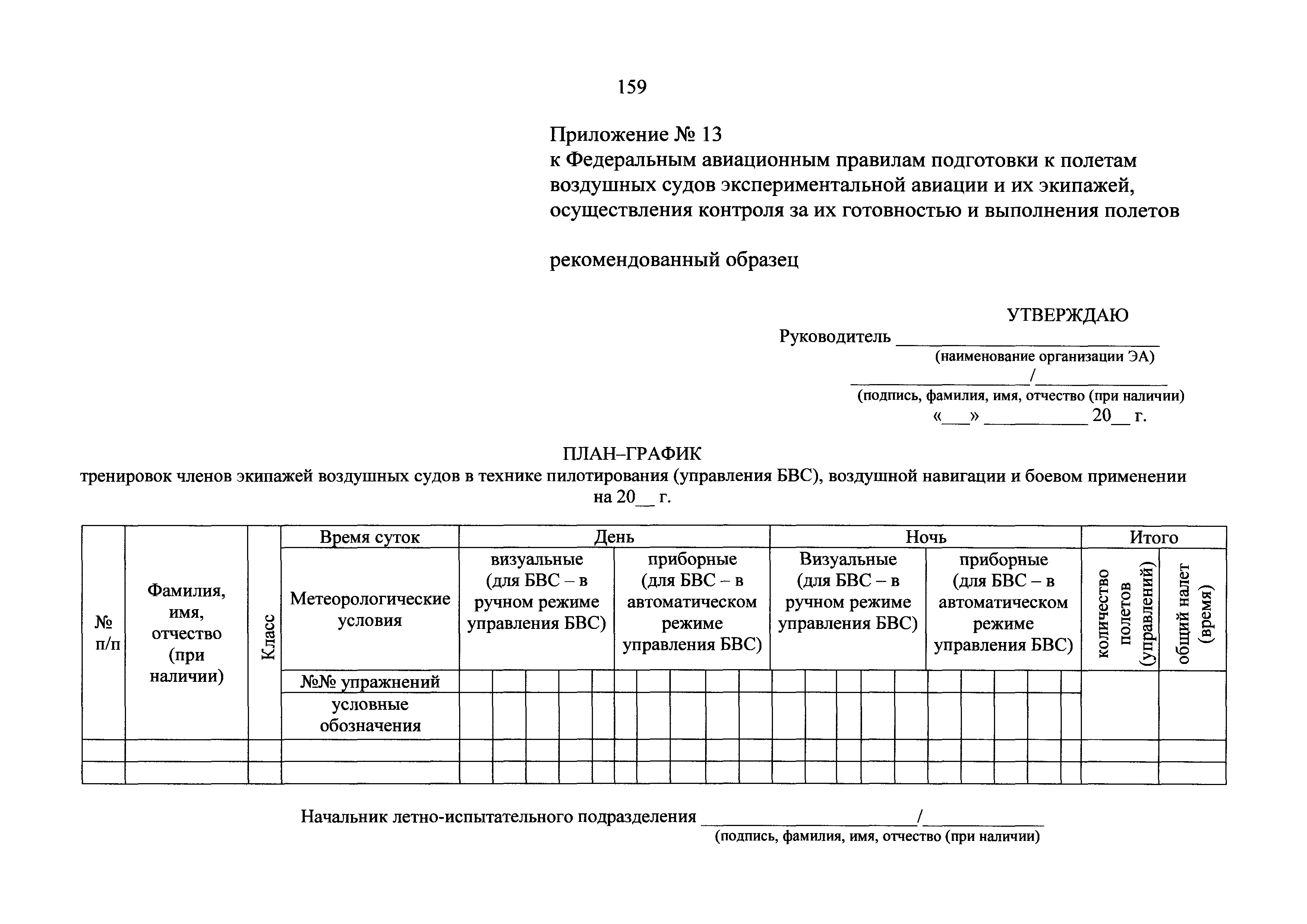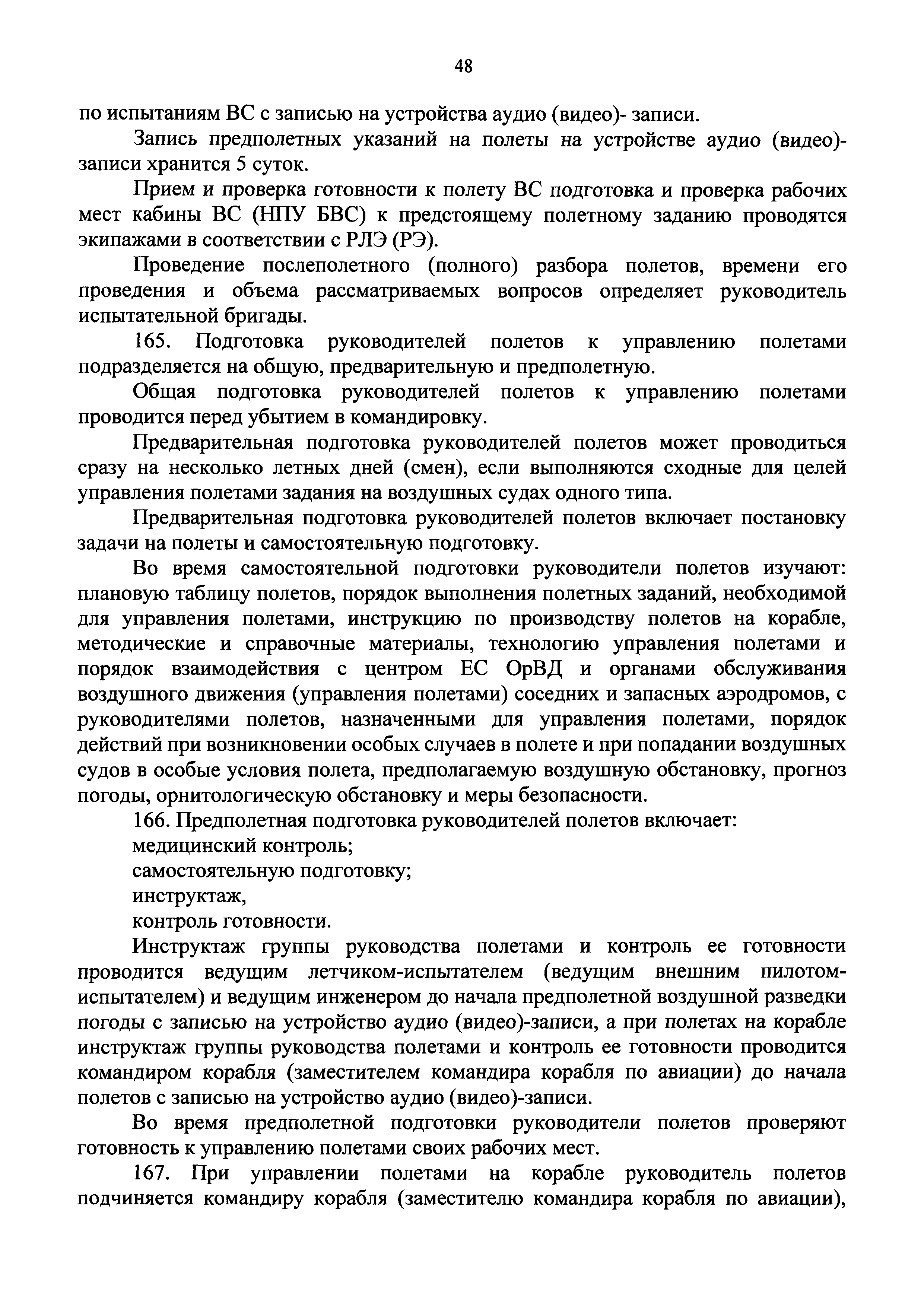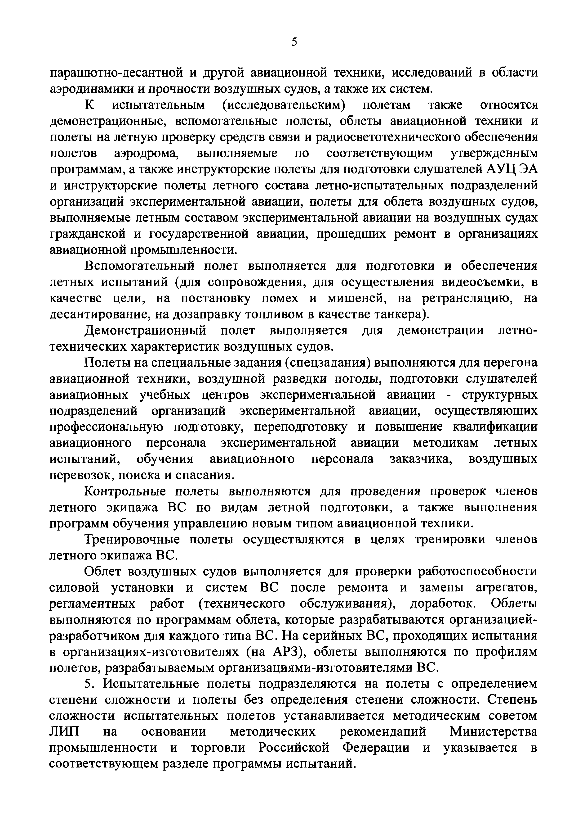 | Оглавление: | I. Общие положения II. Подготовка экипажей к полетам, порядок осуществления контроля за их готовностью к полетам III. Подготовка экспериментальных воздушных судов к полетам и порядок осуществления контроля за их готовностью к полетам IV. Порядок управления полетами V. Порядок выполнения полетов экспериментальных воздушных судов и их экипажей VI. Порядок оформления и ведения документации по летно-испытательной работе в летно-испытательных подразделениях организаций экспериментальной авиации Приложение № 1. Перечень сокращенных наименований и обозначений Приложение № 2. Плановая таблица полетов Приложение № 3. Условные знаки для оформления плановых таблиц полетов и других документов Приложение № 4. Максимальные перерывы в выполнении полетов (в месяцах) Приложение № 5. Условия, при которых полет выполняется по правилам визуальных полетов (ПВП) Приложение № 6. Максимальные значения параметров метеорологических элементов, полеты при которых считаются выполненными в приборных метеорологических условиях (ПМУ) и заходы на посадку при метеорологическом минимуме погоды Приложение № 7. Сигналы (команды), подаваемые эволюциями самолета при управлении группой Приложение № 8. Порядок передачи сигнала и сообщения о бедствии Приложение № 9. Сигналы (команды), подаваемые экипажам воздушных судов при отсутствии радиосвязи Приложение № 10. Журнал старшего руководителя полетов Приложение № 11. Журнал диспетчерских разрешений и решений командиров воздушных судов на вылет Приложение № 12. План работы летно-испытательного подразделения Приложение № 13. План-график тренировок членов экипажей воздушных судов в технике пилотирования (управления БВС), воздушной навигации и боевом применении Приложение № 14. План-график проверок членов экипажей воздушных судов в технике пилотирования (управления БВС), воздушной навигации и боевом применении, отпусков и прохождения врачебно-летной экспертизы Приложение № 15. План технической учебы специалистов авиационного персонала летно-испытательного подразделения Приложение № 16. Журнал технической учебы Приложение № 17. Журнал учета проведения предварительной, предполетной подготовок экипажей к полетам и разбора полетов Приложение № 18. Журнал подготовки экспериментального воздушного судна к испытательным и другим видам полетов Приложение № 19. Бортовая карточка на перелет экспериментального ВС Приложение № 20. План работы методического совета ЛИП Приложение № 21. Задание на испытательный полет Приложение № 22. Полетный лист для организаций-разработчиков ВС, научно-исследовательских (испытательных) организациях авиационной промышленности Приложение № 23. Полетный лист для организаций-изготовителей ВС (АРЗ) Приложение № 24. Ведомость замечаний, выявленных экипажем в полете |