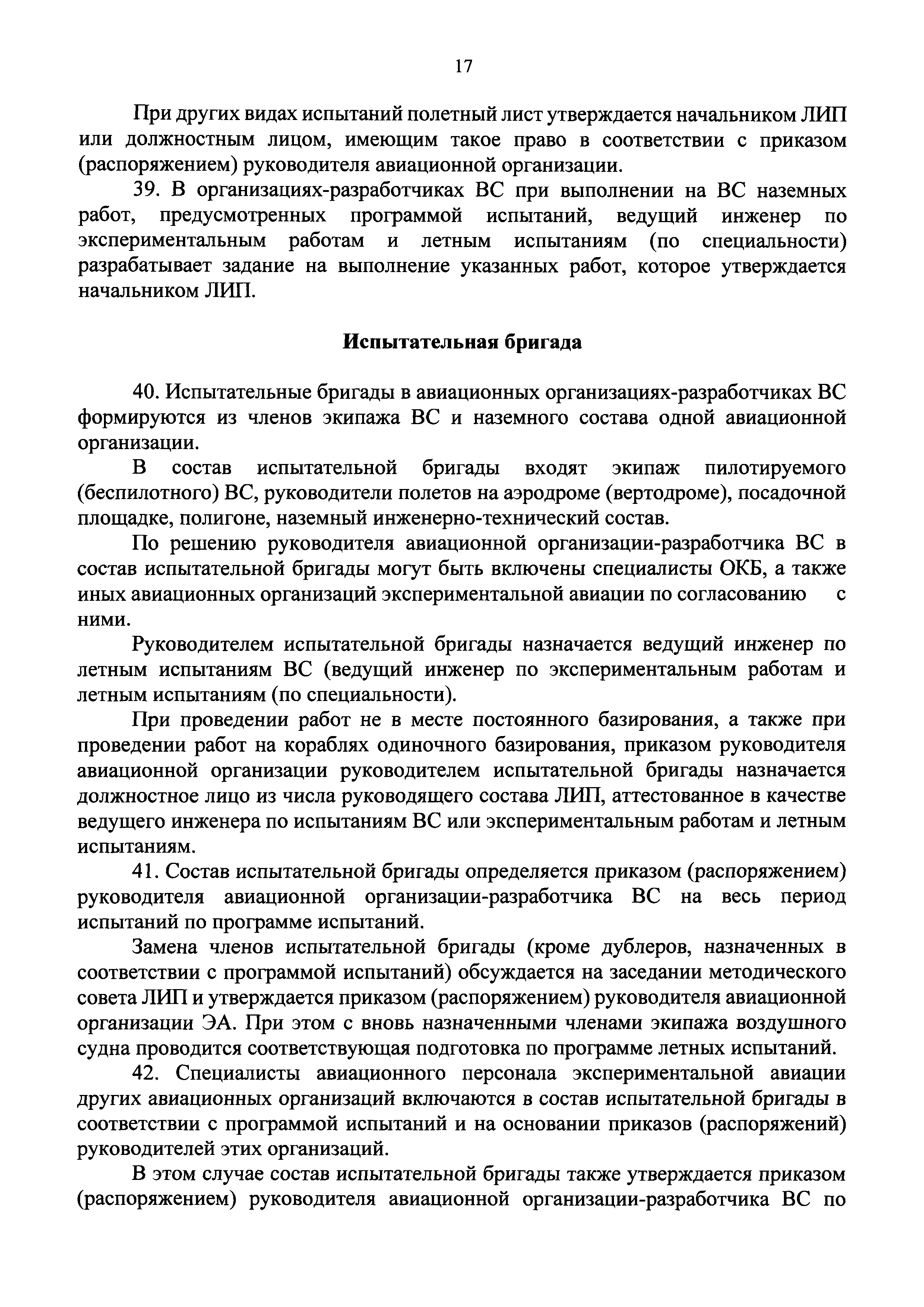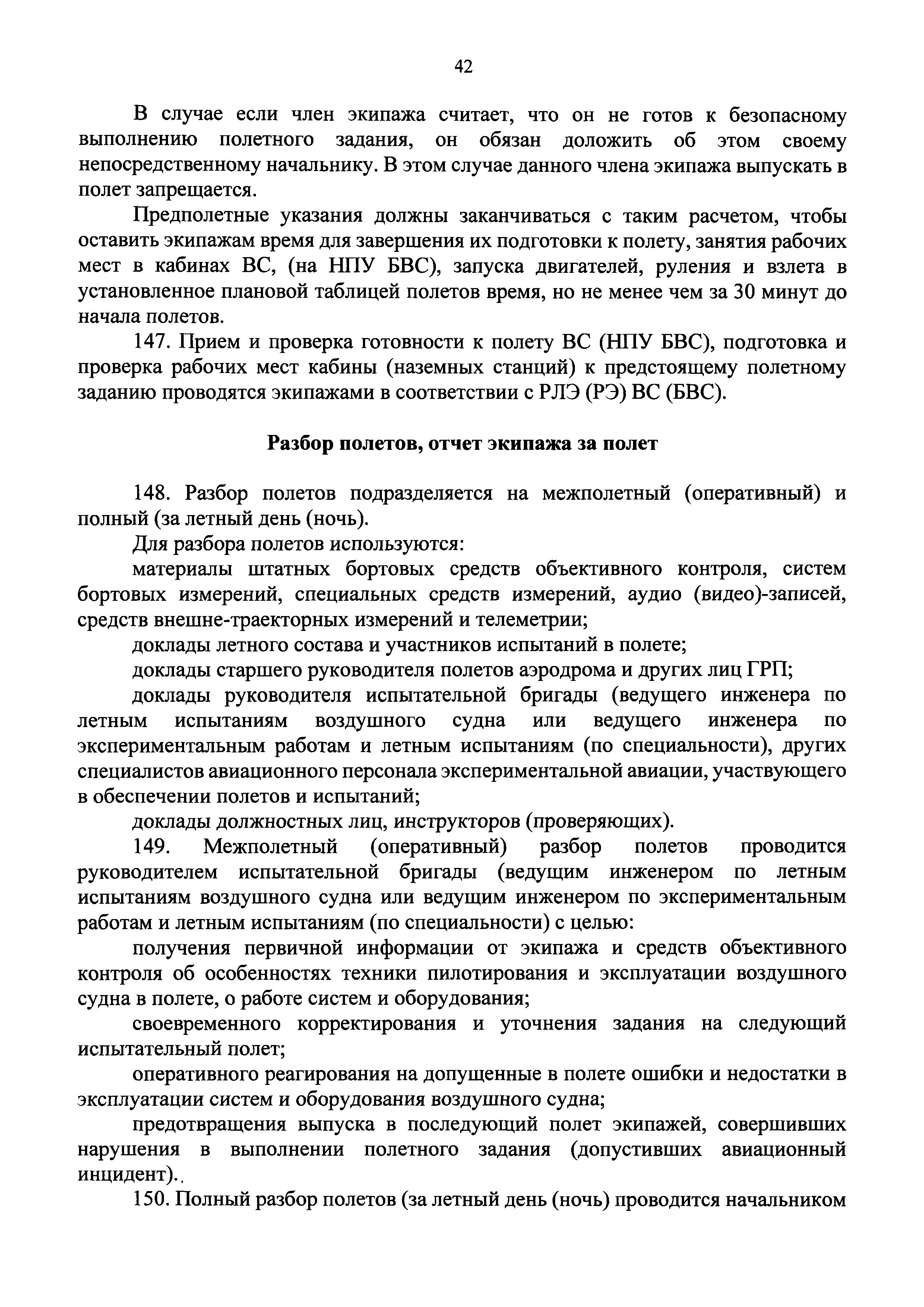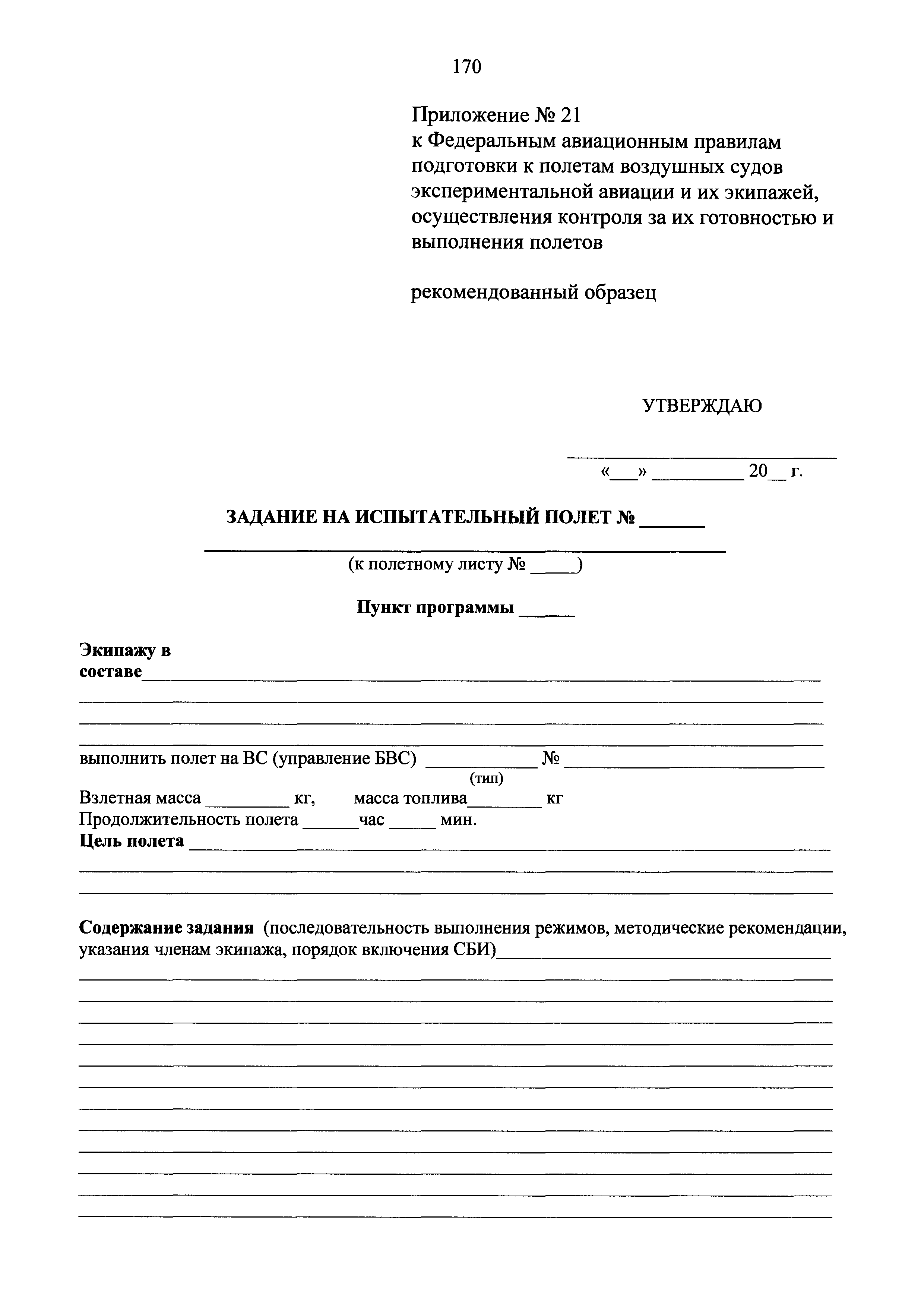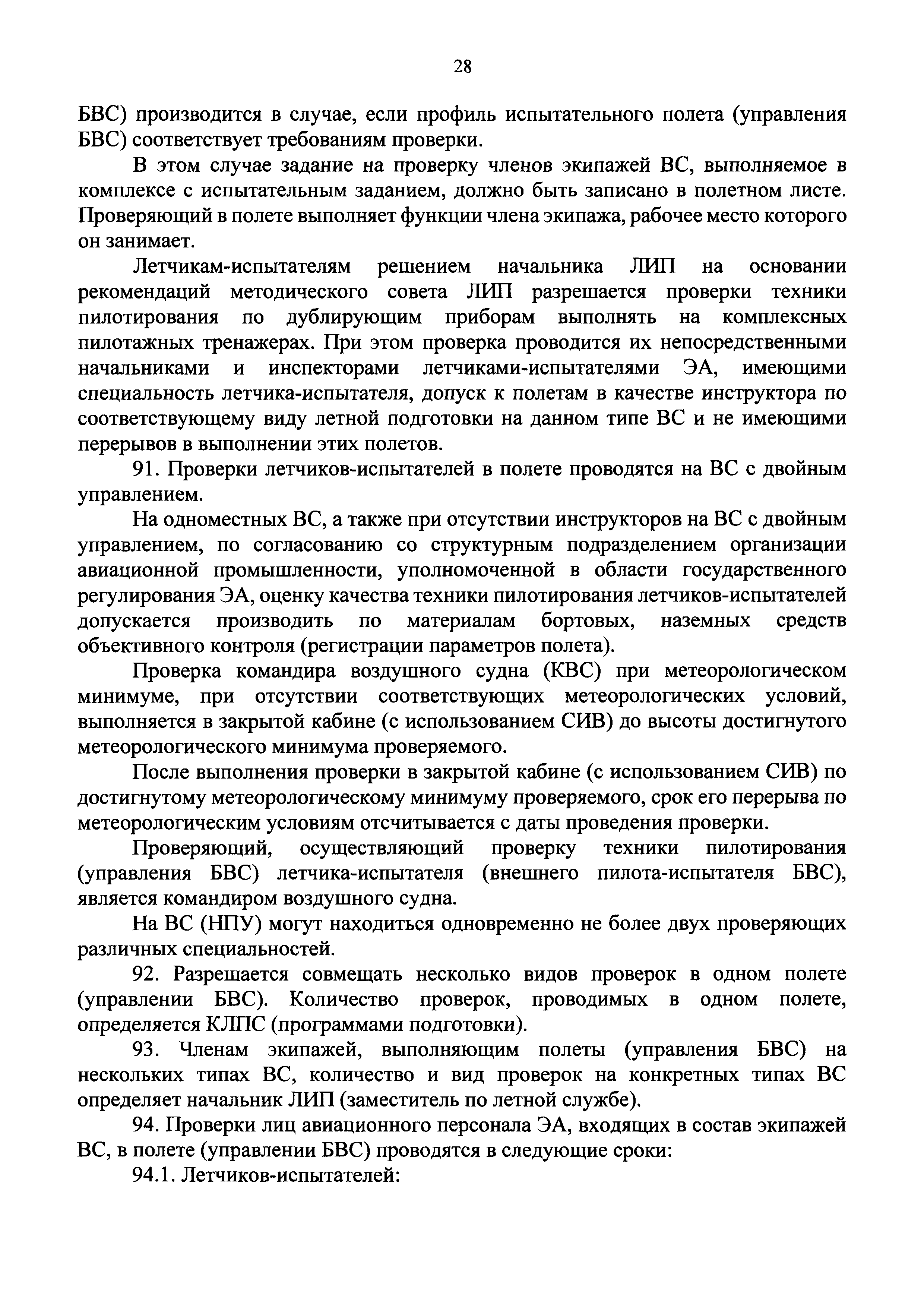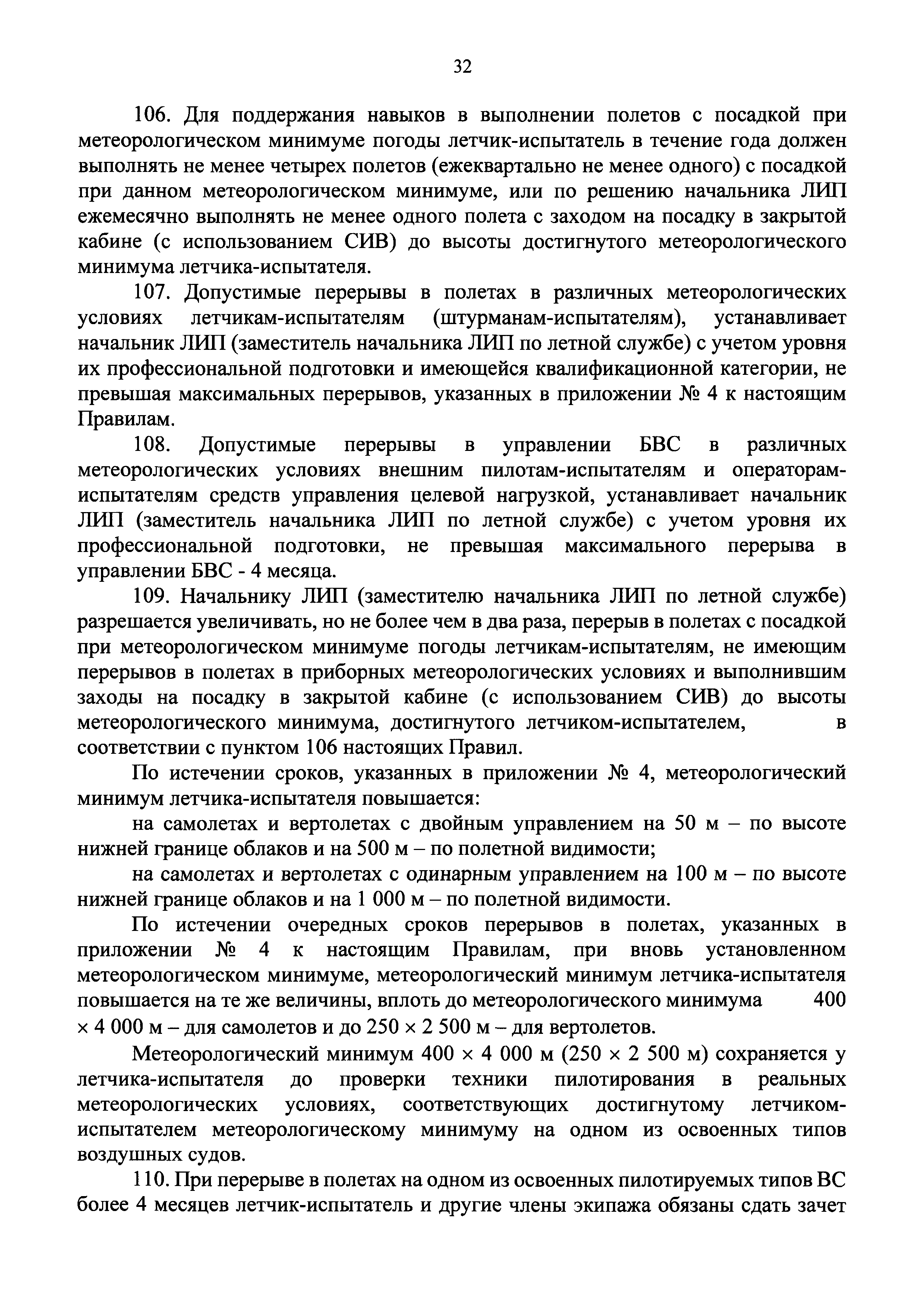 | Оглавление: | I. Общие положения II. Подготовка экипажей к полетам, порядок осуществления контроля за их готовностью к полетам III. Подготовка экспериментальных воздушных судов к полетам и порядок осуществления контроля за их готовностью к полетам IV. Порядок управления полетами V. Порядок выполнения полетов экспериментальных воздушных судов и их экипажей VI. Порядок оформления и ведения документации по летно-испытательной работе в летно-испытательных подразделениях организаций экспериментальной авиации Приложение № 1. Перечень сокращенных наименований и обозначений Приложение № 2. Плановая таблица полетов Приложение № 3. Условные знаки для оформления плановых таблиц полетов и других документов Приложение № 4. Максимальные перерывы в выполнении полетов (в месяцах) Приложение № 5. Условия, при которых полет выполняется по правилам визуальных полетов (ПВП) Приложение № 6. Максимальные значения параметров метеорологических элементов, полеты при которых считаются выполненными в приборных метеорологических условиях (ПМУ) и заходы на посадку при метеорологическом минимуме погоды Приложение № 7. Сигналы (команды), подаваемые эволюциями самолета при управлении группой Приложение № 8. Порядок передачи сигнала и сообщения о бедствии Приложение № 9. Сигналы (команды), подаваемые экипажам воздушных судов при отсутствии радиосвязи Приложение № 10. Журнал старшего руководителя полетов Приложение № 11. Журнал диспетчерских разрешений и решений командиров воздушных судов на вылет Приложение № 12. План работы летно-испытательного подразделения Приложение № 13. План-график тренировок членов экипажей воздушных судов в технике пилотирования (управления БВС), воздушной навигации и боевом применении Приложение № 14. План-график проверок членов экипажей воздушных судов в технике пилотирования (управления БВС), воздушной навигации и боевом применении, отпусков и прохождения врачебно-летной экспертизы Приложение № 15. План технической учебы специалистов авиационного персонала летно-испытательного подразделения Приложение № 16. Журнал технической учебы Приложение № 17. Журнал учета проведения предварительной, предполетной подготовок экипажей к полетам и разбора полетов Приложение № 18. Журнал подготовки экспериментального воздушного судна к испытательным и другим видам полетов Приложение № 19. Бортовая карточка на перелет экспериментального ВС Приложение № 20. План работы методического совета ЛИП Приложение № 21. Задание на испытательный полет Приложение № 22. Полетный лист для организаций-разработчиков ВС, научно-исследовательских (испытательных) организациях авиационной промышленности Приложение № 23. Полетный лист для организаций-изготовителей ВС (АРЗ) Приложение № 24. Ведомость замечаний, выявленных экипажем в полете |