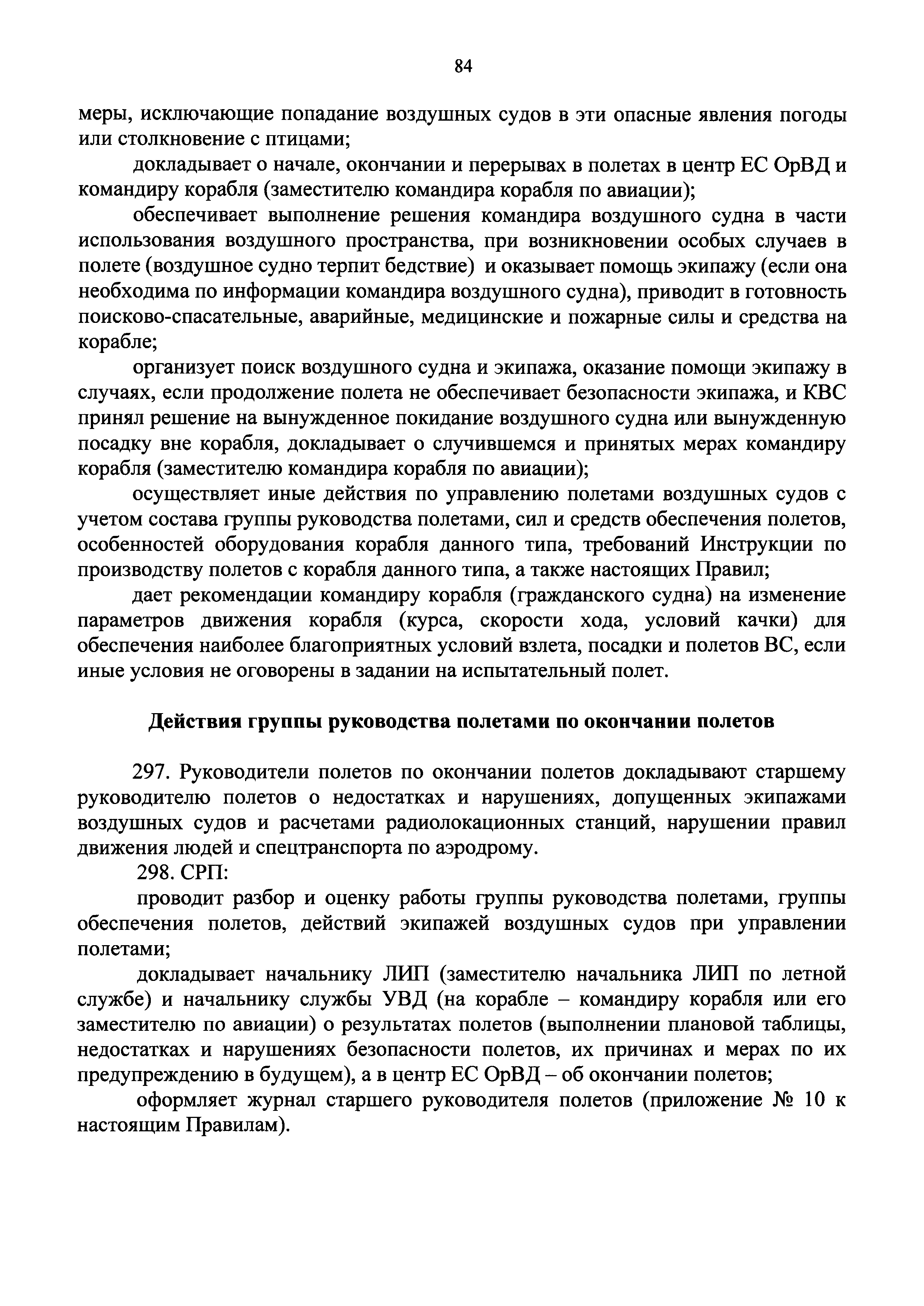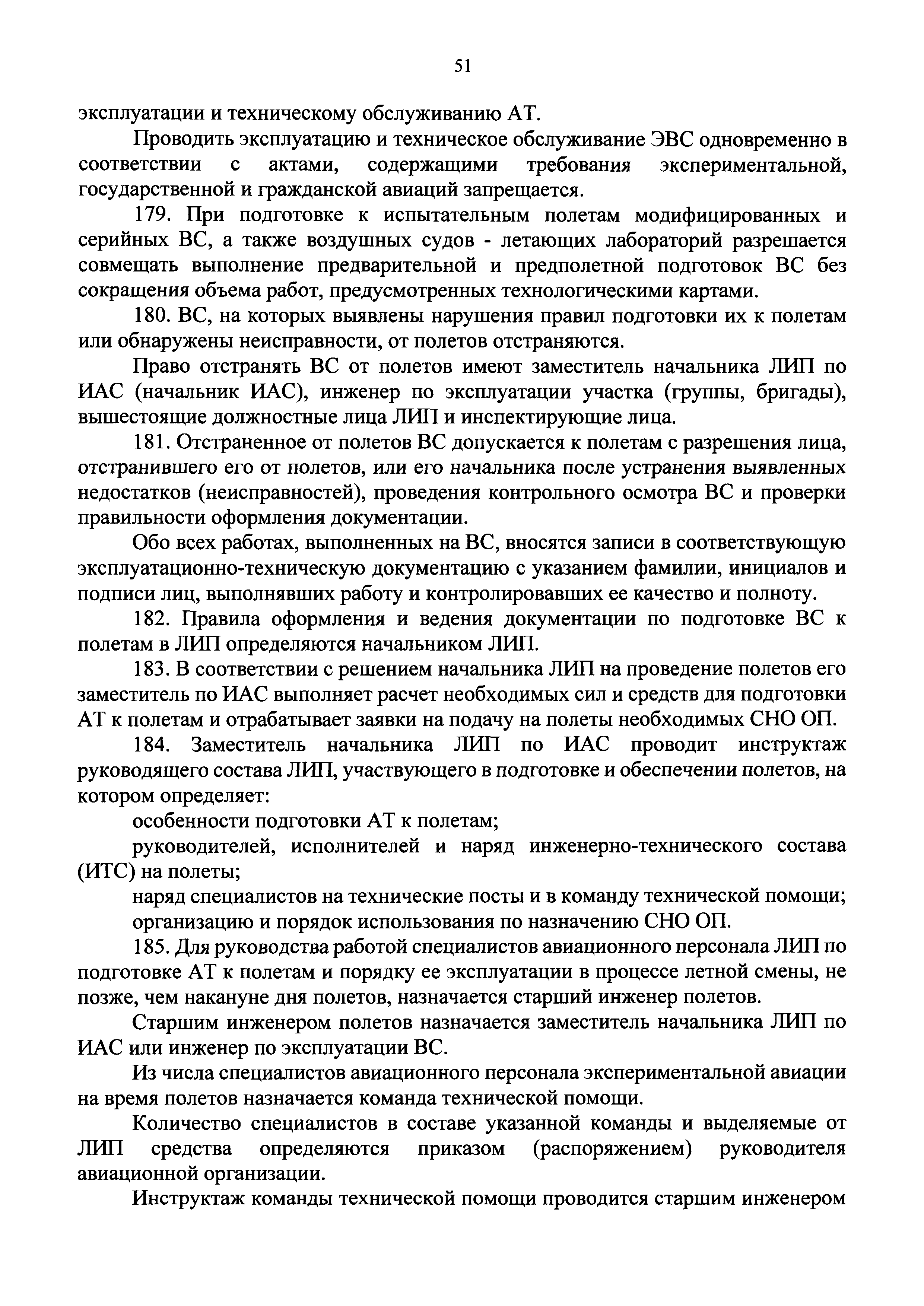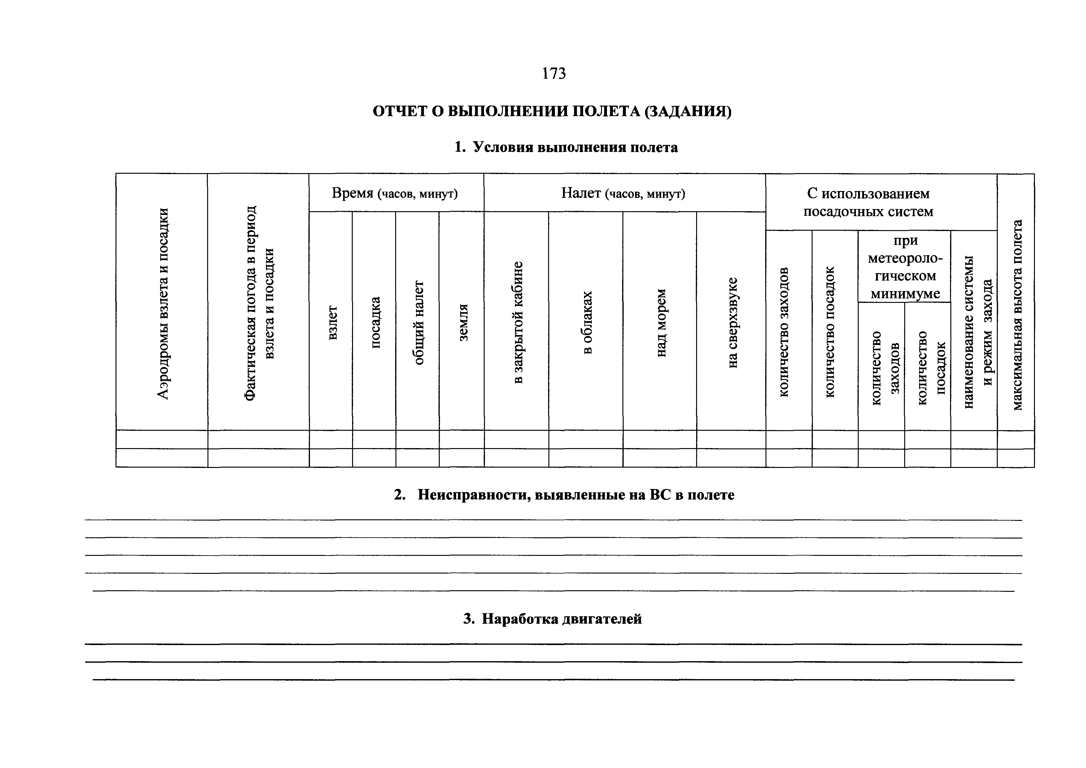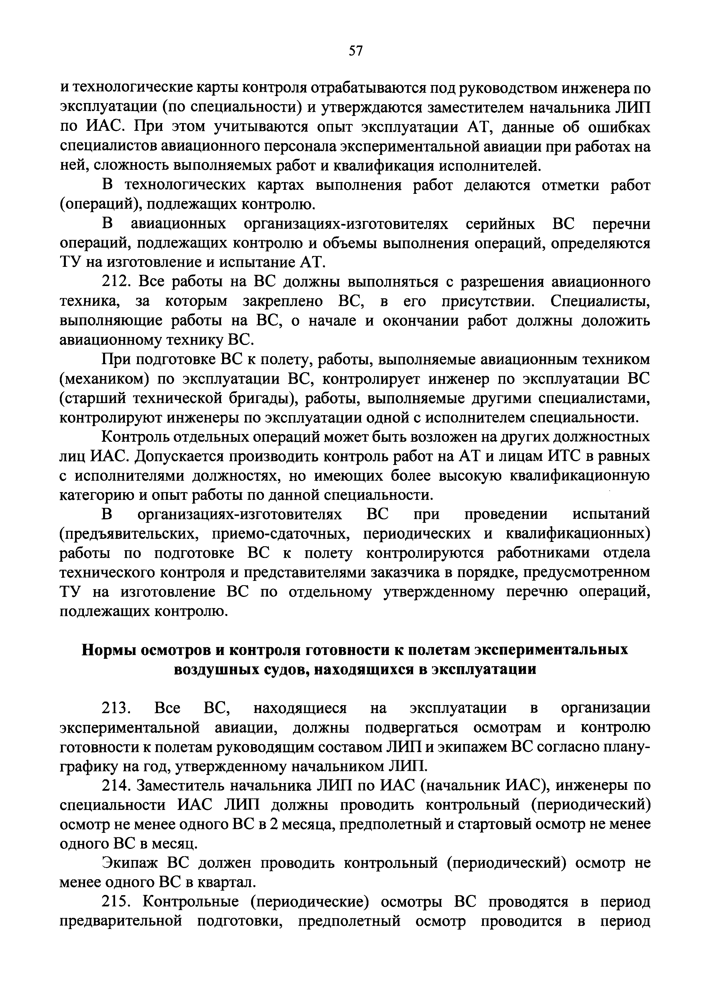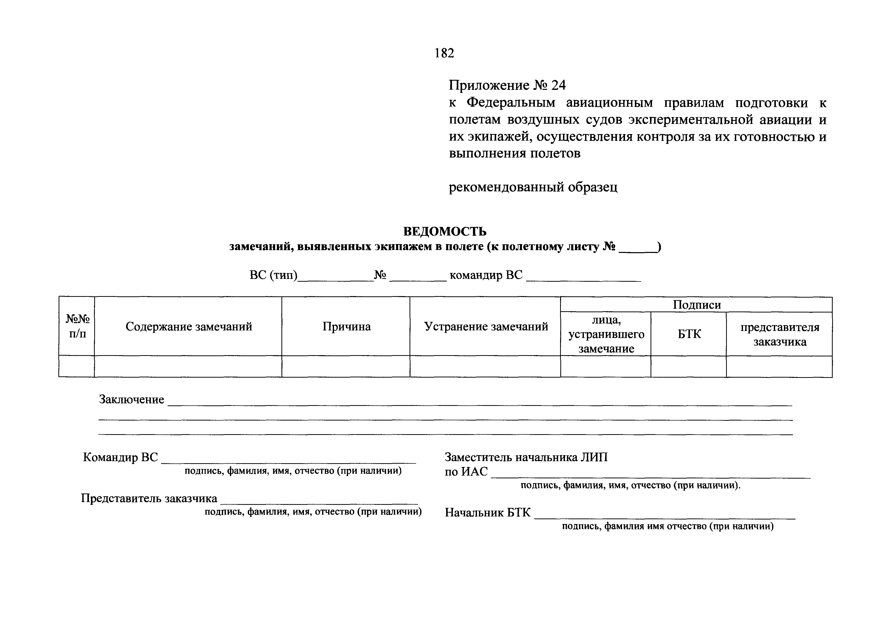 | Оглавление: | I. Общие положения II. Подготовка экипажей к полетам, порядок осуществления контроля за их готовностью к полетам III. Подготовка экспериментальных воздушных судов к полетам и порядок осуществления контроля за их готовностью к полетам IV. Порядок управления полетами V. Порядок выполнения полетов экспериментальных воздушных судов и их экипажей VI. Порядок оформления и ведения документации по летно-испытательной работе в летно-испытательных подразделениях организаций экспериментальной авиации Приложение № 1. Перечень сокращенных наименований и обозначений Приложение № 2. Плановая таблица полетов Приложение № 3. Условные знаки для оформления плановых таблиц полетов и других документов Приложение № 4. Максимальные перерывы в выполнении полетов (в месяцах) Приложение № 5. Условия, при которых полет выполняется по правилам визуальных полетов (ПВП) Приложение № 6. Максимальные значения параметров метеорологических элементов, полеты при которых считаются выполненными в приборных метеорологических условиях (ПМУ) и заходы на посадку при метеорологическом минимуме погоды Приложение № 7. Сигналы (команды), подаваемые эволюциями самолета при управлении группой Приложение № 8. Порядок передачи сигнала и сообщения о бедствии Приложение № 9. Сигналы (команды), подаваемые экипажам воздушных судов при отсутствии радиосвязи Приложение № 10. Журнал старшего руководителя полетов Приложение № 11. Журнал диспетчерских разрешений и решений командиров воздушных судов на вылет Приложение № 12. План работы летно-испытательного подразделения Приложение № 13. План-график тренировок членов экипажей воздушных судов в технике пилотирования (управления БВС), воздушной навигации и боевом применении Приложение № 14. План-график проверок членов экипажей воздушных судов в технике пилотирования (управления БВС), воздушной навигации и боевом применении, отпусков и прохождения врачебно-летной экспертизы Приложение № 15. План технической учебы специалистов авиационного персонала летно-испытательного подразделения Приложение № 16. Журнал технической учебы Приложение № 17. Журнал учета проведения предварительной, предполетной подготовок экипажей к полетам и разбора полетов Приложение № 18. Журнал подготовки экспериментального воздушного судна к испытательным и другим видам полетов Приложение № 19. Бортовая карточка на перелет экспериментального ВС Приложение № 20. План работы методического совета ЛИП Приложение № 21. Задание на испытательный полет Приложение № 22. Полетный лист для организаций-разработчиков ВС, научно-исследовательских (испытательных) организациях авиационной промышленности Приложение № 23. Полетный лист для организаций-изготовителей ВС (АРЗ) Приложение № 24. Ведомость замечаний, выявленных экипажем в полете |