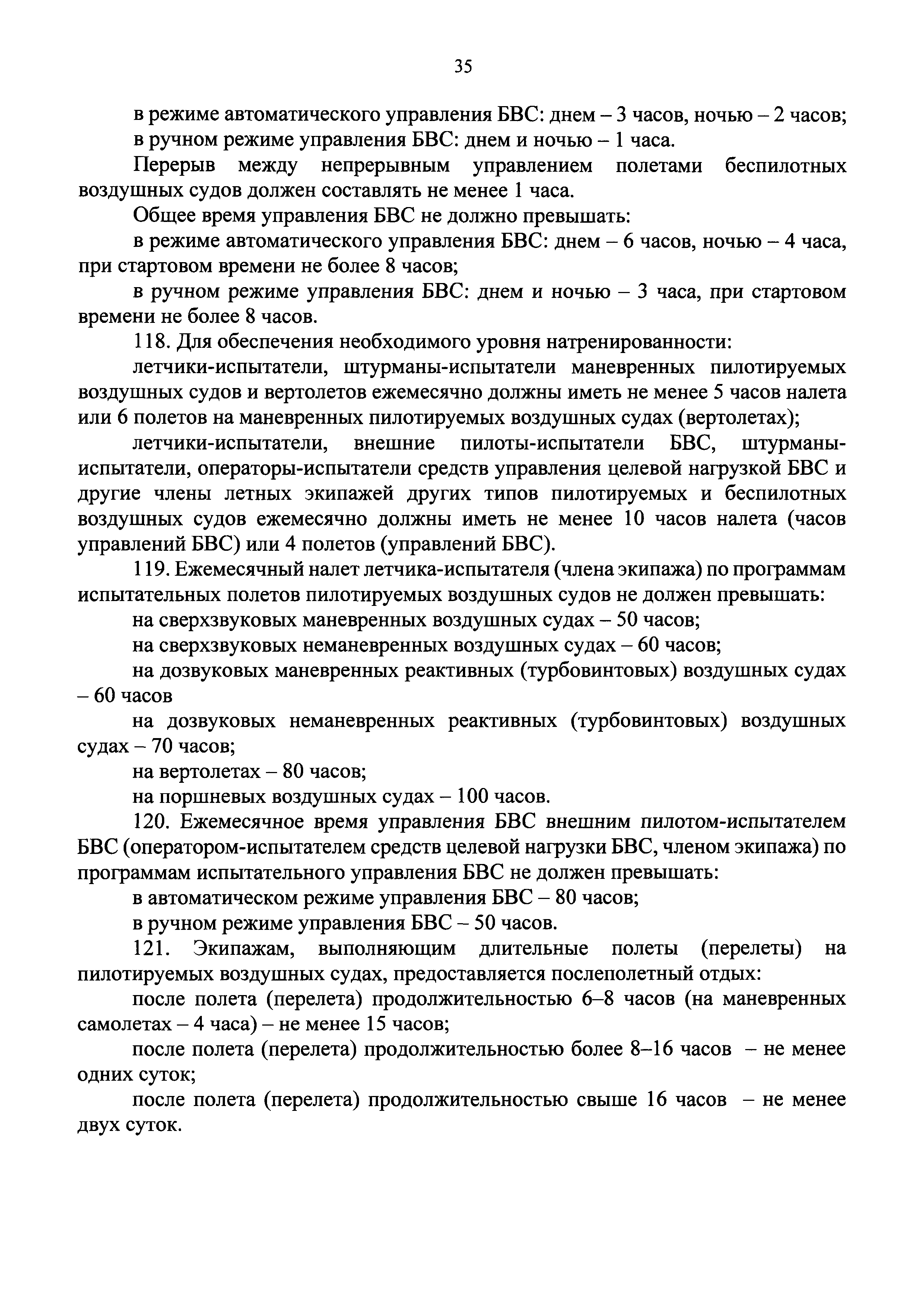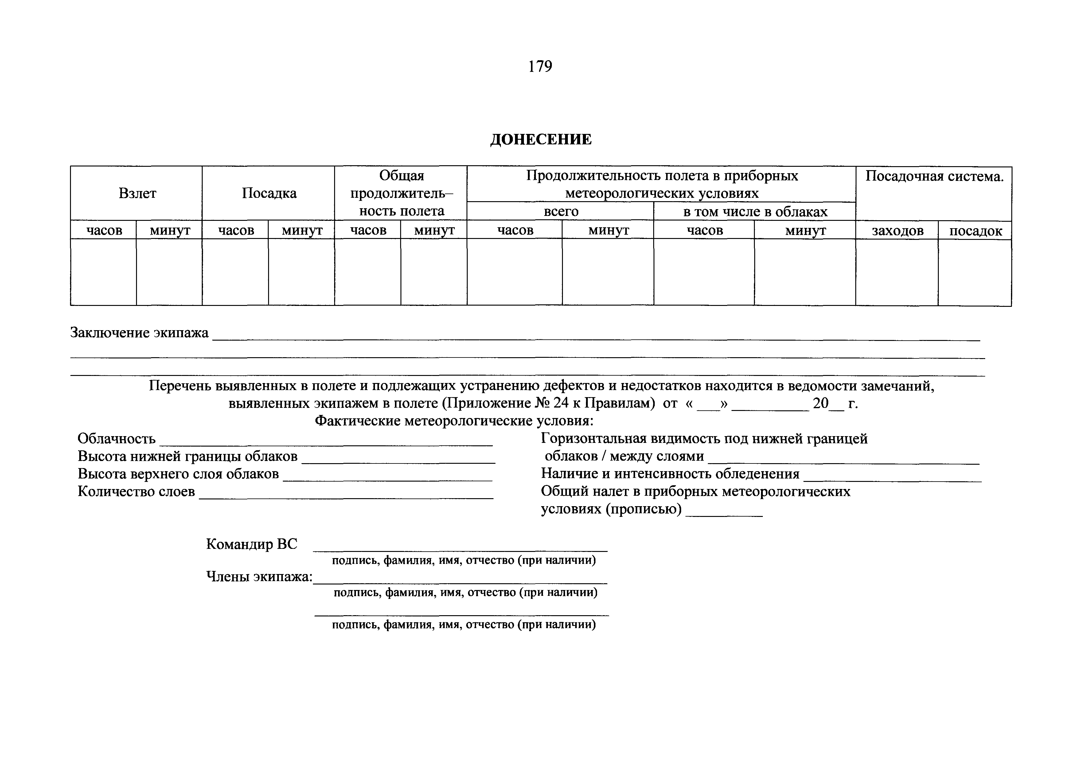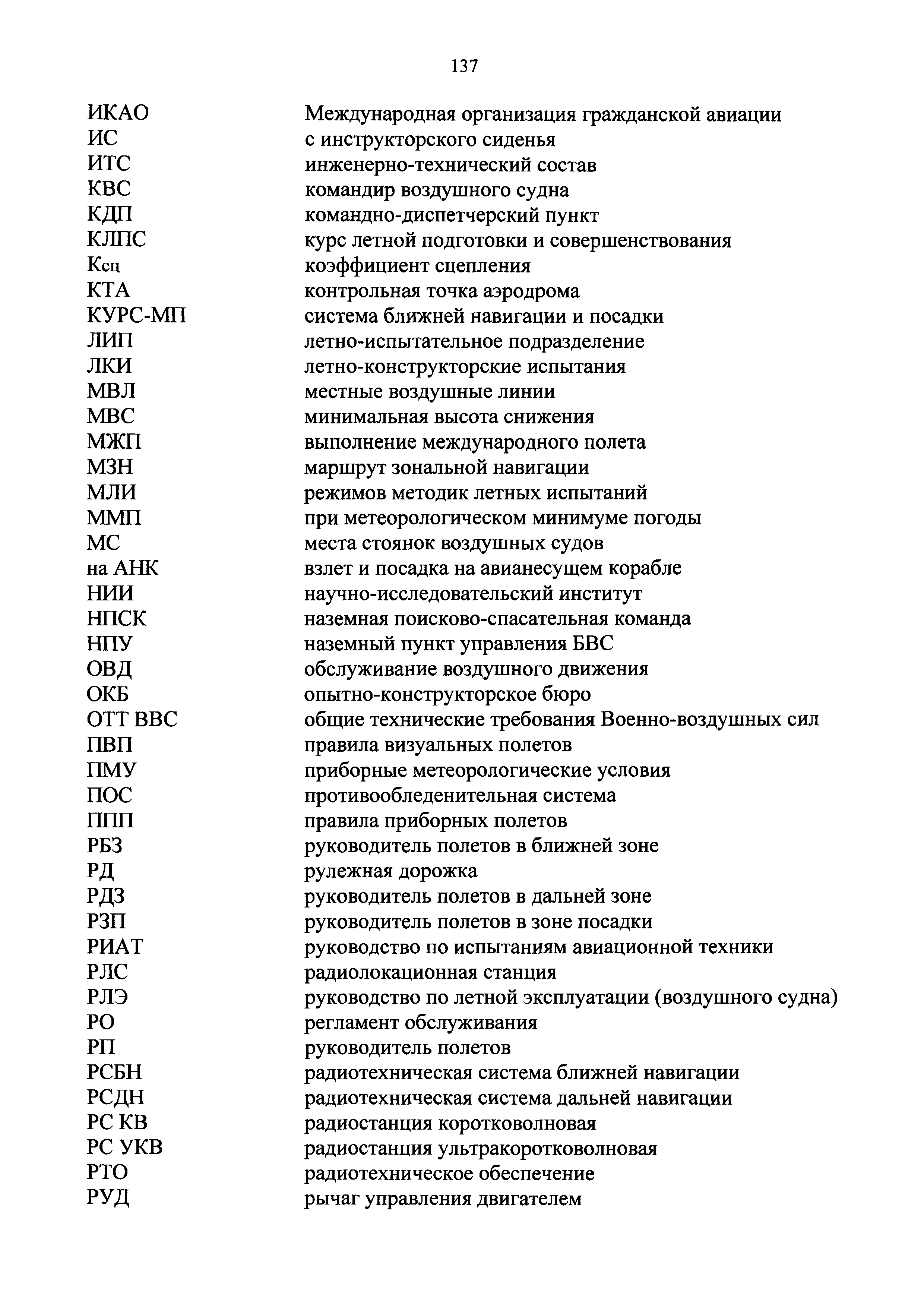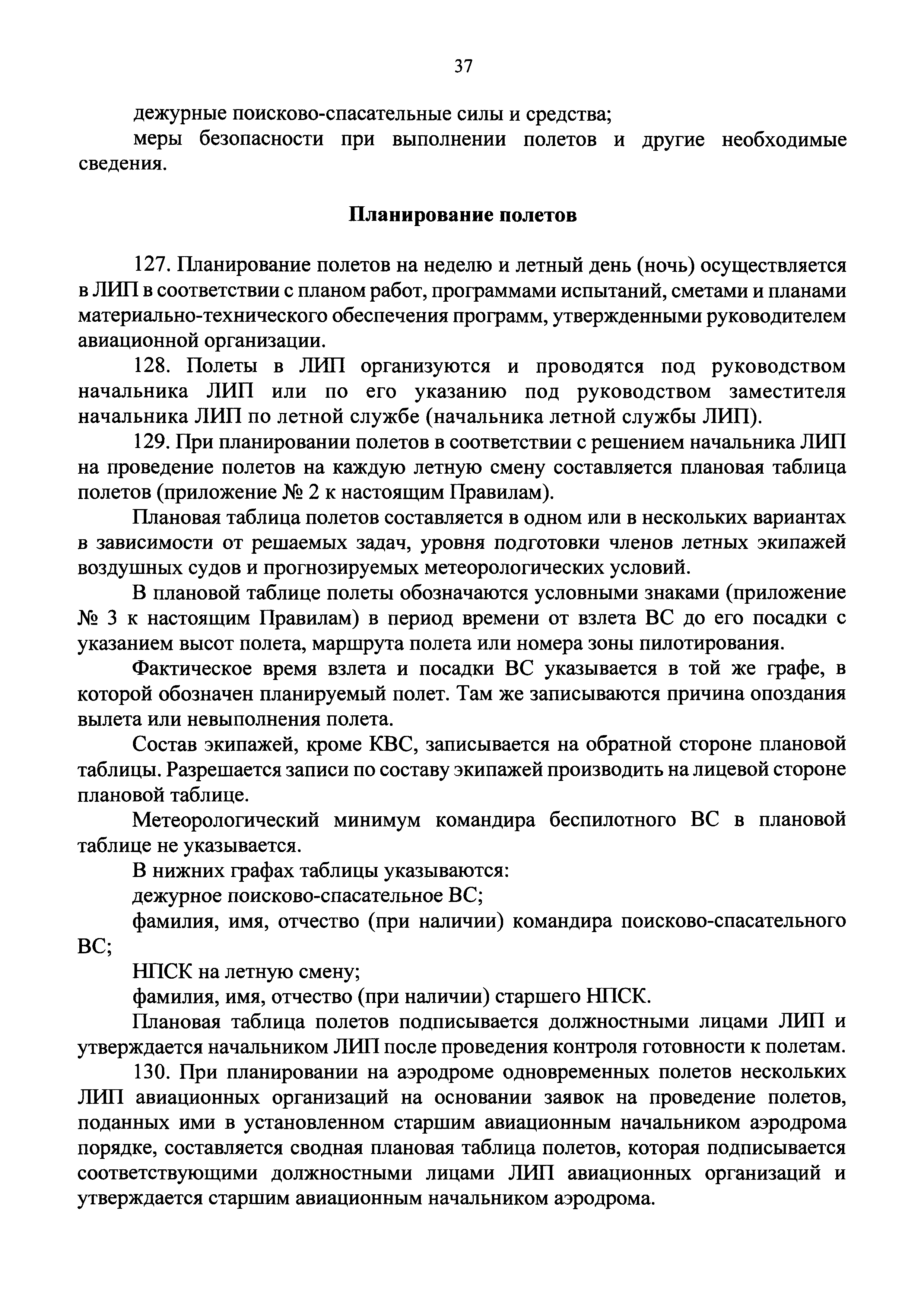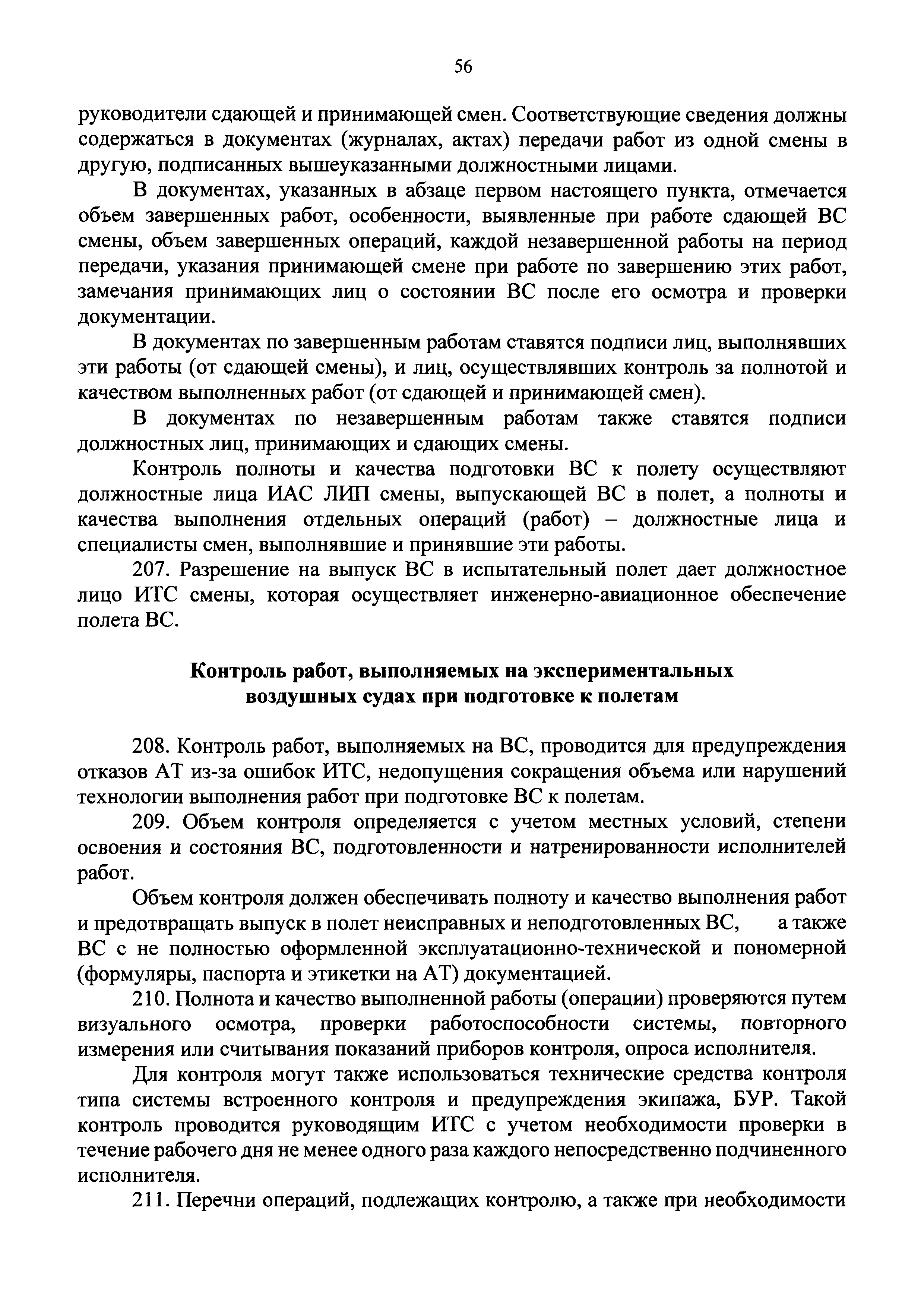 | Оглавление: | I. Общие положения II. Подготовка экипажей к полетам, порядок осуществления контроля за их готовностью к полетам III. Подготовка экспериментальных воздушных судов к полетам и порядок осуществления контроля за их готовностью к полетам IV. Порядок управления полетами V. Порядок выполнения полетов экспериментальных воздушных судов и их экипажей VI. Порядок оформления и ведения документации по летно-испытательной работе в летно-испытательных подразделениях организаций экспериментальной авиации Приложение № 1. Перечень сокращенных наименований и обозначений Приложение № 2. Плановая таблица полетов Приложение № 3. Условные знаки для оформления плановых таблиц полетов и других документов Приложение № 4. Максимальные перерывы в выполнении полетов (в месяцах) Приложение № 5. Условия, при которых полет выполняется по правилам визуальных полетов (ПВП) Приложение № 6. Максимальные значения параметров метеорологических элементов, полеты при которых считаются выполненными в приборных метеорологических условиях (ПМУ) и заходы на посадку при метеорологическом минимуме погоды Приложение № 7. Сигналы (команды), подаваемые эволюциями самолета при управлении группой Приложение № 8. Порядок передачи сигнала и сообщения о бедствии Приложение № 9. Сигналы (команды), подаваемые экипажам воздушных судов при отсутствии радиосвязи Приложение № 10. Журнал старшего руководителя полетов Приложение № 11. Журнал диспетчерских разрешений и решений командиров воздушных судов на вылет Приложение № 12. План работы летно-испытательного подразделения Приложение № 13. План-график тренировок членов экипажей воздушных судов в технике пилотирования (управления БВС), воздушной навигации и боевом применении Приложение № 14. План-график проверок членов экипажей воздушных судов в технике пилотирования (управления БВС), воздушной навигации и боевом применении, отпусков и прохождения врачебно-летной экспертизы Приложение № 15. План технической учебы специалистов авиационного персонала летно-испытательного подразделения Приложение № 16. Журнал технической учебы Приложение № 17. Журнал учета проведения предварительной, предполетной подготовок экипажей к полетам и разбора полетов Приложение № 18. Журнал подготовки экспериментального воздушного судна к испытательным и другим видам полетов Приложение № 19. Бортовая карточка на перелет экспериментального ВС Приложение № 20. План работы методического совета ЛИП Приложение № 21. Задание на испытательный полет Приложение № 22. Полетный лист для организаций-разработчиков ВС, научно-исследовательских (испытательных) организациях авиационной промышленности Приложение № 23. Полетный лист для организаций-изготовителей ВС (АРЗ) Приложение № 24. Ведомость замечаний, выявленных экипажем в полете |