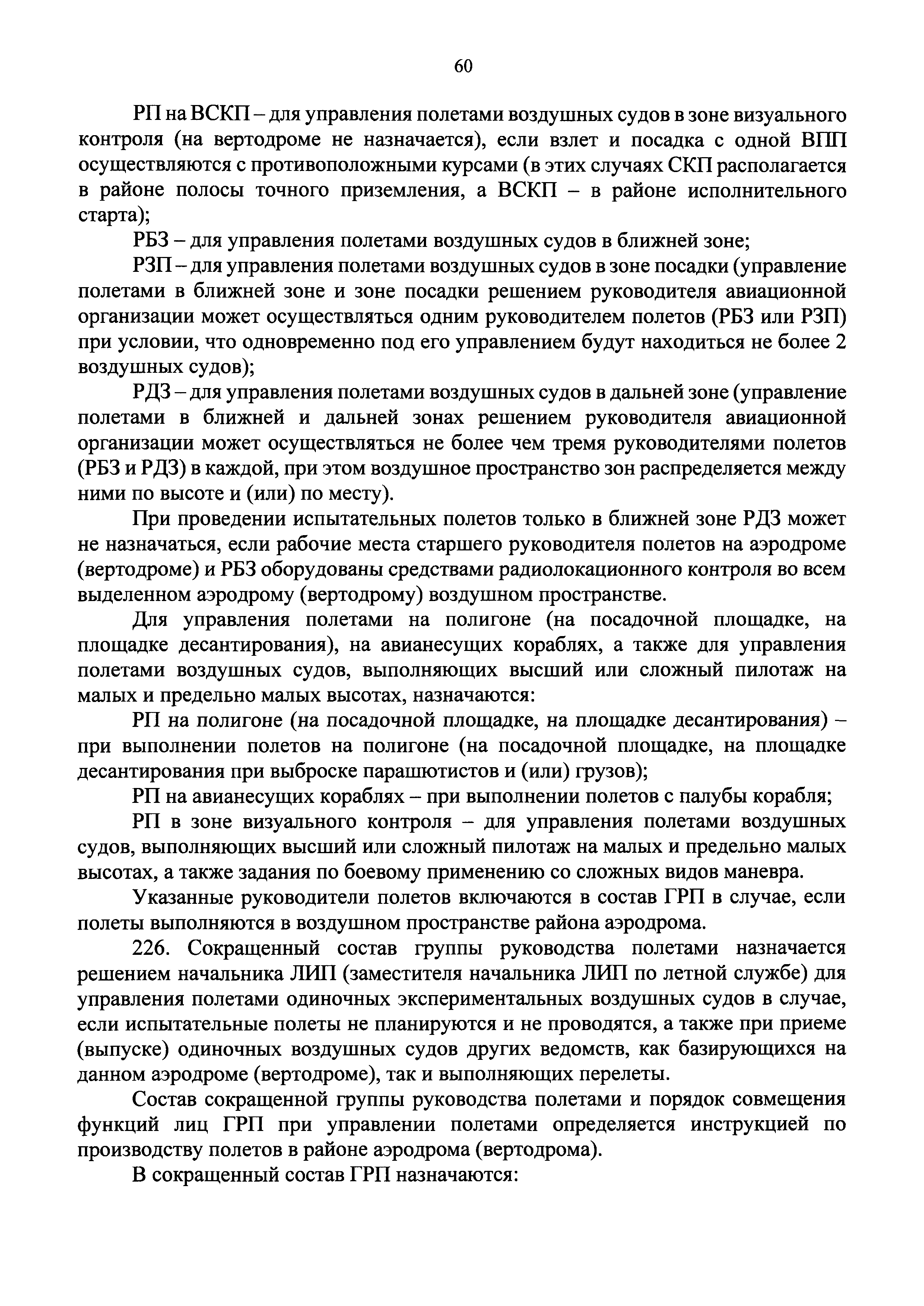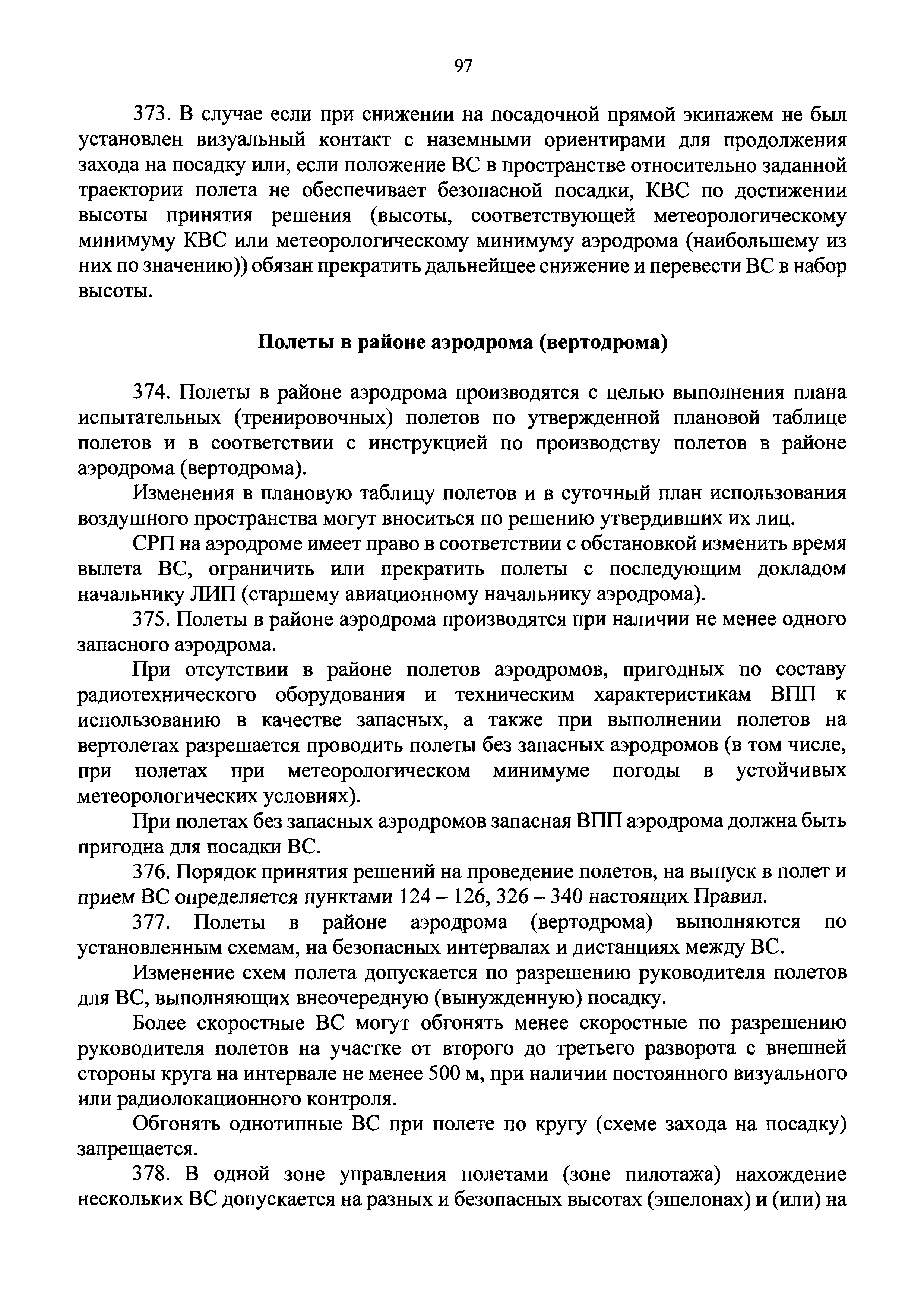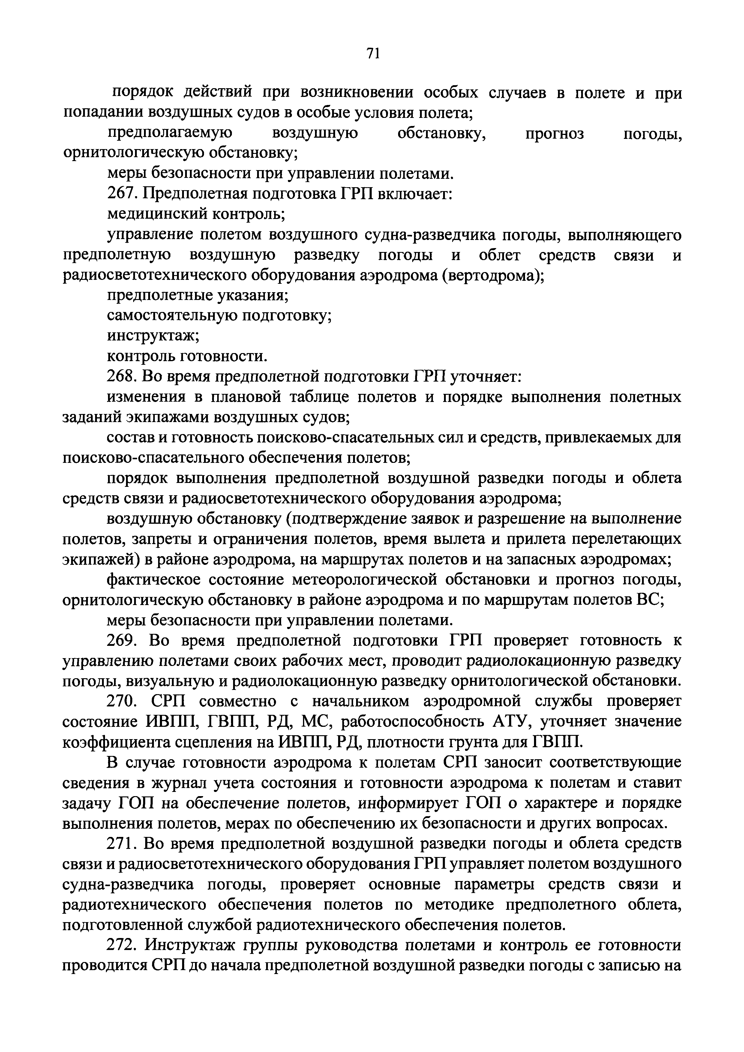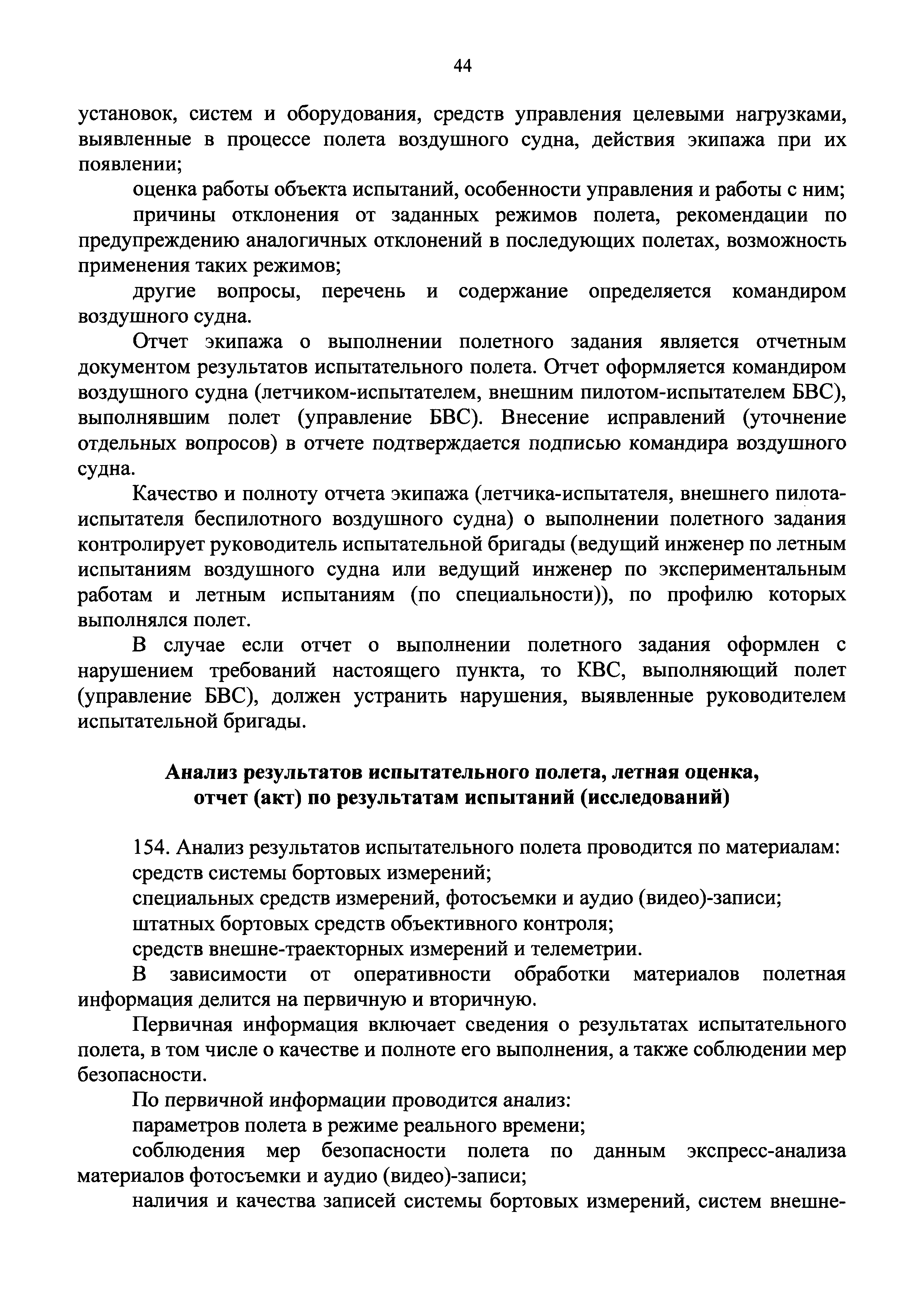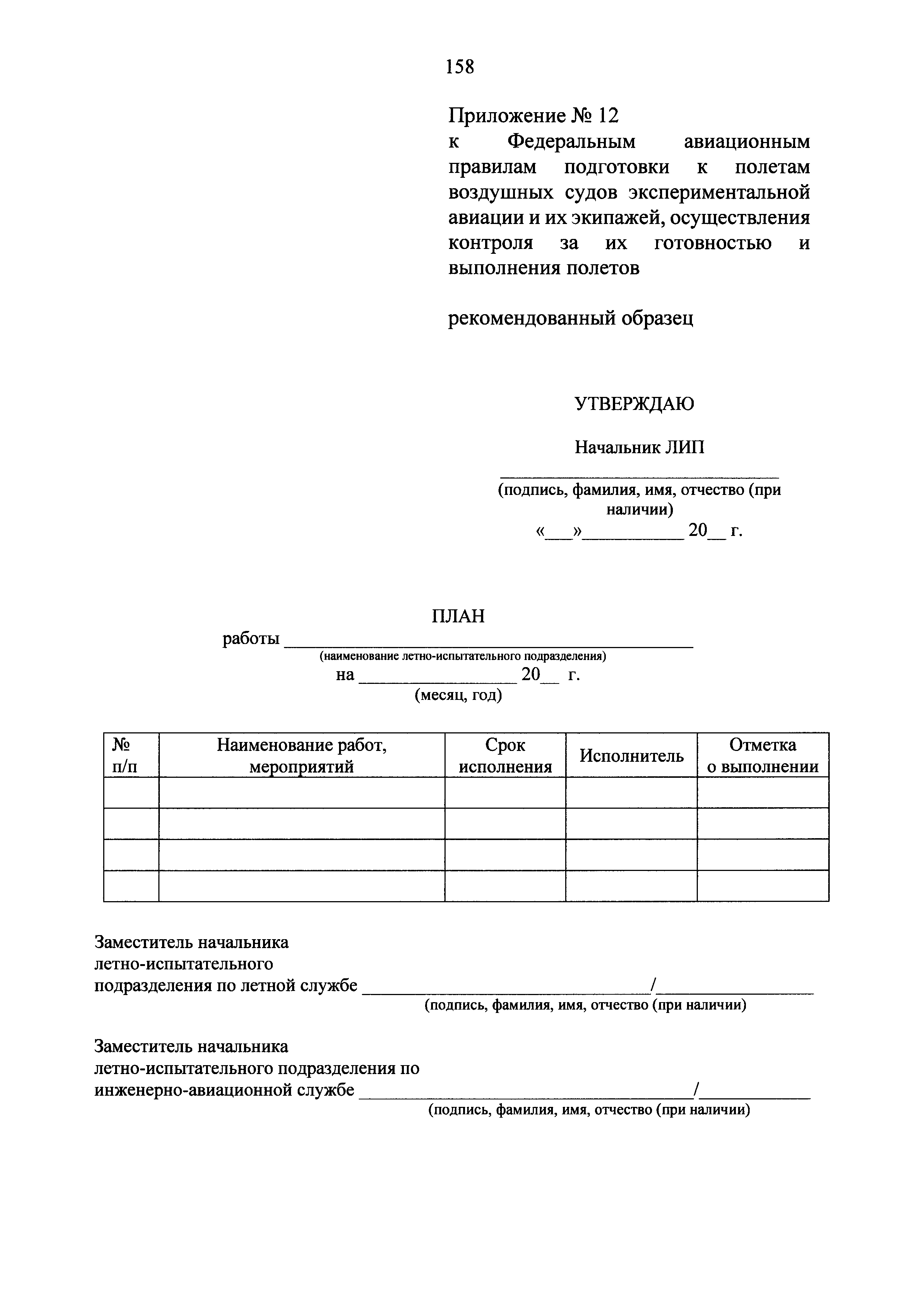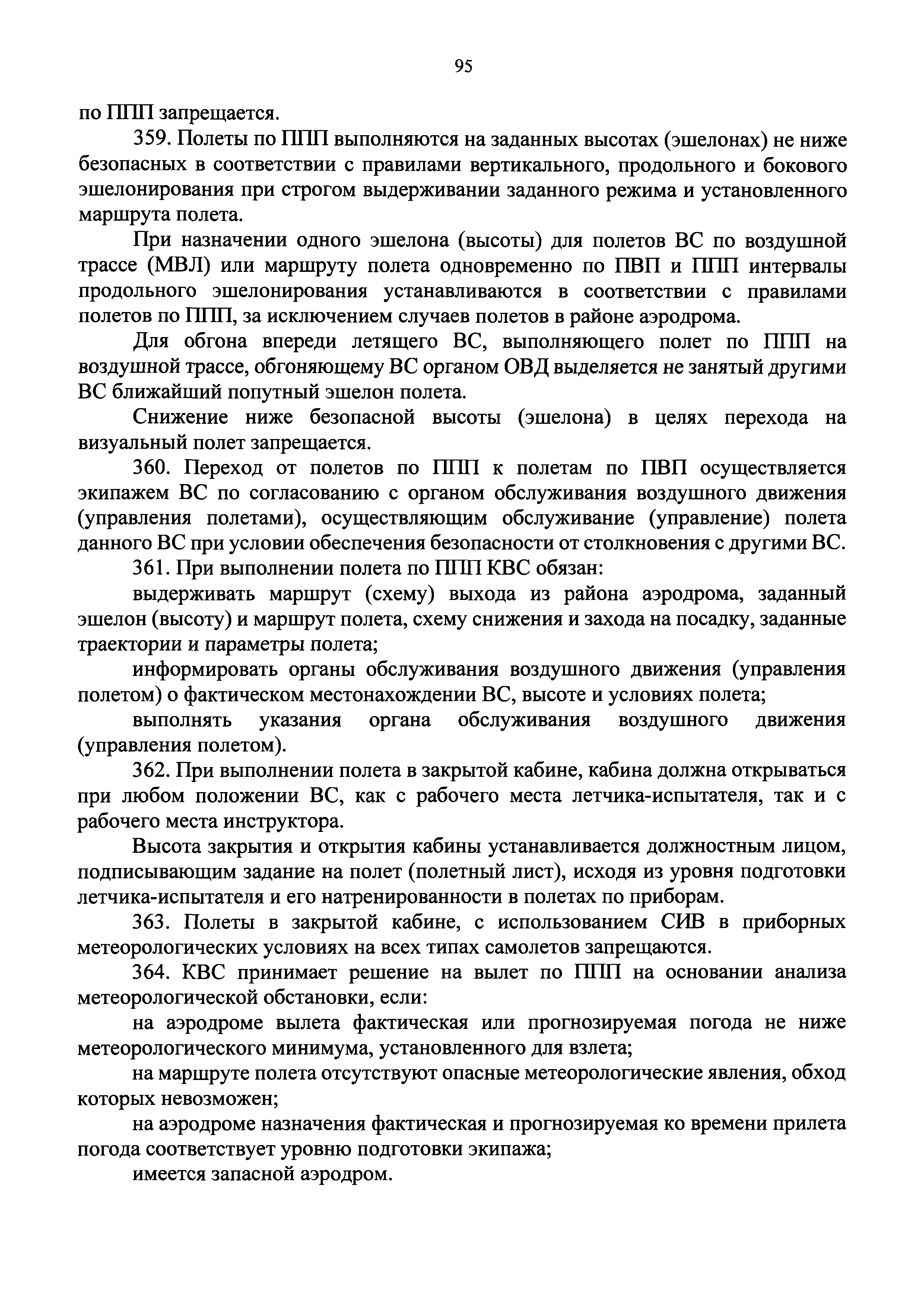 | Оглавление: | I. Общие положения II. Подготовка экипажей к полетам, порядок осуществления контроля за их готовностью к полетам III. Подготовка экспериментальных воздушных судов к полетам и порядок осуществления контроля за их готовностью к полетам IV. Порядок управления полетами V. Порядок выполнения полетов экспериментальных воздушных судов и их экипажей VI. Порядок оформления и ведения документации по летно-испытательной работе в летно-испытательных подразделениях организаций экспериментальной авиации Приложение № 1. Перечень сокращенных наименований и обозначений Приложение № 2. Плановая таблица полетов Приложение № 3. Условные знаки для оформления плановых таблиц полетов и других документов Приложение № 4. Максимальные перерывы в выполнении полетов (в месяцах) Приложение № 5. Условия, при которых полет выполняется по правилам визуальных полетов (ПВП) Приложение № 6. Максимальные значения параметров метеорологических элементов, полеты при которых считаются выполненными в приборных метеорологических условиях (ПМУ) и заходы на посадку при метеорологическом минимуме погоды Приложение № 7. Сигналы (команды), подаваемые эволюциями самолета при управлении группой Приложение № 8. Порядок передачи сигнала и сообщения о бедствии Приложение № 9. Сигналы (команды), подаваемые экипажам воздушных судов при отсутствии радиосвязи Приложение № 10. Журнал старшего руководителя полетов Приложение № 11. Журнал диспетчерских разрешений и решений командиров воздушных судов на вылет Приложение № 12. План работы летно-испытательного подразделения Приложение № 13. План-график тренировок членов экипажей воздушных судов в технике пилотирования (управления БВС), воздушной навигации и боевом применении Приложение № 14. План-график проверок членов экипажей воздушных судов в технике пилотирования (управления БВС), воздушной навигации и боевом применении, отпусков и прохождения врачебно-летной экспертизы Приложение № 15. План технической учебы специалистов авиационного персонала летно-испытательного подразделения Приложение № 16. Журнал технической учебы Приложение № 17. Журнал учета проведения предварительной, предполетной подготовок экипажей к полетам и разбора полетов Приложение № 18. Журнал подготовки экспериментального воздушного судна к испытательным и другим видам полетов Приложение № 19. Бортовая карточка на перелет экспериментального ВС Приложение № 20. План работы методического совета ЛИП Приложение № 21. Задание на испытательный полет Приложение № 22. Полетный лист для организаций-разработчиков ВС, научно-исследовательских (испытательных) организациях авиационной промышленности Приложение № 23. Полетный лист для организаций-изготовителей ВС (АРЗ) Приложение № 24. Ведомость замечаний, выявленных экипажем в полете |