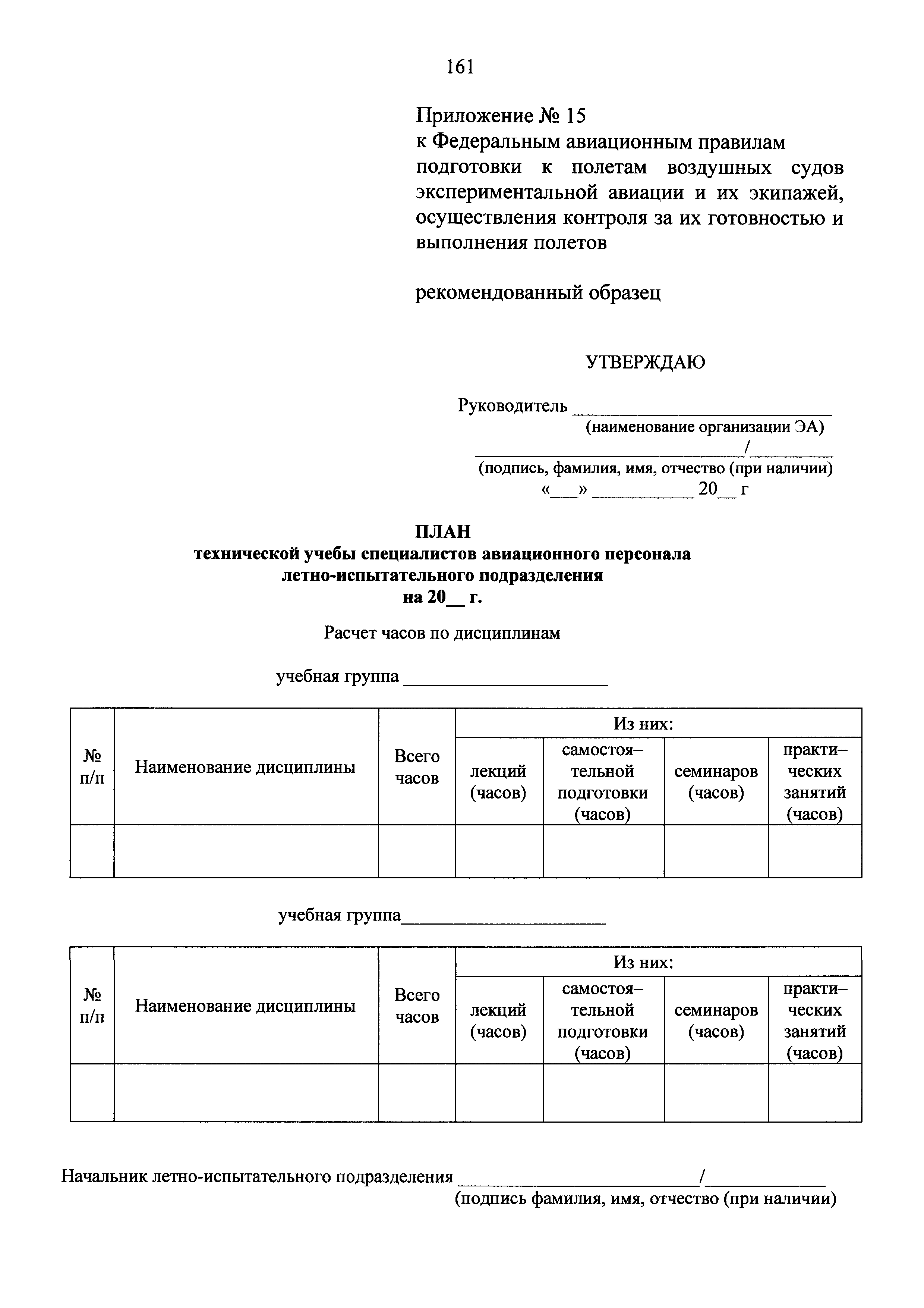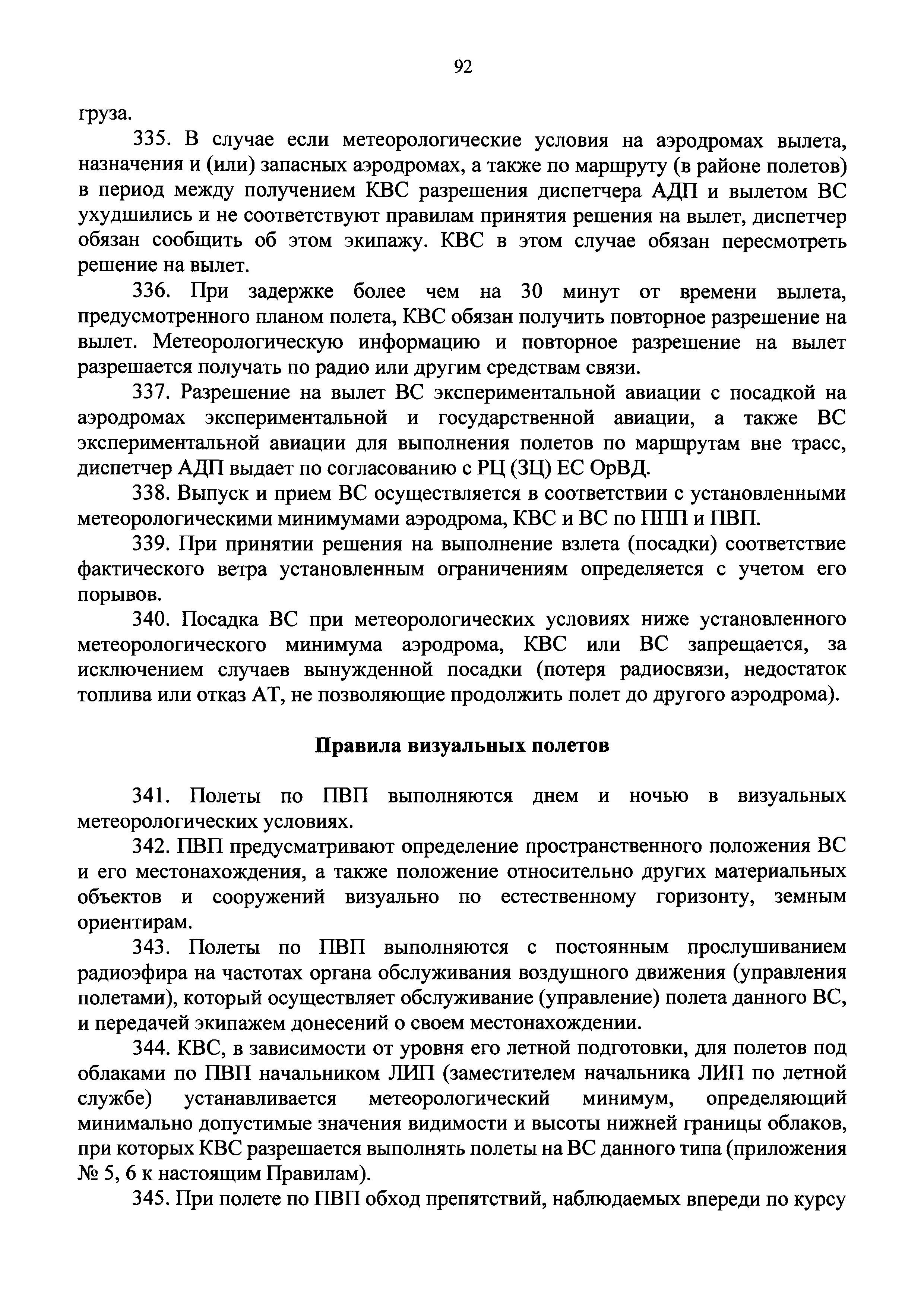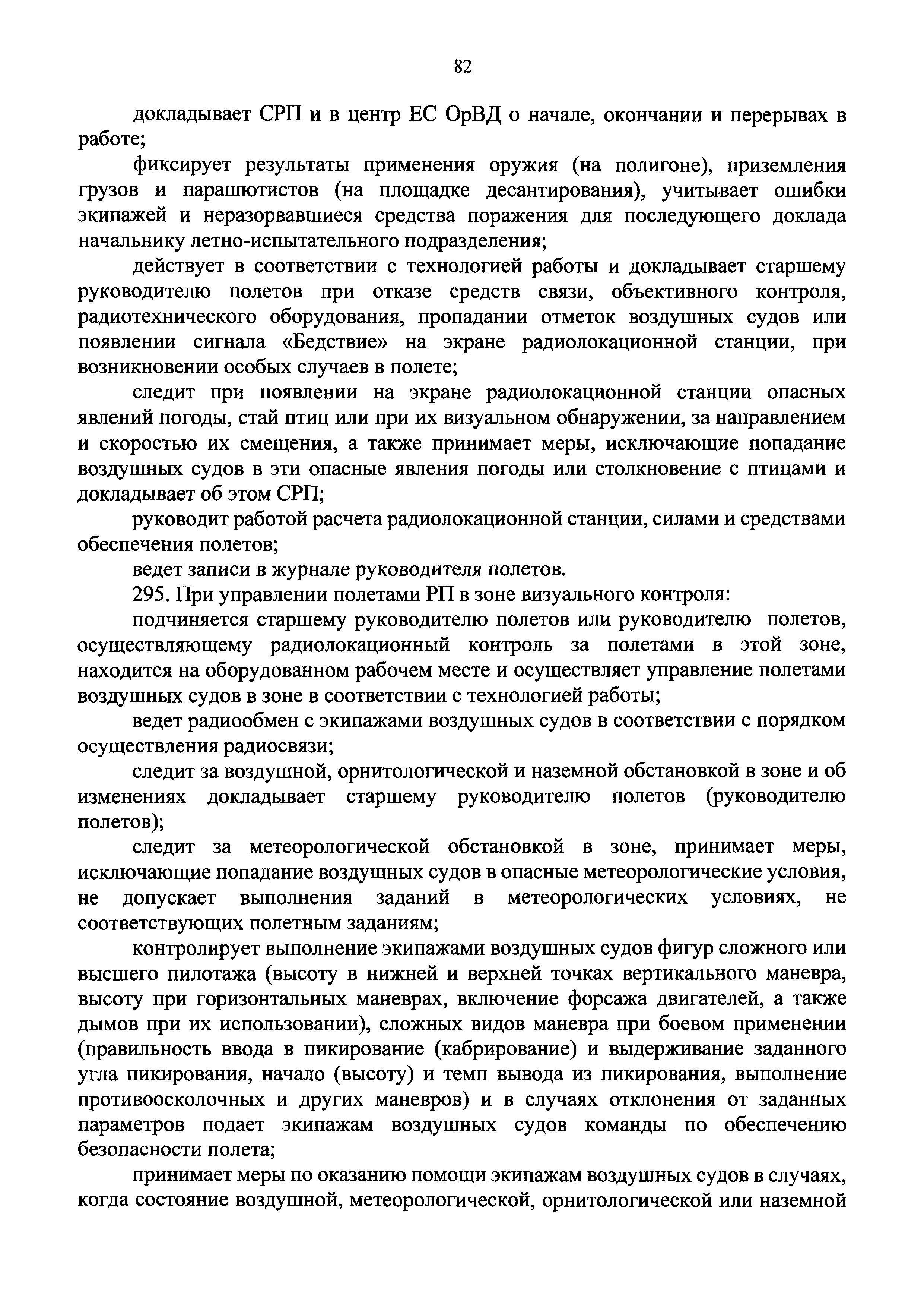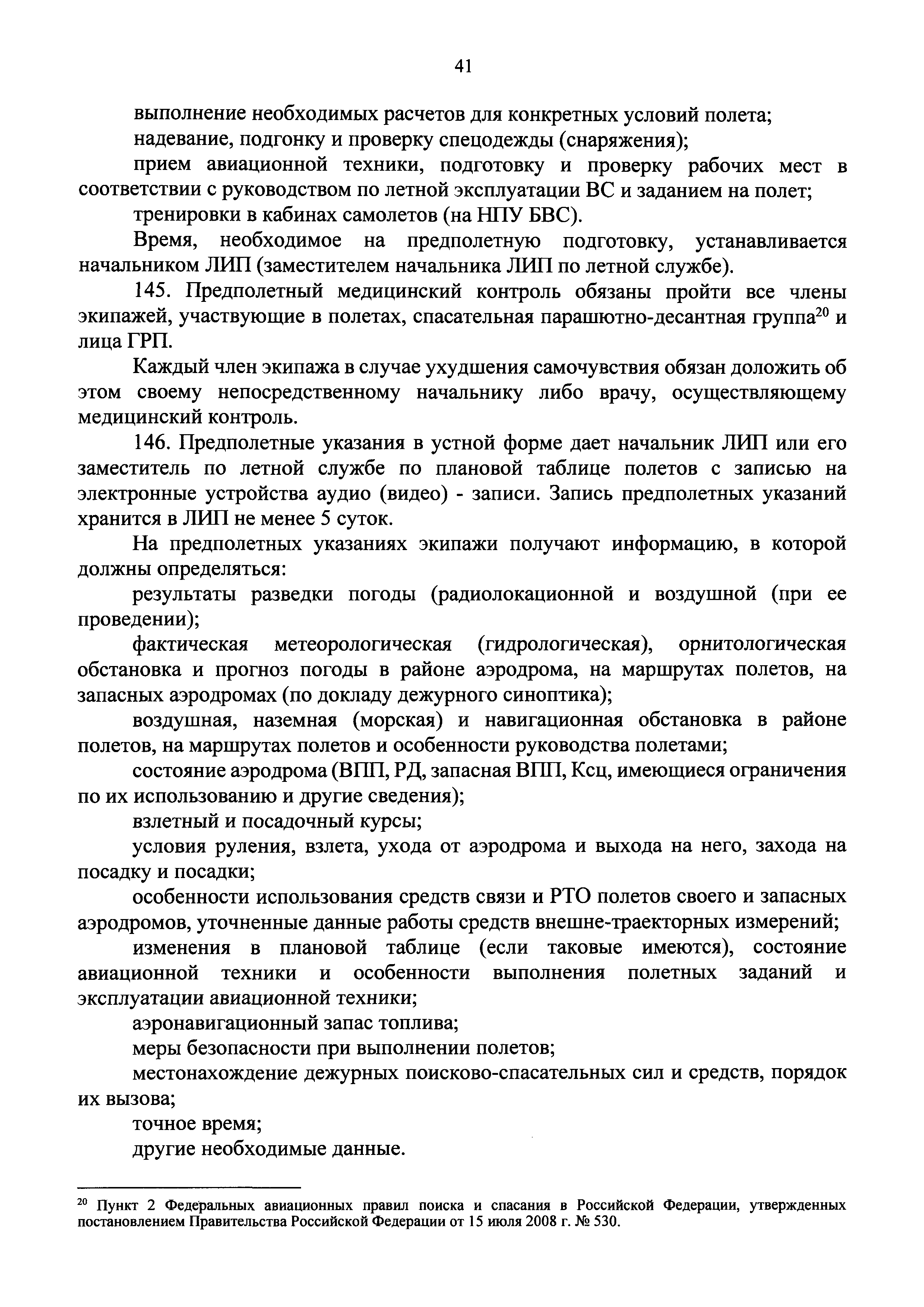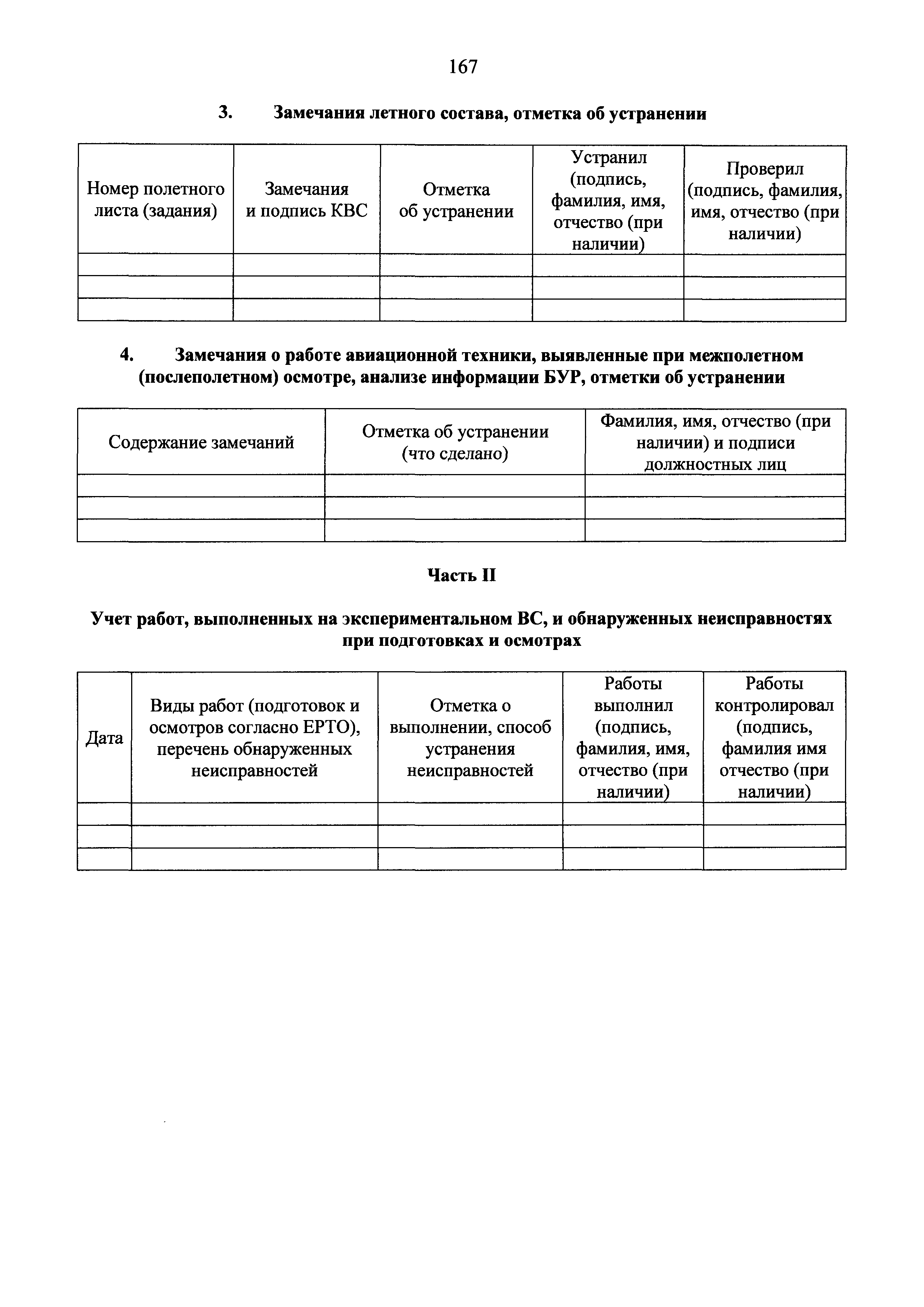 | Оглавление: | I. Общие положения II. Подготовка экипажей к полетам, порядок осуществления контроля за их готовностью к полетам III. Подготовка экспериментальных воздушных судов к полетам и порядок осуществления контроля за их готовностью к полетам IV. Порядок управления полетами V. Порядок выполнения полетов экспериментальных воздушных судов и их экипажей VI. Порядок оформления и ведения документации по летно-испытательной работе в летно-испытательных подразделениях организаций экспериментальной авиации Приложение № 1. Перечень сокращенных наименований и обозначений Приложение № 2. Плановая таблица полетов Приложение № 3. Условные знаки для оформления плановых таблиц полетов и других документов Приложение № 4. Максимальные перерывы в выполнении полетов (в месяцах) Приложение № 5. Условия, при которых полет выполняется по правилам визуальных полетов (ПВП) Приложение № 6. Максимальные значения параметров метеорологических элементов, полеты при которых считаются выполненными в приборных метеорологических условиях (ПМУ) и заходы на посадку при метеорологическом минимуме погоды Приложение № 7. Сигналы (команды), подаваемые эволюциями самолета при управлении группой Приложение № 8. Порядок передачи сигнала и сообщения о бедствии Приложение № 9. Сигналы (команды), подаваемые экипажам воздушных судов при отсутствии радиосвязи Приложение № 10. Журнал старшего руководителя полетов Приложение № 11. Журнал диспетчерских разрешений и решений командиров воздушных судов на вылет Приложение № 12. План работы летно-испытательного подразделения Приложение № 13. План-график тренировок членов экипажей воздушных судов в технике пилотирования (управления БВС), воздушной навигации и боевом применении Приложение № 14. План-график проверок членов экипажей воздушных судов в технике пилотирования (управления БВС), воздушной навигации и боевом применении, отпусков и прохождения врачебно-летной экспертизы Приложение № 15. План технической учебы специалистов авиационного персонала летно-испытательного подразделения Приложение № 16. Журнал технической учебы Приложение № 17. Журнал учета проведения предварительной, предполетной подготовок экипажей к полетам и разбора полетов Приложение № 18. Журнал подготовки экспериментального воздушного судна к испытательным и другим видам полетов Приложение № 19. Бортовая карточка на перелет экспериментального ВС Приложение № 20. План работы методического совета ЛИП Приложение № 21. Задание на испытательный полет Приложение № 22. Полетный лист для организаций-разработчиков ВС, научно-исследовательских (испытательных) организациях авиационной промышленности Приложение № 23. Полетный лист для организаций-изготовителей ВС (АРЗ) Приложение № 24. Ведомость замечаний, выявленных экипажем в полете |