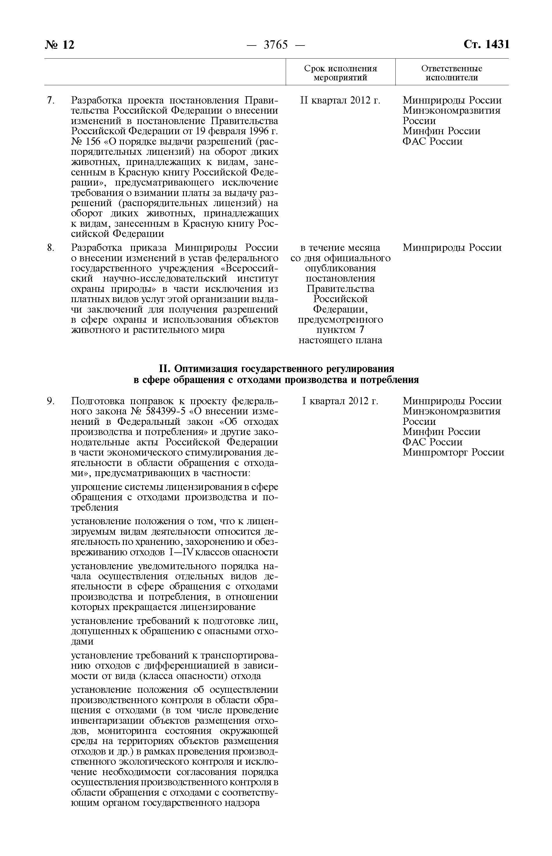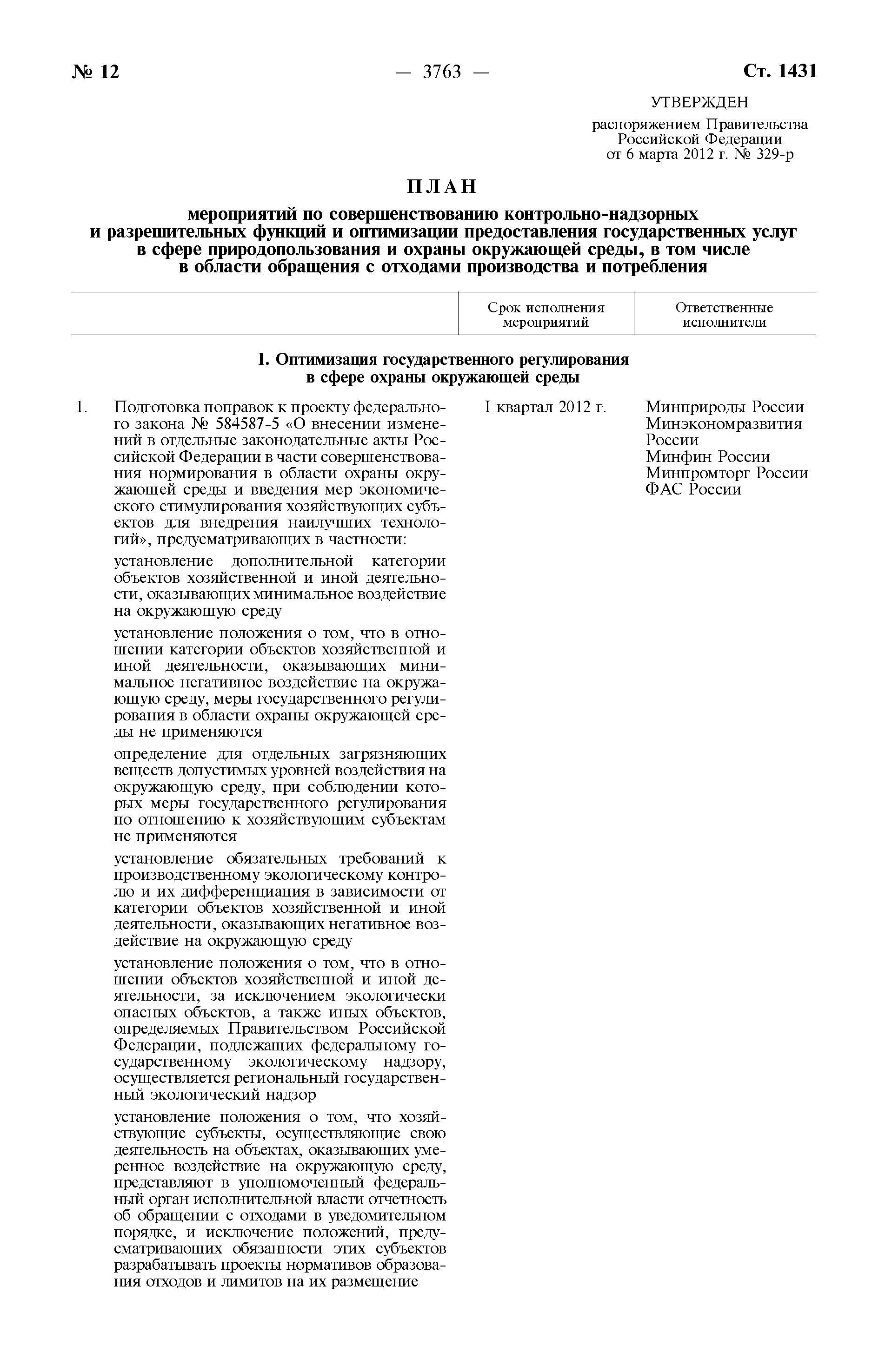 План мероприятий по совершенствованию контрольно-надзорных и разрешительных функций и оптимизации предоставления государственных услуг в сфере природопользования и охраны окружающей среды, в том числе в области обращения с отходами производства и потребления| Статус: | действует | | Название рус.: | План мероприятий по совершенствованию контрольно-надзорных и разрешительных функций и оптимизации предоставления государственных услуг в сфере природопользования и охраны окружающей среды, в том числе в области обращения с отходами производства и потребления | | Дата добавления в базу: | 01.02.2020 | | Дата актуализации: | 01.01.2021 | | Дата введения: | 06.03.2012 | | Утверждён: | 06.03.2012 Правительство Российской Федерации (329-р)