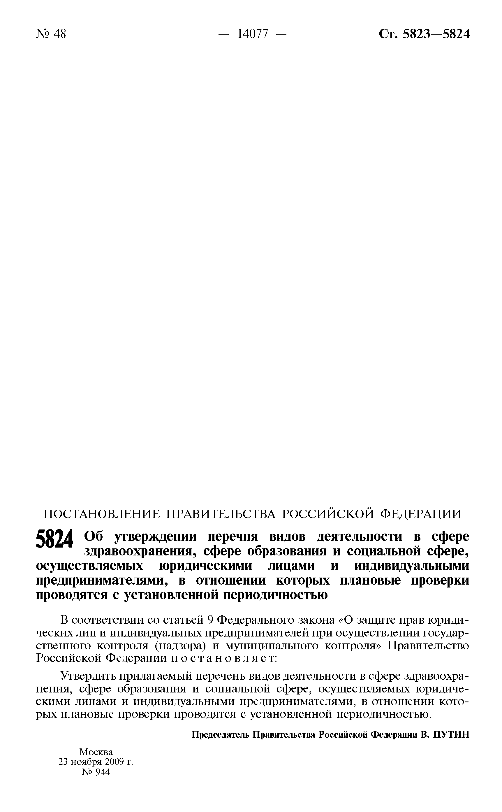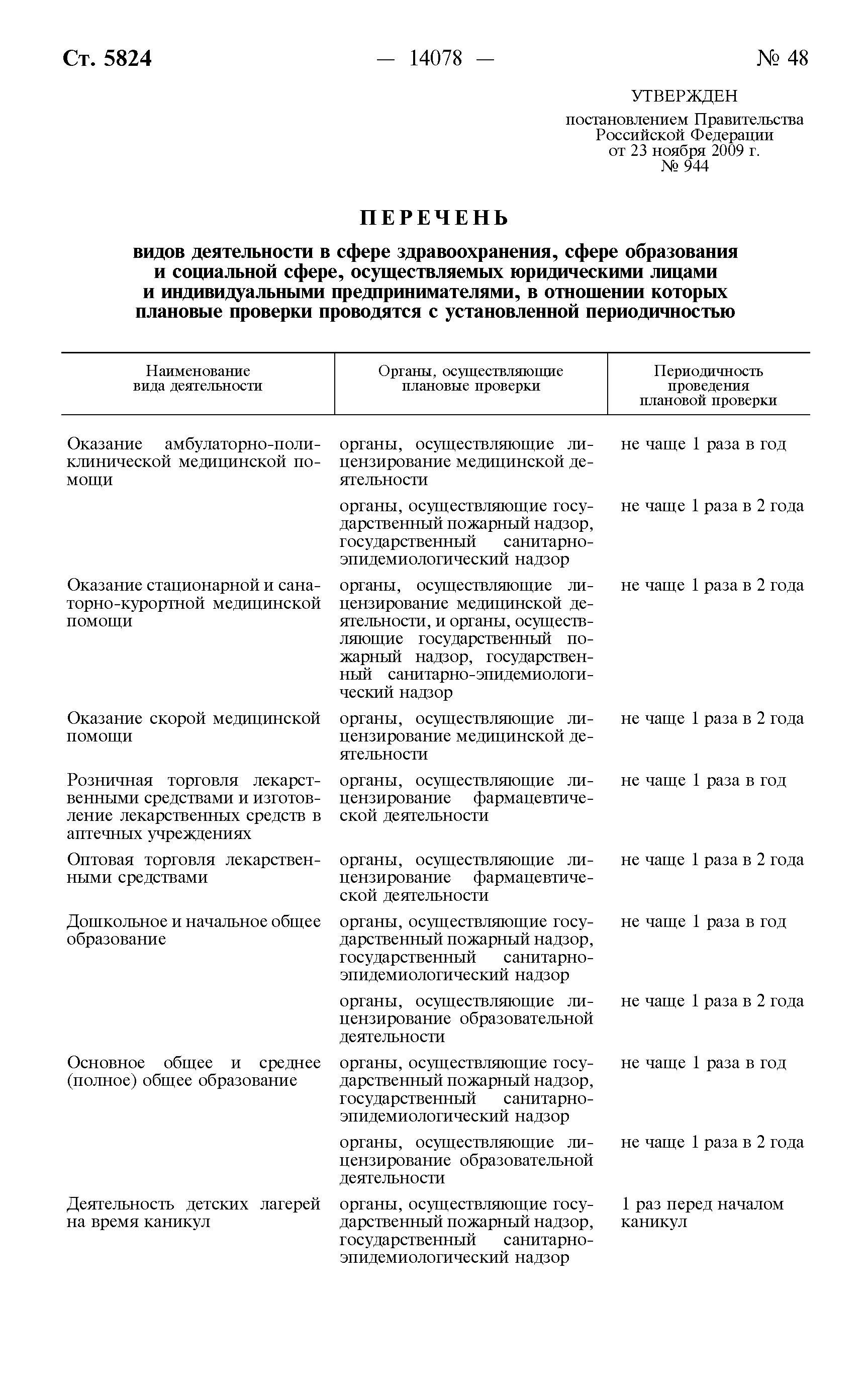 Перечень видов деятельности в сфере здравоохранения, сфере образования, социальной сфере, в области производства, использования и обращения драгоценных металлов и драгоценных камней, осуществляемых юридическими лицами и индивидуальными предпринимателями, в отношении которых плановые проверки проводятся с установленной периодичностью| Статус: | действует | | Название рус.: | Перечень видов деятельности в сфере здравоохранения, сфере образования, социальной сфере, в области производства, использования и обращения драгоценных металлов и драгоценных камней, осуществляемых юридическими лицами и индивидуальными предпринимателями, в отношении которых плановые проверки проводятся с установленной периодичностью | | Дата добавления в базу: | 01.02.2020 | | Дата актуализации: | 01.01.2021 | | Дата введения: | 05.12.2009 | | Утверждён: | 23.11.2009 Правительство Российской Федерации (944)