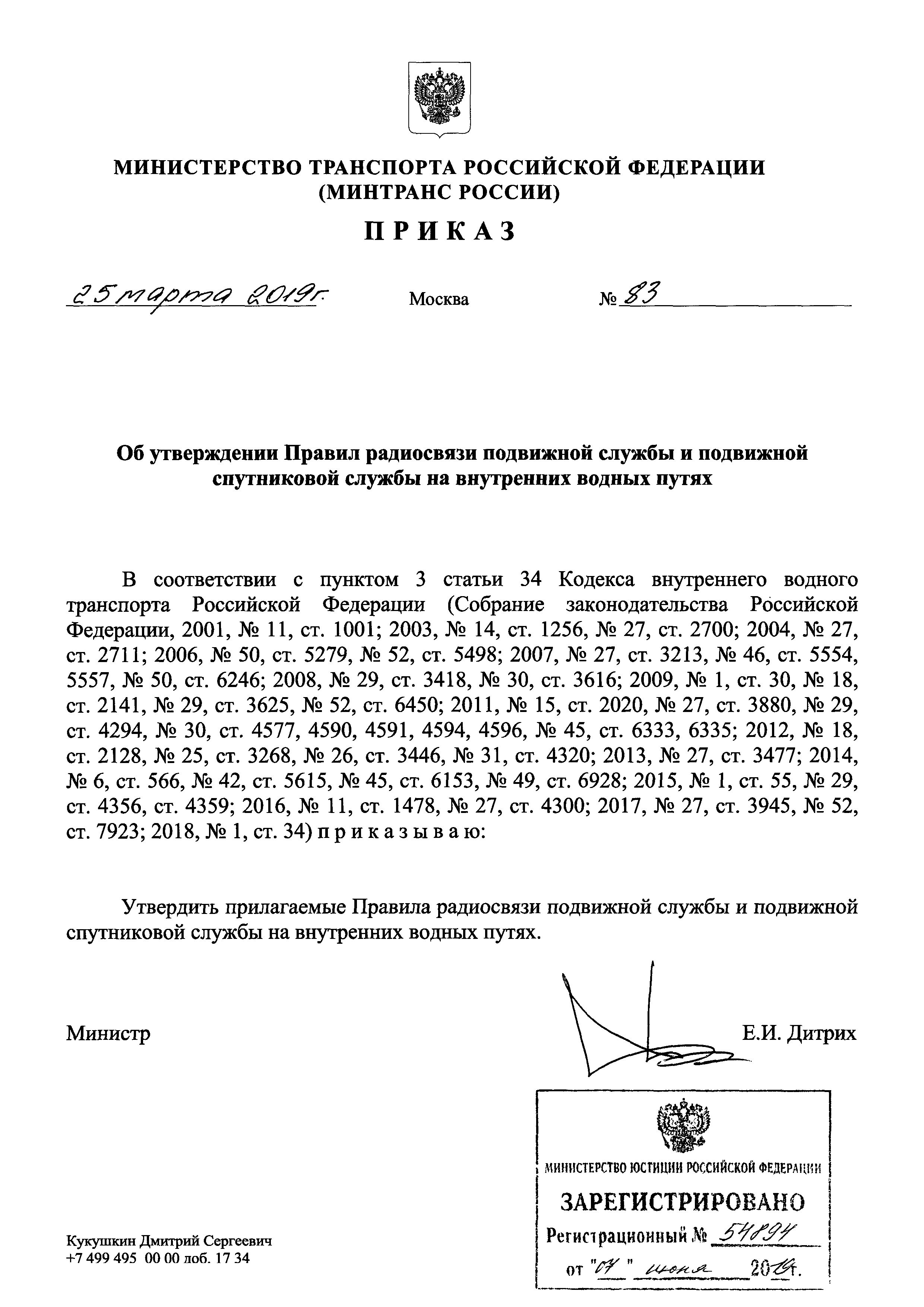| Утверждён: | 25.03.2019 Министерство транспорта Российской Федерации (Russian Federation Ministry of Transportation 83) |