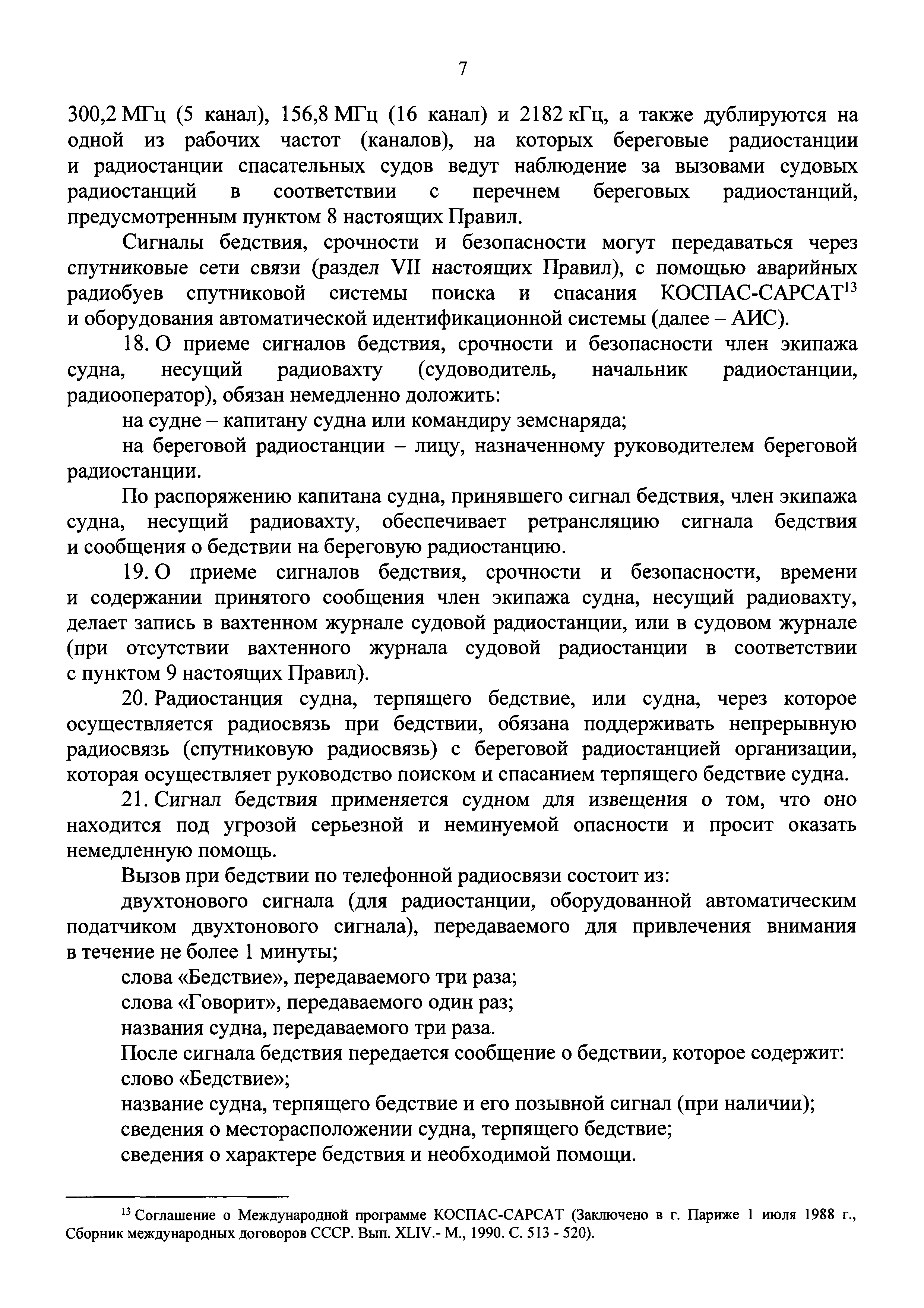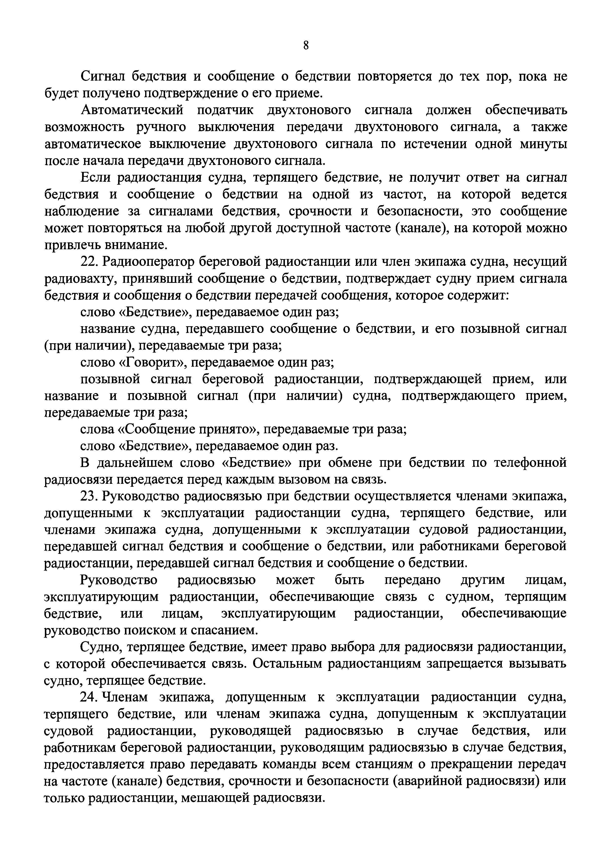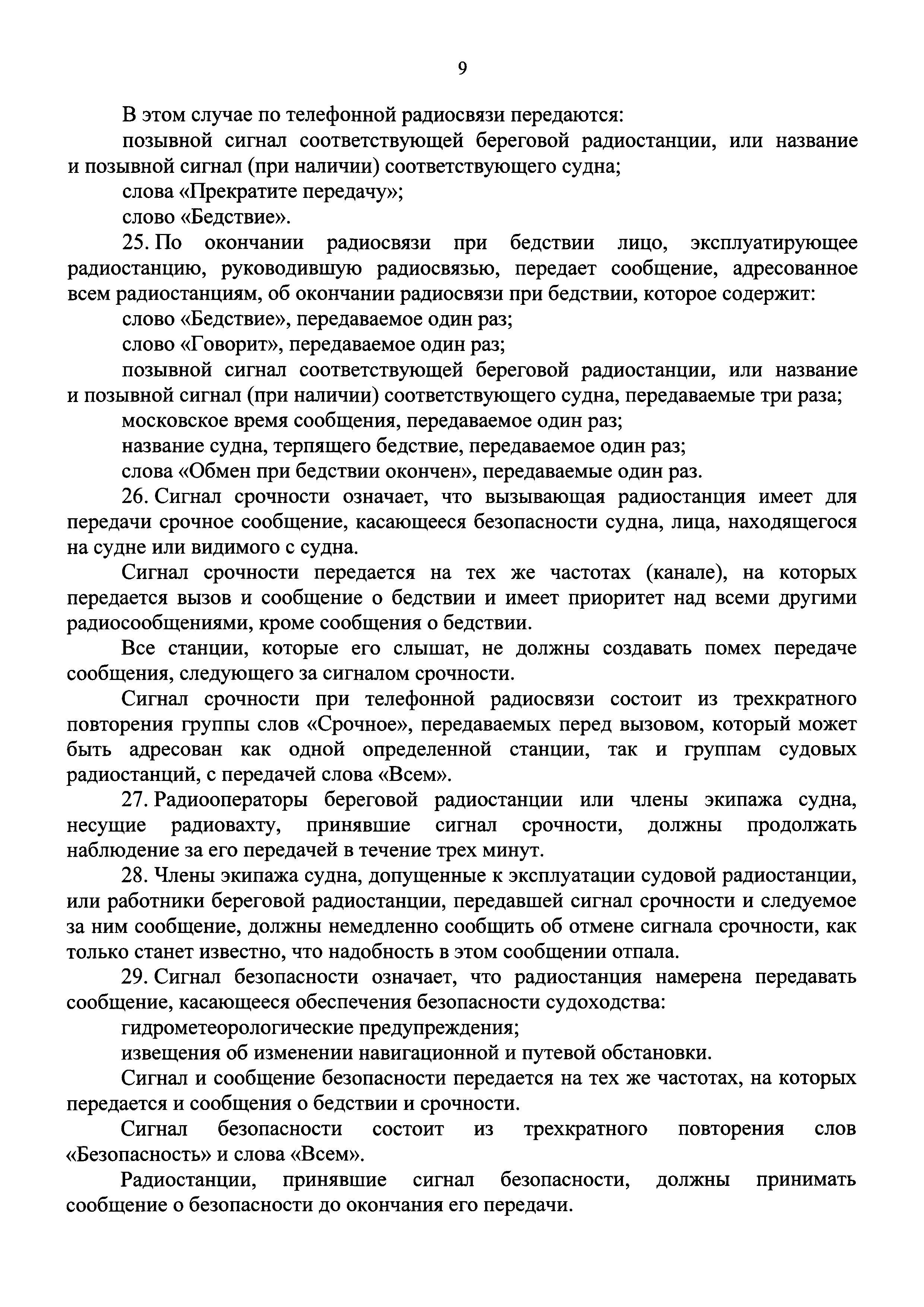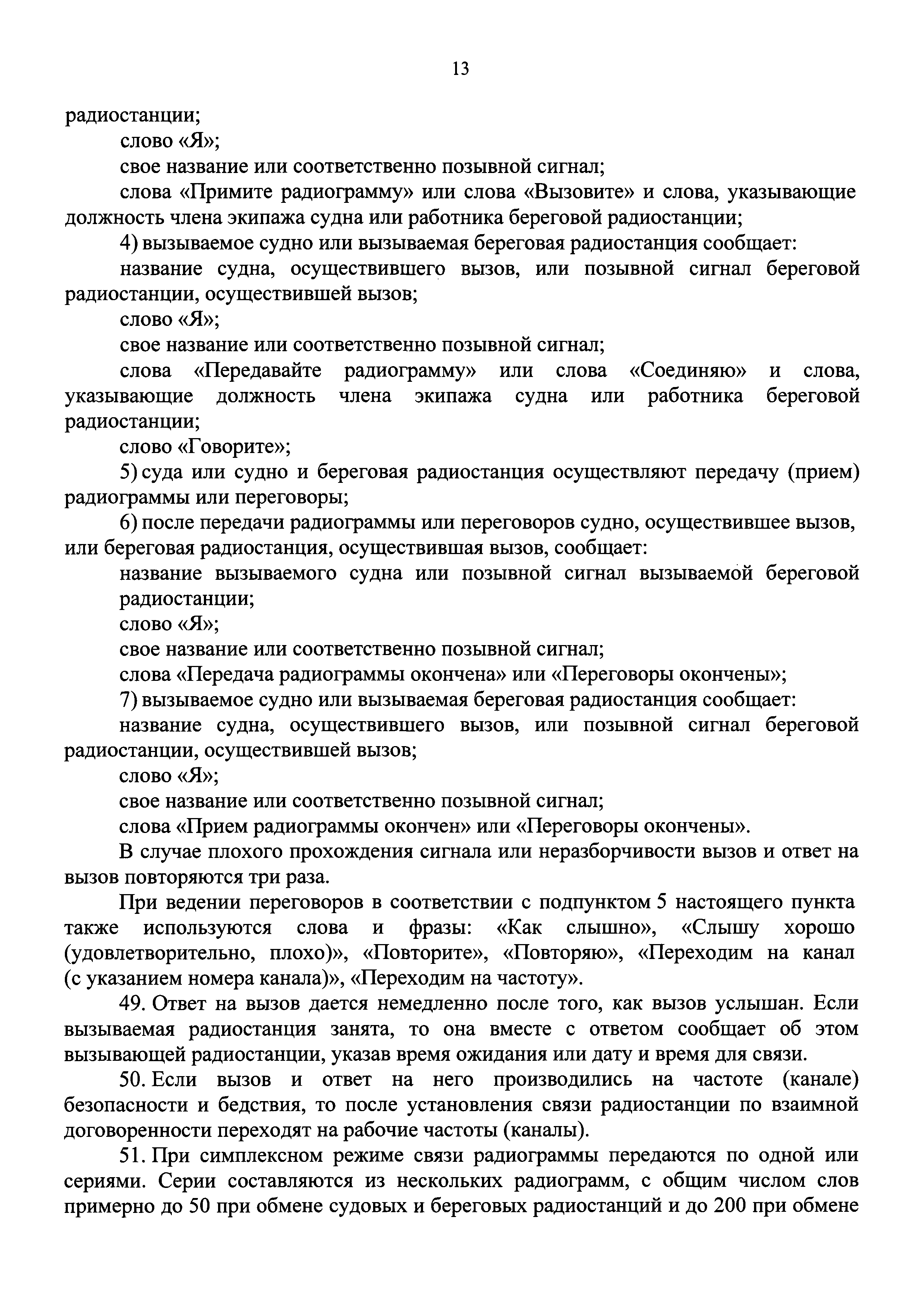 | Оглавление: | I. Общие положения II. Сигналы бедствия, срочности и безопасности III. Специальные радиопередачи IV. Телефонная радиосвязь V. Вахтенный журнал судовой радиостанции, журнал приема прогнозов погоды, штормовых предупреждений и путевой информации, аппаратный журнал береговой радиостанции и журнал регистрации исходящей корреспонденции береговой радиостанции VI. Регистрация переговоров по каналам радиосвязи VII. Подвижная спутниковая служба Приложение № 1. Диапазоны частот и длин волн, используемых в радиосвязи Приложение № 2. Перечень каналов, режимов работы и номиналов частот в диапазоне дециметровых волн в полосах 300,0125 - 300,5125 МГц и 336,0125 - 336,5125 МГц Приложение № 3. Образцы журналов Приложение № 4. Категории и отметки срочности обработки радиограмм |