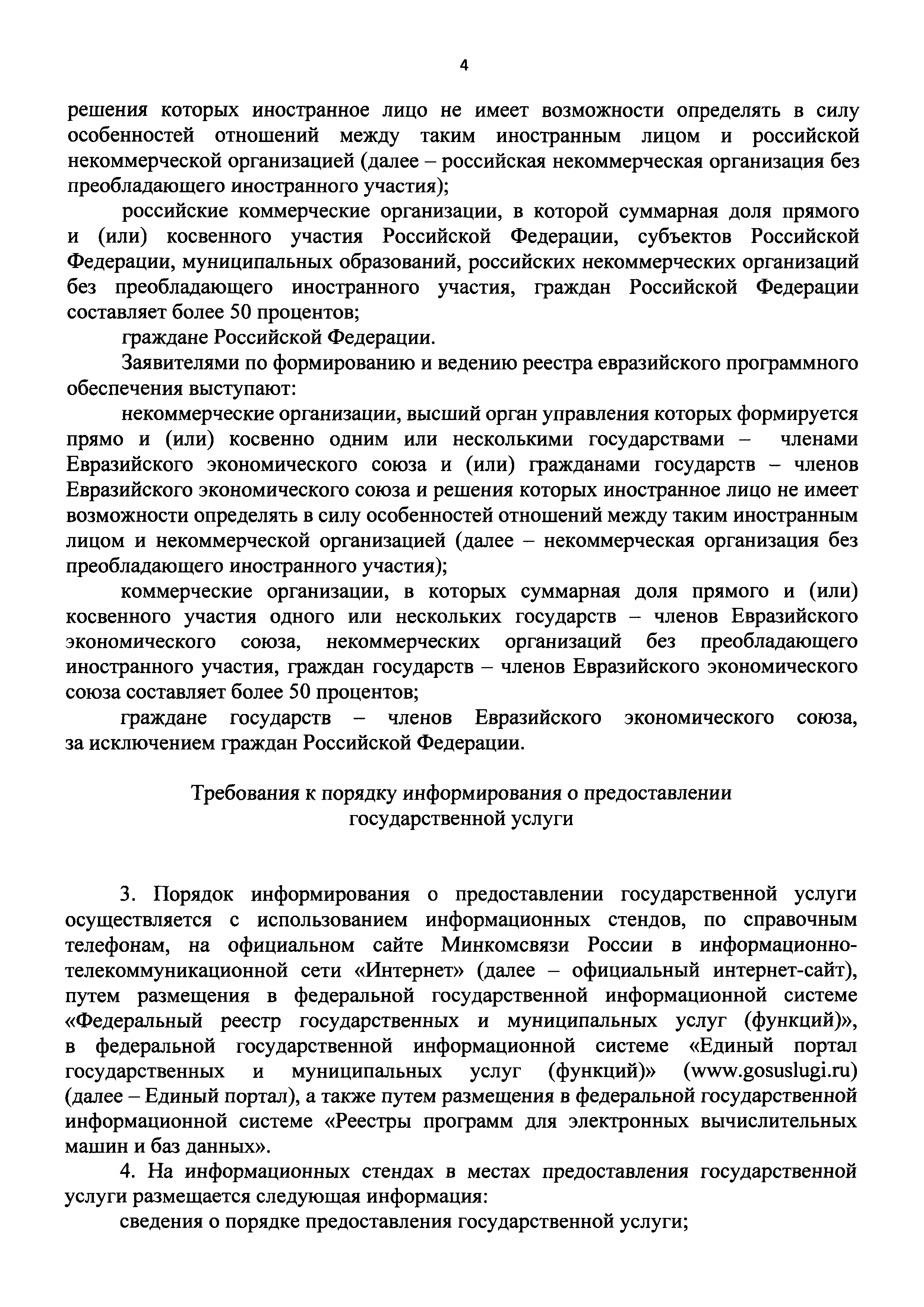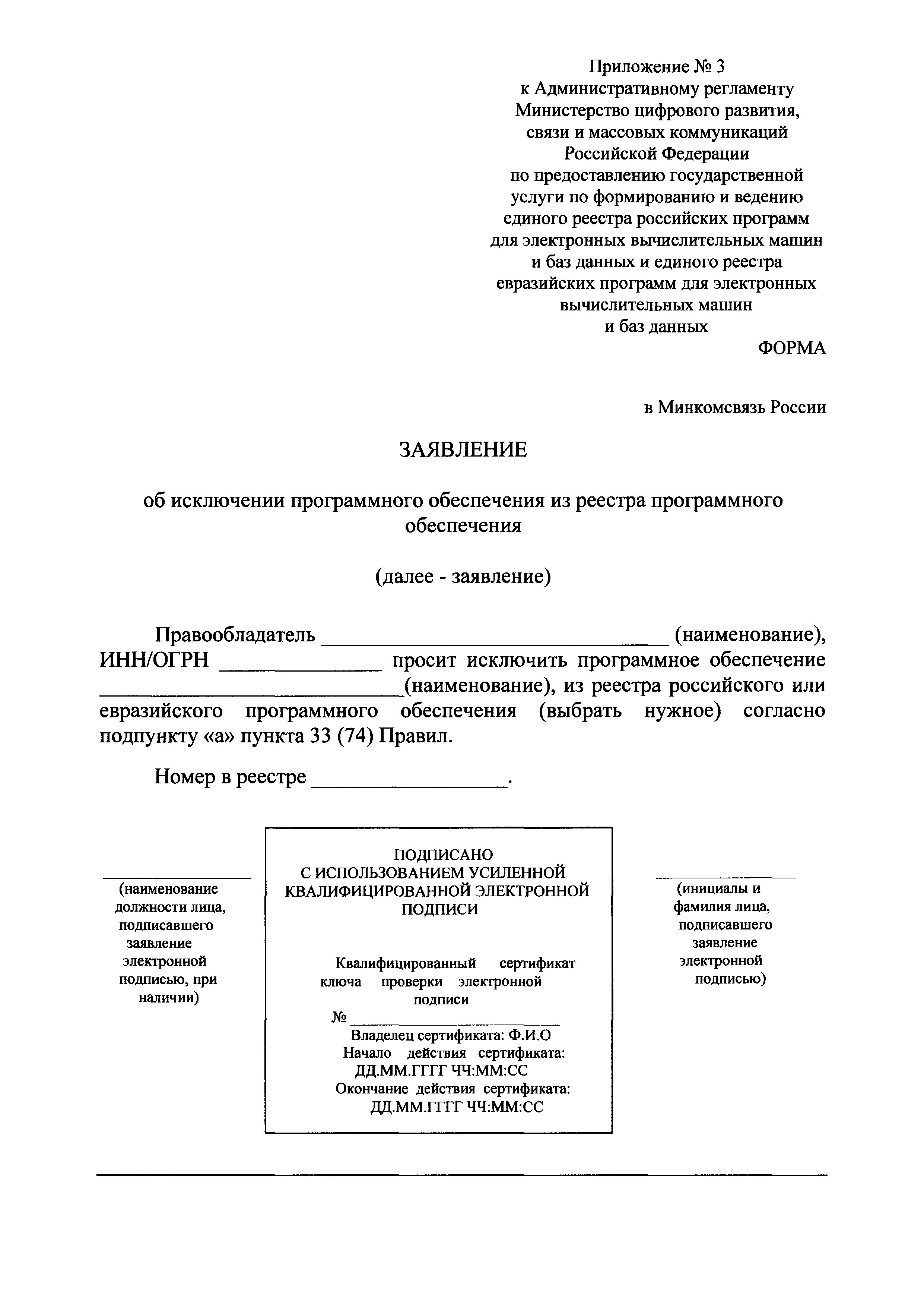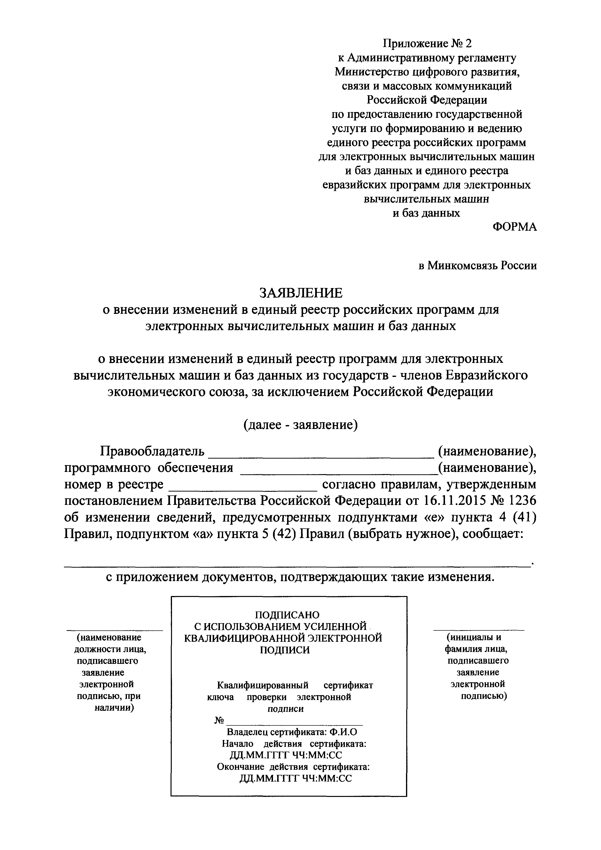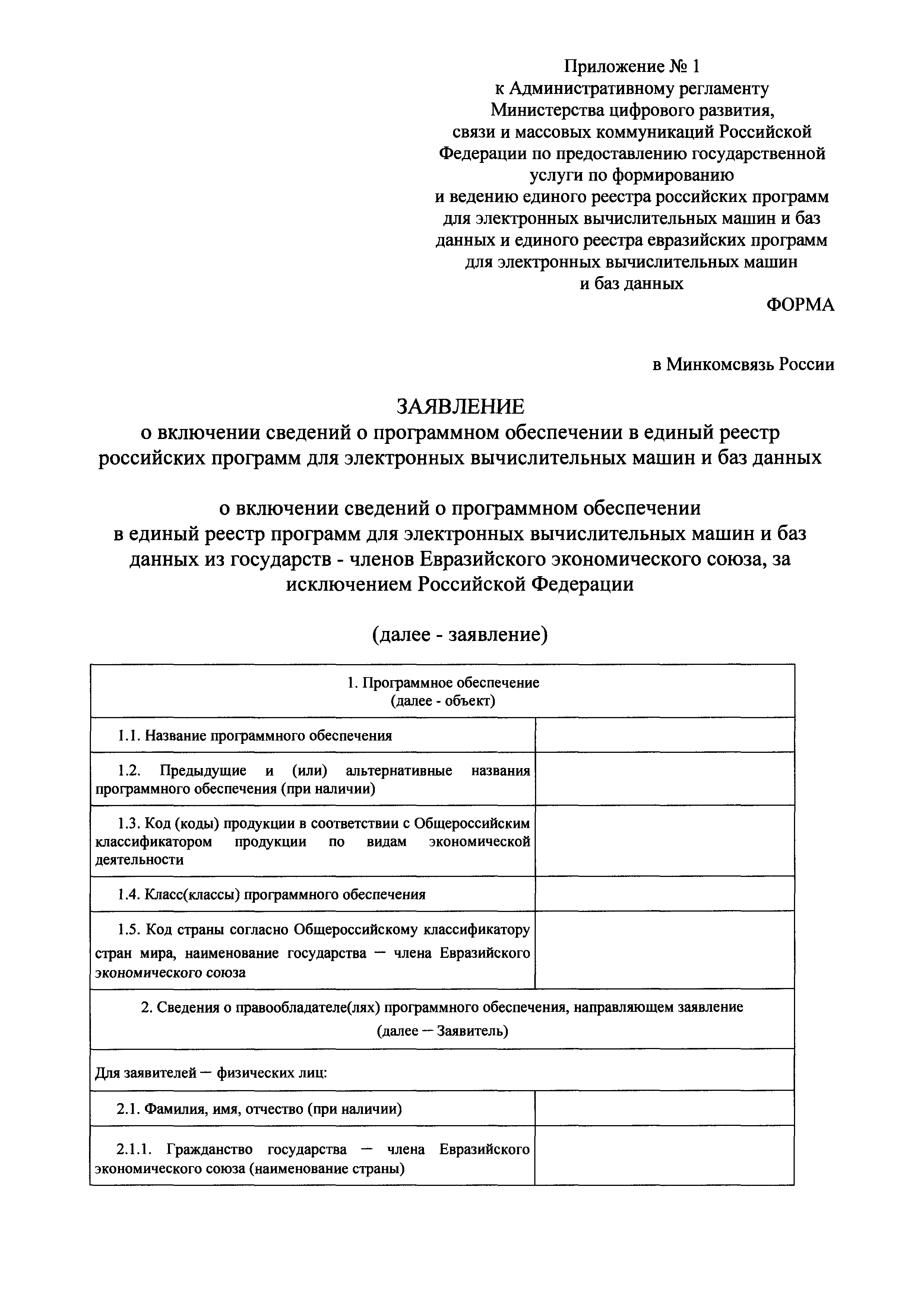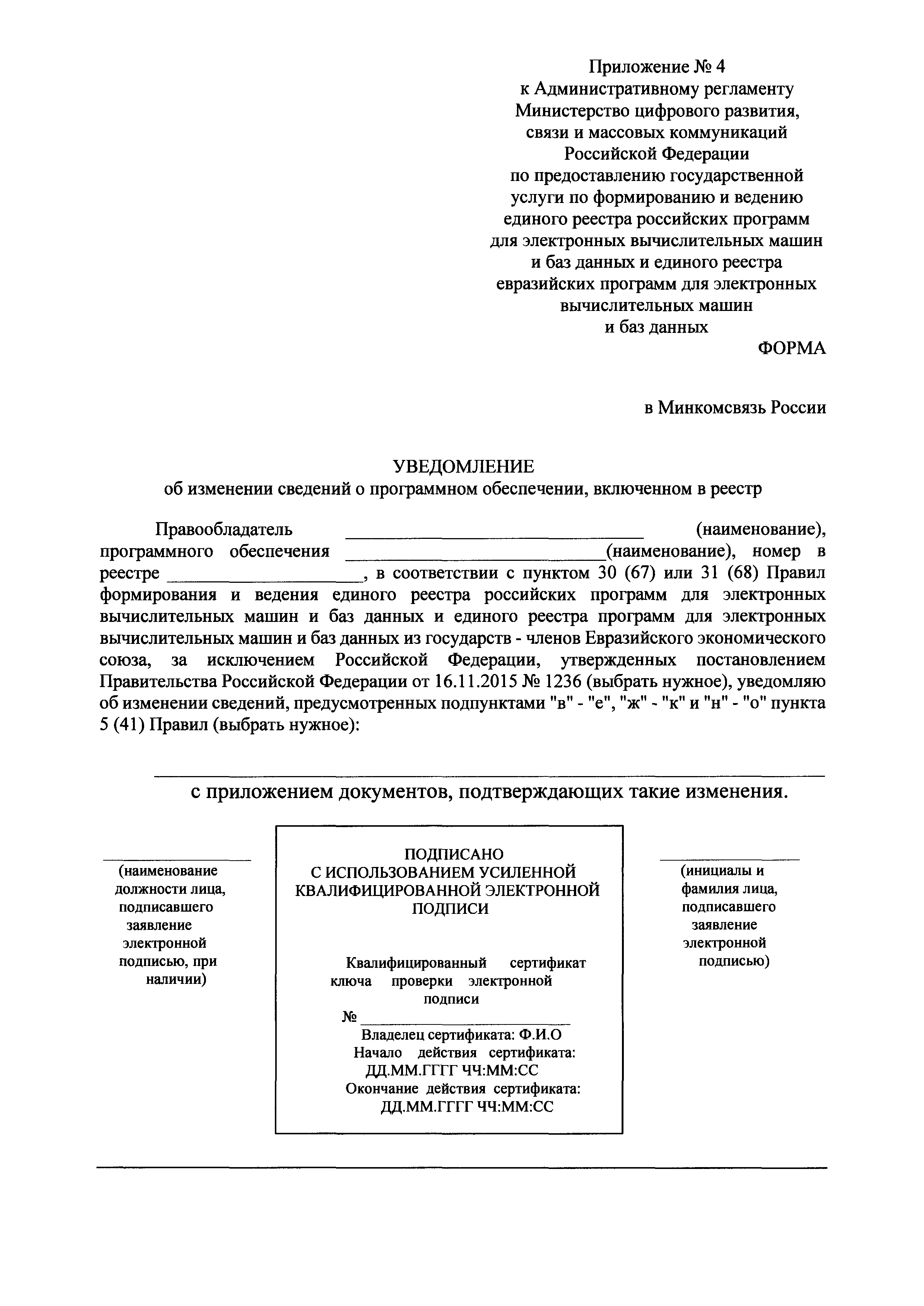 | Оглавление: | I. Общие положения II. Стандарт предоставления государственной услуги по формированию и ведению единого реестра российских программ для электронных вычислительных машин и баз данных и единого реестра евразийских программ для электронных вычислительных машин и баз данных III. Состав, последовательность и сроки выполнения административных процедур (действий), требования к порядку их выполнения, в том числе особенности выполнения административных процедур IV. Формы контроля за исполнением Административного регламента предоставления Министерством цифрового развития, связи и массовых коммуникаций Российской Федерации государственной услуги по формированию и ведению единого реестра российских программ для электронных вычислительных машин и баз данных и единого реестра евразийских программ для электронных вычислительных машин и баз данных V. Досудебный (внесудебный) порядок обжалования решений и действий (бездействия) органа, предоставляющего государственную услугу по формированию и ведению единого реестра российских программ для электронных вычислительных машин и баз данных и единого реестра евразийских программ для электронных вычислительных машин и баз данных Приложение № 1. Форма заявления о включении сведений о программном обеспечении в единый реестр российских (евразийских) программ для электронных вычислительных машин и баз данных Приложение № 2. Форма заявления о внесении изменений в единый реестр российских (евразийских) программ для электронных вычислительных машин и баз данных Приложение № 3. Форма заявления об исключении программного обеспечения из реестра программного обеспечения Приложение № 4. Форма уведомления об изменении сведений о программном обеспечении, включенном в реестр |