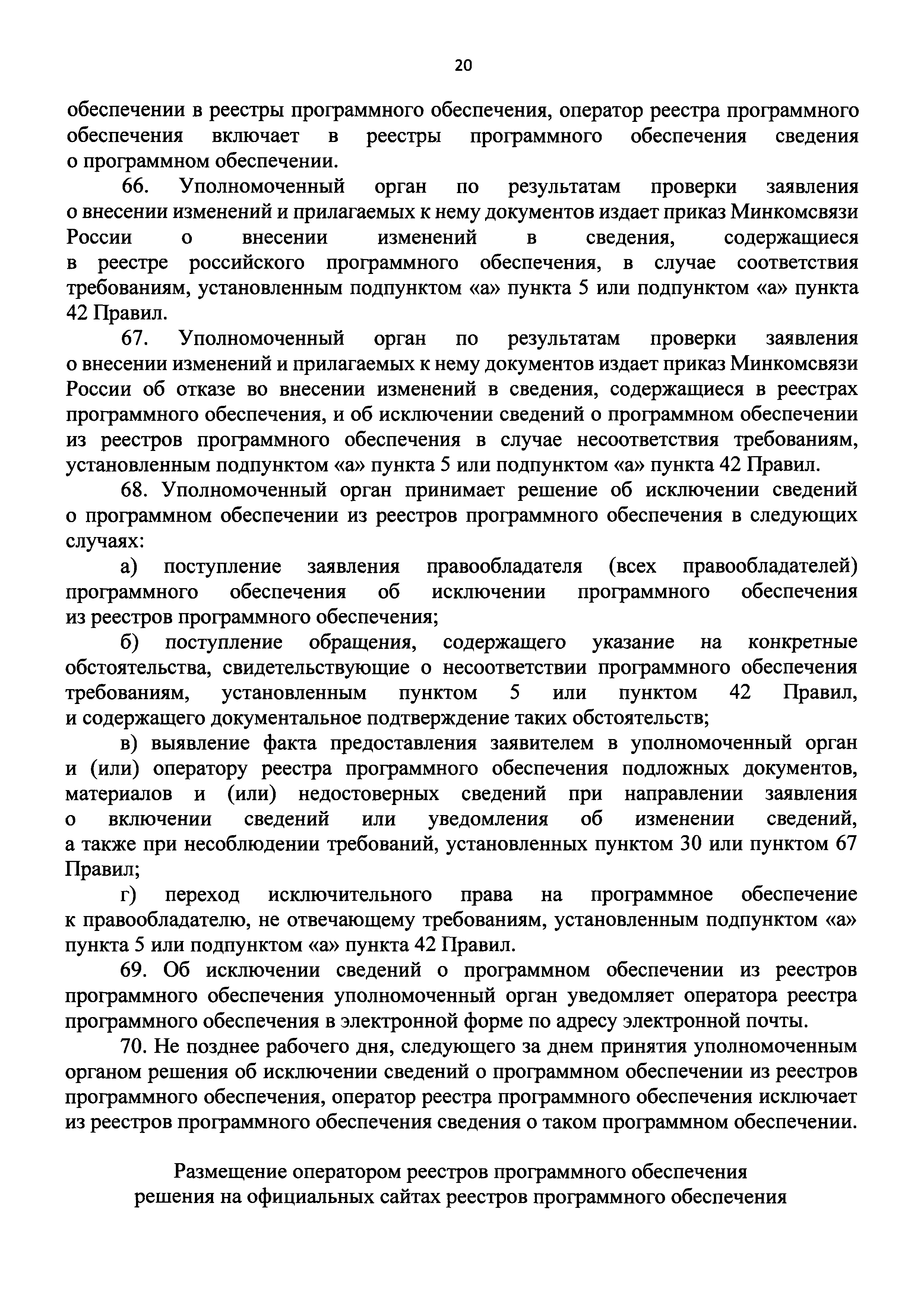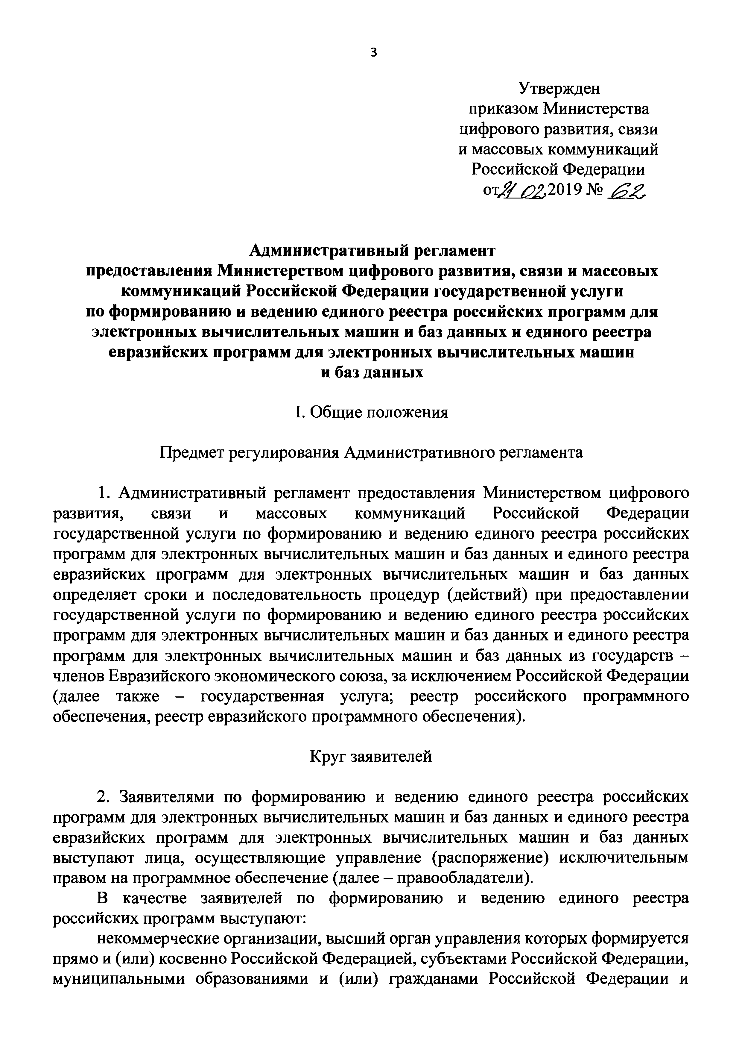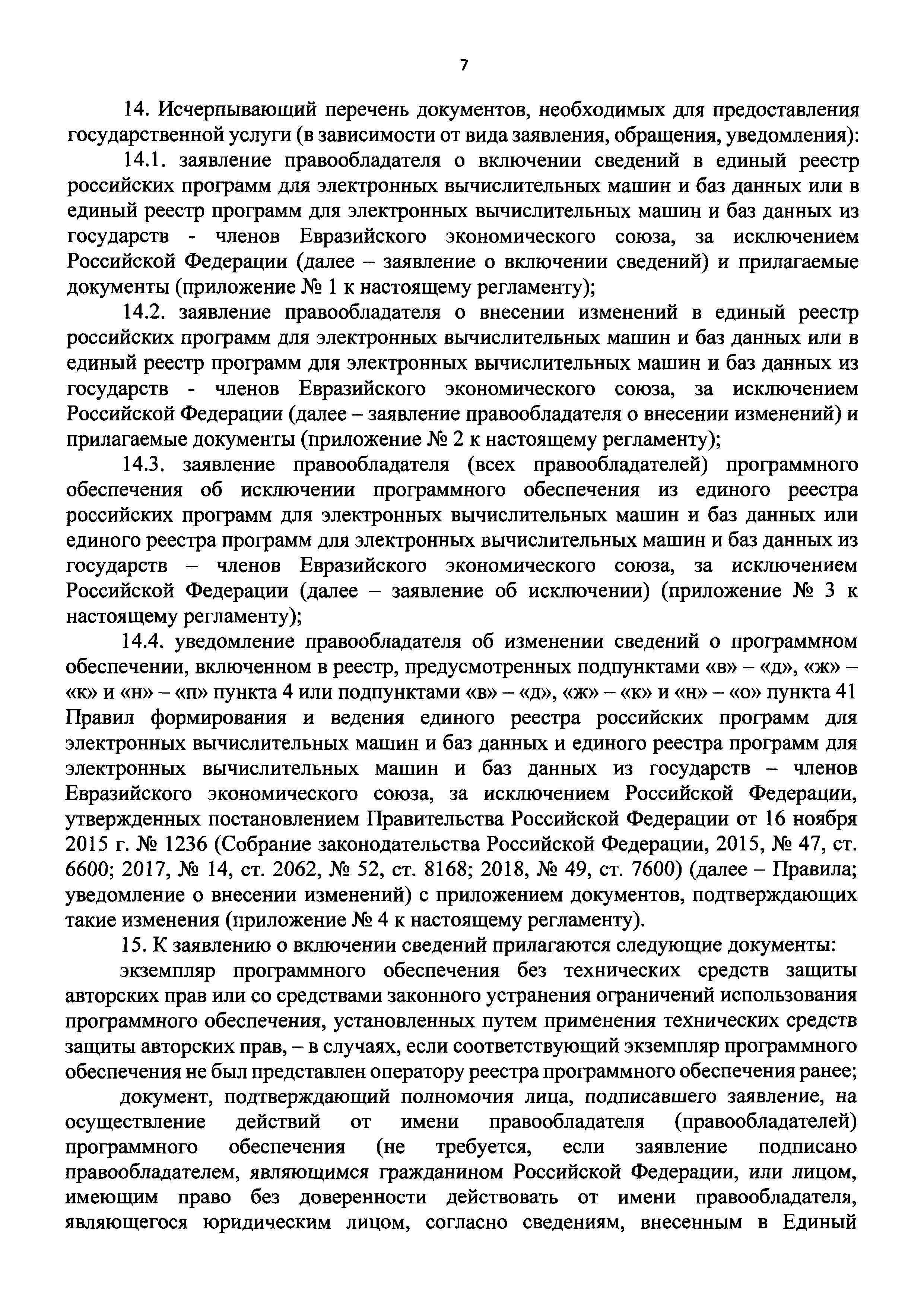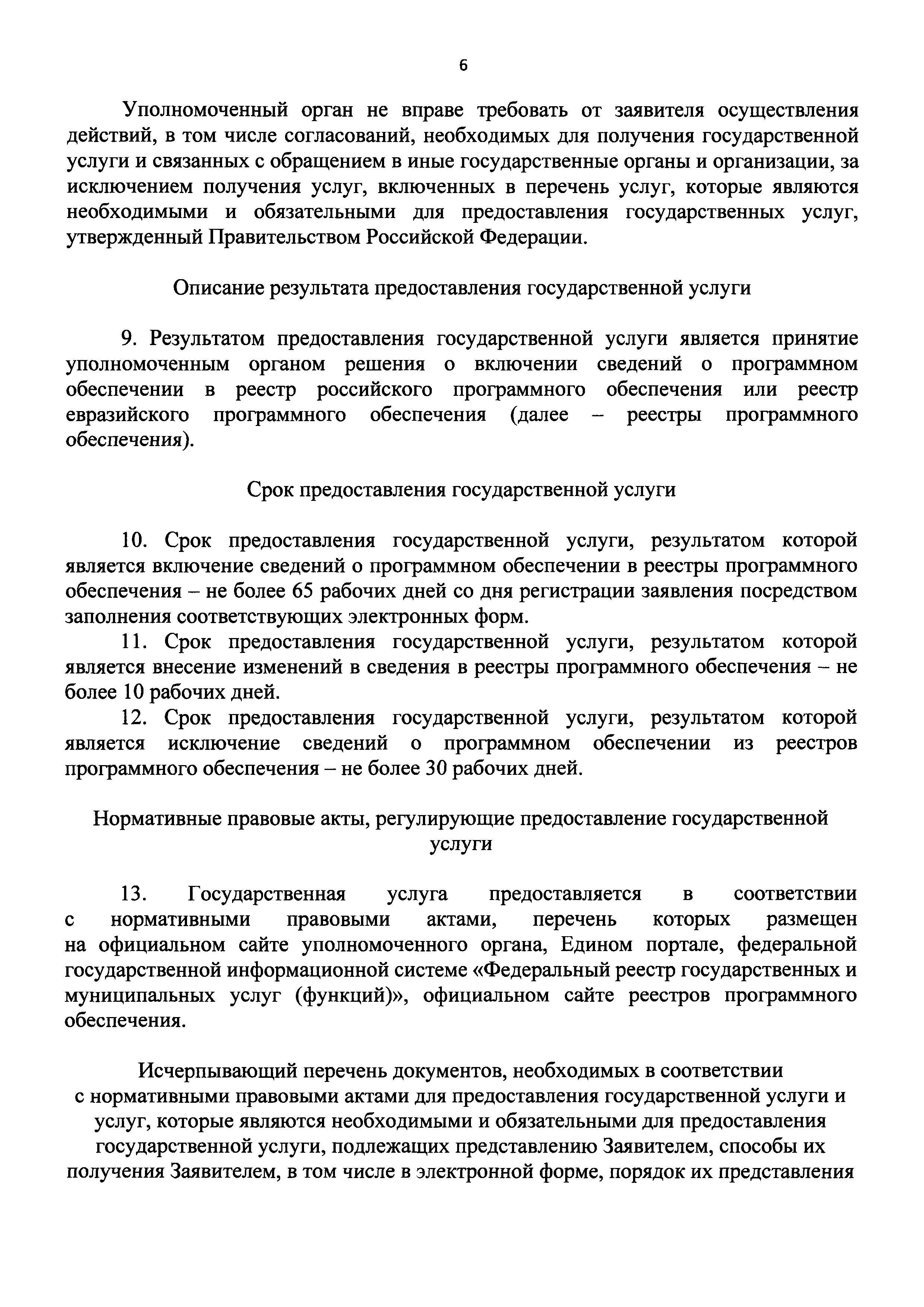 | Оглавление: | I. Общие положения II. Стандарт предоставления государственной услуги по формированию и ведению единого реестра российских программ для электронных вычислительных машин и баз данных и единого реестра евразийских программ для электронных вычислительных машин и баз данных III. Состав, последовательность и сроки выполнения административных процедур (действий), требования к порядку их выполнения, в том числе особенности выполнения административных процедур IV. Формы контроля за исполнением Административного регламента предоставления Министерством цифрового развития, связи и массовых коммуникаций Российской Федерации государственной услуги по формированию и ведению единого реестра российских программ для электронных вычислительных машин и баз данных и единого реестра евразийских программ для электронных вычислительных машин и баз данных V. Досудебный (внесудебный) порядок обжалования решений и действий (бездействия) органа, предоставляющего государственную услугу по формированию и ведению единого реестра российских программ для электронных вычислительных машин и баз данных и единого реестра евразийских программ для электронных вычислительных машин и баз данных Приложение № 1. Форма заявления о включении сведений о программном обеспечении в единый реестр российских (евразийских) программ для электронных вычислительных машин и баз данных Приложение № 2. Форма заявления о внесении изменений в единый реестр российских (евразийских) программ для электронных вычислительных машин и баз данных Приложение № 3. Форма заявления об исключении программного обеспечения из реестра программного обеспечения Приложение № 4. Форма уведомления об изменении сведений о программном обеспечении, включенном в реестр |