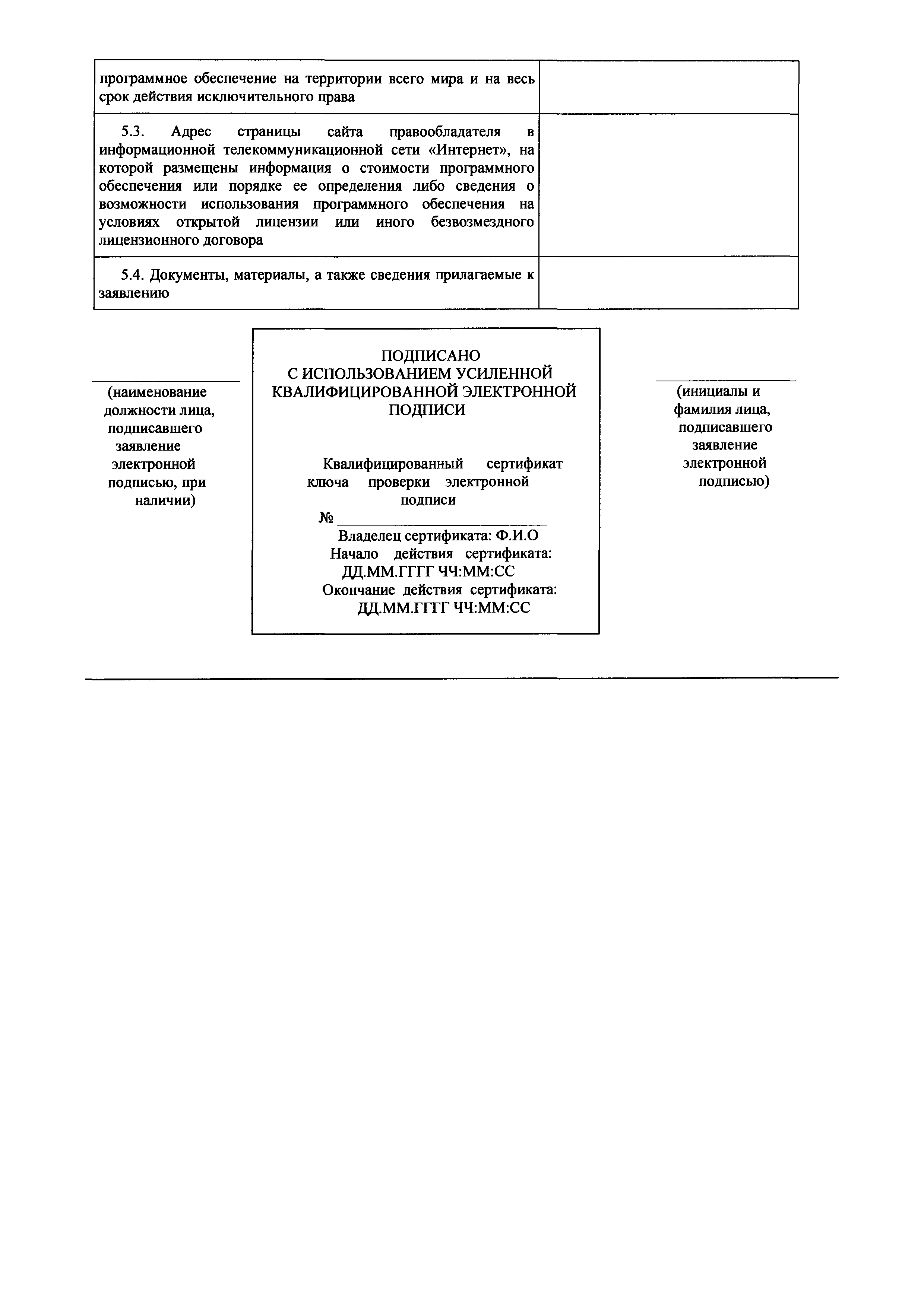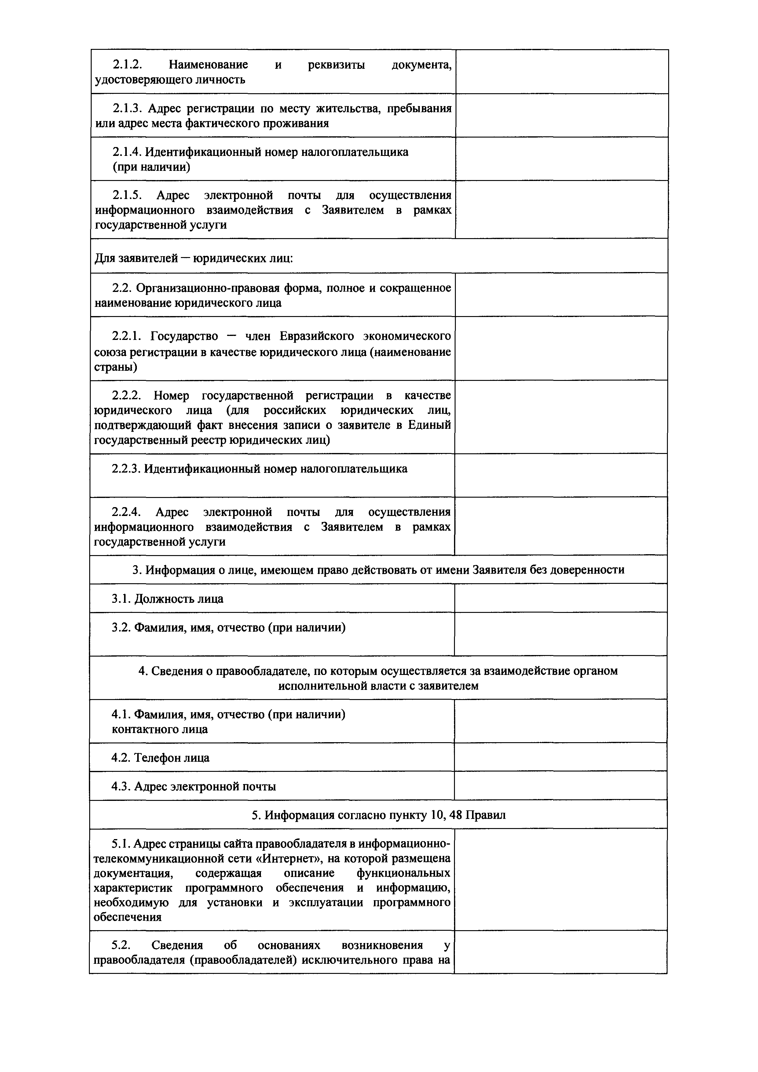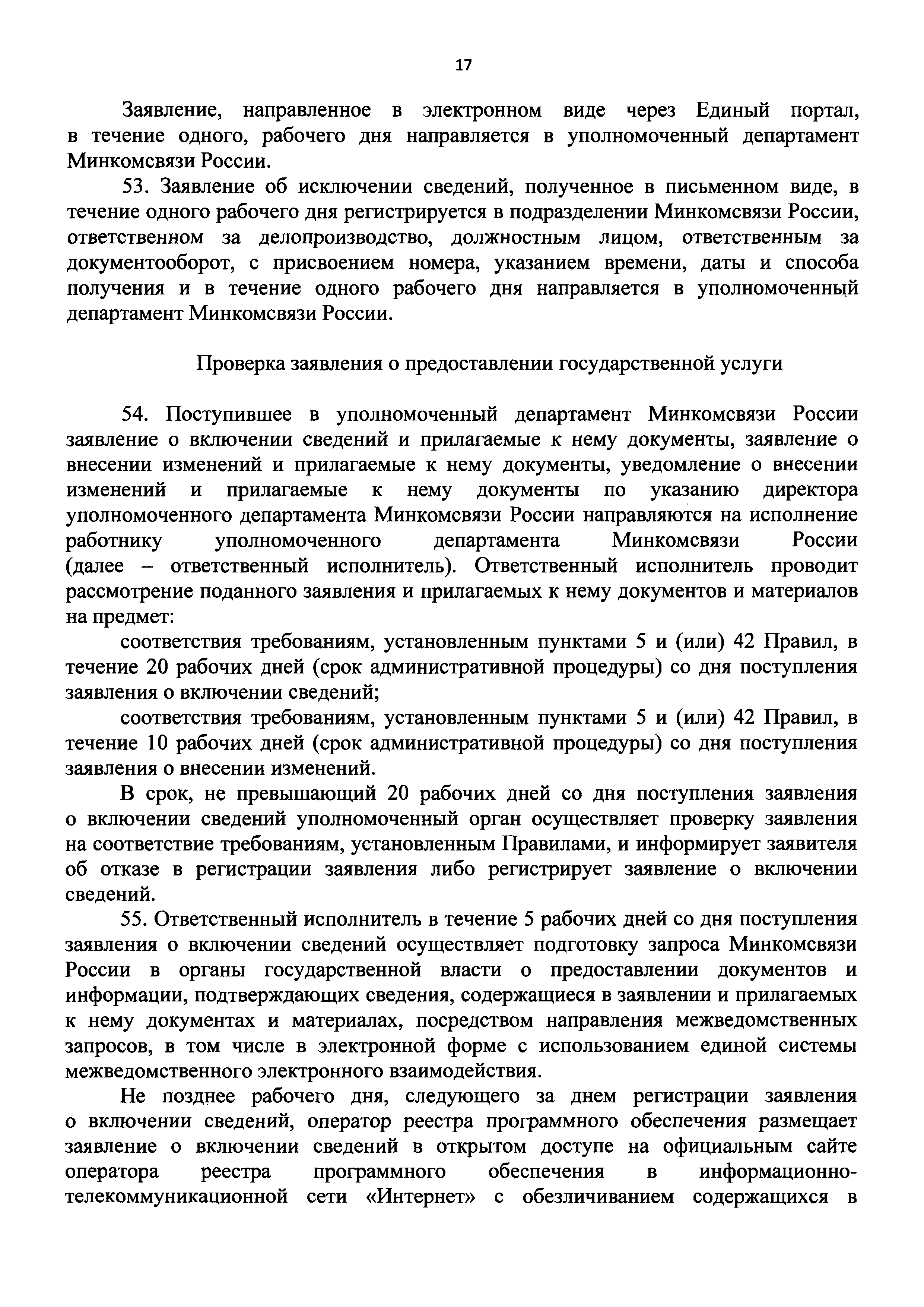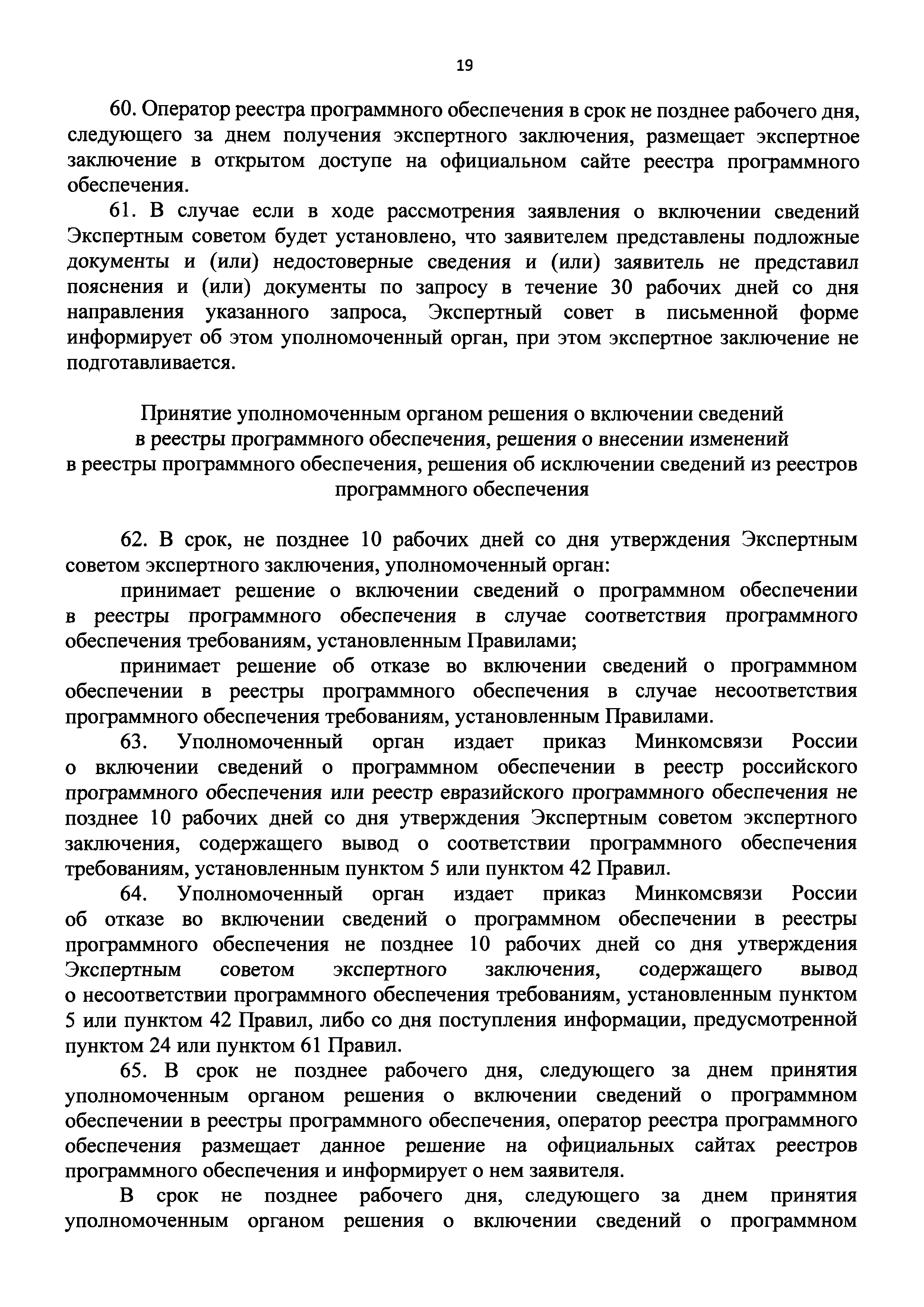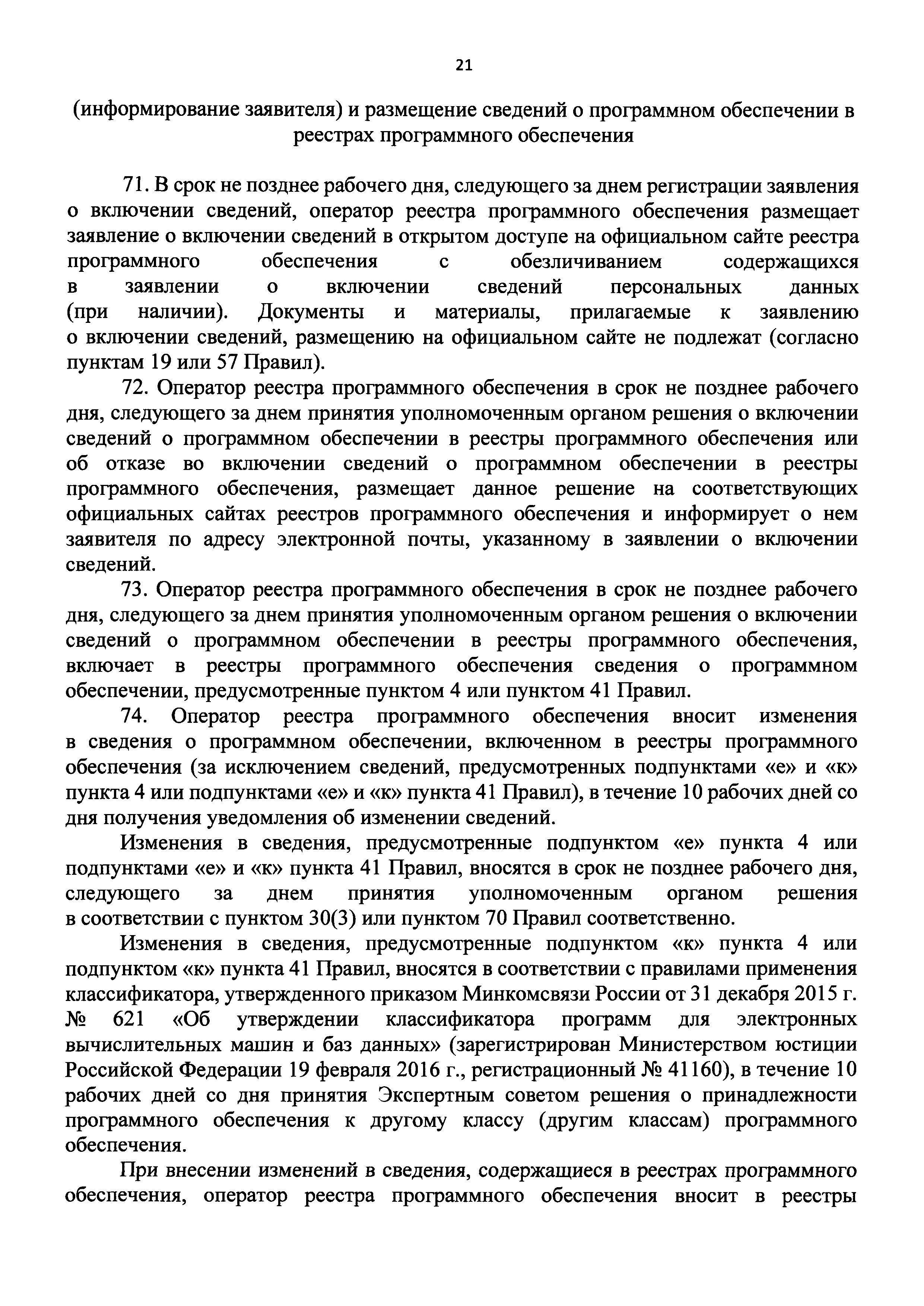 | Оглавление: | I. Общие положения II. Стандарт предоставления государственной услуги по формированию и ведению единого реестра российских программ для электронных вычислительных машин и баз данных и единого реестра евразийских программ для электронных вычислительных машин и баз данных III. Состав, последовательность и сроки выполнения административных процедур (действий), требования к порядку их выполнения, в том числе особенности выполнения административных процедур IV. Формы контроля за исполнением Административного регламента предоставления Министерством цифрового развития, связи и массовых коммуникаций Российской Федерации государственной услуги по формированию и ведению единого реестра российских программ для электронных вычислительных машин и баз данных и единого реестра евразийских программ для электронных вычислительных машин и баз данных V. Досудебный (внесудебный) порядок обжалования решений и действий (бездействия) органа, предоставляющего государственную услугу по формированию и ведению единого реестра российских программ для электронных вычислительных машин и баз данных и единого реестра евразийских программ для электронных вычислительных машин и баз данных Приложение № 1. Форма заявления о включении сведений о программном обеспечении в единый реестр российских (евразийских) программ для электронных вычислительных машин и баз данных Приложение № 2. Форма заявления о внесении изменений в единый реестр российских (евразийских) программ для электронных вычислительных машин и баз данных Приложение № 3. Форма заявления об исключении программного обеспечения из реестра программного обеспечения Приложение № 4. Форма уведомления об изменении сведений о программном обеспечении, включенном в реестр |