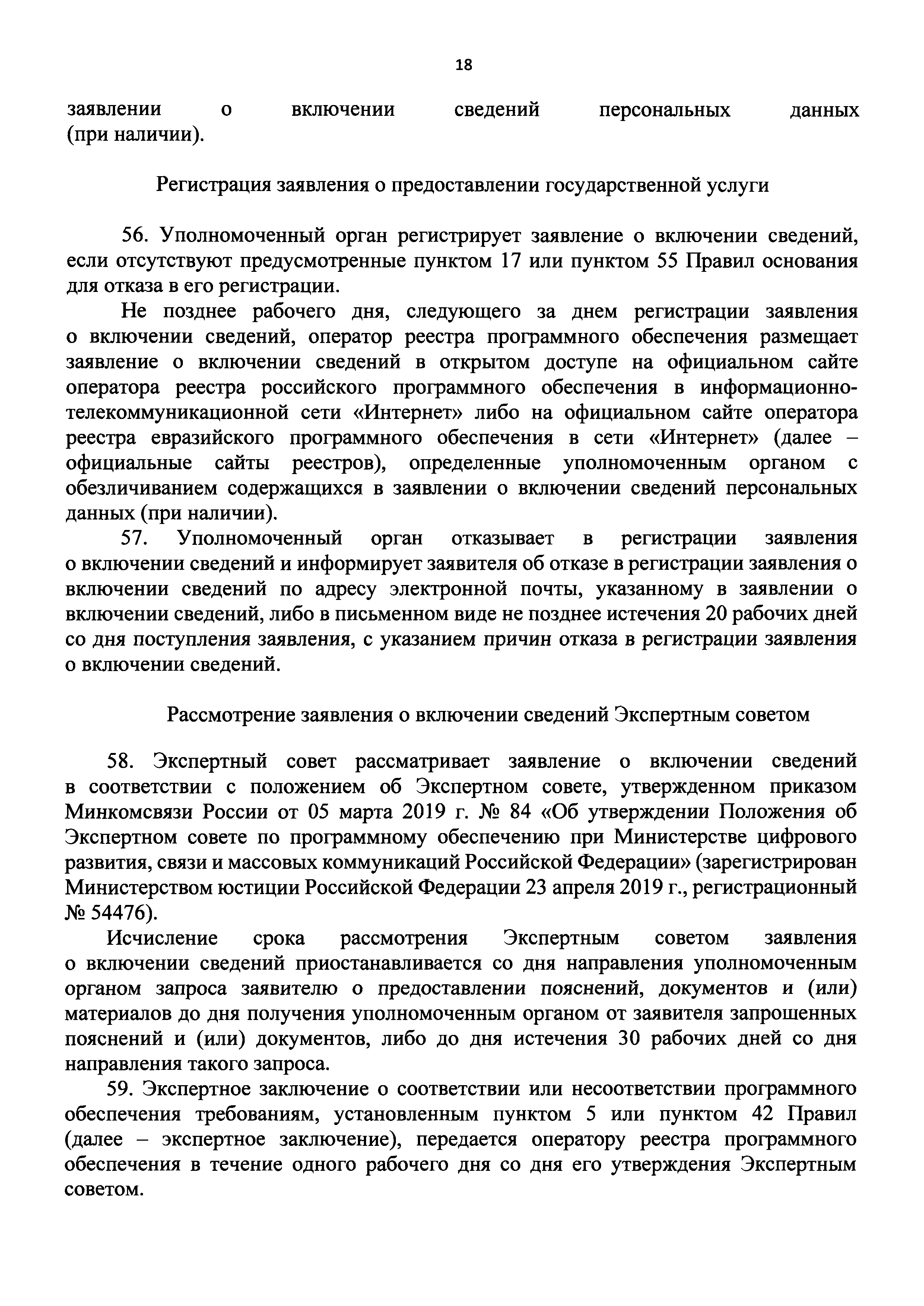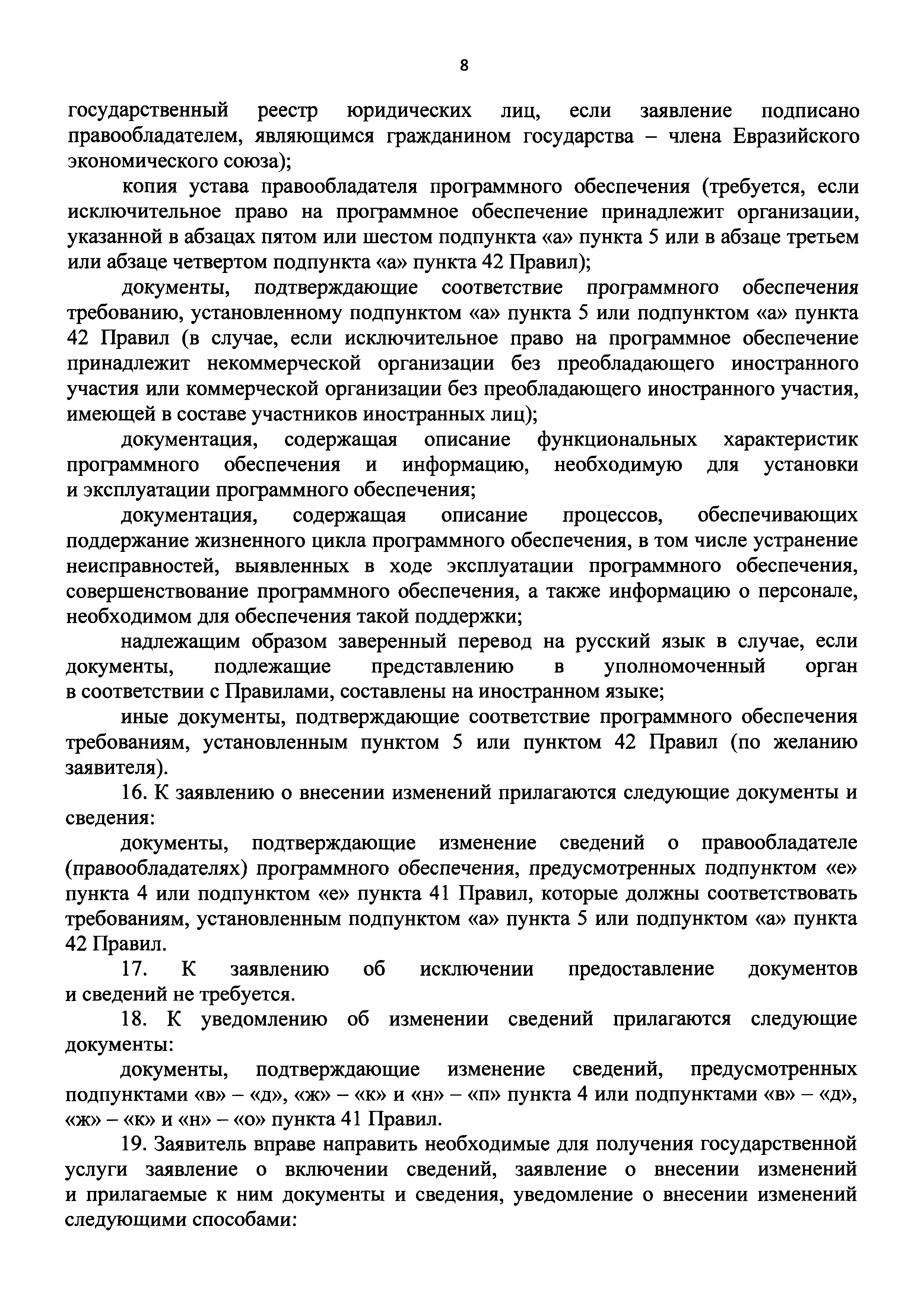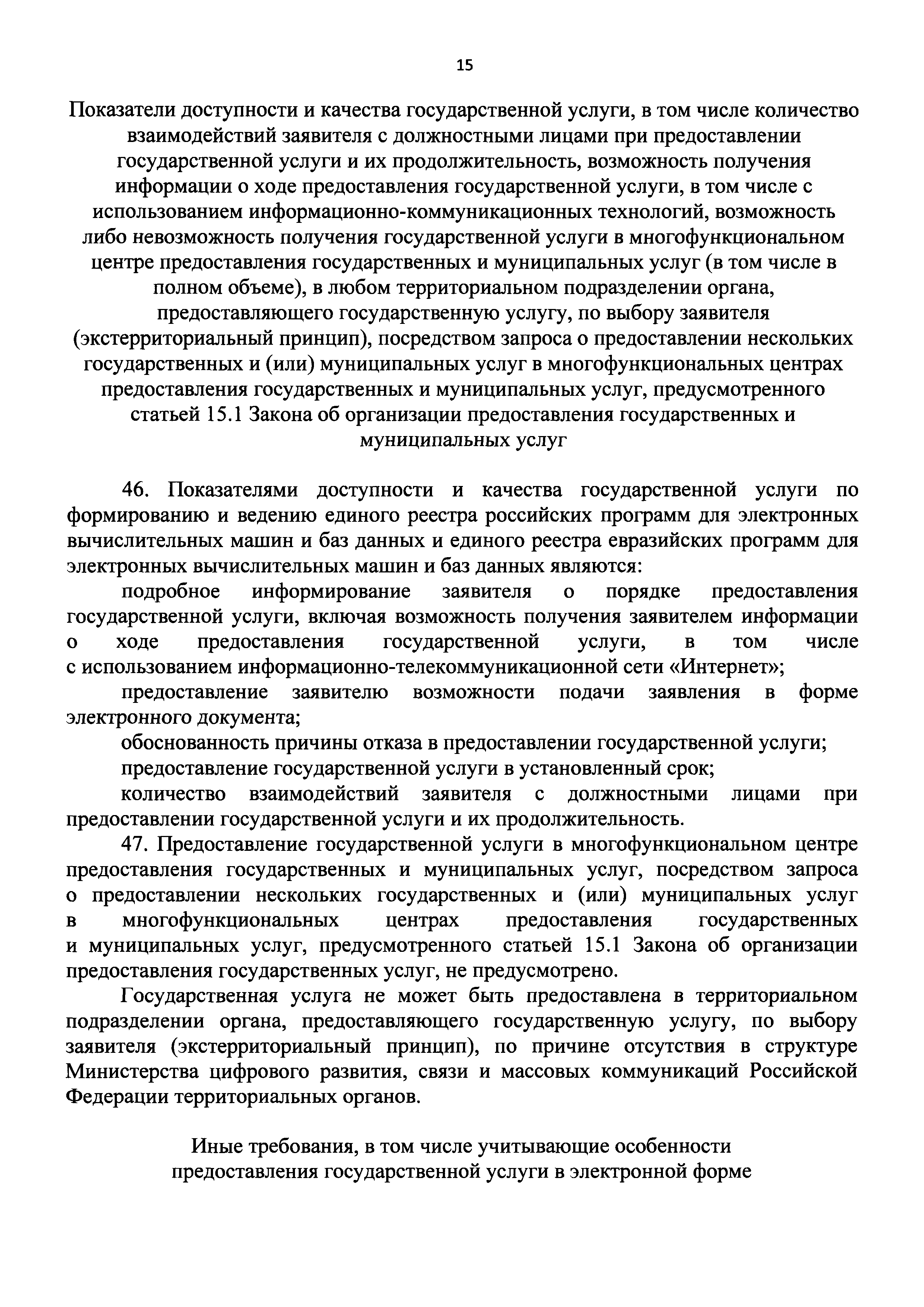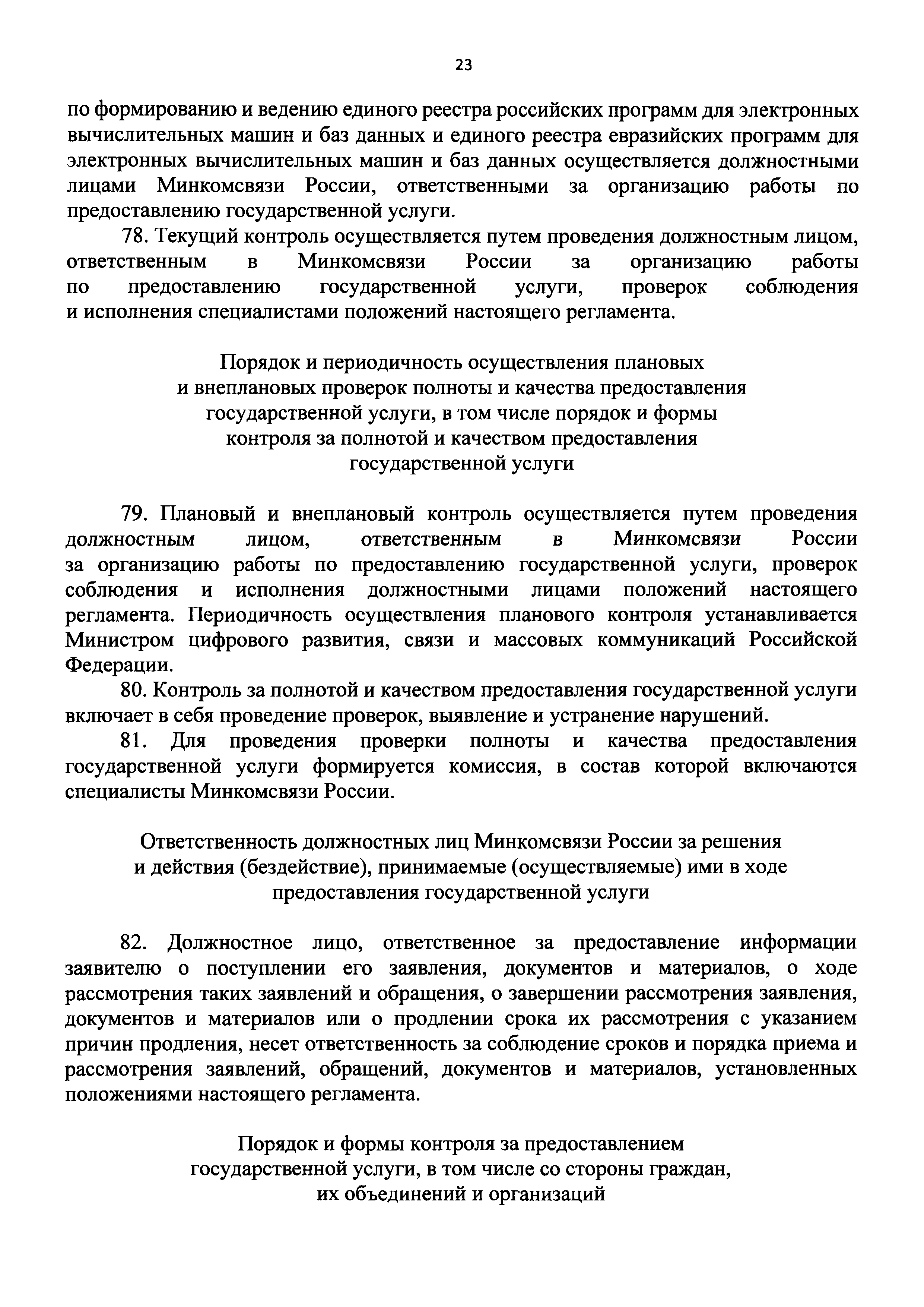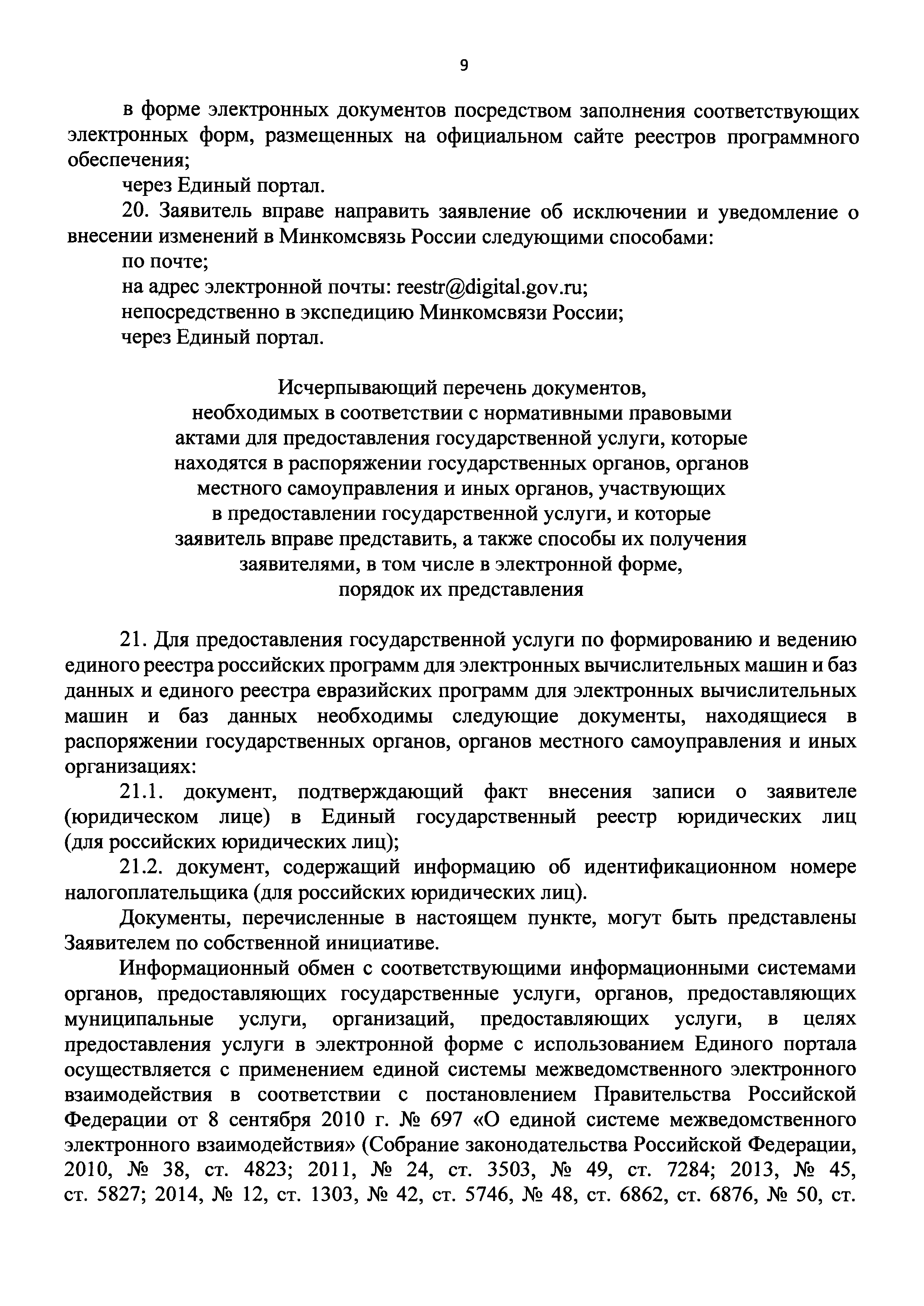 | Оглавление: | I. Общие положения II. Стандарт предоставления государственной услуги по формированию и ведению единого реестра российских программ для электронных вычислительных машин и баз данных и единого реестра евразийских программ для электронных вычислительных машин и баз данных III. Состав, последовательность и сроки выполнения административных процедур (действий), требования к порядку их выполнения, в том числе особенности выполнения административных процедур IV. Формы контроля за исполнением Административного регламента предоставления Министерством цифрового развития, связи и массовых коммуникаций Российской Федерации государственной услуги по формированию и ведению единого реестра российских программ для электронных вычислительных машин и баз данных и единого реестра евразийских программ для электронных вычислительных машин и баз данных V. Досудебный (внесудебный) порядок обжалования решений и действий (бездействия) органа, предоставляющего государственную услугу по формированию и ведению единого реестра российских программ для электронных вычислительных машин и баз данных и единого реестра евразийских программ для электронных вычислительных машин и баз данных Приложение № 1. Форма заявления о включении сведений о программном обеспечении в единый реестр российских (евразийских) программ для электронных вычислительных машин и баз данных Приложение № 2. Форма заявления о внесении изменений в единый реестр российских (евразийских) программ для электронных вычислительных машин и баз данных Приложение № 3. Форма заявления об исключении программного обеспечения из реестра программного обеспечения Приложение № 4. Форма уведомления об изменении сведений о программном обеспечении, включенном в реестр |