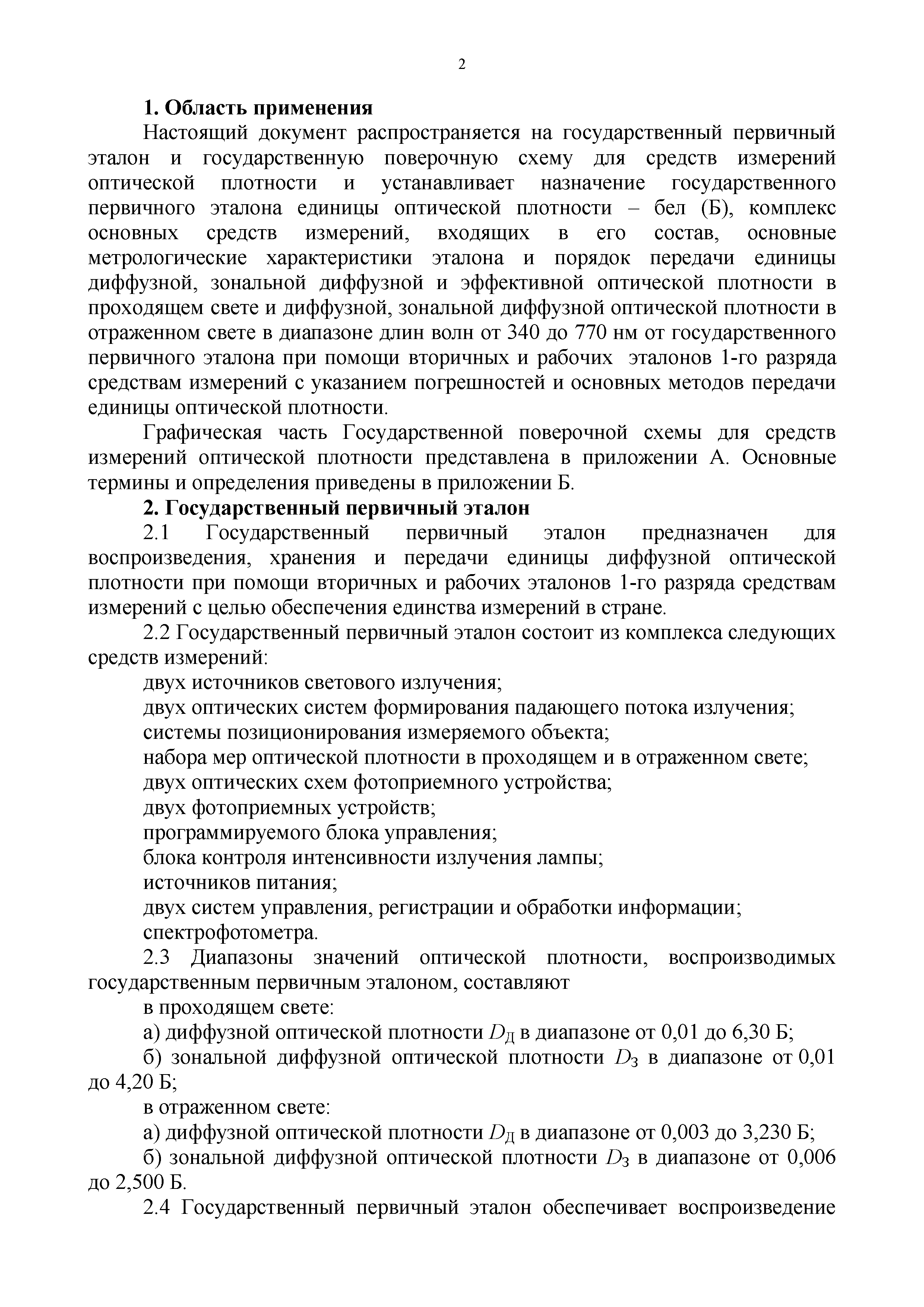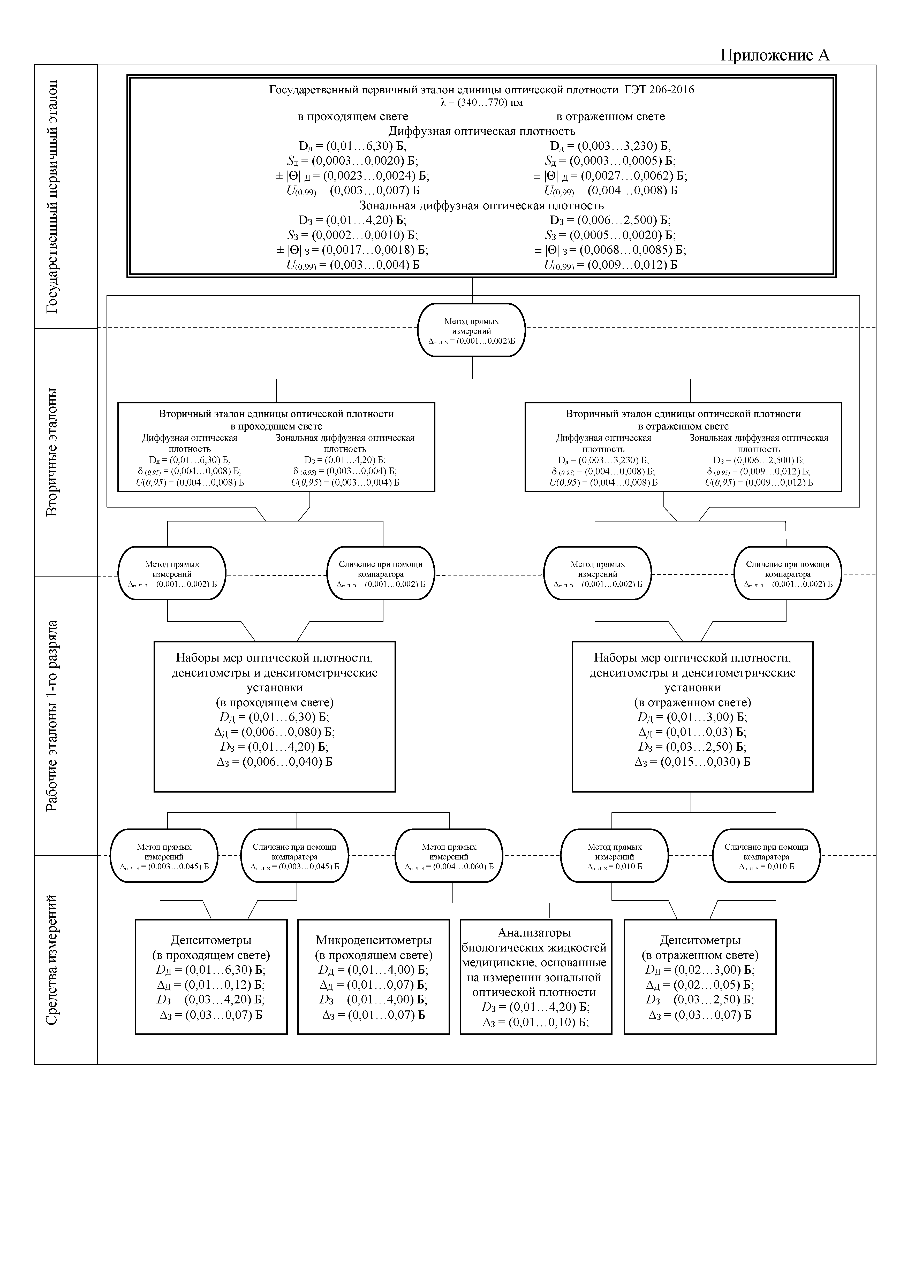 | Оглавление: | 1. Область применения 2. Государственный первичный эталон 3. Вторичные эталоны 4. Рабочие эталоны 1-го разряда 5. Средства измерений Приложение А. Государственная поверочная схема для средств измерений оптической плотности Приложение Б. Термины и определения |