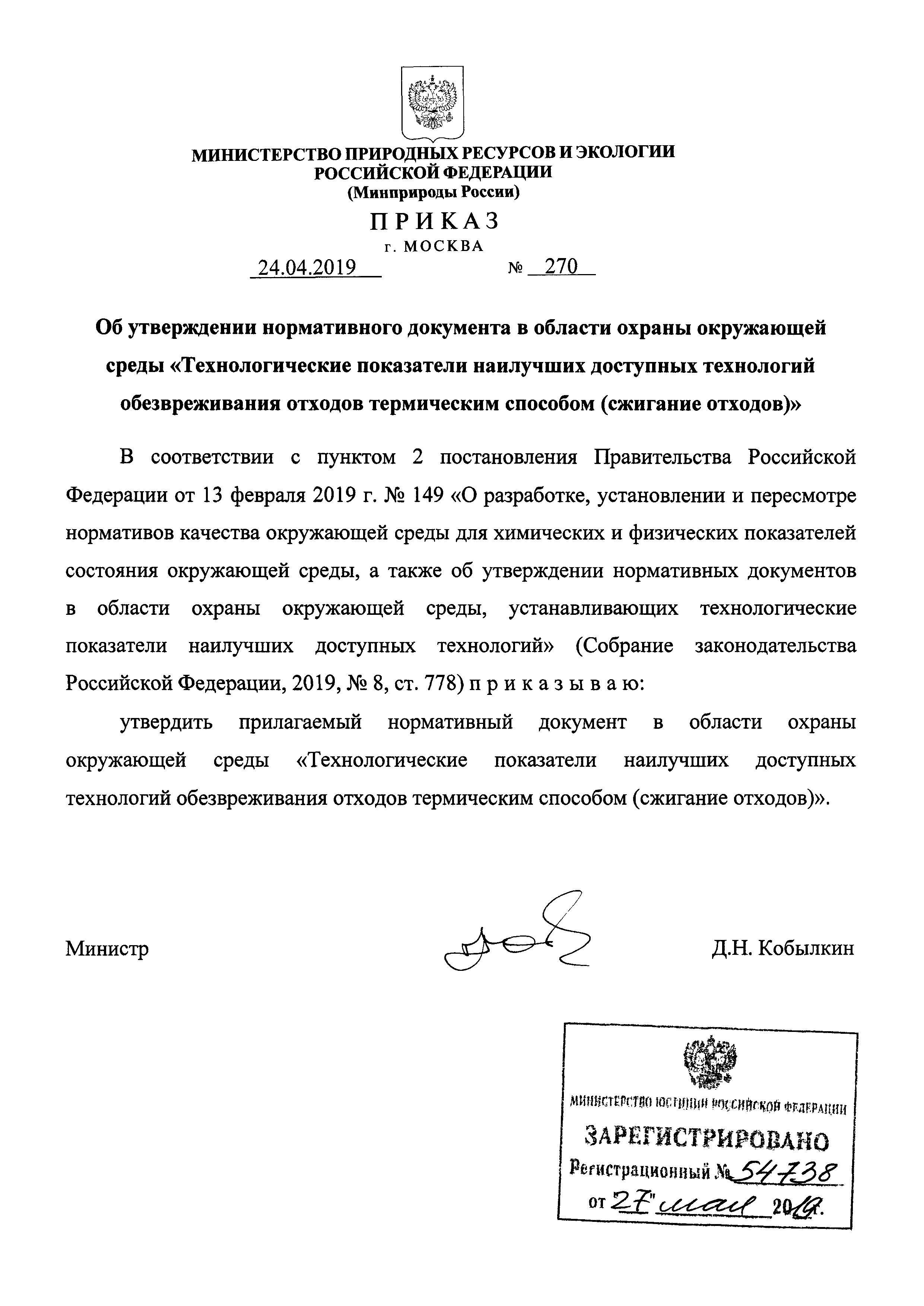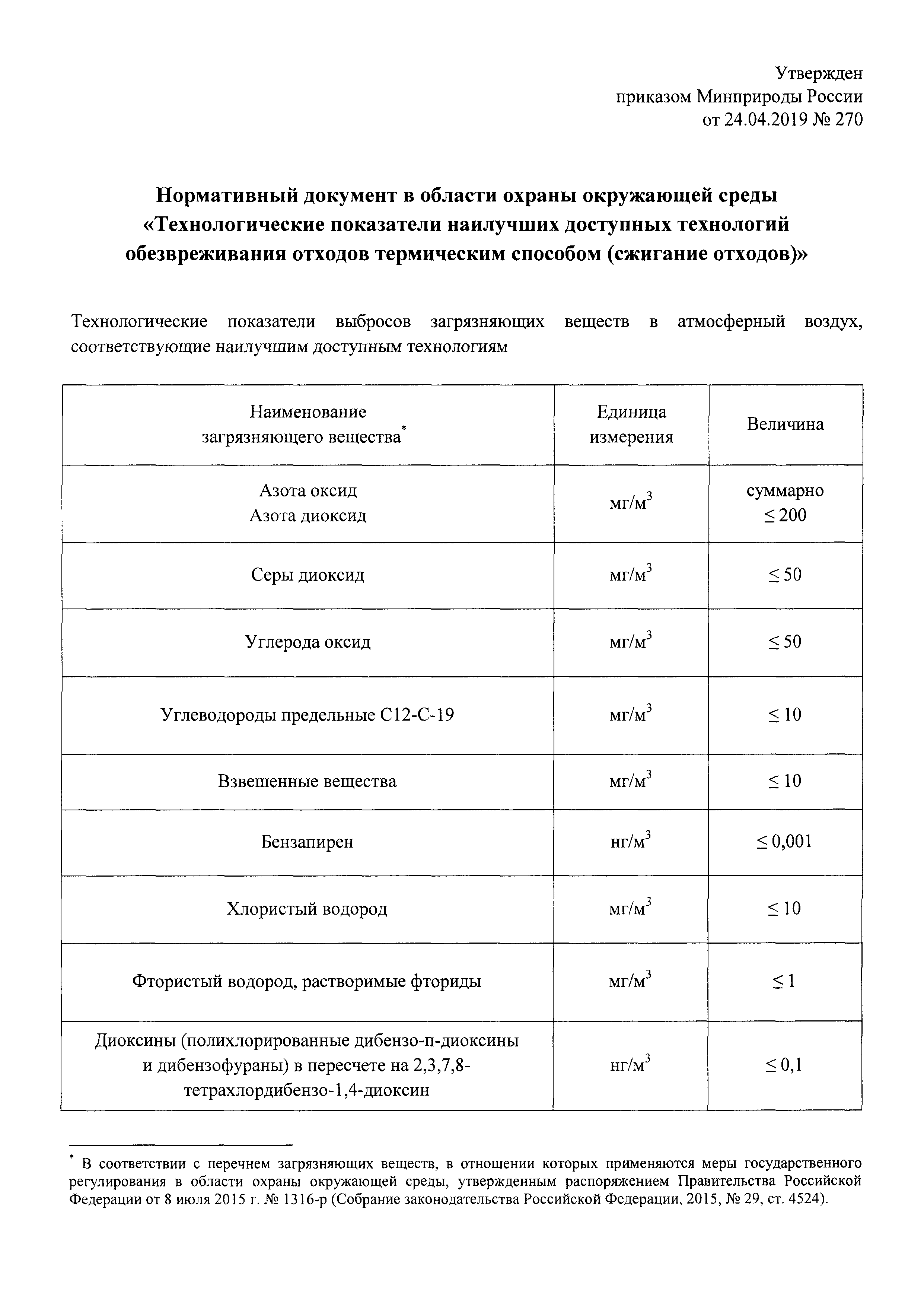 Нормативный документ в области охраны окружающей среды "Технологические показатели наилучших доступных технологий обезвреживания отходов термическим способом (сжигание отходов)"| Статус: | действует | | Название рус.: | Нормативный документ в области охраны окружающей среды "Технологические показатели наилучших доступных технологий обезвреживания отходов термическим способом (сжигание отходов)" | | Дата добавления в базу: | 01.02.2020 | | Дата актуализации: | 01.01.2021 | | Дата введения: | 09.06.2019 | | Утверждён: | 24.04.2019 Министерство природных ресурсов и экологии Российской Федерации (270)