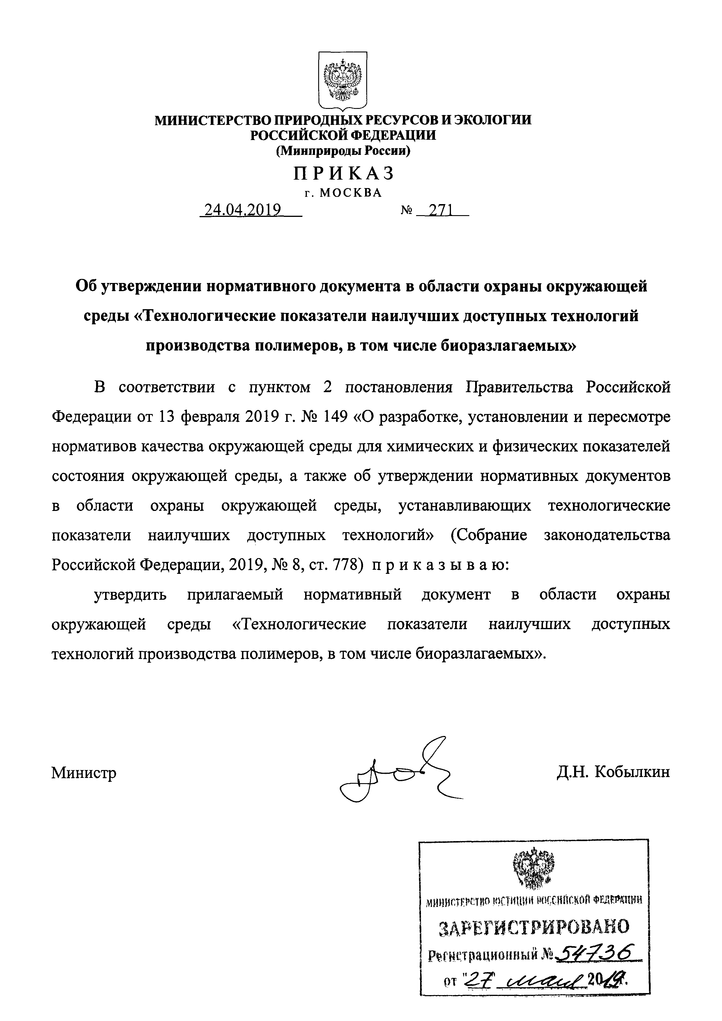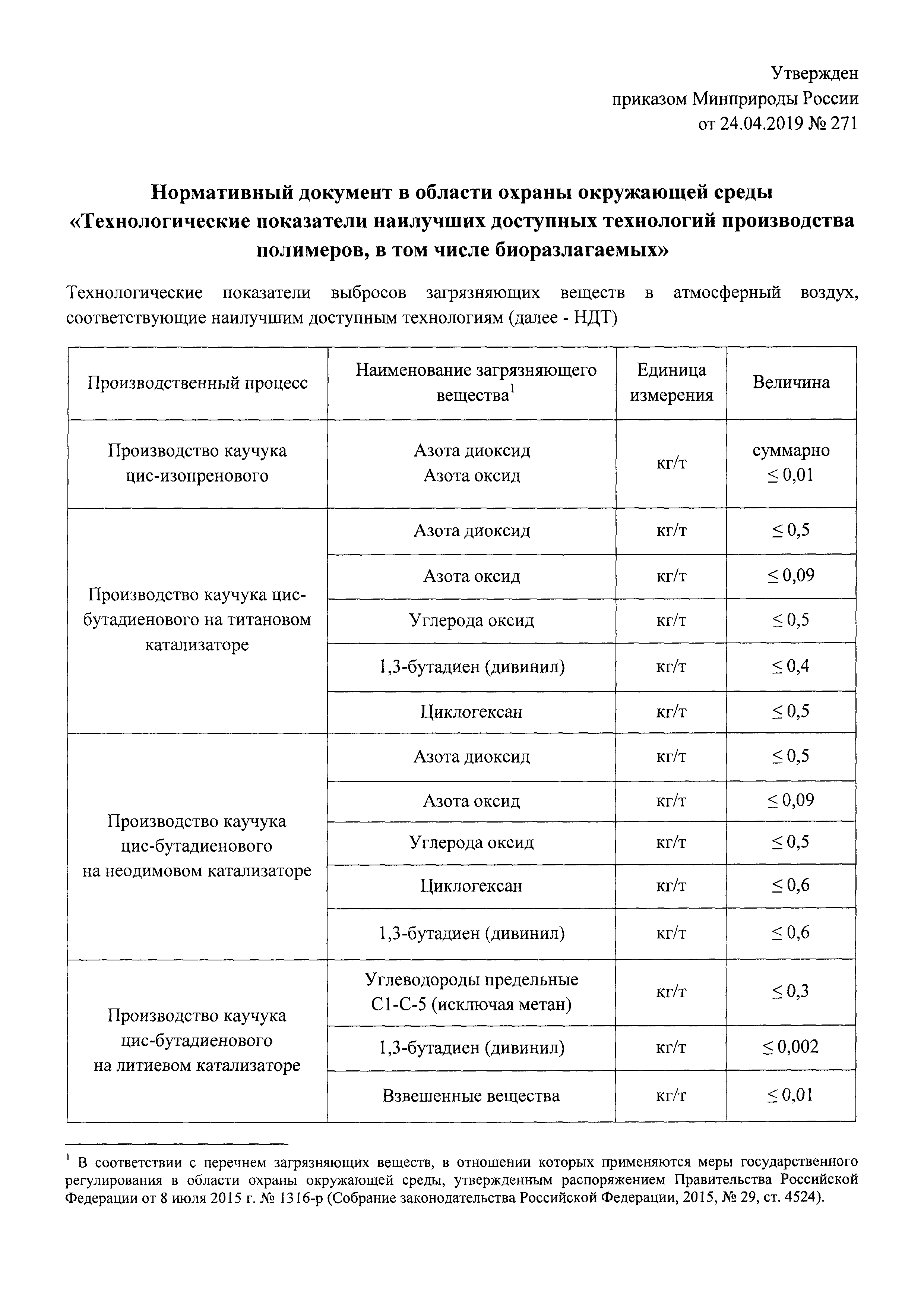 Нормативный документ в области охраны окружающей среды "Технологические показатели наилучших доступных технологий производства полимеров, в том числе биоразлагаемых"| Статус: | действует | | Название рус.: | Нормативный документ в области охраны окружающей среды "Технологические показатели наилучших доступных технологий производства полимеров, в том числе биоразлагаемых" | | Дата добавления в базу: | 01.02.2020 | | Дата актуализации: | 01.01.2021 | | Дата введения: | 08.06.2019 | | Утверждён: | 24.04.2019 Министерство природных ресурсов и экологии Российской Федерации (271)