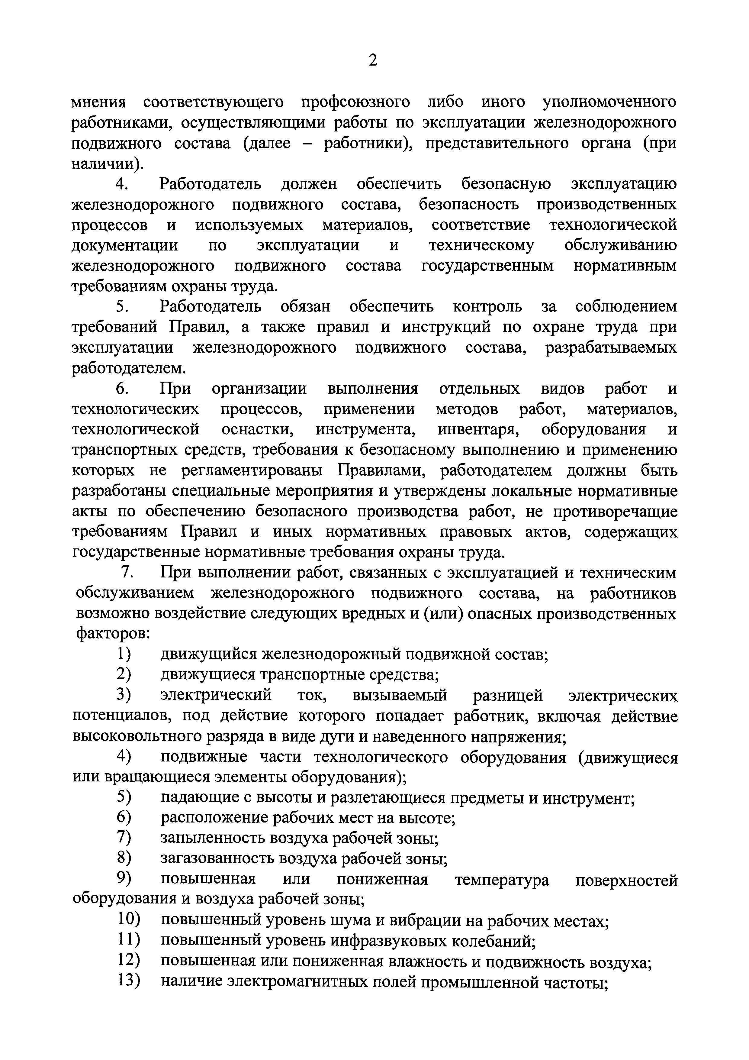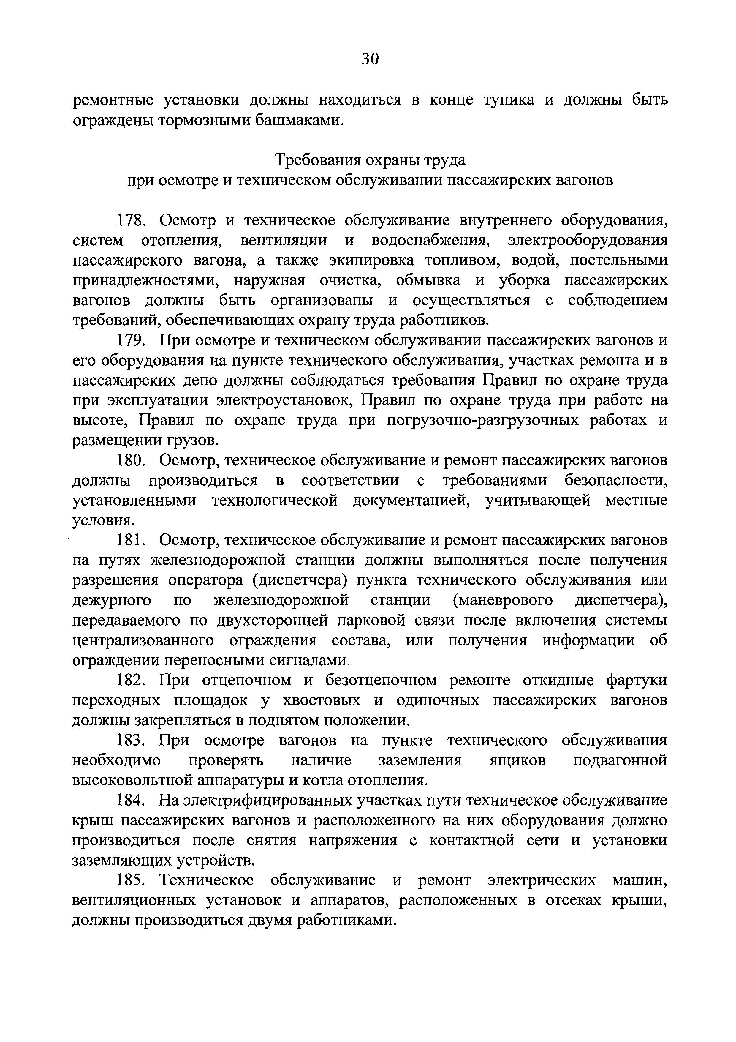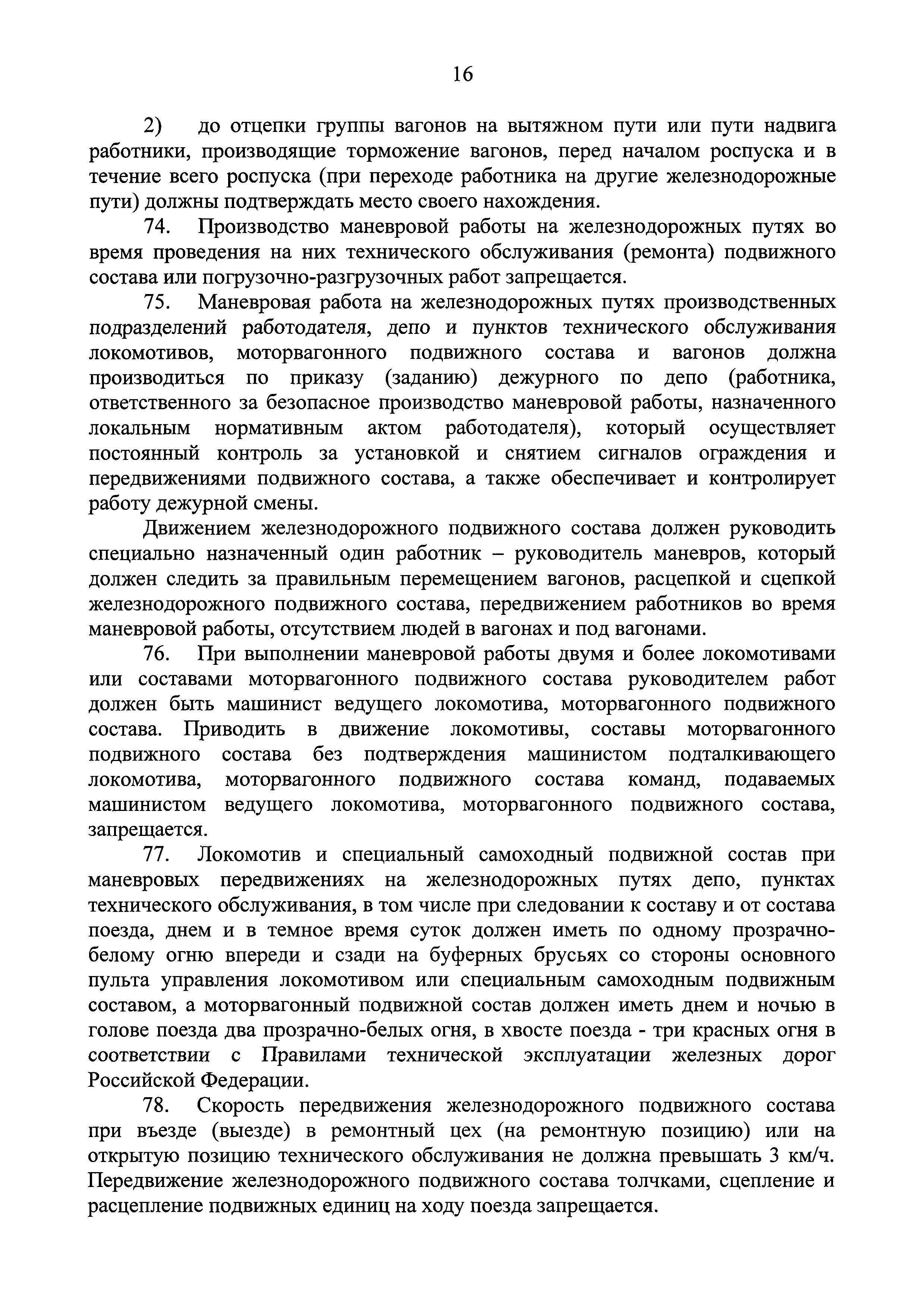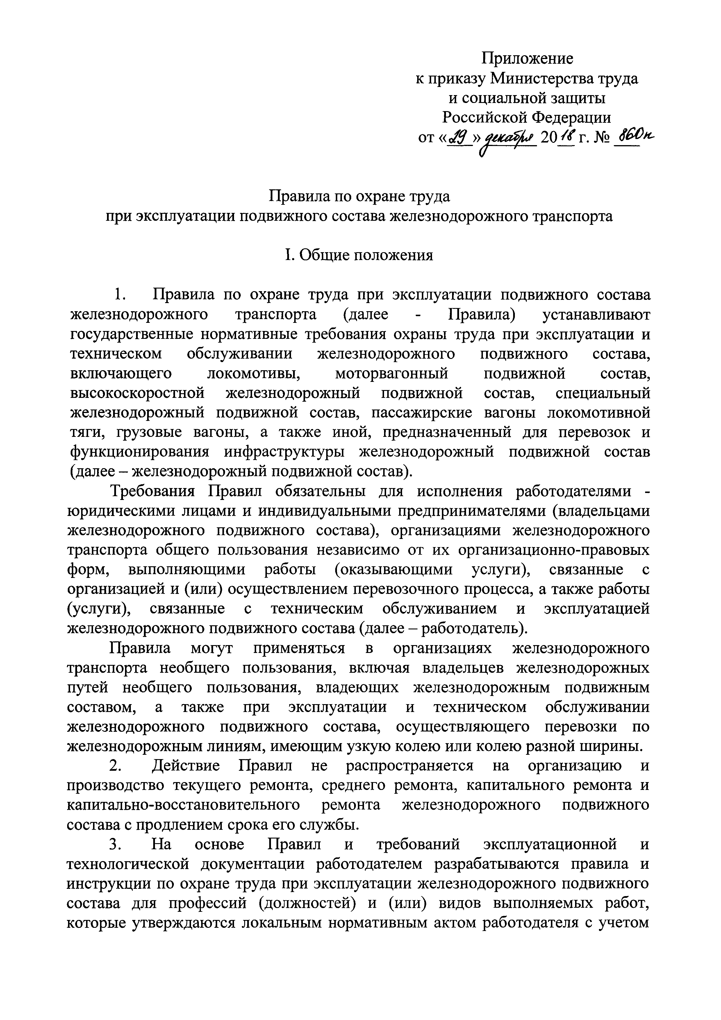 Действие Правил не распространяется на организацию и производство текущего ремонта, среднего ремонта, капитального ремонта и капитально-восстановительного ремонта железнодорожного подвижного состава с продлением срока его службы. | | Оглавление: | I Общие положения II Требования охраны труда при организации производственных процессов III Требования охраны труда, предъявляемые к производственным территориям и организации рабочих мест IV Требования охраны труда при техническом обслуживании и эксплуатации железнодорожного подвижного состава Общие требования Требования охраны труда при производстве маневровой работы на железнодорожных путях Требования охраны труда при техническом обслуживании экипажной части, кузова, автосцепного устройства, автотормозного оборудования железнодорожного подвижного состава Требования охраны труда при техническом обслуживании тепловоза, дизельного мотоорвагонного подвижного состава, специального самоходного подвижного состава, электровоза, электропоезда Требования охраны труда при осмотре и техническом обслуживании грузовых вагонов Требования охраны труда при осмотре и техническом обслуживании пассажирских вагонов Требования охраны труда при экипировке и мойке локомотивов, моторвагонного подвижного состава и специального самоходного подвижного состава Требования охраны труда при эксплуатации локомотивов и моторвагонного подвижного состава Требования охраны труда при эксплуатации специального железнодорожного подвижного состава Требования охраны труда при эксплуатации пассажирских вагонов Требования охраны труда при коммерческом осмотре поездов, вагонов и устранении коммерческих неисправностей V Требования охраны труда, предъявляемые к хранению и транспортированию материалов и отходов производства VI Заключительные положения | | Утверждён: | 29.12.2018 Министерство труда и социальной защиты РФ (860н)