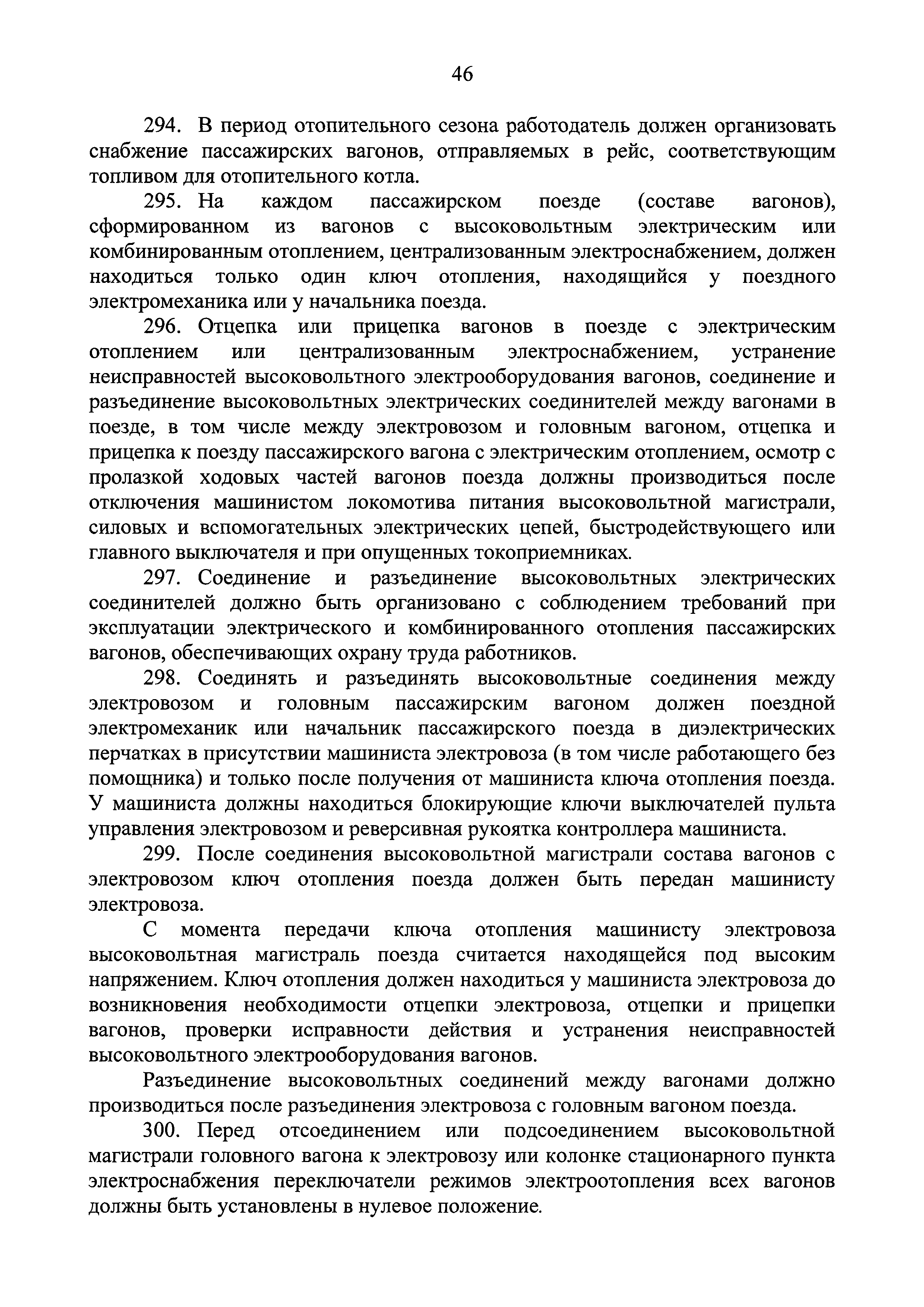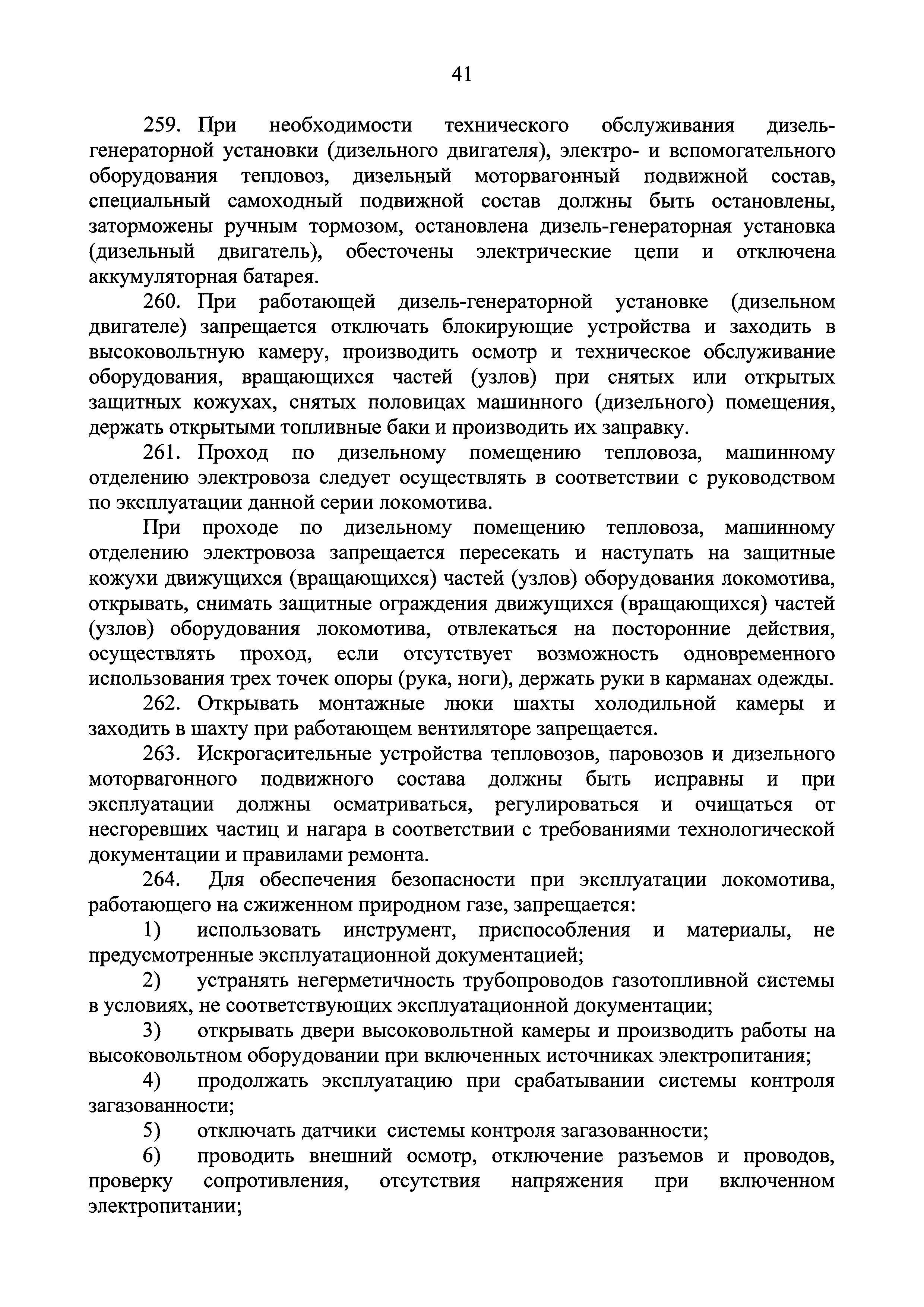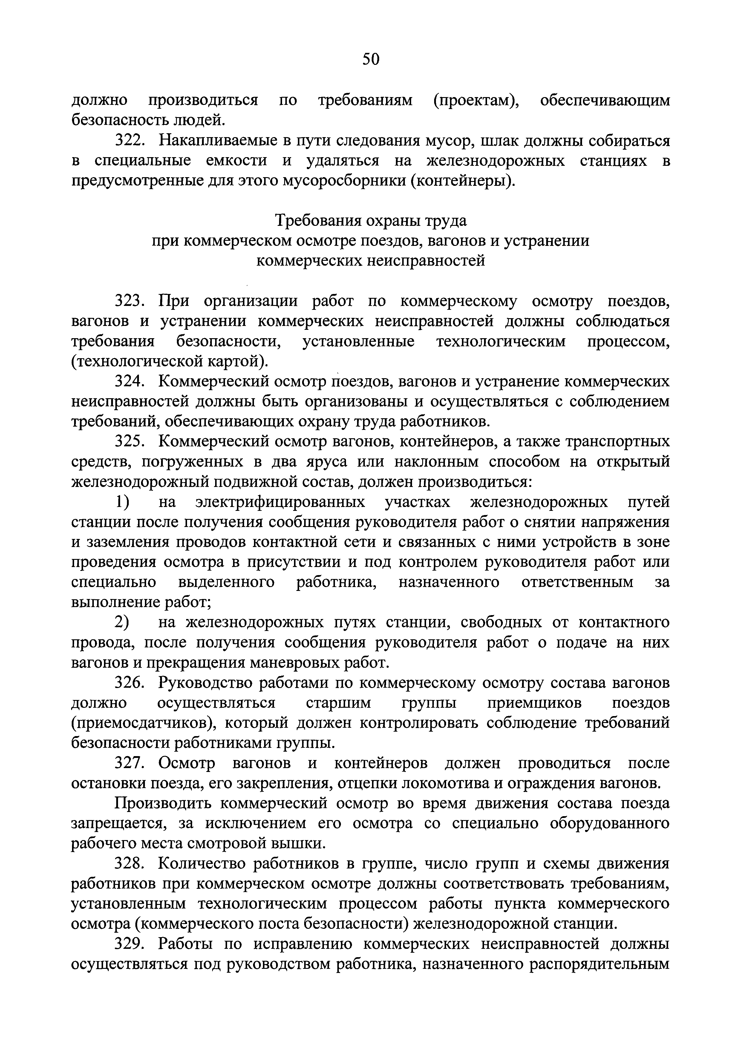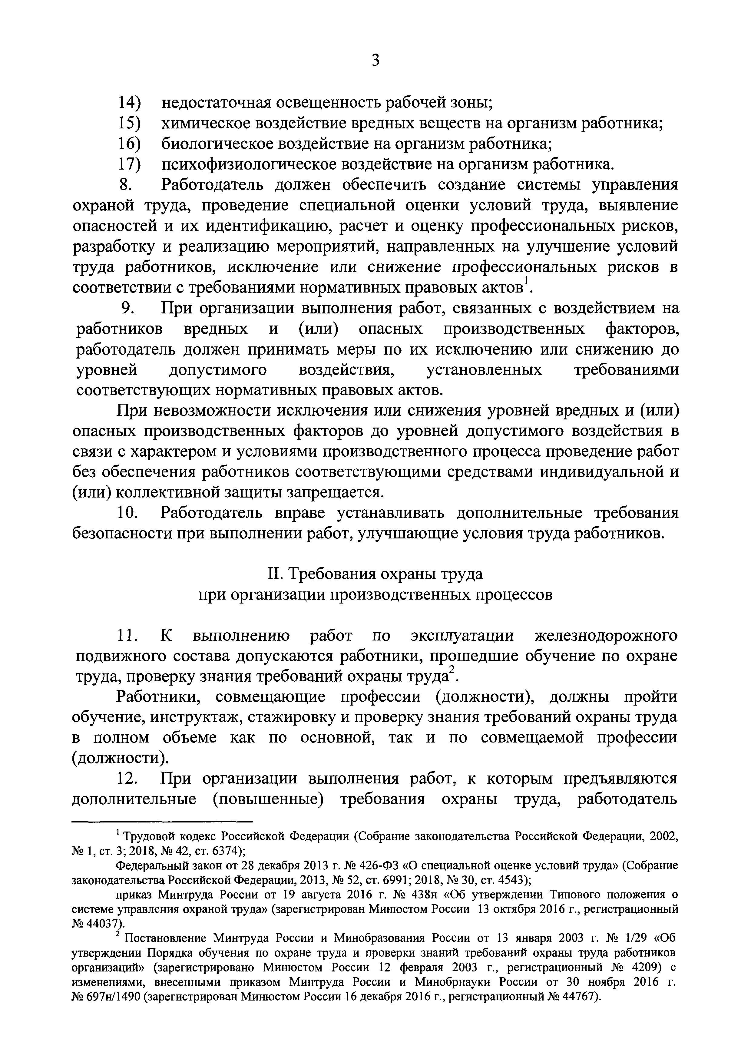 Действие Правил не распространяется на организацию и производство текущего ремонта, среднего ремонта, капитального ремонта и капитально-восстановительного ремонта железнодорожного подвижного состава с продлением срока его службы. | | Оглавление: | I Общие положения II Требования охраны труда при организации производственных процессов III Требования охраны труда, предъявляемые к производственным территориям и организации рабочих мест IV Требования охраны труда при техническом обслуживании и эксплуатации железнодорожного подвижного состава Общие требования Требования охраны труда при производстве маневровой работы на железнодорожных путях Требования охраны труда при техническом обслуживании экипажной части, кузова, автосцепного устройства, автотормозного оборудования железнодорожного подвижного состава Требования охраны труда при техническом обслуживании тепловоза, дизельного мотоорвагонного подвижного состава, специального самоходного подвижного состава, электровоза, электропоезда Требования охраны труда при осмотре и техническом обслуживании грузовых вагонов Требования охраны труда при осмотре и техническом обслуживании пассажирских вагонов Требования охраны труда при экипировке и мойке локомотивов, моторвагонного подвижного состава и специального самоходного подвижного состава Требования охраны труда при эксплуатации локомотивов и моторвагонного подвижного состава Требования охраны труда при эксплуатации специального железнодорожного подвижного состава Требования охраны труда при эксплуатации пассажирских вагонов Требования охраны труда при коммерческом осмотре поездов, вагонов и устранении коммерческих неисправностей V Требования охраны труда, предъявляемые к хранению и транспортированию материалов и отходов производства VI Заключительные положения | | Утверждён: | 29.12.2018 Министерство труда и социальной защиты РФ (860н)