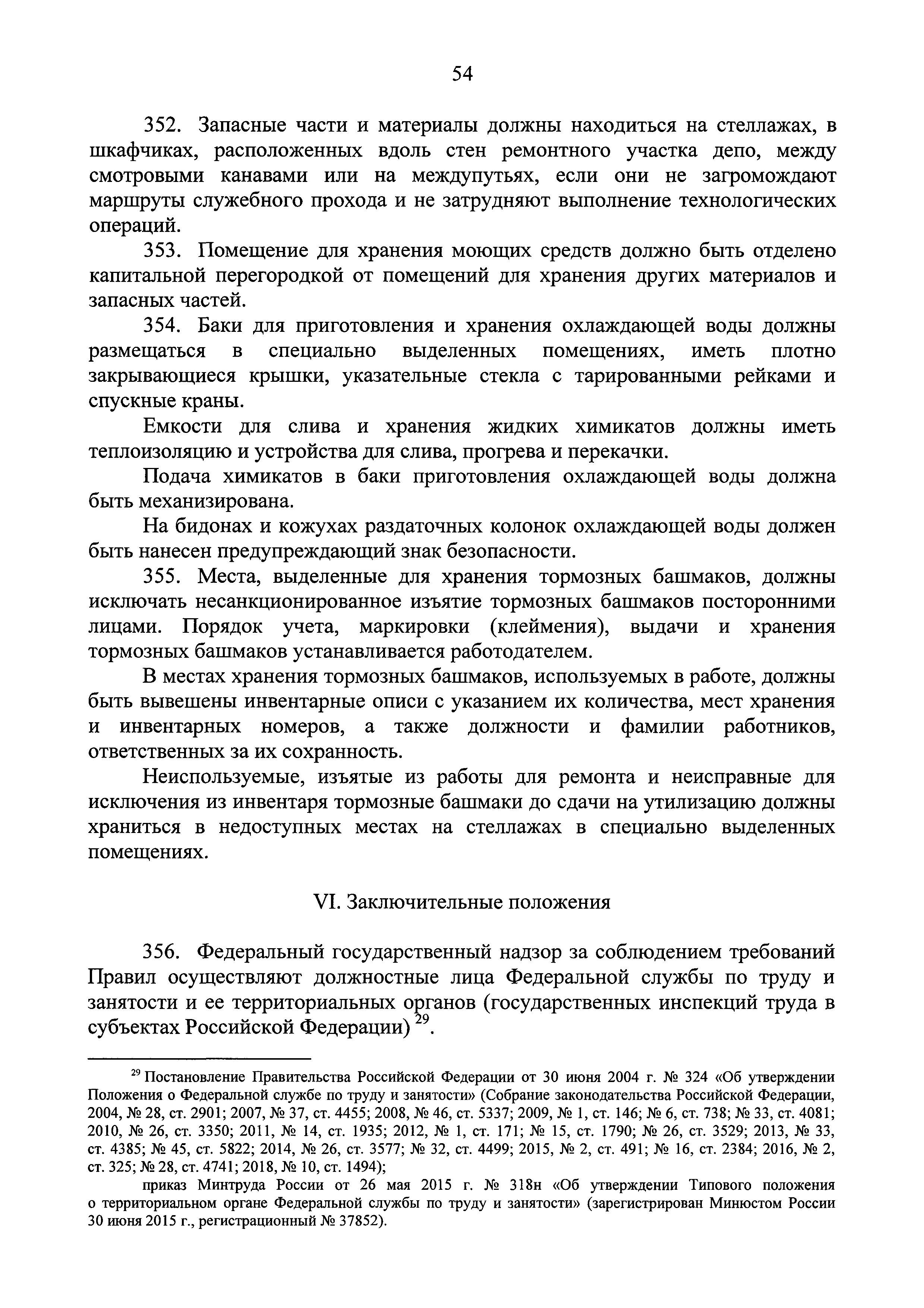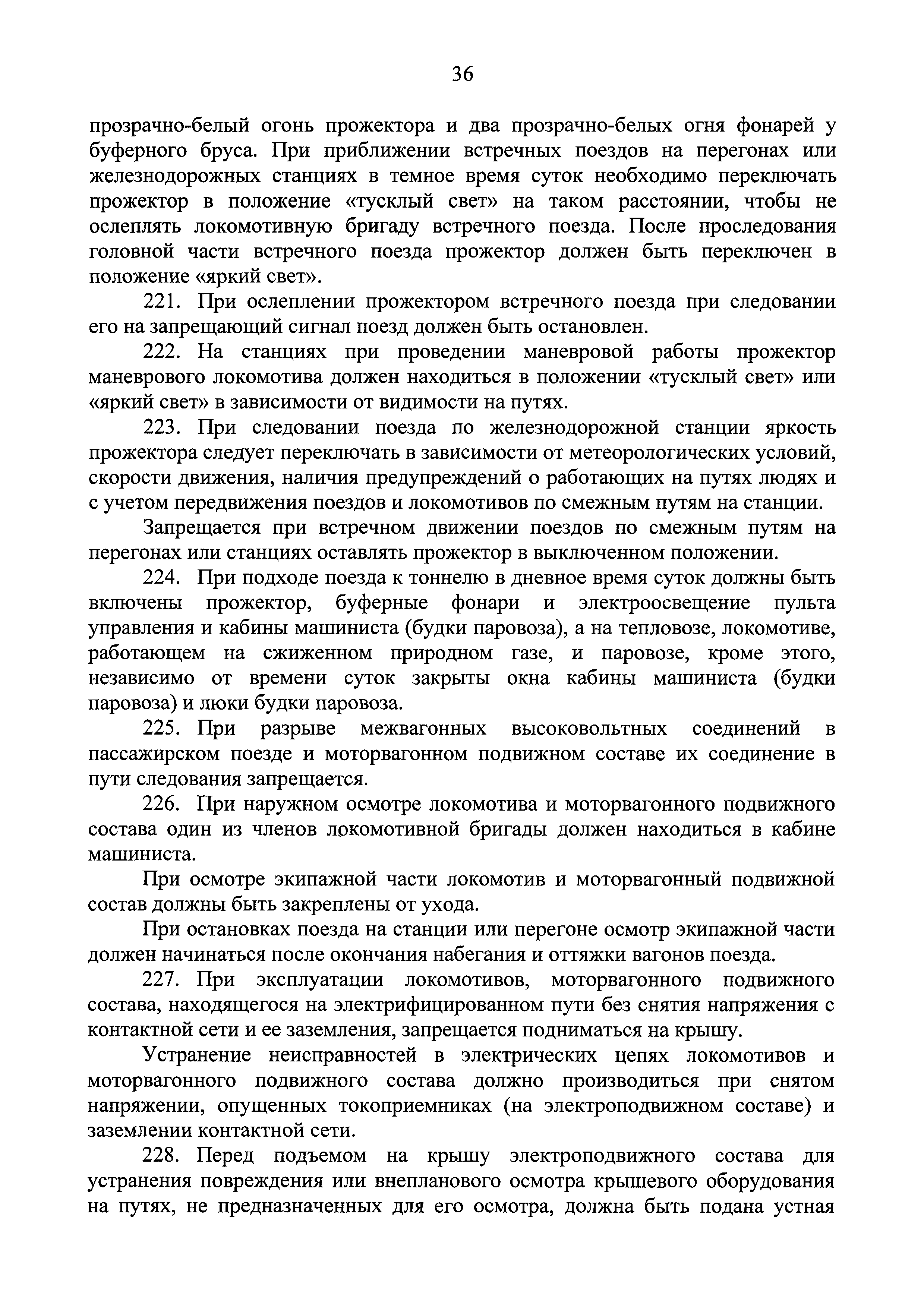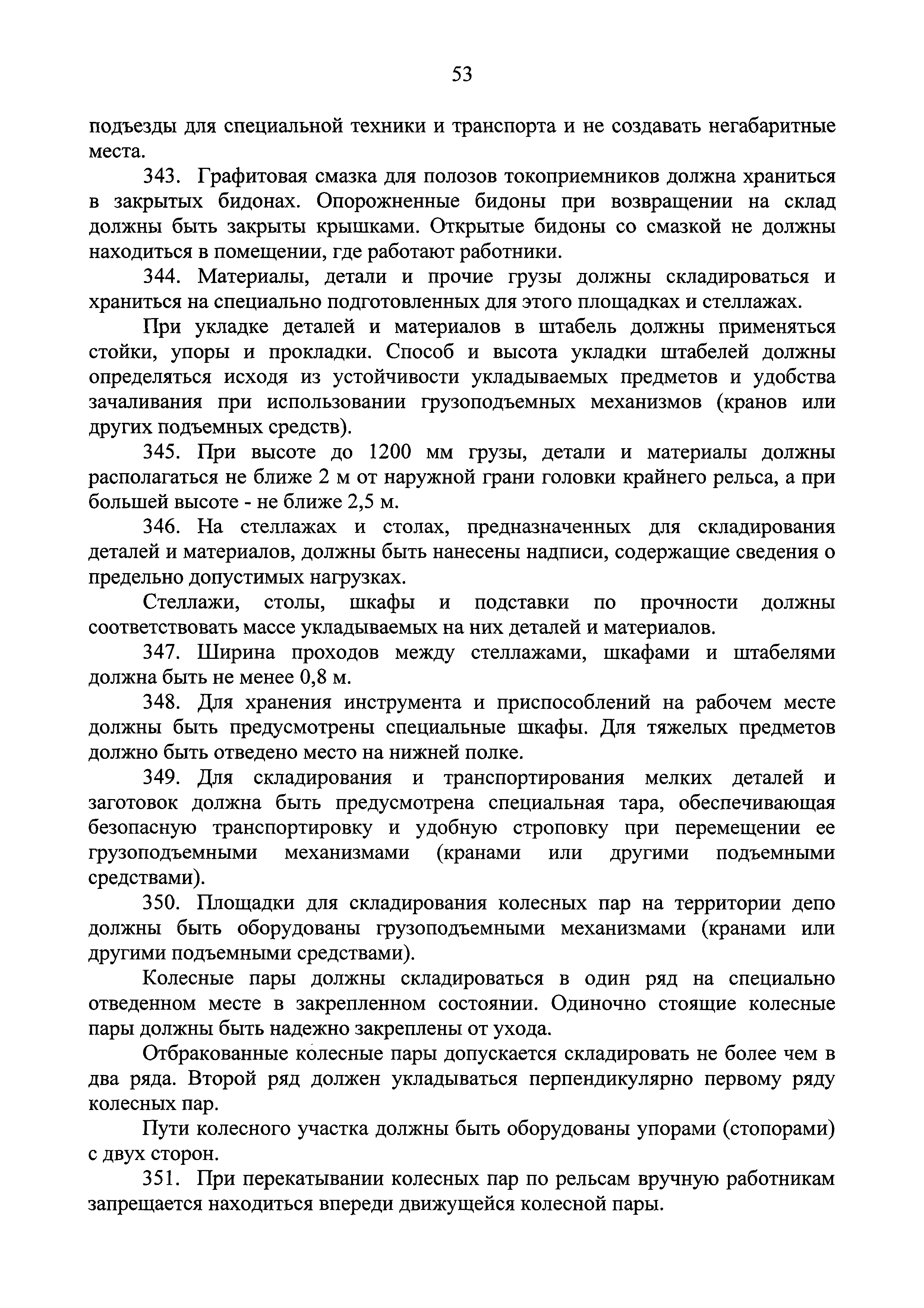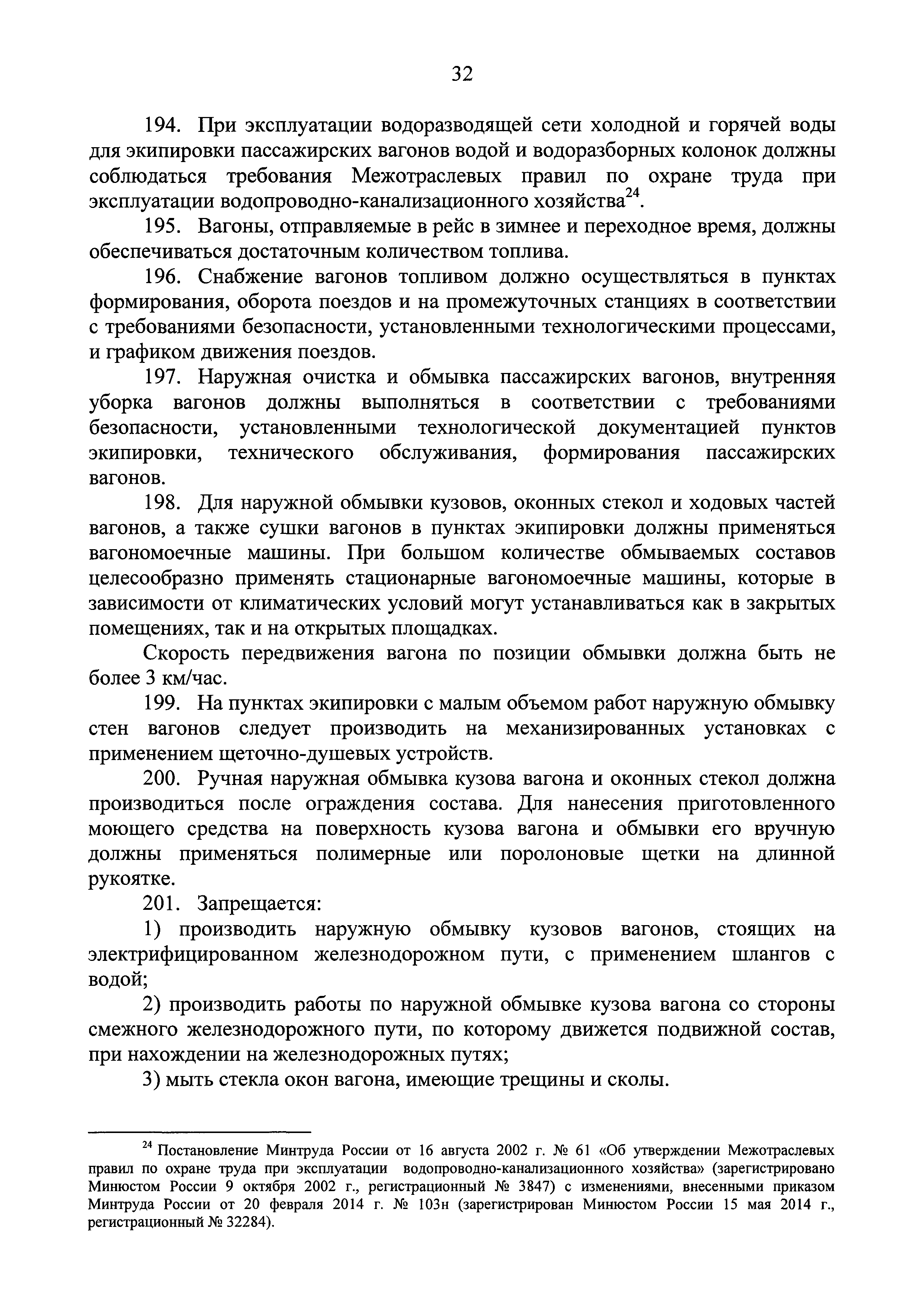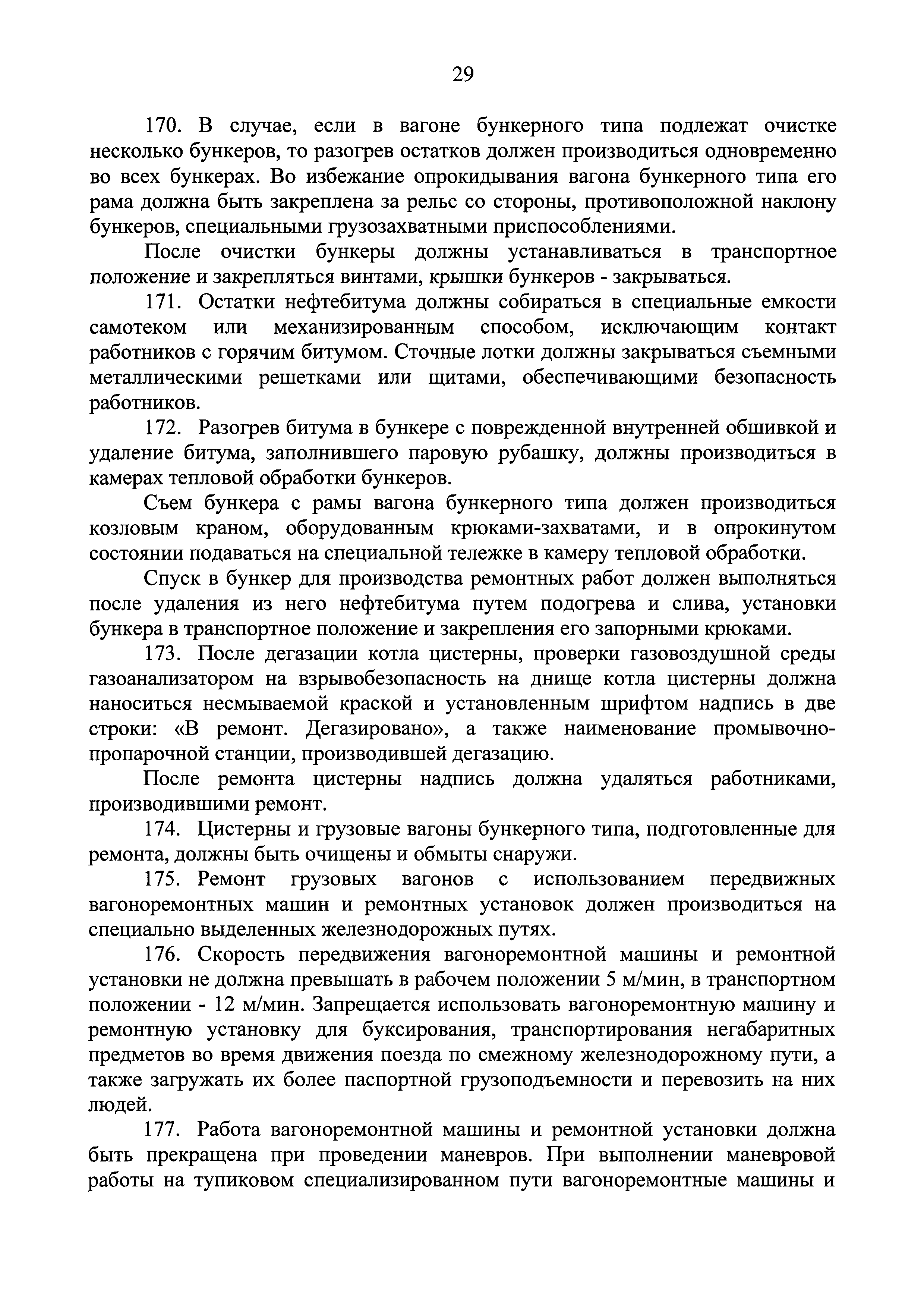 Действие Правил не распространяется на организацию и производство текущего ремонта, среднего ремонта, капитального ремонта и капитально-восстановительного ремонта железнодорожного подвижного состава с продлением срока его службы. | | Оглавление: | I Общие положения II Требования охраны труда при организации производственных процессов III Требования охраны труда, предъявляемые к производственным территориям и организации рабочих мест IV Требования охраны труда при техническом обслуживании и эксплуатации железнодорожного подвижного состава Общие требования Требования охраны труда при производстве маневровой работы на железнодорожных путях Требования охраны труда при техническом обслуживании экипажной части, кузова, автосцепного устройства, автотормозного оборудования железнодорожного подвижного состава Требования охраны труда при техническом обслуживании тепловоза, дизельного мотоорвагонного подвижного состава, специального самоходного подвижного состава, электровоза, электропоезда Требования охраны труда при осмотре и техническом обслуживании грузовых вагонов Требования охраны труда при осмотре и техническом обслуживании пассажирских вагонов Требования охраны труда при экипировке и мойке локомотивов, моторвагонного подвижного состава и специального самоходного подвижного состава Требования охраны труда при эксплуатации локомотивов и моторвагонного подвижного состава Требования охраны труда при эксплуатации специального железнодорожного подвижного состава Требования охраны труда при эксплуатации пассажирских вагонов Требования охраны труда при коммерческом осмотре поездов, вагонов и устранении коммерческих неисправностей V Требования охраны труда, предъявляемые к хранению и транспортированию материалов и отходов производства VI Заключительные положения | | Утверждён: | 29.12.2018 Министерство труда и социальной защиты РФ (860н)