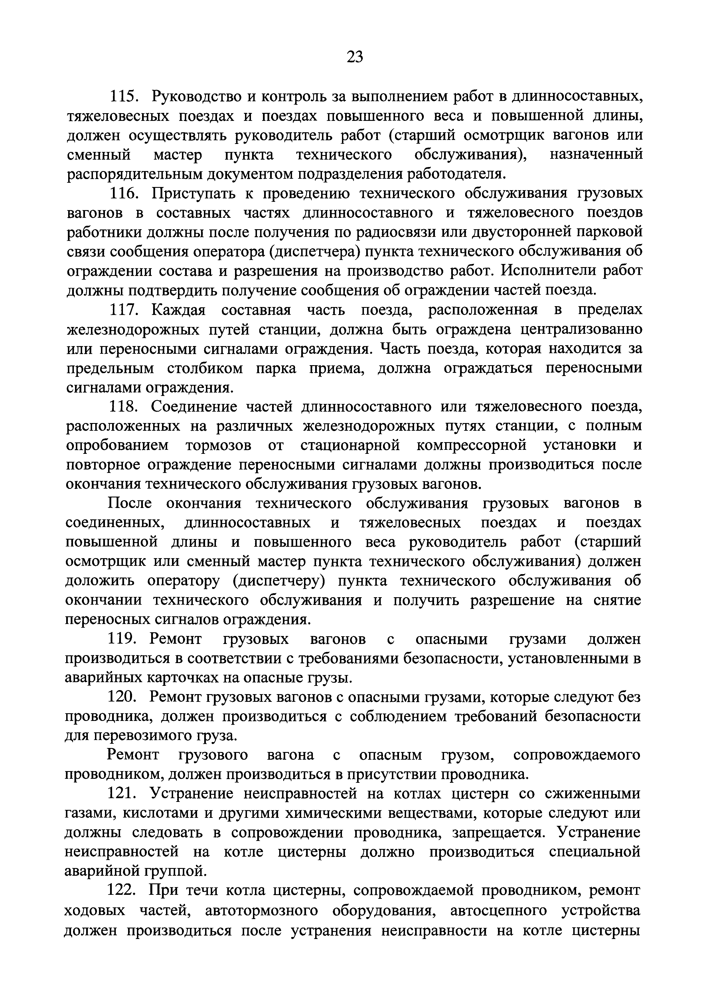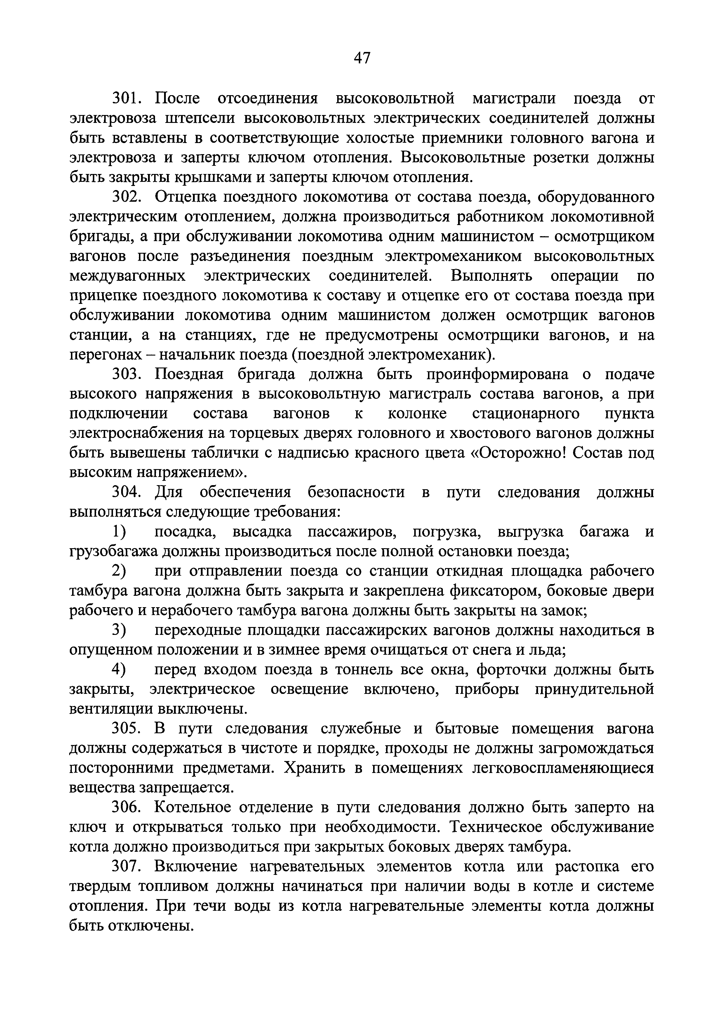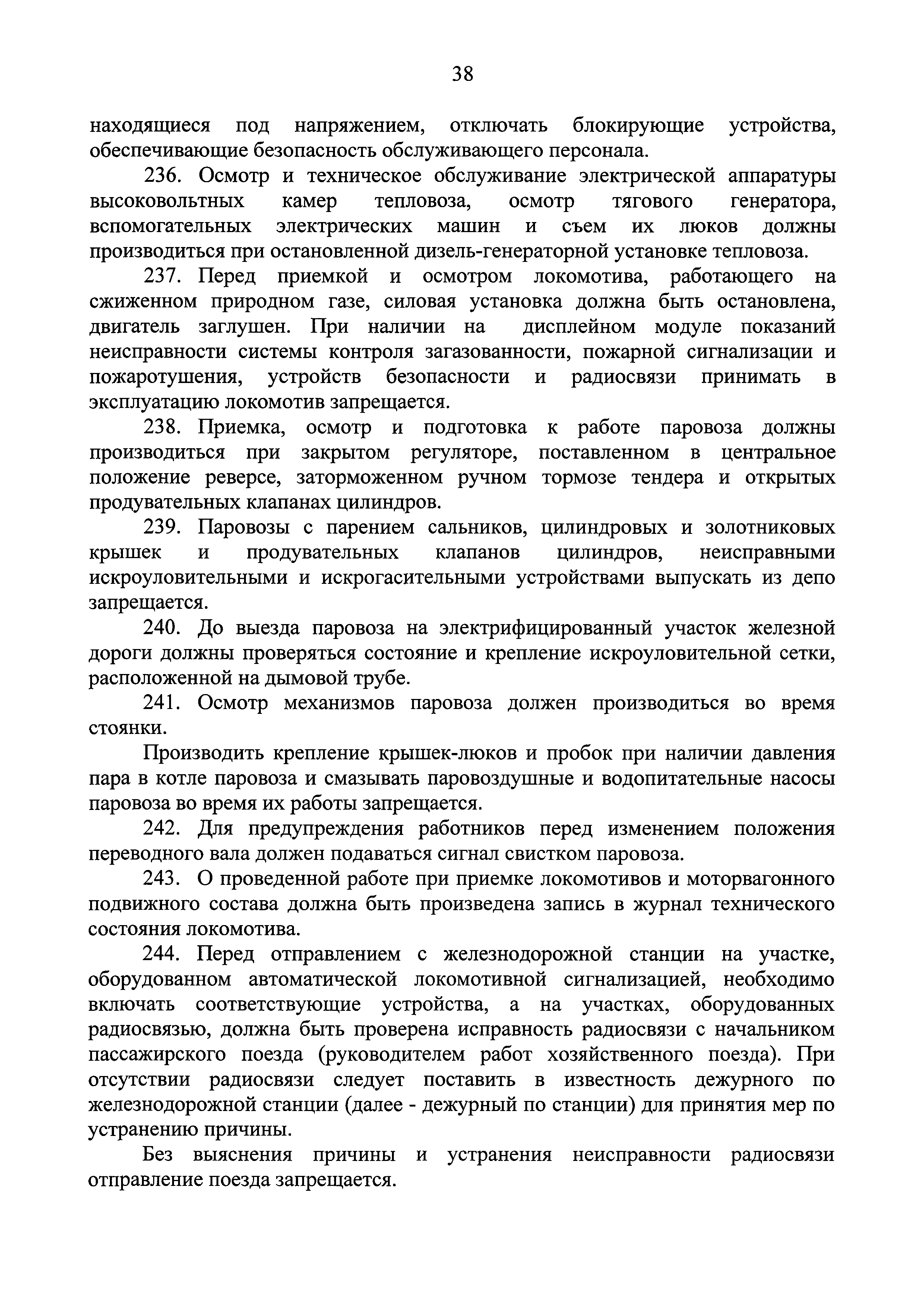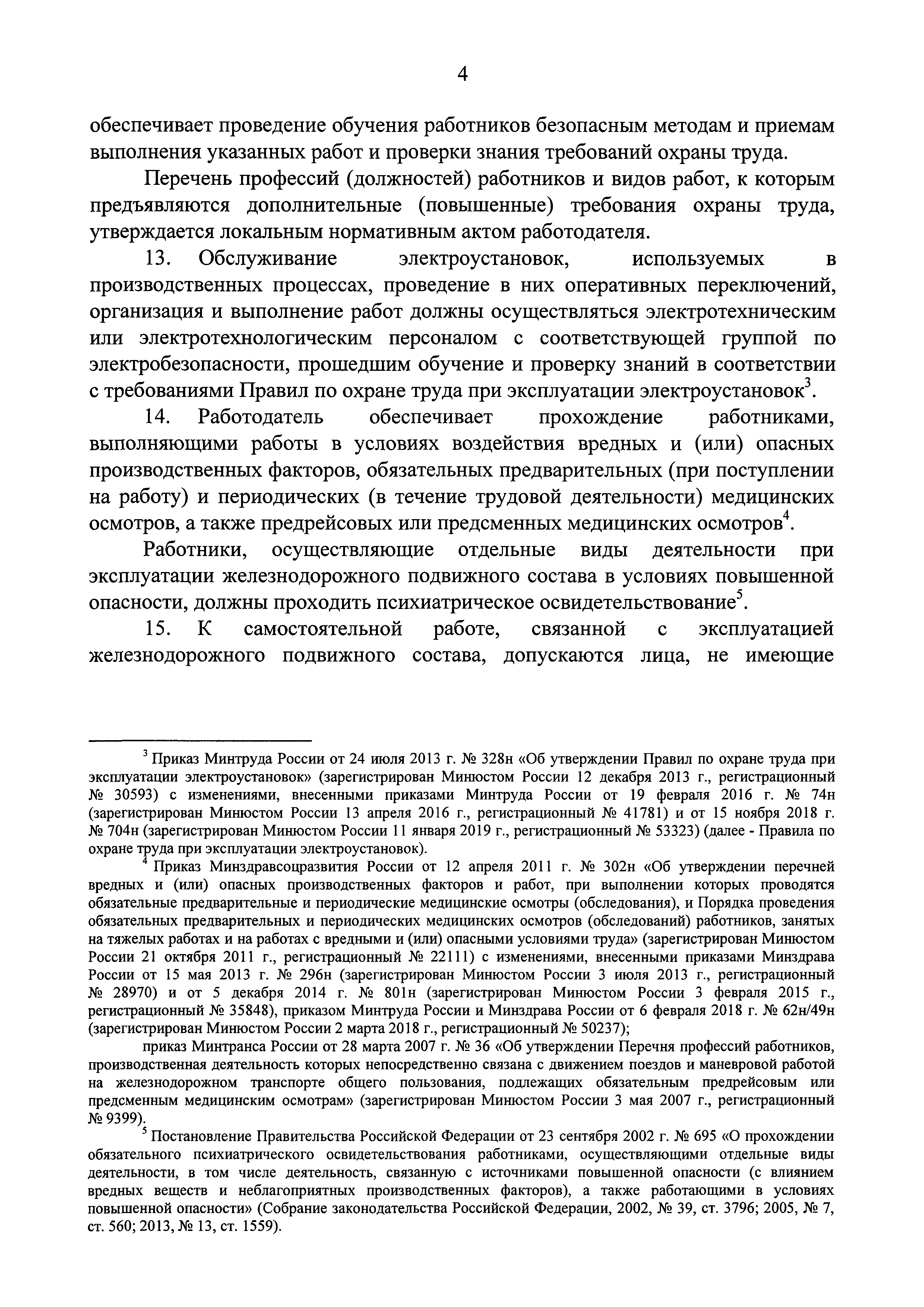 Действие Правил не распространяется на организацию и производство текущего ремонта, среднего ремонта, капитального ремонта и капитально-восстановительного ремонта железнодорожного подвижного состава с продлением срока его службы. | | Оглавление: | I Общие положения II Требования охраны труда при организации производственных процессов III Требования охраны труда, предъявляемые к производственным территориям и организации рабочих мест IV Требования охраны труда при техническом обслуживании и эксплуатации железнодорожного подвижного состава Общие требования Требования охраны труда при производстве маневровой работы на железнодорожных путях Требования охраны труда при техническом обслуживании экипажной части, кузова, автосцепного устройства, автотормозного оборудования железнодорожного подвижного состава Требования охраны труда при техническом обслуживании тепловоза, дизельного мотоорвагонного подвижного состава, специального самоходного подвижного состава, электровоза, электропоезда Требования охраны труда при осмотре и техническом обслуживании грузовых вагонов Требования охраны труда при осмотре и техническом обслуживании пассажирских вагонов Требования охраны труда при экипировке и мойке локомотивов, моторвагонного подвижного состава и специального самоходного подвижного состава Требования охраны труда при эксплуатации локомотивов и моторвагонного подвижного состава Требования охраны труда при эксплуатации специального железнодорожного подвижного состава Требования охраны труда при эксплуатации пассажирских вагонов Требования охраны труда при коммерческом осмотре поездов, вагонов и устранении коммерческих неисправностей V Требования охраны труда, предъявляемые к хранению и транспортированию материалов и отходов производства VI Заключительные положения | | Утверждён: | 29.12.2018 Министерство труда и социальной защиты РФ (860н)