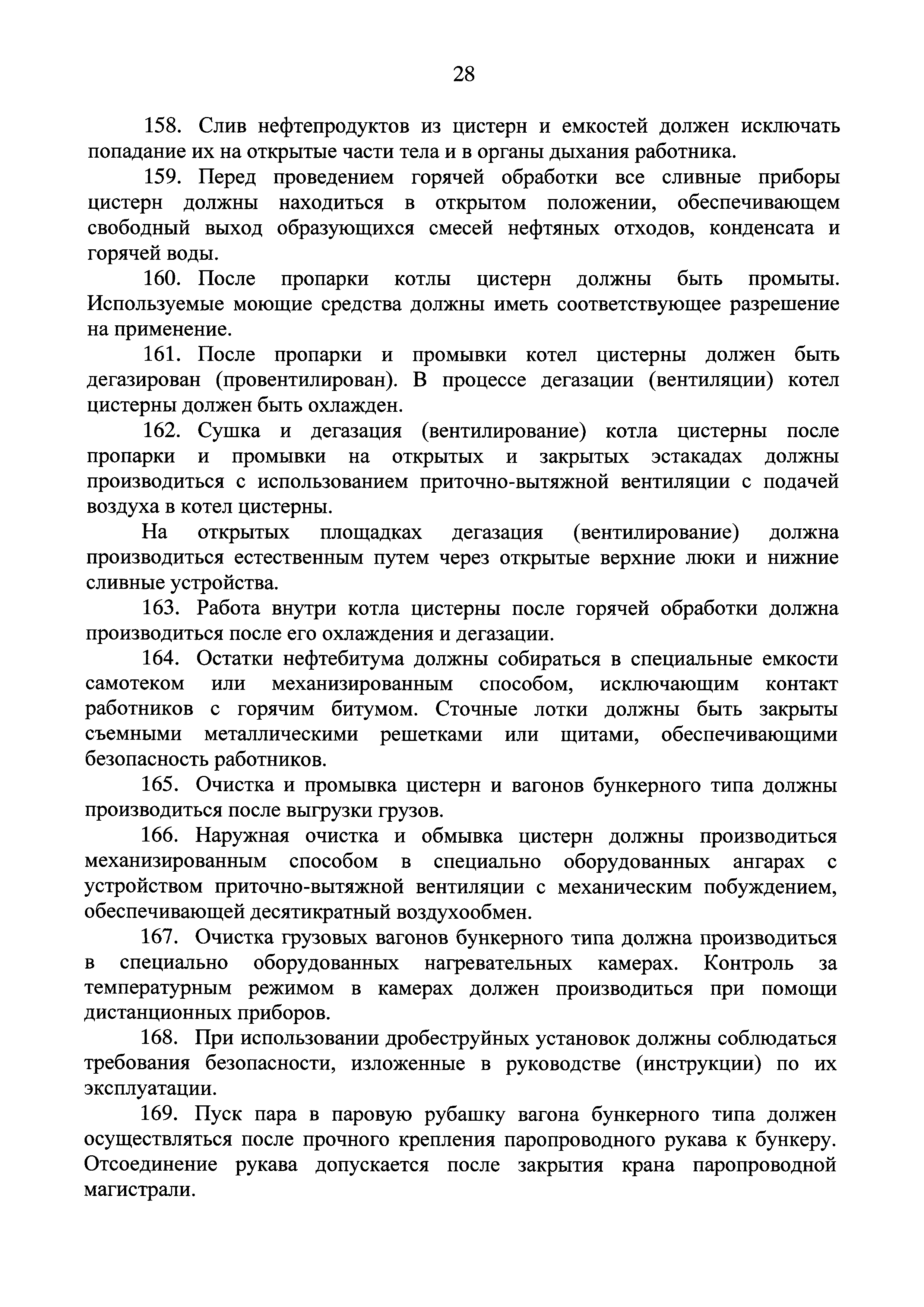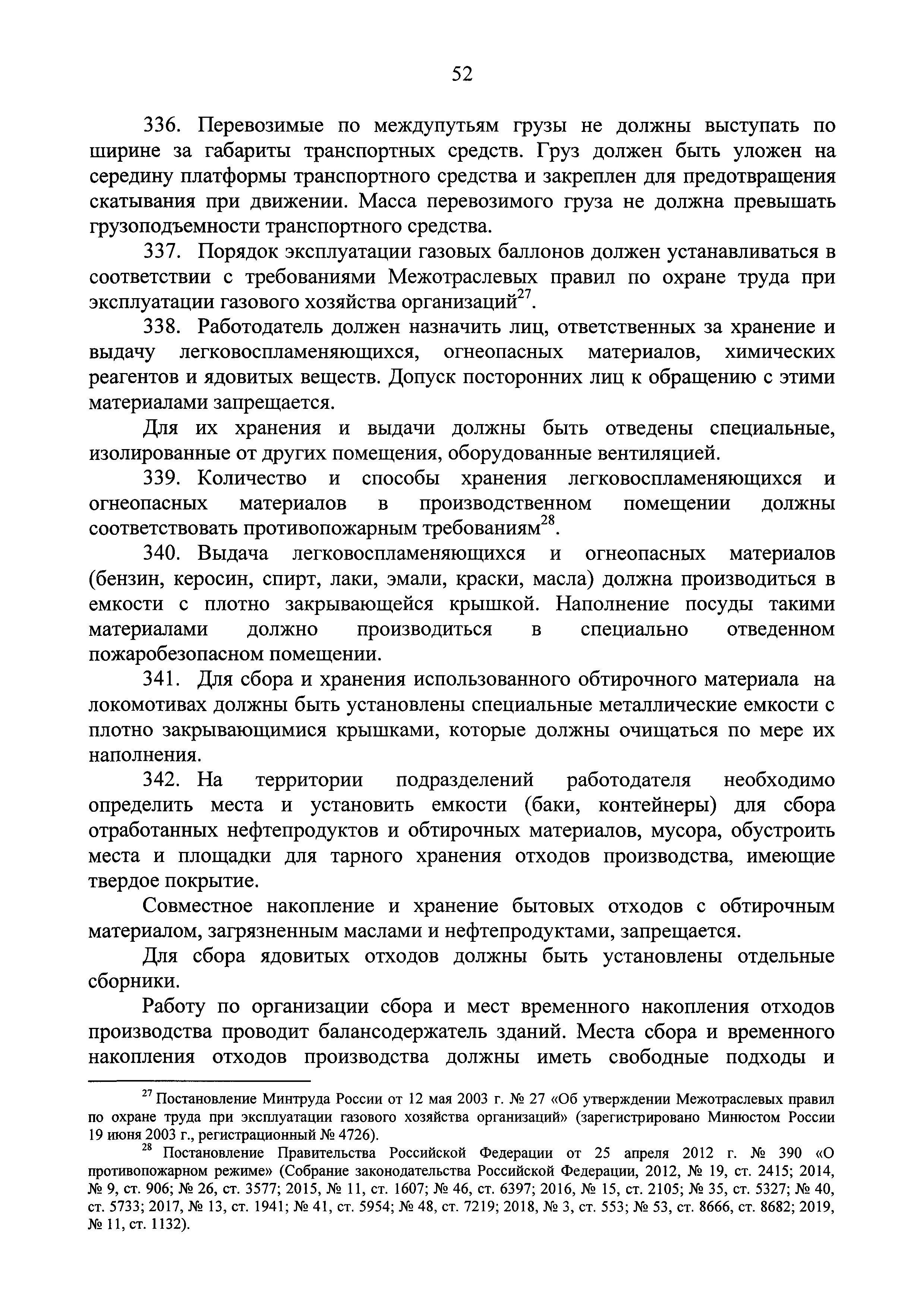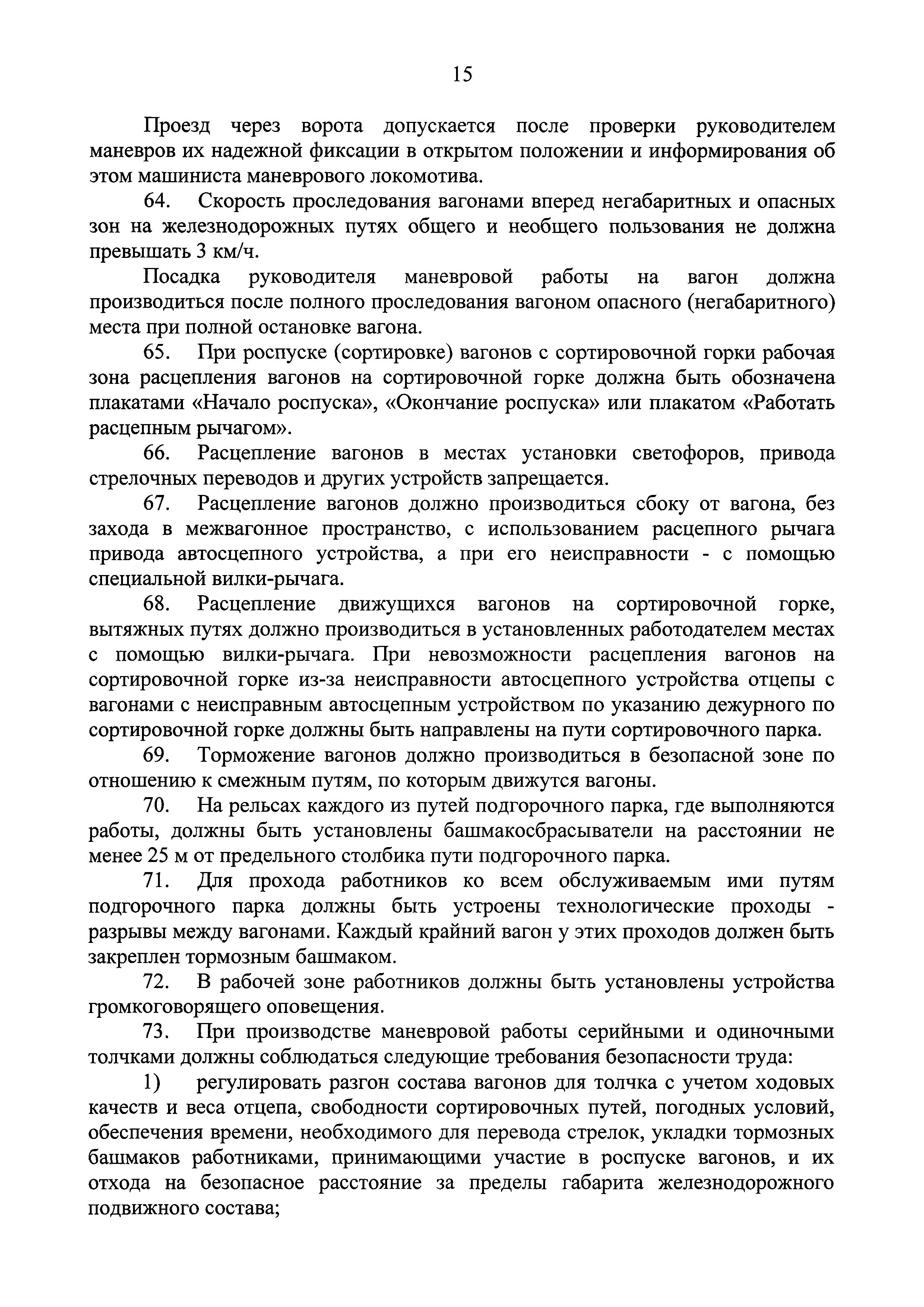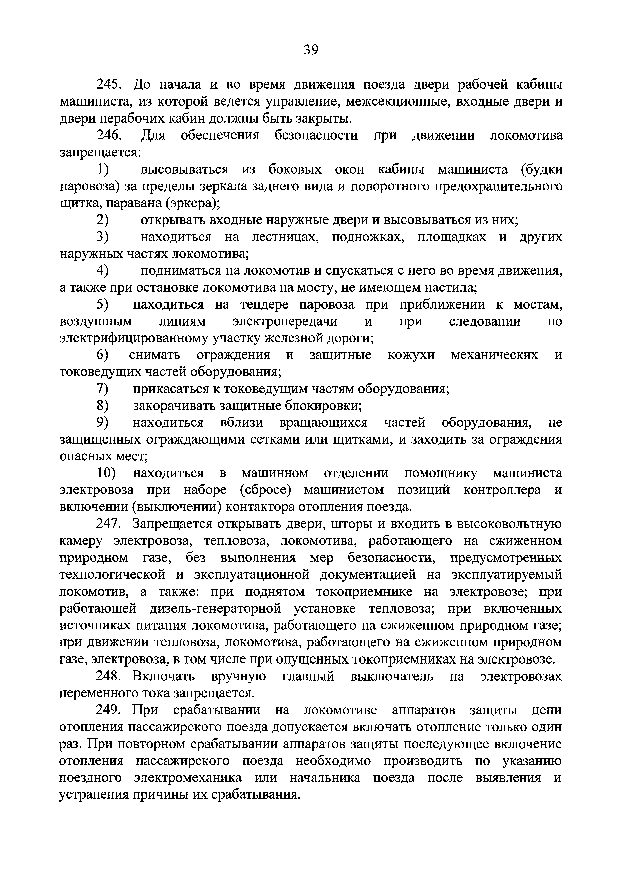 Действие Правил не распространяется на организацию и производство текущего ремонта, среднего ремонта, капитального ремонта и капитально-восстановительного ремонта железнодорожного подвижного состава с продлением срока его службы. | | Оглавление: | I Общие положения II Требования охраны труда при организации производственных процессов III Требования охраны труда, предъявляемые к производственным территориям и организации рабочих мест IV Требования охраны труда при техническом обслуживании и эксплуатации железнодорожного подвижного состава Общие требования Требования охраны труда при производстве маневровой работы на железнодорожных путях Требования охраны труда при техническом обслуживании экипажной части, кузова, автосцепного устройства, автотормозного оборудования железнодорожного подвижного состава Требования охраны труда при техническом обслуживании тепловоза, дизельного мотоорвагонного подвижного состава, специального самоходного подвижного состава, электровоза, электропоезда Требования охраны труда при осмотре и техническом обслуживании грузовых вагонов Требования охраны труда при осмотре и техническом обслуживании пассажирских вагонов Требования охраны труда при экипировке и мойке локомотивов, моторвагонного подвижного состава и специального самоходного подвижного состава Требования охраны труда при эксплуатации локомотивов и моторвагонного подвижного состава Требования охраны труда при эксплуатации специального железнодорожного подвижного состава Требования охраны труда при эксплуатации пассажирских вагонов Требования охраны труда при коммерческом осмотре поездов, вагонов и устранении коммерческих неисправностей V Требования охраны труда, предъявляемые к хранению и транспортированию материалов и отходов производства VI Заключительные положения | | Утверждён: | 29.12.2018 Министерство труда и социальной защиты РФ (860н)