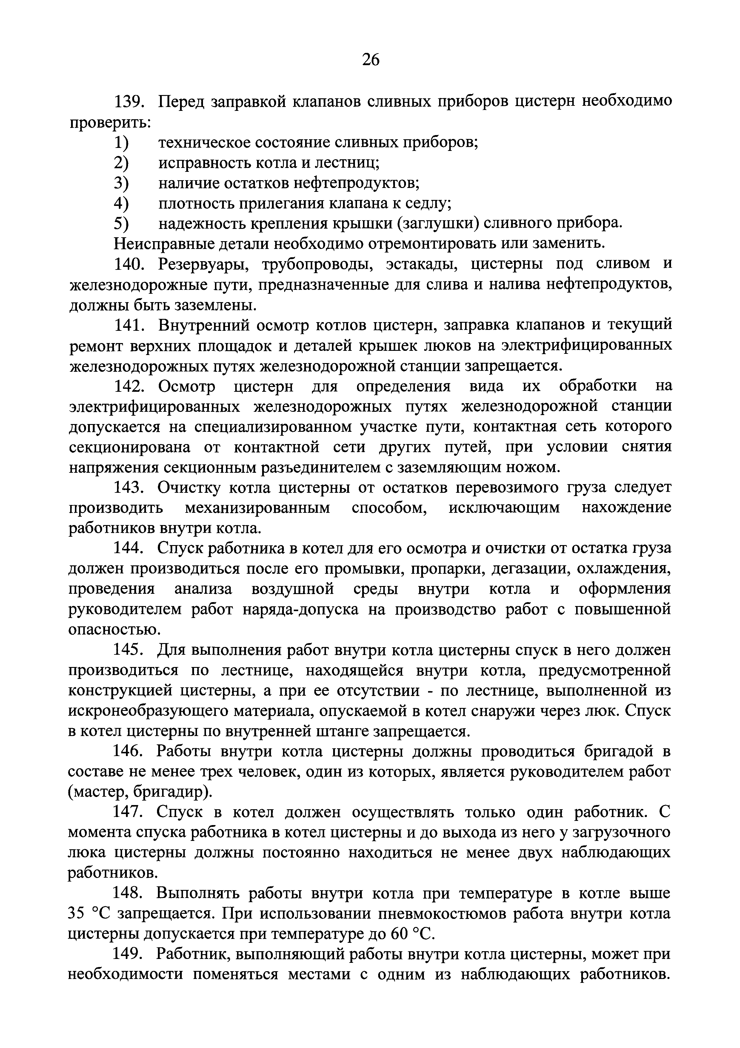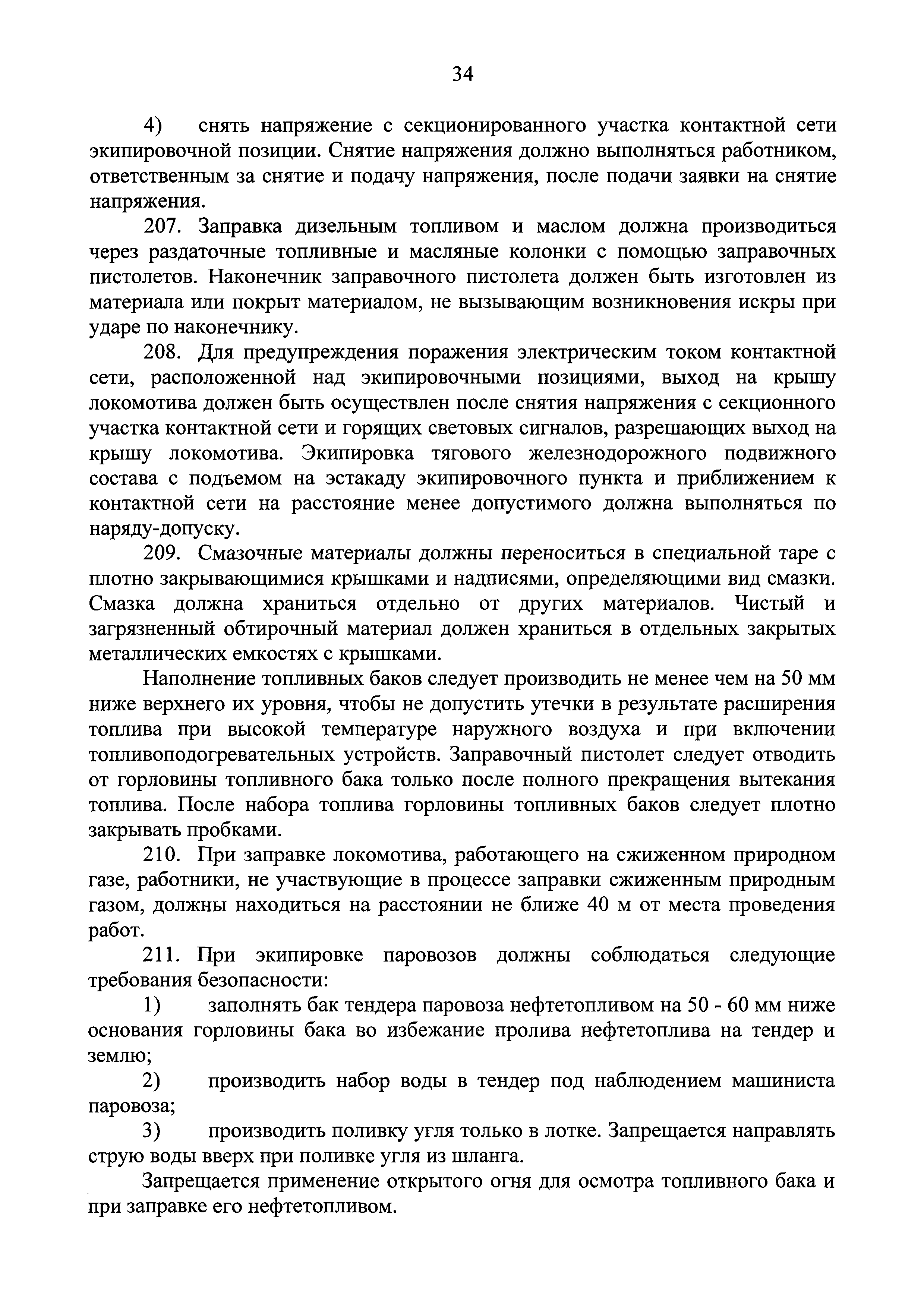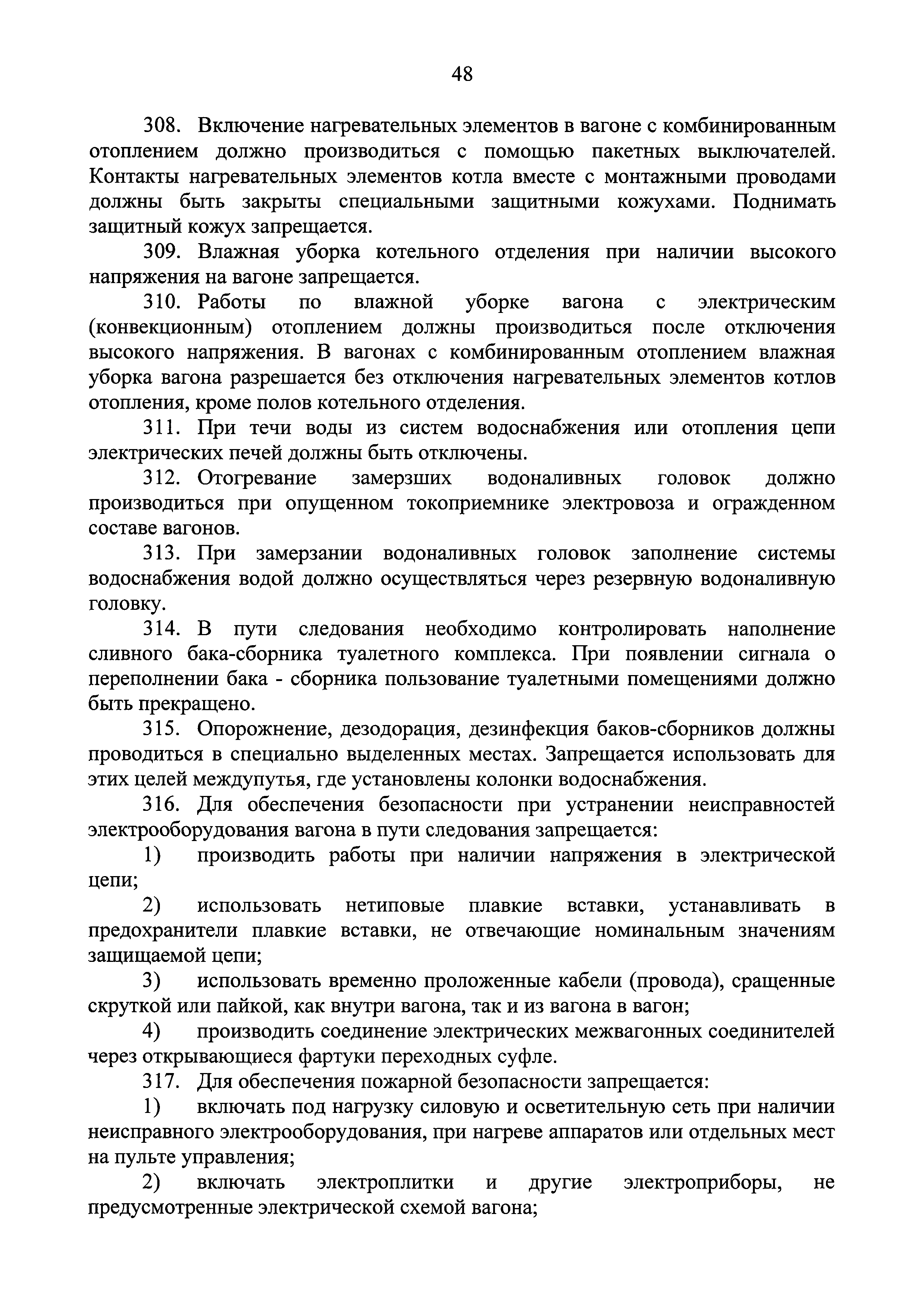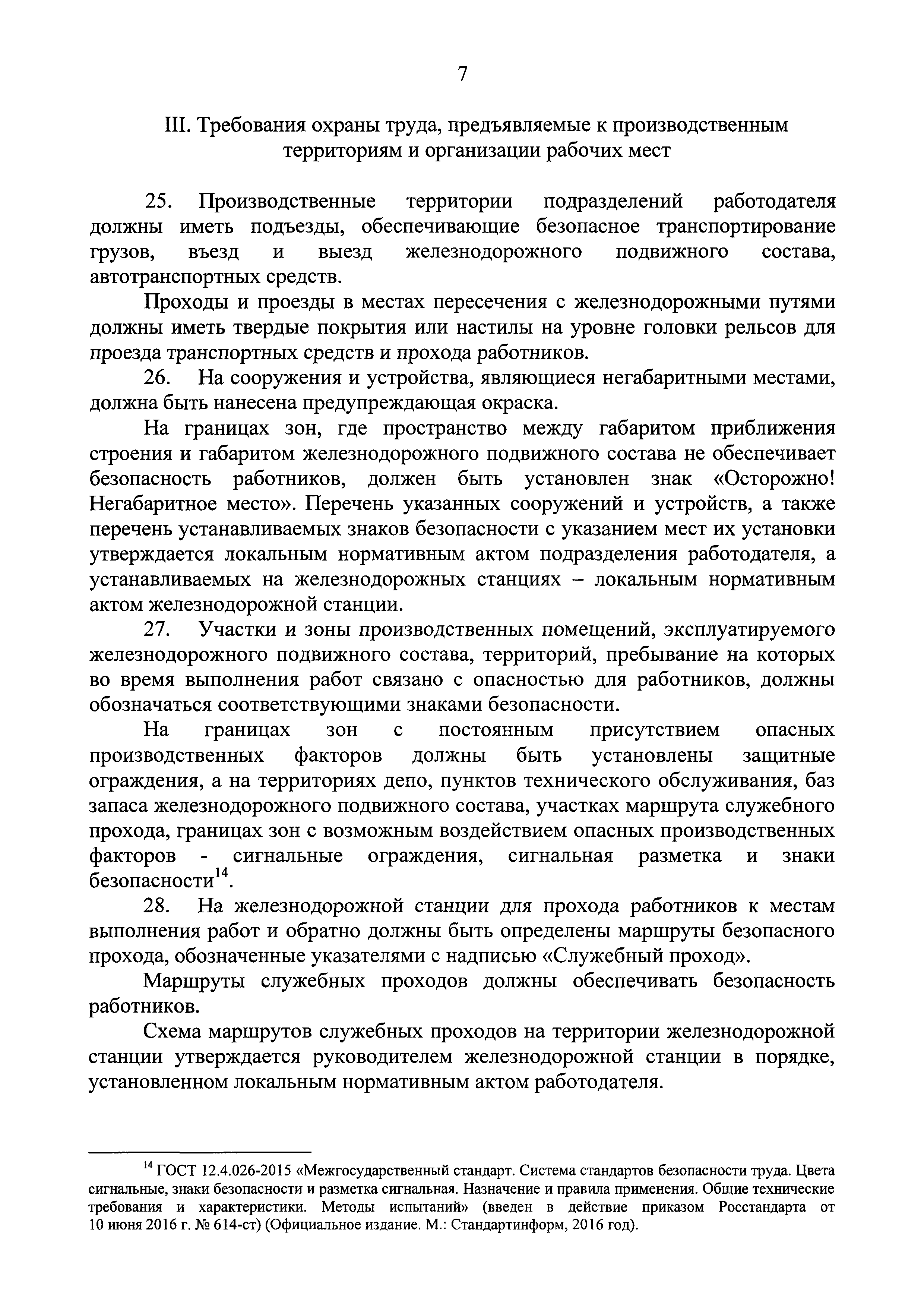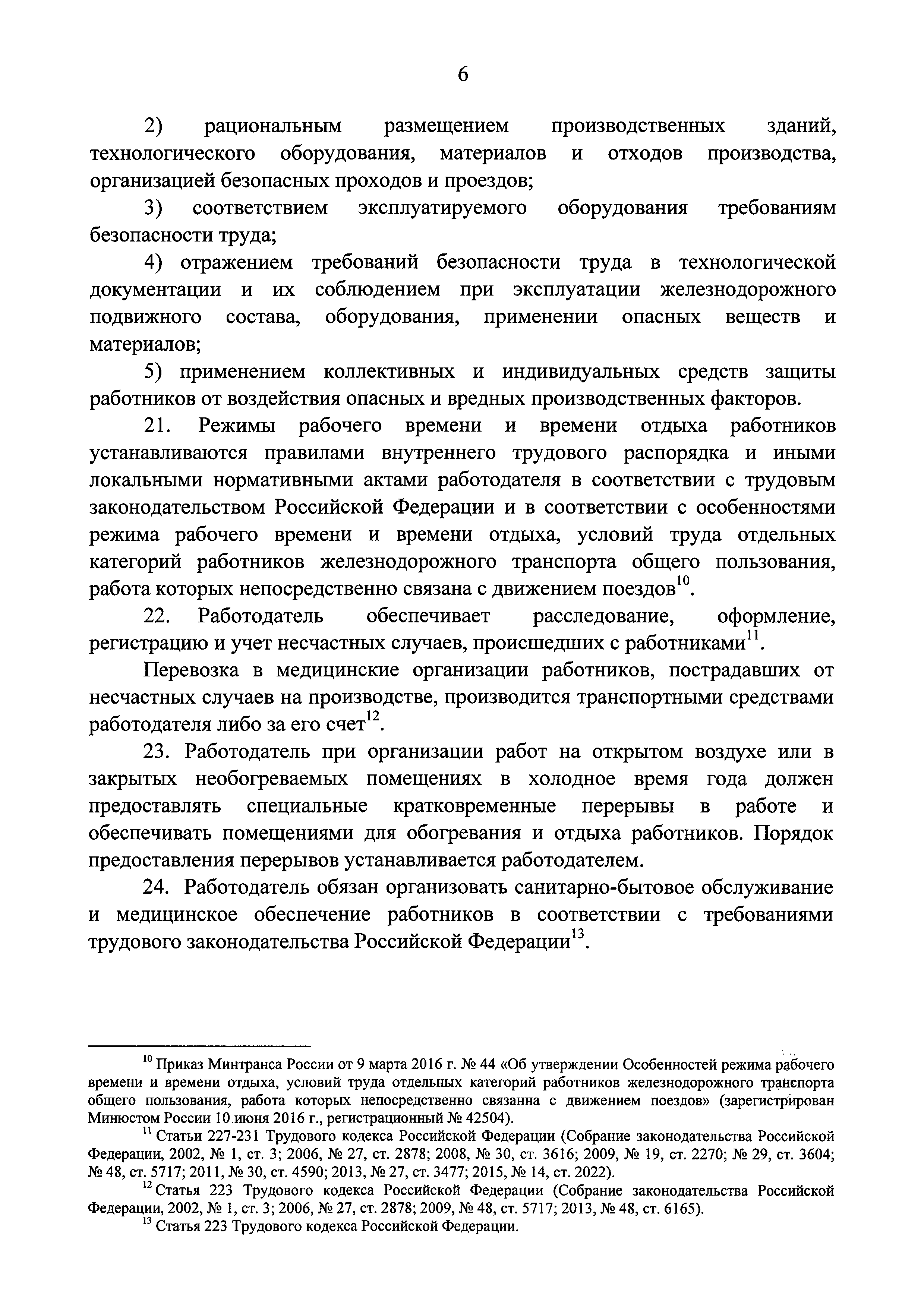 | | Нормативные ссылки: |   СанПиН 2.1.4.1074-01 «Питьевая вода. Гигиенические требования к качеству воды централизованных систем питьевого водоснабжения. Контроль качества. Гигиенические требования к обеспечению безопасности систем горячего водоснабжения»  ПОТ Р М-026-2003 «Межотраслевые правила по охране труда при эксплуатации газового хозяйства организаций»  ПОТ Р М-025-2002 «Межотраслевые правила по охране труда при эксплуатации водопроводно-канализационного хозяйства» Постановление 1/29 «Об утверждении Порядка обучения по охране труда и проверки знаний требований охраны труда работников организаций»  СП 2.5.1250-03 «Санитарные правила по организации грузовых перевозок на железнодорожном транспорте» СП 2.5.1198-03 «Санитарные правила по организации пассажирских перевозок на железнодорожном транспорте» Кодекс «Трудовой кодекс Российской Федерации» «Межотраслевые правила обеспечения работников специальной одеждой, специальной обувью и другими средствами индивидуальной защиты» «Правила прохождения обязательного психиатрического освидетельствования работниками, осуществляющими отдельные виды деятельности, в том числе деятельность, связанную с источниками повышенной опасности (с влиянием вредных веществ и неблагоприятных производственных факторов), а также работающими в условиях повышенной опасности» «Перечень тяжелых работ и работ с вредными или опасными условиями труда, при выполнении которых запрещается применение труда лиц моложе восемнадцати лет» Приказ 1122н «Об утверждении типовых норм бесплатной выдачи работникам смывающих и (или) обезвреживающих средств и стандарта безопасности труда "Обеспечение работников смывающими и (или) обезвреживающими средствами"»  «Правила технической эксплуатации железных дорог Российской Федерации»  Технический регламент Таможенного союза 001/2011 «О безопасности железнодорожного подвижного состава»  Технический регламент Таможенного союза 002/2011 «О безопасности высокоскоростного железнодорожного транспорта» «Перечень стандартов, в результате применения которых на добровольной основе обеспечивается соблюдение требований технического регламента Таможенного союза "О безопасности высокоскоростного железнодорожного транспорта". Редакция 1» «Перечень стандартов, содержащих правила и методы исследований (испытаний) и измерений, в том числе правила отбора образцов, необходимые для применения и исполнения технического регламента Таможенного союза "О безопасности высокоскоростного железнодорожного транспорта" и осуществления оценки (подтверждения) соответствия продукции. Редакция 1» Приказ 302н «Об утверждении перечней вредных и (или) опасных производственных факторов и работ, при выполнении которых проводятся обязательные предварительные и периодические медицинские осмотры (обследования), и Порядка проведения обязательных предварительных и периодических медицинских осмотров (обследований) работников, занятых на тяжелых работах и на работах с вредными и (или) опасными условиями труда»  «Правила противопожарного режима в Российской Федерации»  Технический регламент Таможенного союза 032/2013 «О безопасности оборудования, работающего под избыточным давлением»  Федеральный закон 426-ФЗ «О специальной оценке условий труда»  «Правила по охране труда при эксплуатации электро