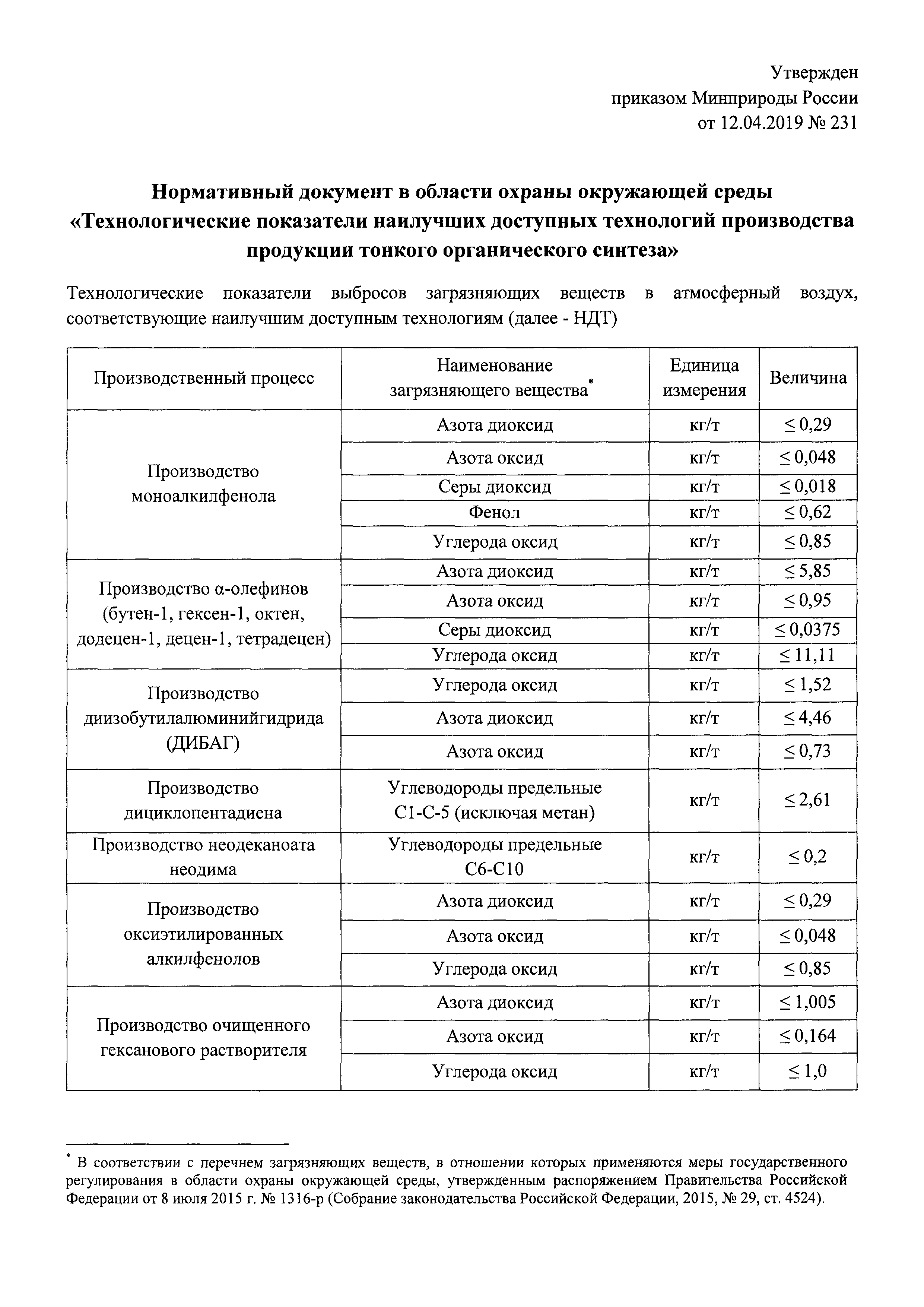 Нормативный документ в области охраны окружающей среды "Технологические показатели наилучших доступных технологий производства продукции тонкого органического синтеза"| Статус: | действует | | Название рус.: | Нормативный документ в области охраны окружающей среды "Технологические показатели наилучших доступных технологий производства продукции тонкого органического синтеза" | | Дата добавления в базу: | 01.02.2020 | | Дата актуализации: | 01.01.2021 | | Дата введения: | 26.05.2019 | | Утверждён: | 12.04.2019 Министерство природных ресурсов и экологии Российской Федерации (231)