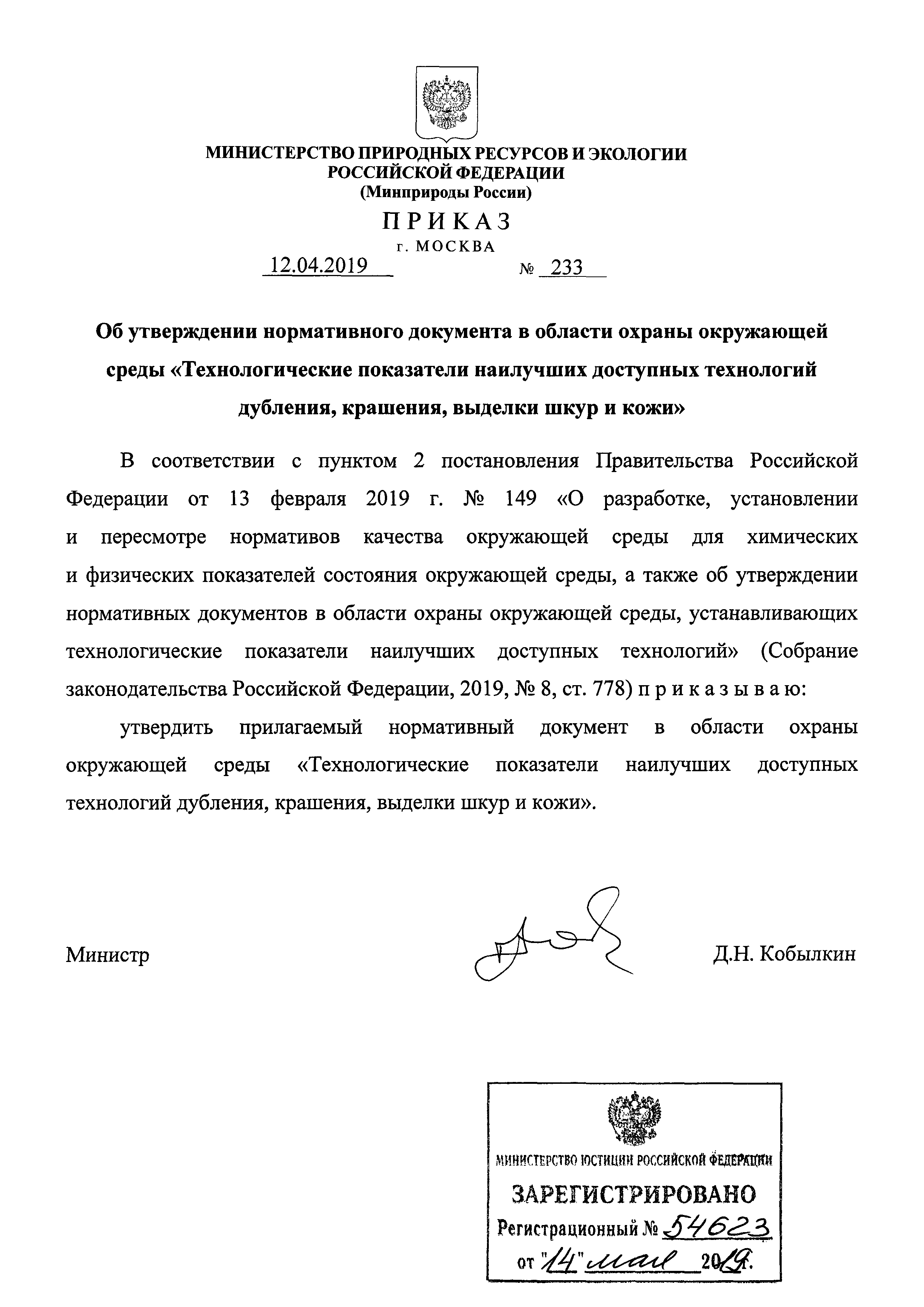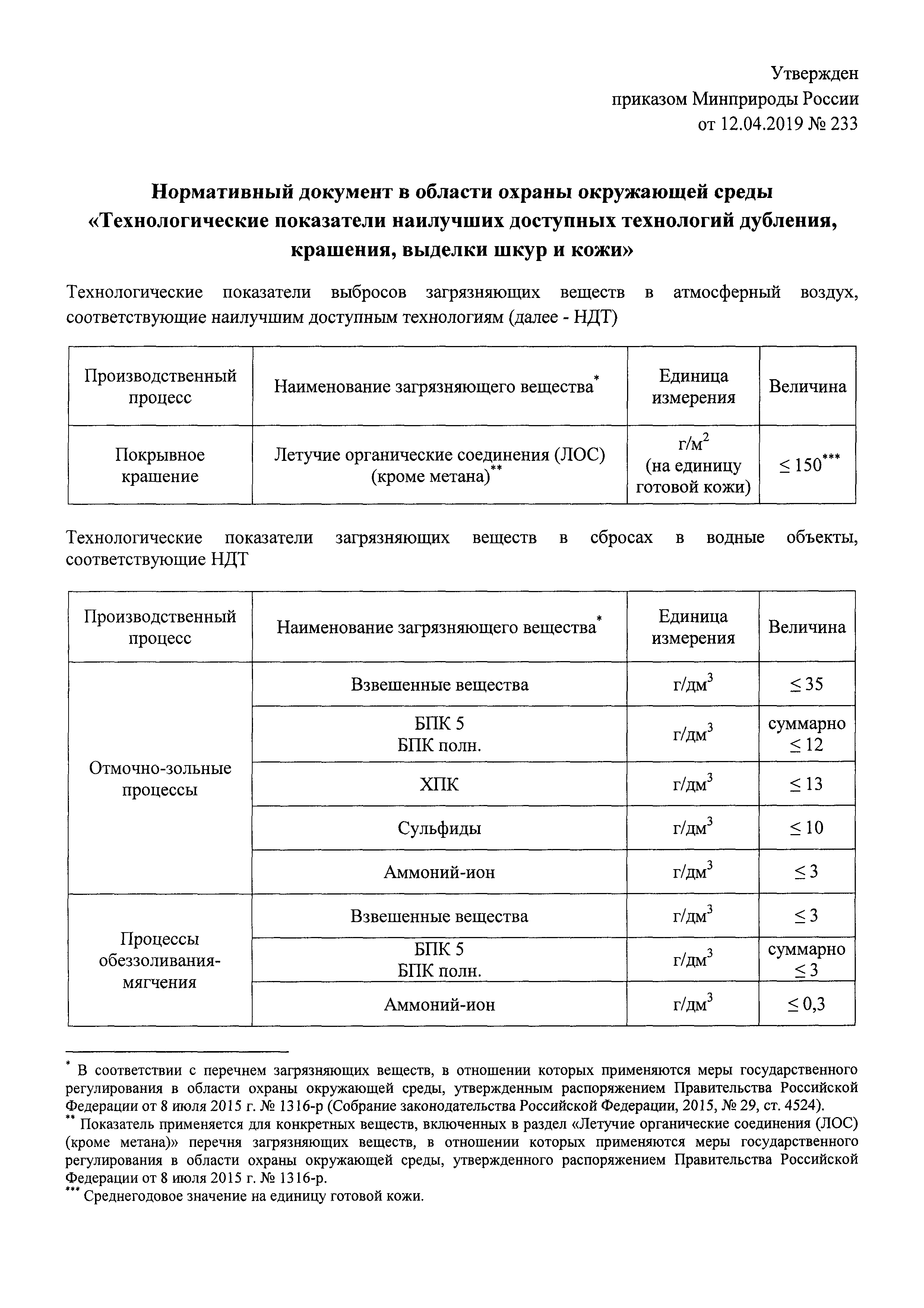 Нормативный документ в области охраны окружающей среды "Технологические показатели наилучших доступных технологий дубления, крашения, выделки шкур и кожи"| Статус: | действует | | Название рус.: | Нормативный документ в области охраны окружающей среды "Технологические показатели наилучших доступных технологий дубления, крашения, выделки шкур и кожи" | | Дата добавления в базу: | 01.02.2020 | | Дата актуализации: | 01.01.2021 | | Дата введения: | 26.05.2019 | | Утверждён: | 12.04.2019 Министерство природных ресурсов и экологии Российской Федерации (233)