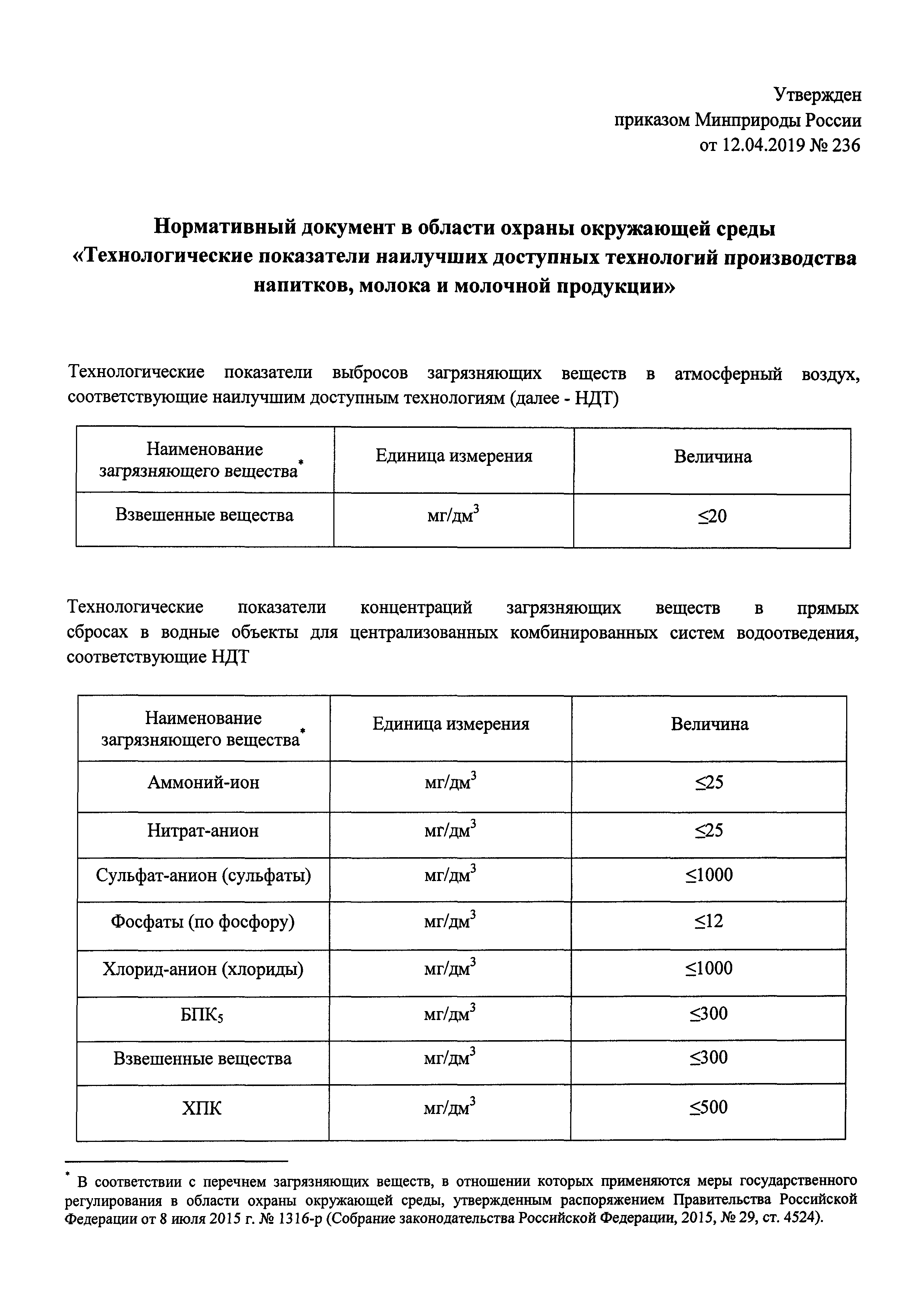 Нормативный документ в области охраны окружающей среды "Технологические показатели наилучших доступных технологий производства напитков, молока и молочной продукции"| Статус: | действует | | Название рус.: | Нормативный документ в области охраны окружающей среды "Технологические показатели наилучших доступных технологий производства напитков, молока и молочной продукции" | | Дата добавления в базу: | 01.02.2020 | | Дата актуализации: | 01.01.2021 | | Дата введения: | 26.05.2019 | | Утверждён: | 12.04.2019 Министерство природных ресурсов и экологии Российской Федерации (236)