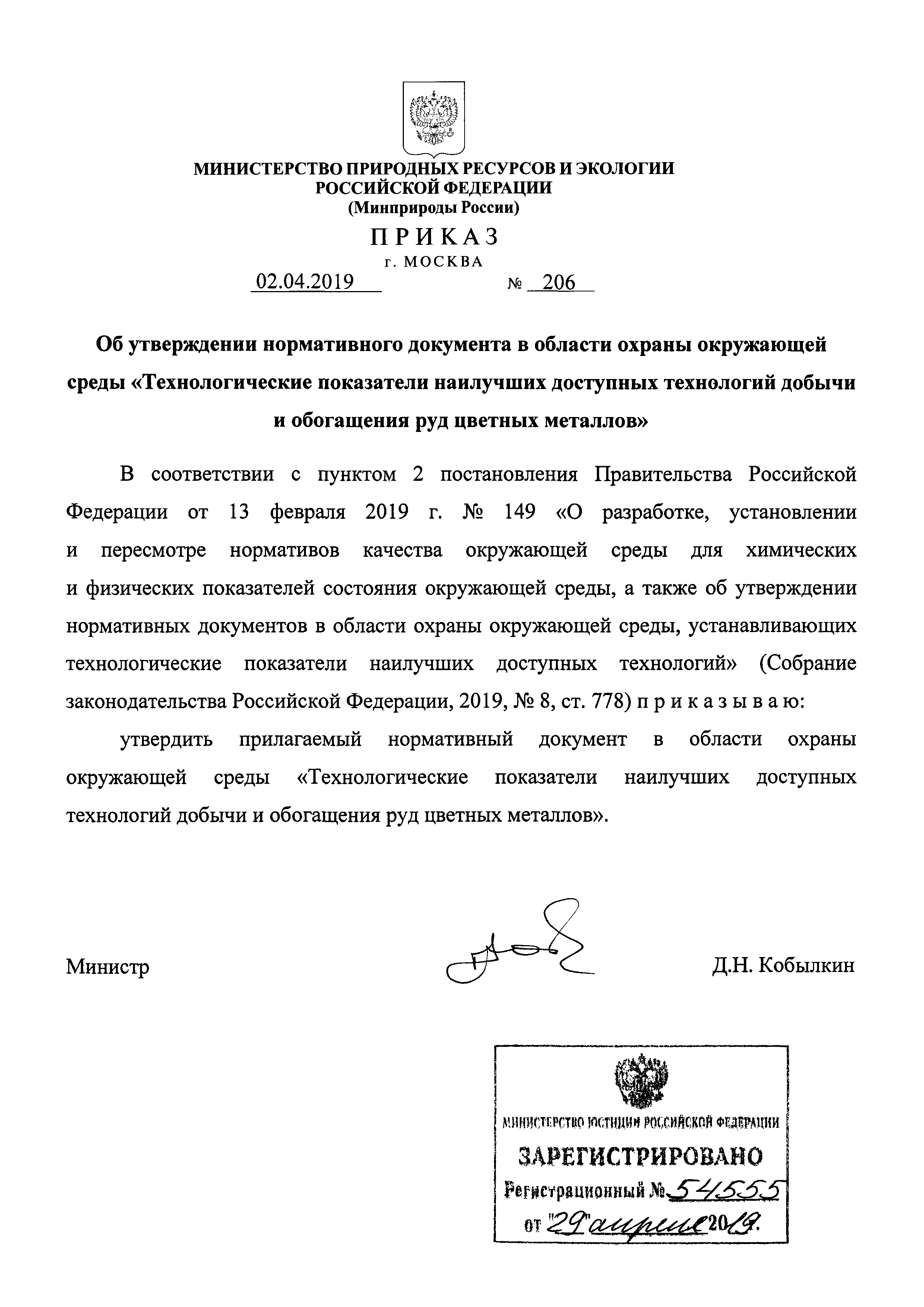 Нормативный документ в области охраны окружающей среды "Технологические показатели наилучших доступных технологий добычи и обогащения руд цветных металлов"| Статус: | действует | | Название рус.: | Нормативный документ в области охраны окружающей среды "Технологические показатели наилучших доступных технологий добычи и обогащения руд цветных металлов" | | Дата добавления в базу: | 01.02.2020 | | Дата актуализации: | 01.01.2021 | | Дата введения: | 11.05.2019 | | Утверждён: | 02.04.2019 Министерство природных ресурсов и экологии Российской Федерации (206)