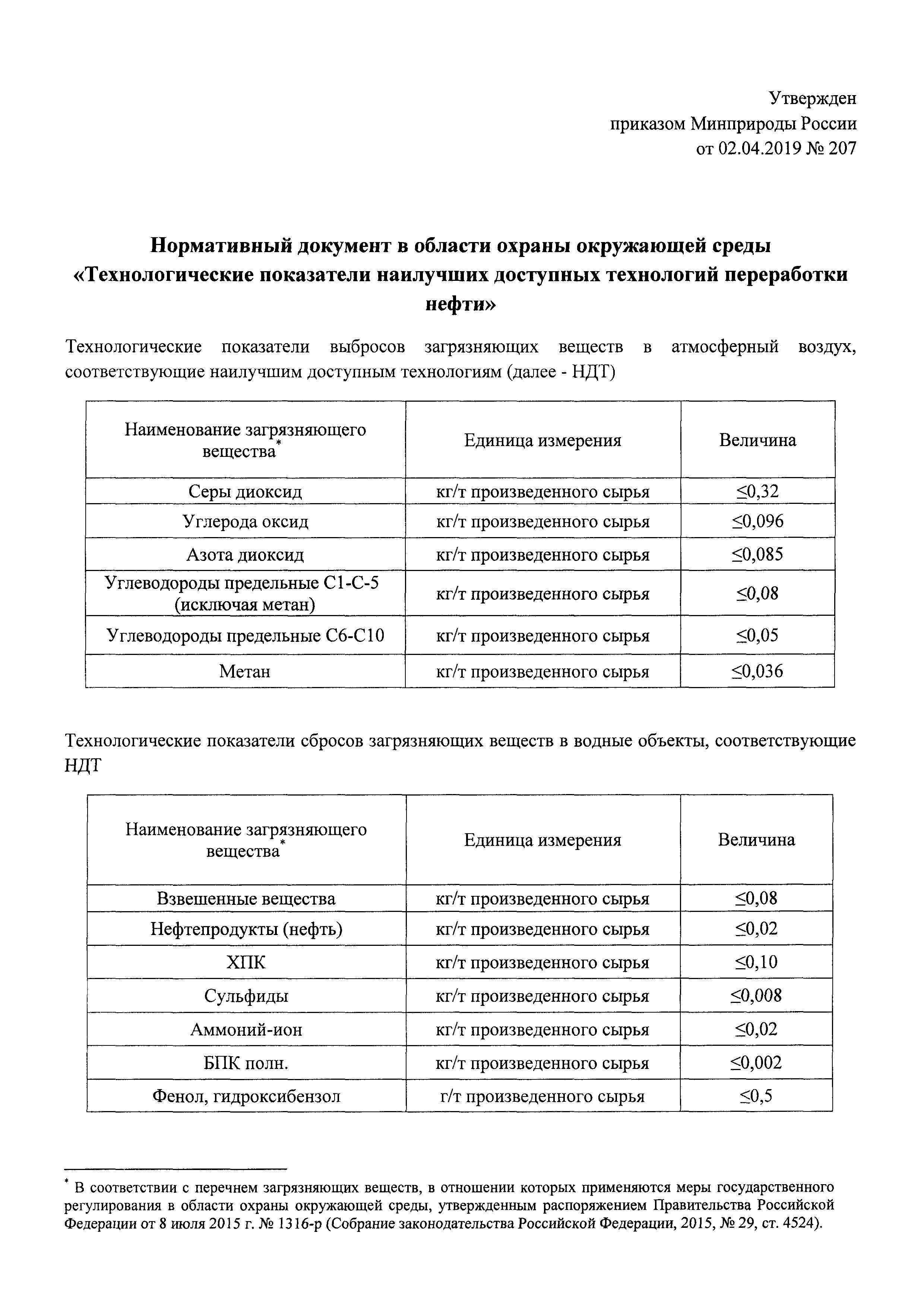 Нормативный документ в области охраны окружающей среды "Технологические показатели наилучших доступных технологий переработки нефти"| Статус: | действует | | Название рус.: | Нормативный документ в области охраны окружающей среды "Технологические показатели наилучших доступных технологий переработки нефти" | | Дата добавления в базу: | 01.02.2020 | | Дата актуализации: | 01.01.2021 | | Дата введения: | 11.05.2019 | | Утверждён: | 02.04.2019 Министерство природных ресурсов и экологии Российской Федерации (207)