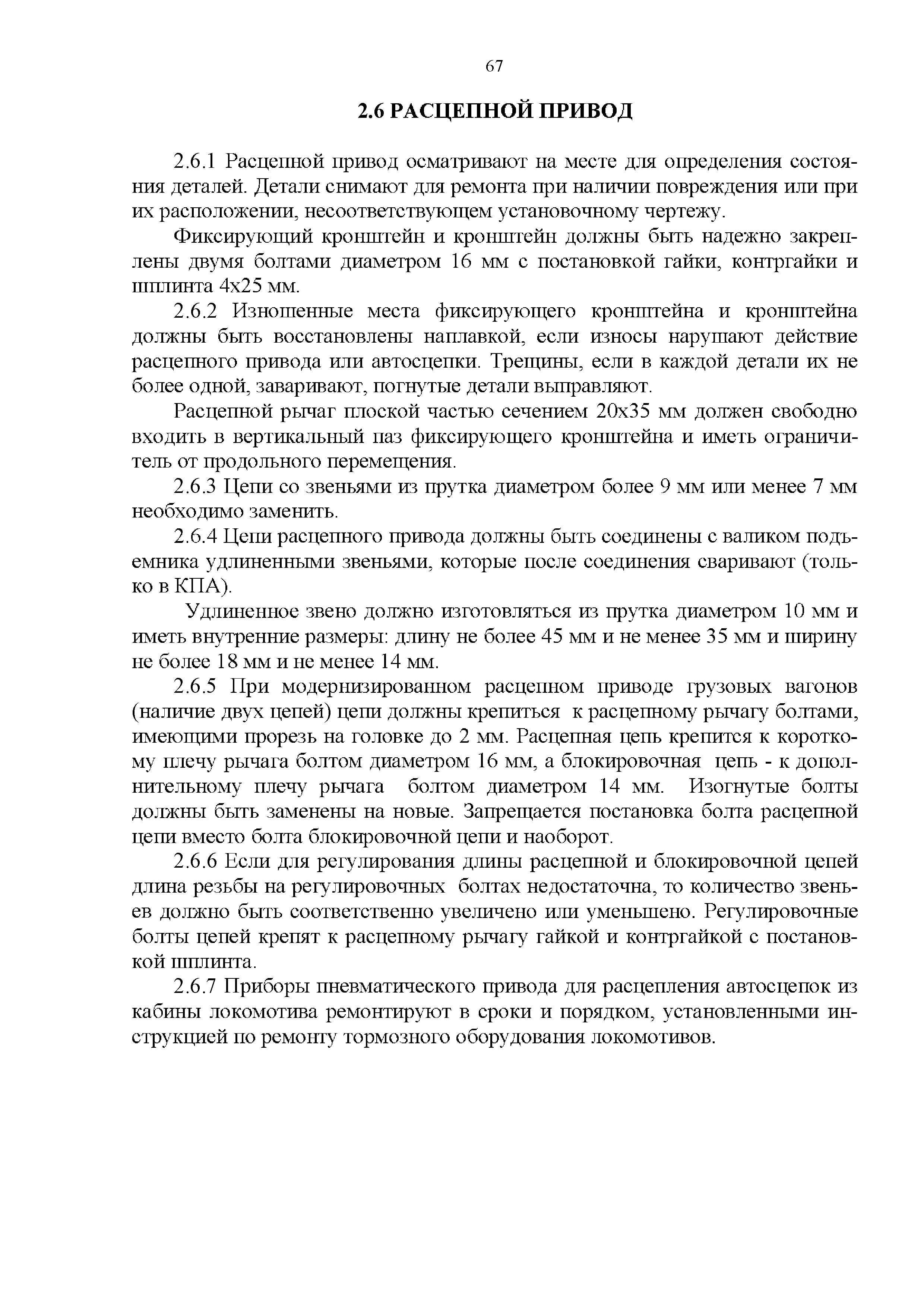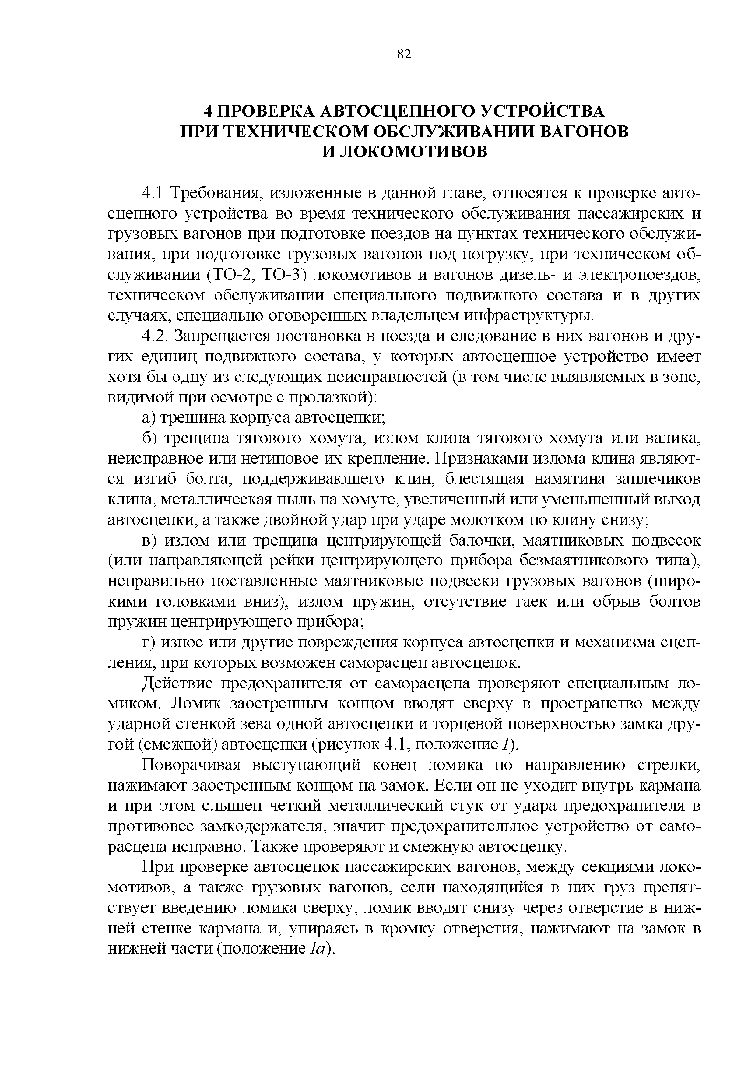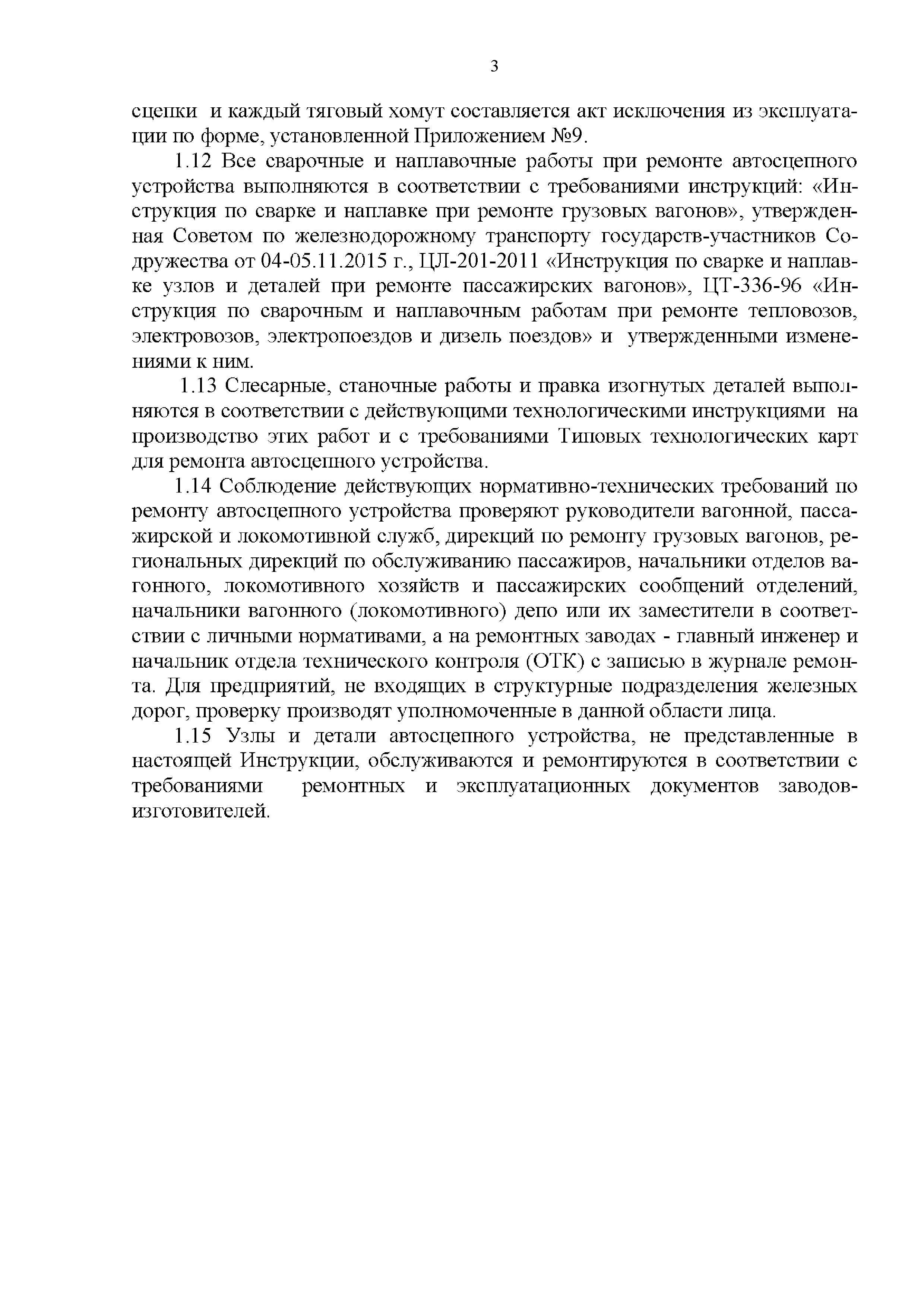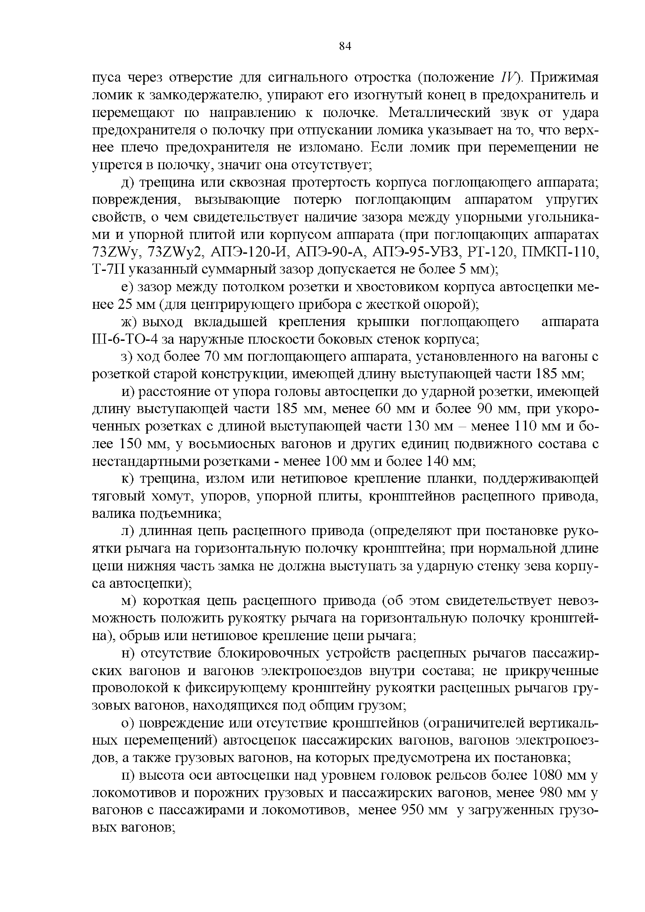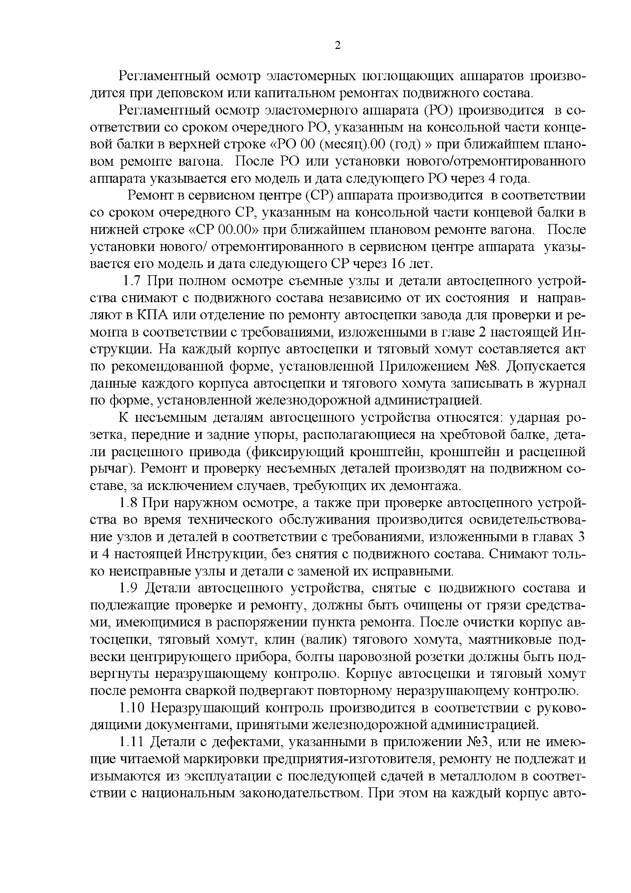 Инструкция по ремонту и обслуживанию автосцепного устройства подвижного состава железных дорог| Статус: | действует | | Название рус.: | Инструкция по ремонту и обслуживанию автосцепного устройства подвижного состава железных дорог | | Дата добавления в базу: | 01.02.2020 | | Дата актуализации: | 01.01.2021 | | Область применения: | Документ предназначен для работников контрольных пунктов автосцепки (КПА) депо и отделений по ремонту автосцепки вагоно- и локомотиворемонтных заводов, а также для специализированных подразделений предприятий по ремонту подвижного состава любой формы собственности, имеющих аттестат установленной формы, выданный железнодорожной администрацией. | | Оглавление: | 1 Общие положения 2 Полный осмотр 2.1 Автосцепка 2.2 Поглощающие аппараты 2.3. Тяговые хомуты 2.4 Клин, валик тягового хомута, упорная плита, передние и задние упоры, поддерживающая планка, планка против истирания 2.5 Детали центрирующего прибора 2.6 Расцепной привод 2.7 Клеймение и окраска отремонтированных и проверенных узлов и деталей автосцепного устройства 2.8 Установка автосцепного устройства 3 Наружный осмотр 4 Проверка автосцепного устройства при техническом обслуживании вагонов и локомотивов 5 Срок гарантии автосцепного устройства Приложение № 1. Примерный перечень оборудования и рекомендуемый технологической оснастки КПА и отделений автосцепки | | Утверждён: | 18.05.2010 Совет по железнодорожному транспорту Государств - участников Содружества (54)