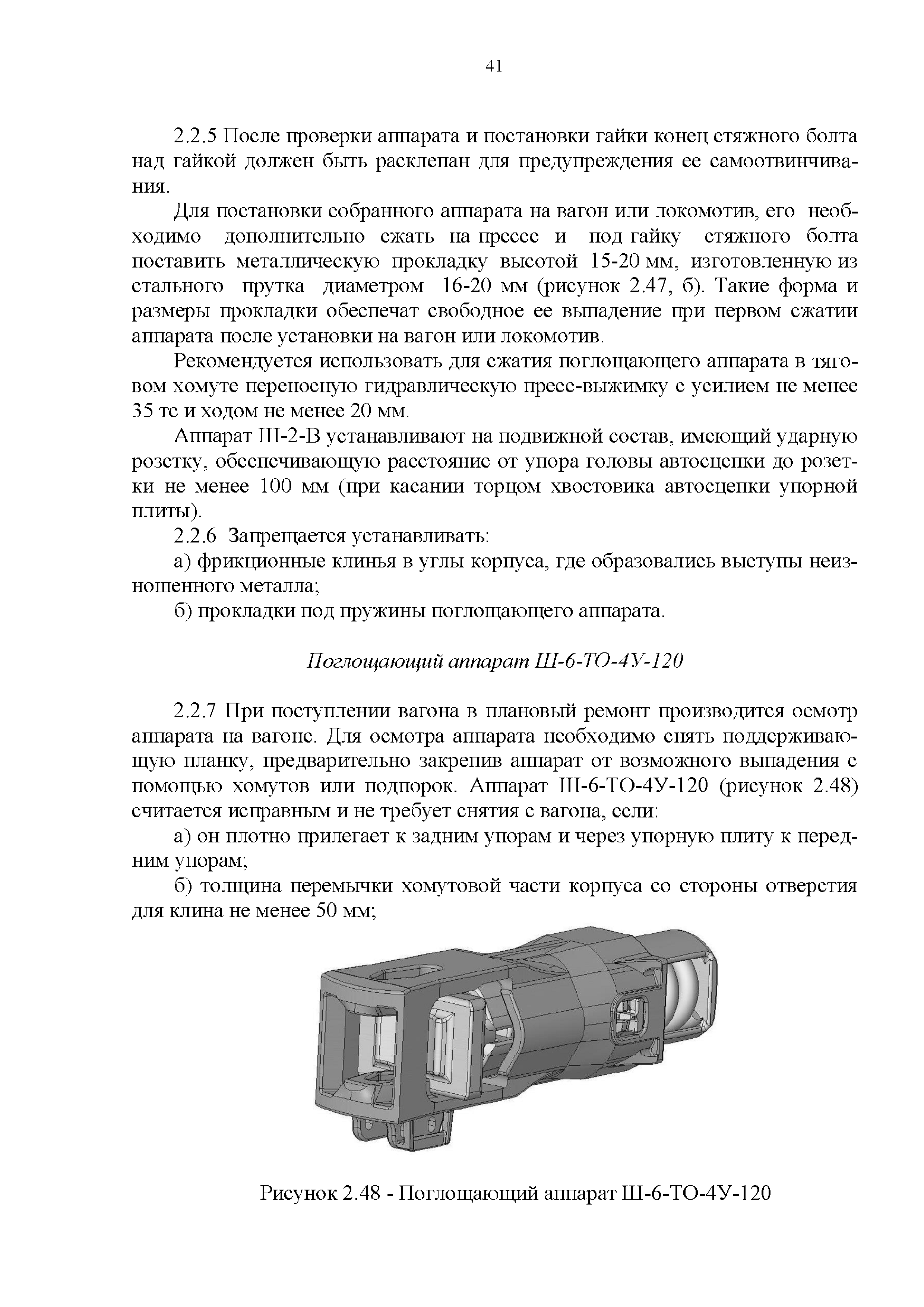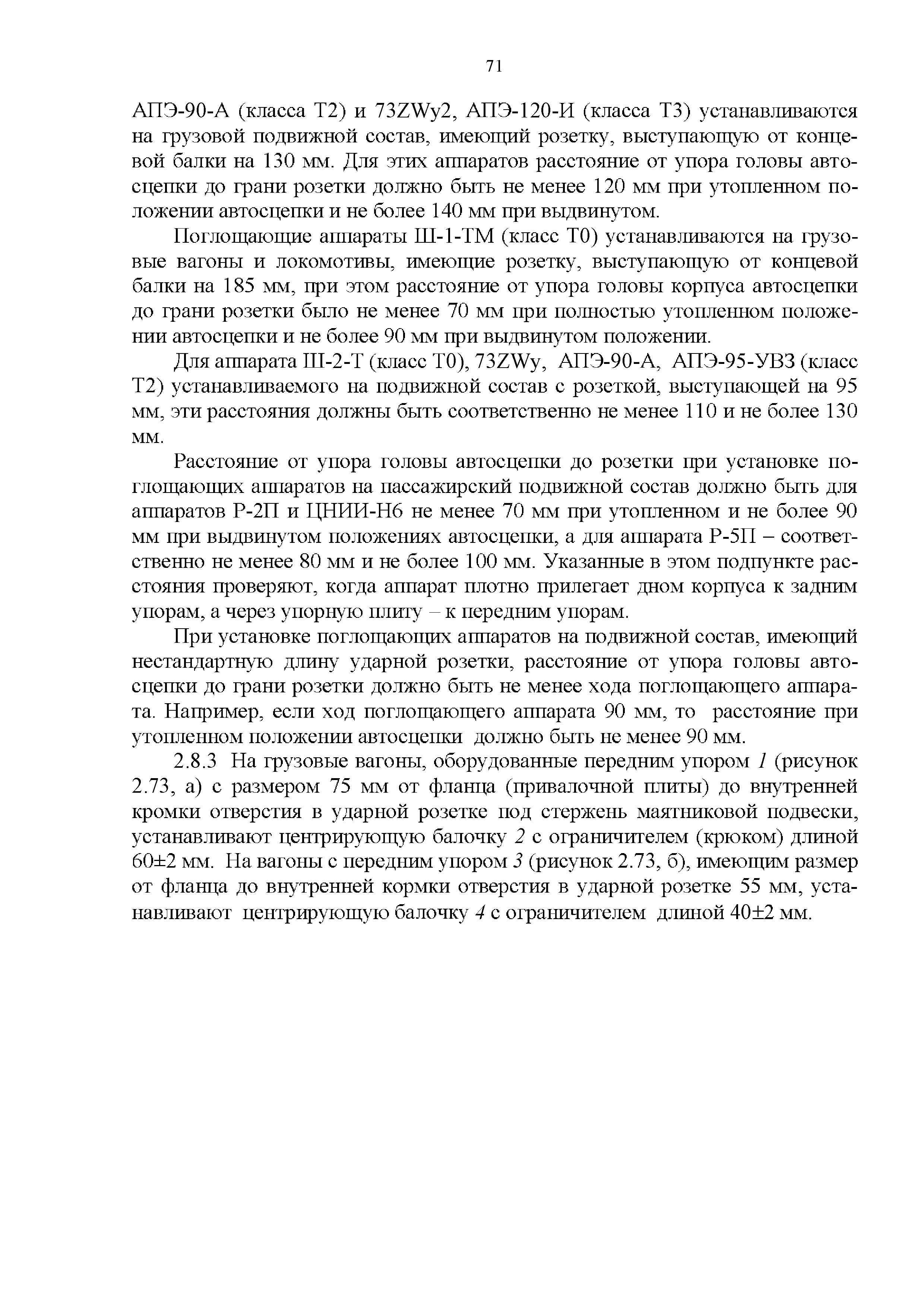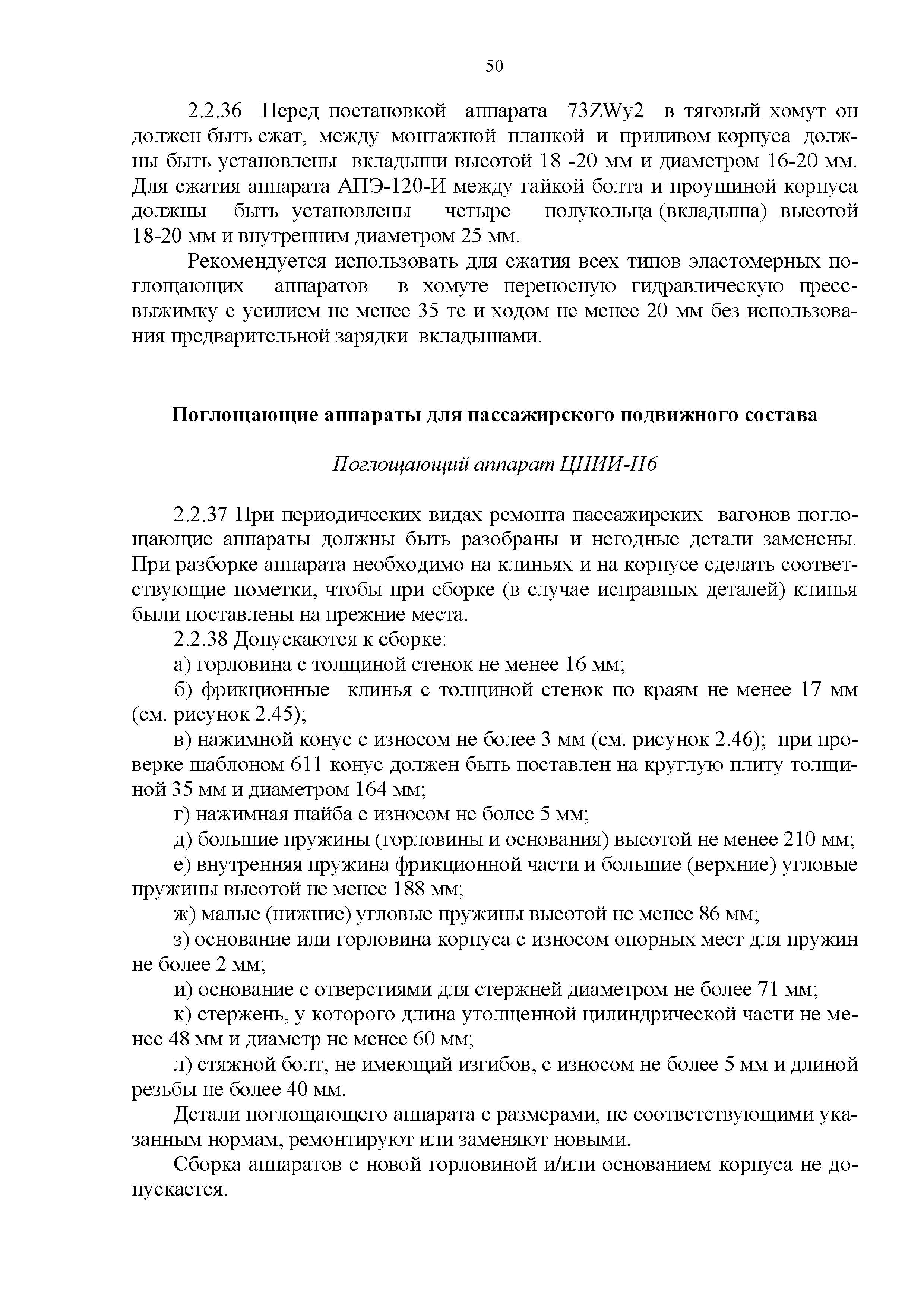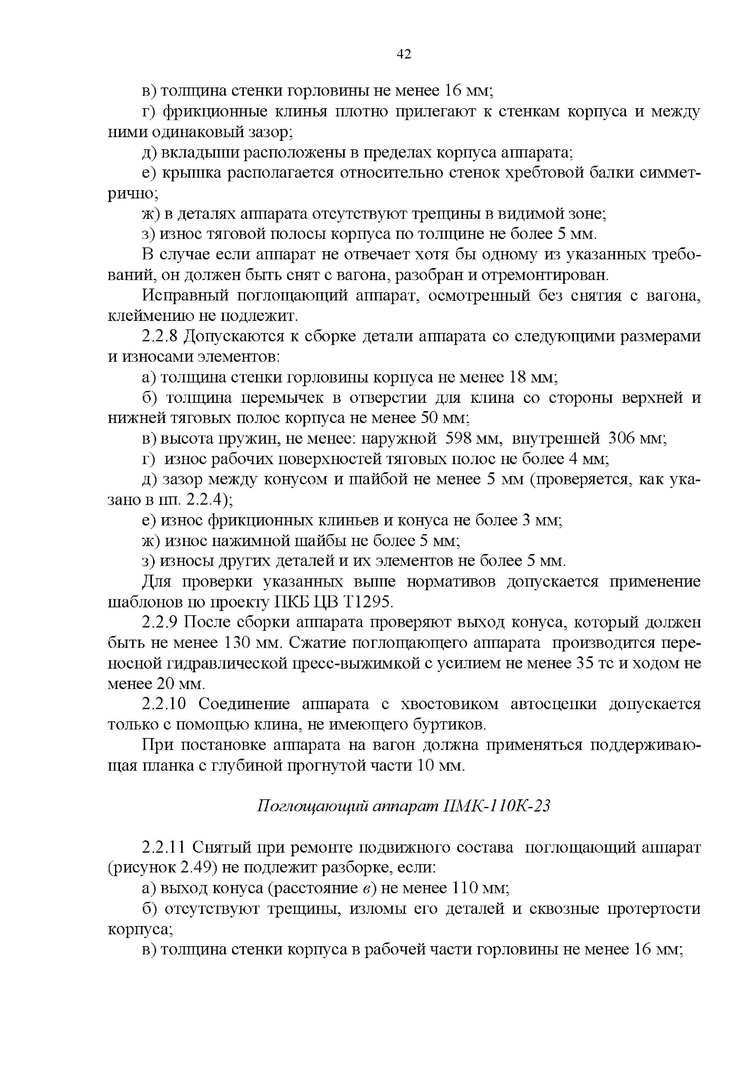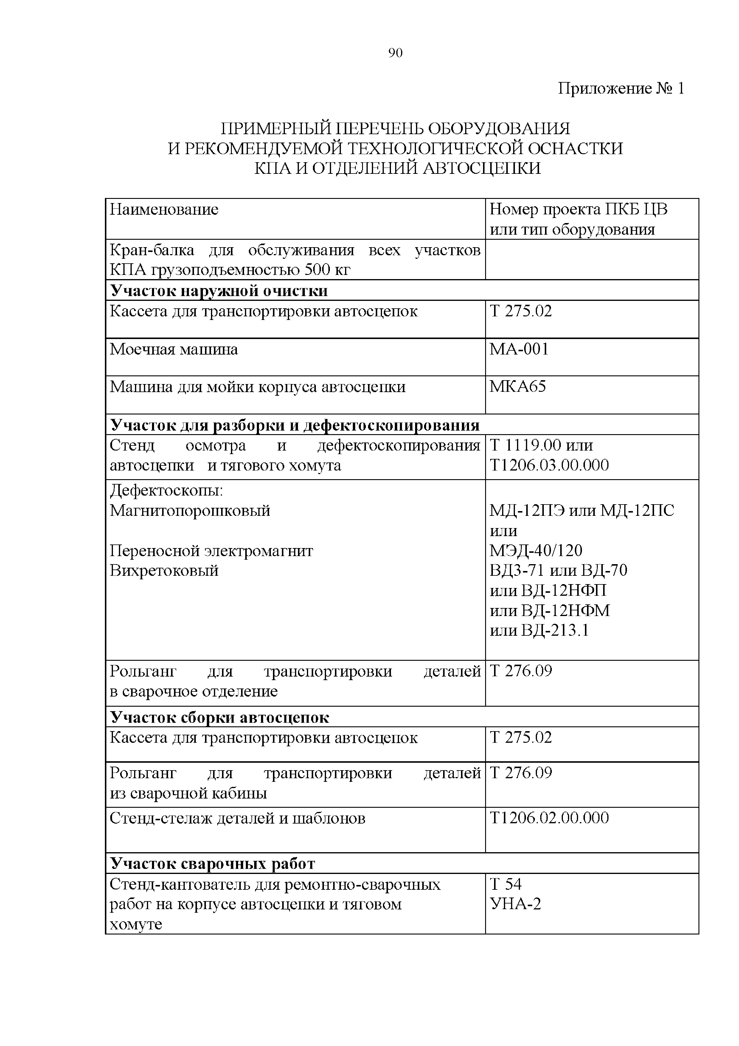 Инструкция по ремонту и обслуживанию автосцепного устройства подвижного состава железных дорог| Статус: | действует | | Название рус.: | Инструкция по ремонту и обслуживанию автосцепного устройства подвижного состава железных дорог | | Дата добавления в базу: | 01.02.2020 | | Дата актуализации: | 01.01.2021 | | Область применения: | Документ предназначен для работников контрольных пунктов автосцепки (КПА) депо и отделений по ремонту автосцепки вагоно- и локомотиворемонтных заводов, а также для специализированных подразделений предприятий по ремонту подвижного состава любой формы собственности, имеющих аттестат установленной формы, выданный железнодорожной администрацией. | | Оглавление: | 1 Общие положения 2 Полный осмотр 2.1 Автосцепка 2.2 Поглощающие аппараты 2.3. Тяговые хомуты 2.4 Клин, валик тягового хомута, упорная плита, передние и задние упоры, поддерживающая планка, планка против истирания 2.5 Детали центрирующего прибора 2.6 Расцепной привод 2.7 Клеймение и окраска отремонтированных и проверенных узлов и деталей автосцепного устройства 2.8 Установка автосцепного устройства 3 Наружный осмотр 4 Проверка автосцепного устройства при техническом обслуживании вагонов и локомотивов 5 Срок гарантии автосцепного устройства Приложение № 1. Примерный перечень оборудования и рекомендуемый технологической оснастки КПА и отделений автосцепки | | Утверждён: | 18.05.2010 Совет по железнодорожному транспорту Государств - участников Содружества (54)