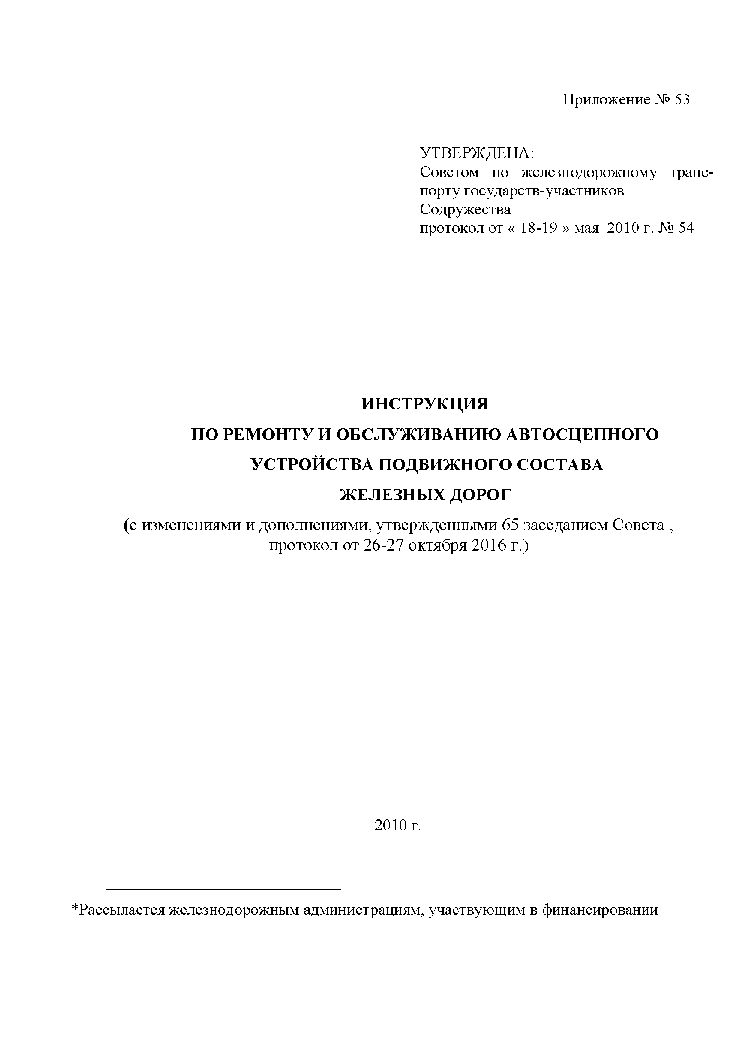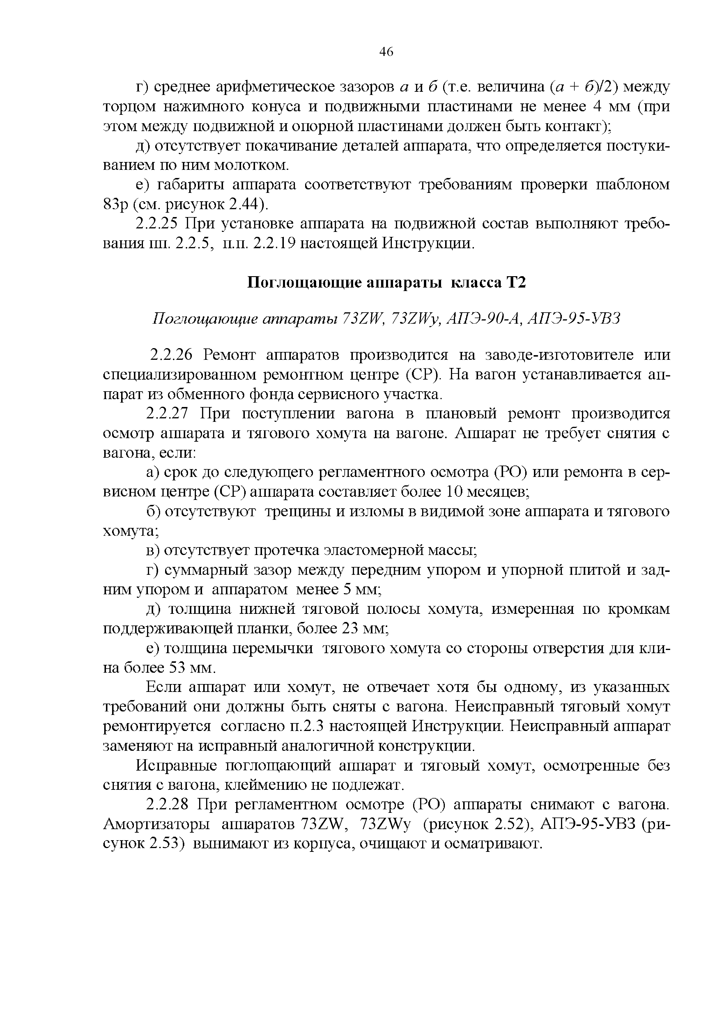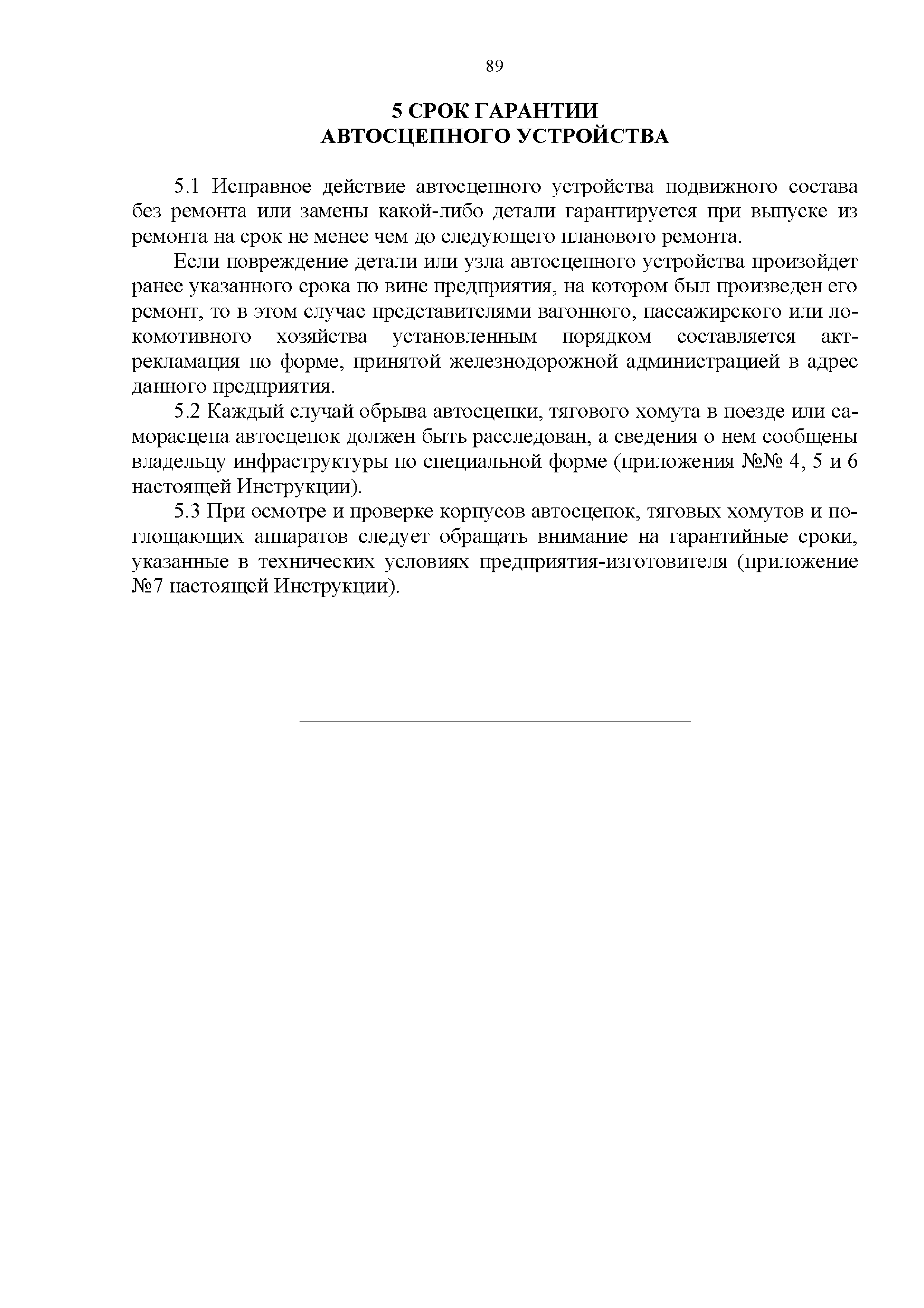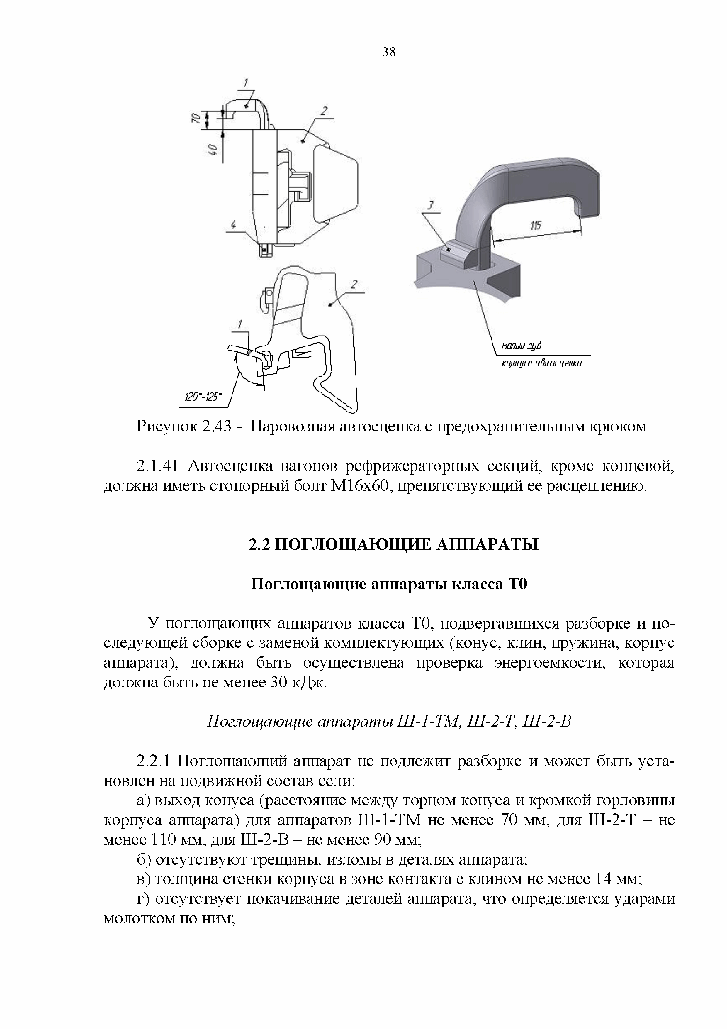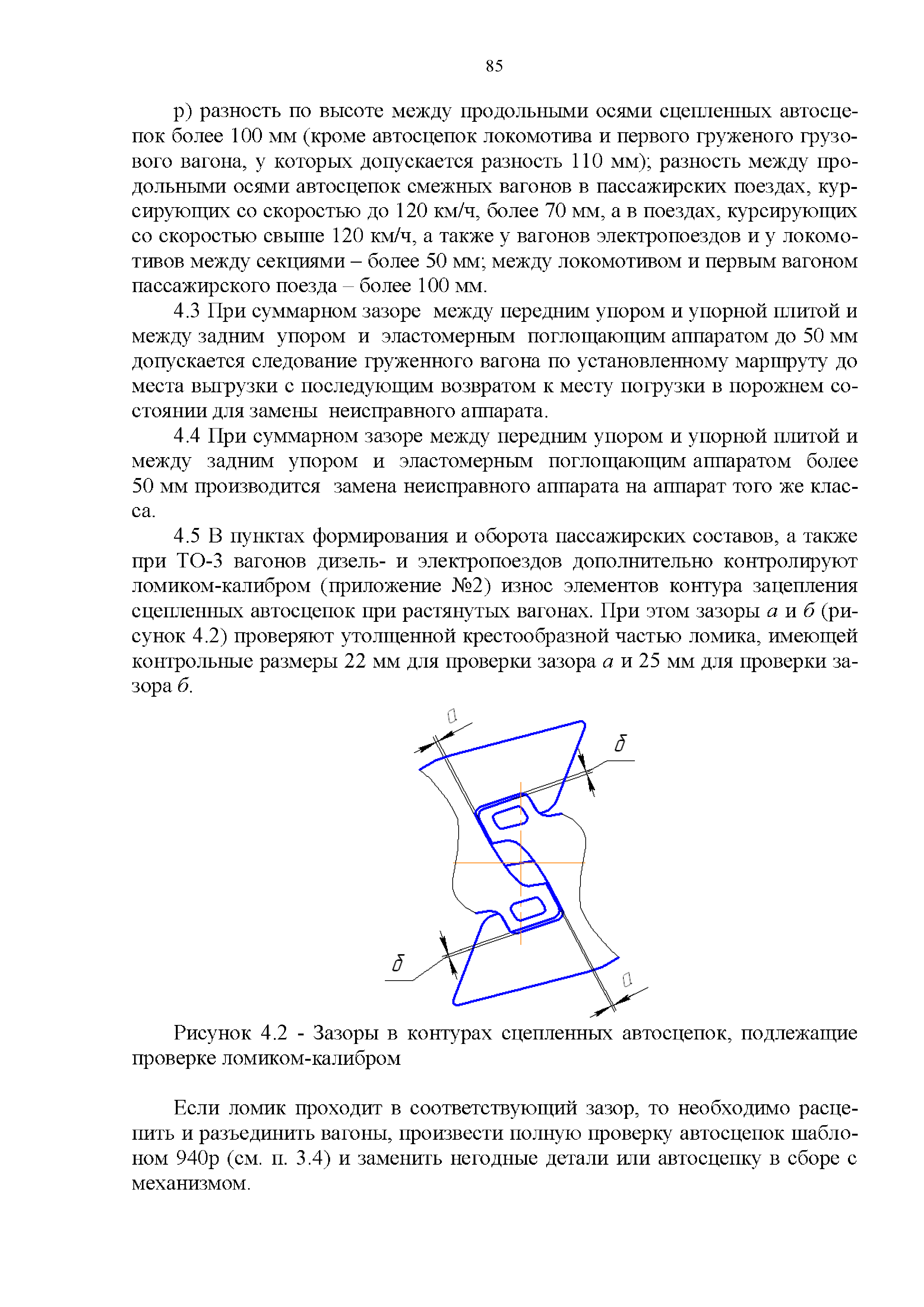 Инструкция по ремонту и обслуживанию автосцепного устройства подвижного состава железных дорог| Статус: | действует | | Название рус.: | Инструкция по ремонту и обслуживанию автосцепного устройства подвижного состава железных дорог | | Дата добавления в базу: | 01.02.2020 | | Дата актуализации: | 01.01.2021 | | Область применения: | Документ предназначен для работников контрольных пунктов автосцепки (КПА) депо и отделений по ремонту автосцепки вагоно- и локомотиворемонтных заводов, а также для специализированных подразделений предприятий по ремонту подвижного состава любой формы собственности, имеющих аттестат установленной формы, выданный железнодорожной администрацией. | | Оглавление: | 1 Общие положения 2 Полный осмотр 2.1 Автосцепка 2.2 Поглощающие аппараты 2.3. Тяговые хомуты 2.4 Клин, валик тягового хомута, упорная плита, передние и задние упоры, поддерживающая планка, планка против истирания 2.5 Детали центрирующего прибора 2.6 Расцепной привод 2.7 Клеймение и окраска отремонтированных и проверенных узлов и деталей автосцепного устройства 2.8 Установка автосцепного устройства 3 Наружный осмотр 4 Проверка автосцепного устройства при техническом обслуживании вагонов и локомотивов 5 Срок гарантии автосцепного устройства Приложение № 1. Примерный перечень оборудования и рекомендуемый технологической оснастки КПА и отделений автосцепки | | Утверждён: | 18.05.2010 Совет по железнодорожному транспорту Государств - участников Содружества (54)