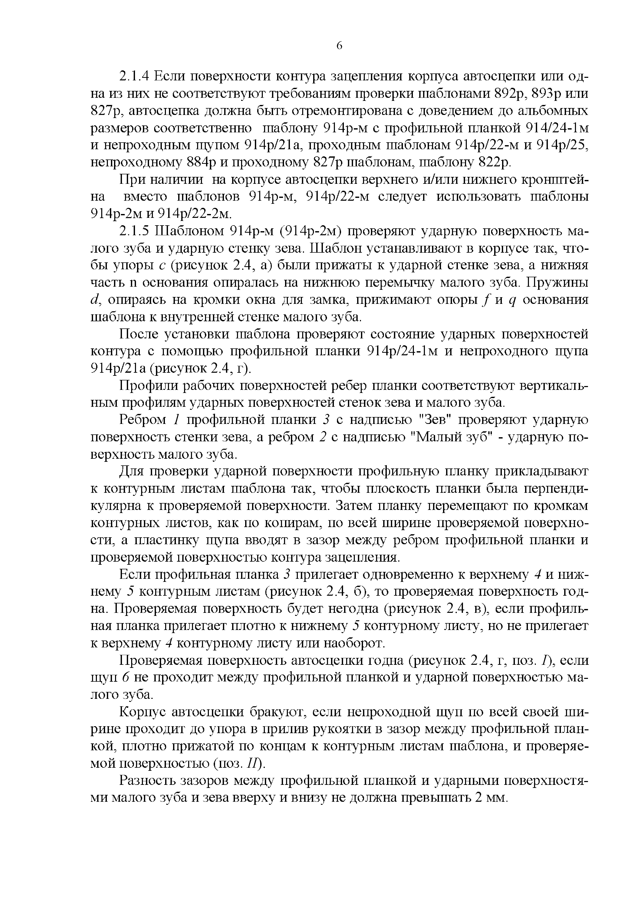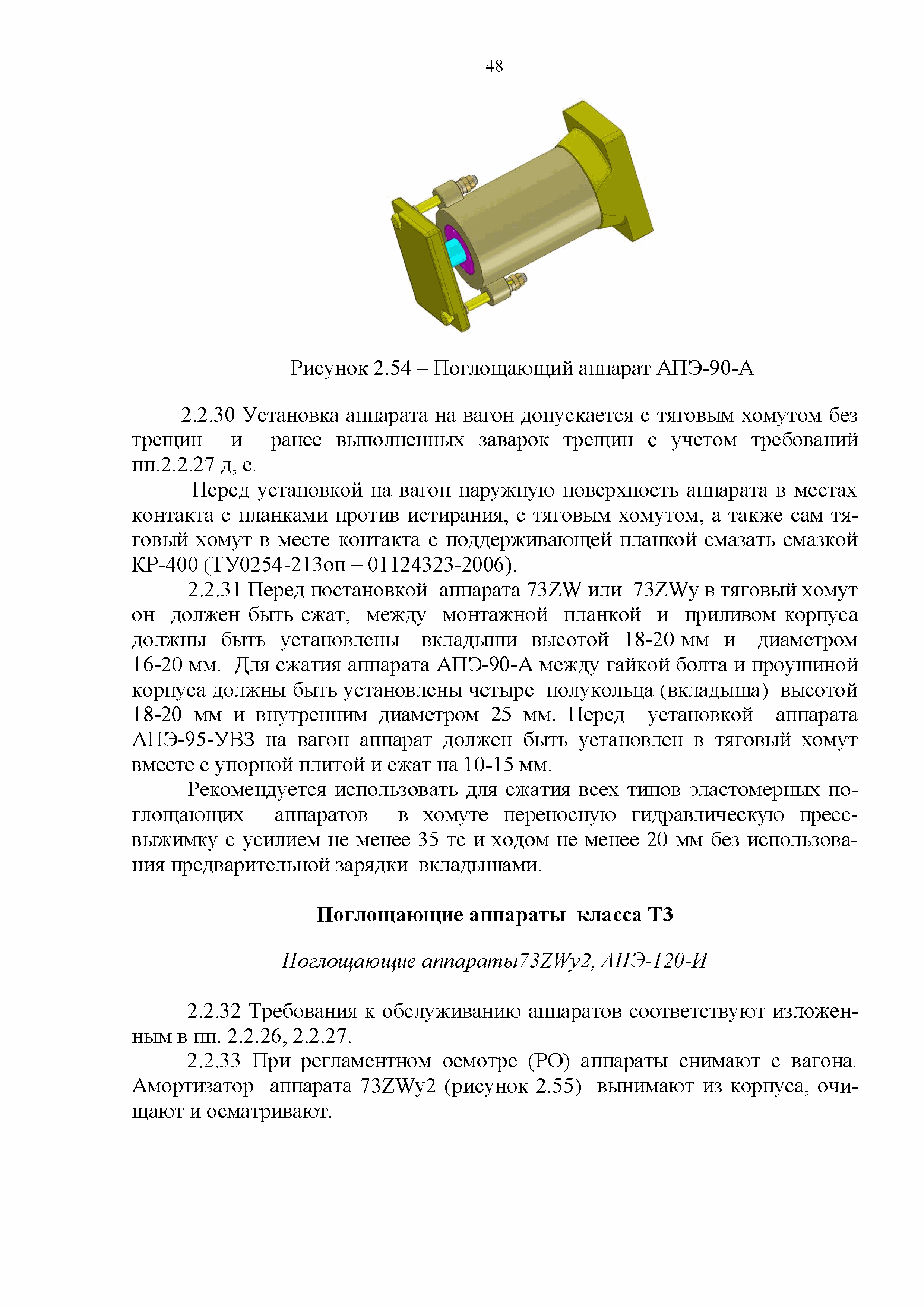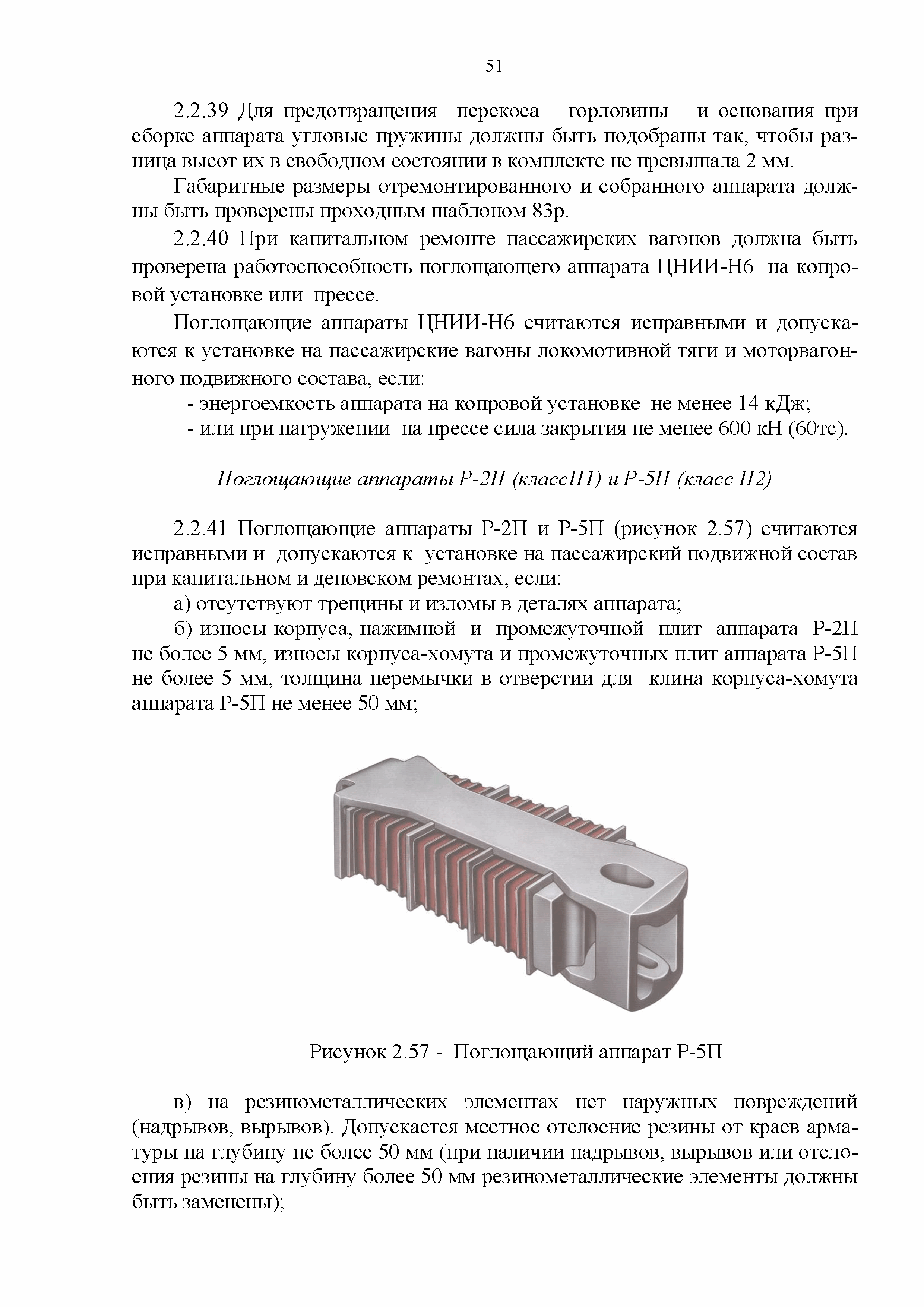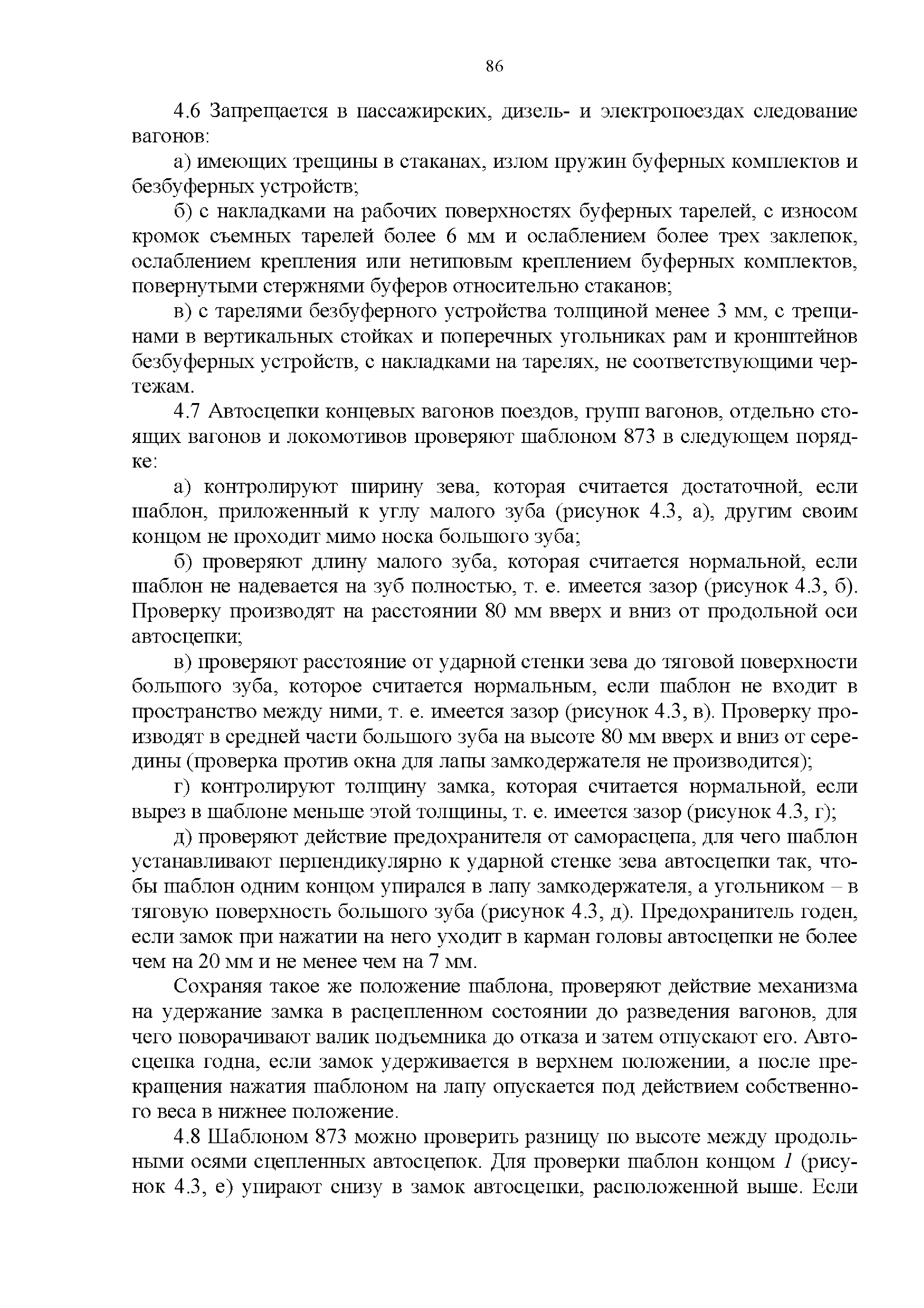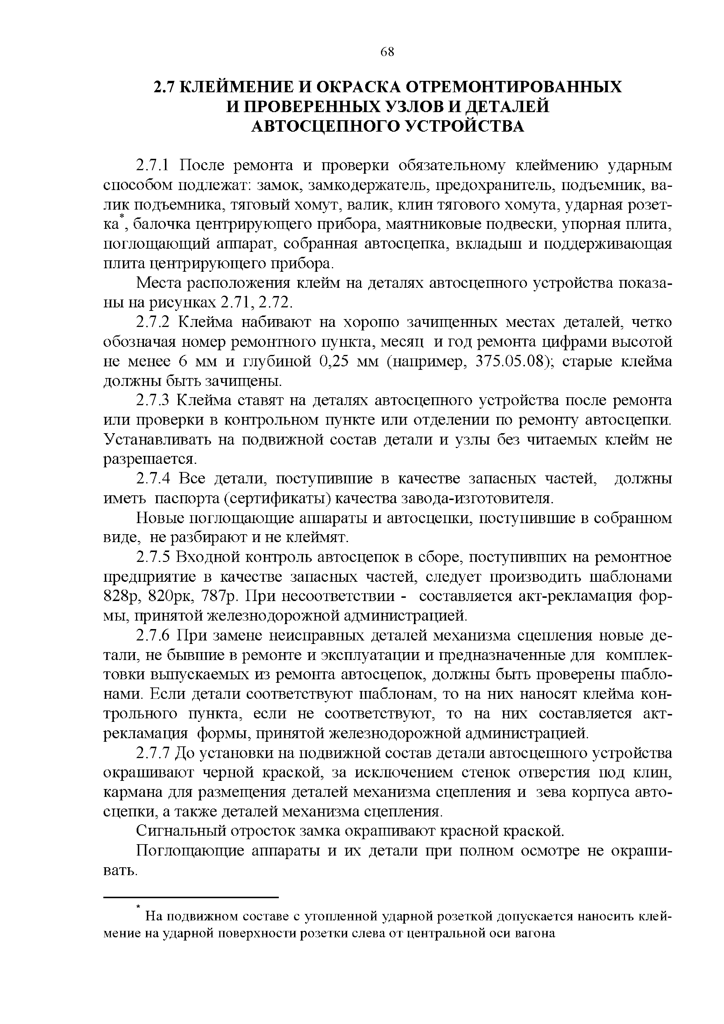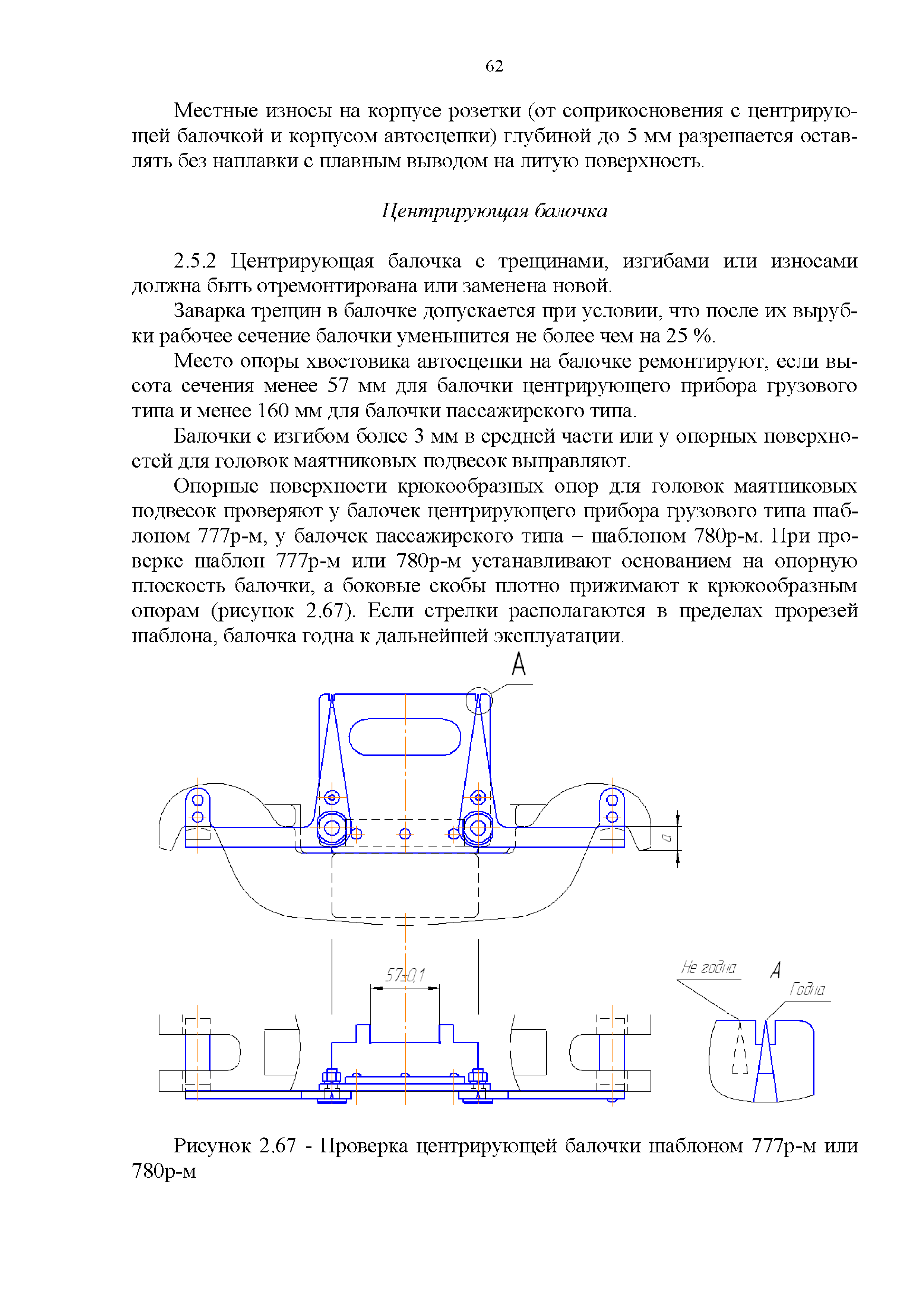 Инструкция по ремонту и обслуживанию автосцепного устройства подвижного состава железных дорог| Статус: | действует | | Название рус.: | Инструкция по ремонту и обслуживанию автосцепного устройства подвижного состава железных дорог | | Дата добавления в базу: | 01.02.2020 | | Дата актуализации: | 01.01.2021 | | Область применения: | Документ предназначен для работников контрольных пунктов автосцепки (КПА) депо и отделений по ремонту автосцепки вагоно- и локомотиворемонтных заводов, а также для специализированных подразделений предприятий по ремонту подвижного состава любой формы собственности, имеющих аттестат установленной формы, выданный железнодорожной администрацией. | | Оглавление: | 1 Общие положения 2 Полный осмотр 2.1 Автосцепка 2.2 Поглощающие аппараты 2.3. Тяговые хомуты 2.4 Клин, валик тягового хомута, упорная плита, передние и задние упоры, поддерживающая планка, планка против истирания 2.5 Детали центрирующего прибора 2.6 Расцепной привод 2.7 Клеймение и окраска отремонтированных и проверенных узлов и деталей автосцепного устройства 2.8 Установка автосцепного устройства 3 Наружный осмотр 4 Проверка автосцепного устройства при техническом обслуживании вагонов и локомотивов 5 Срок гарантии автосцепного устройства Приложение № 1. Примерный перечень оборудования и рекомендуемый технологической оснастки КПА и отделений автосцепки | | Утверждён: | 18.05.2010 Совет по железнодорожному транспорту Государств - участников Содружества (54)