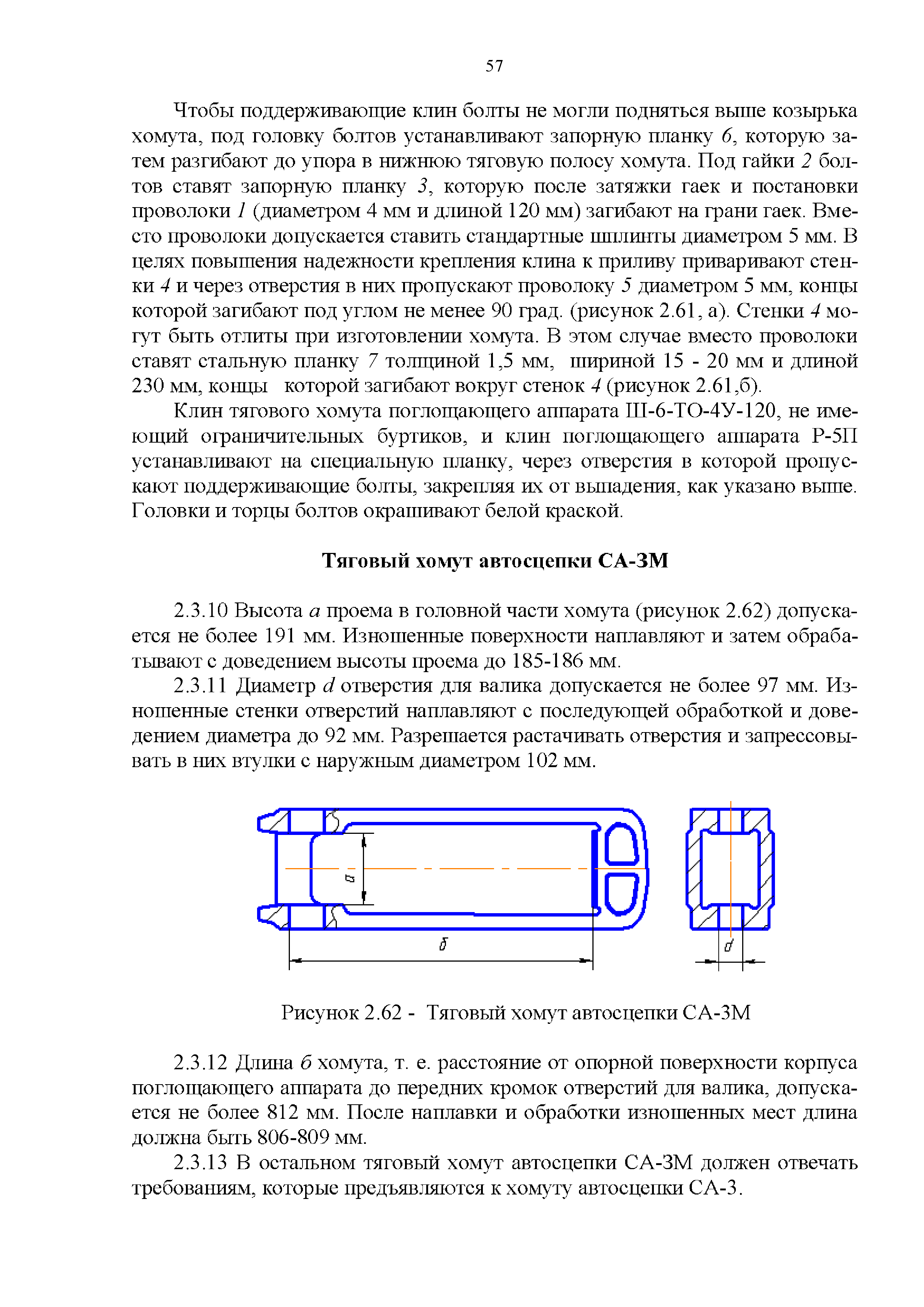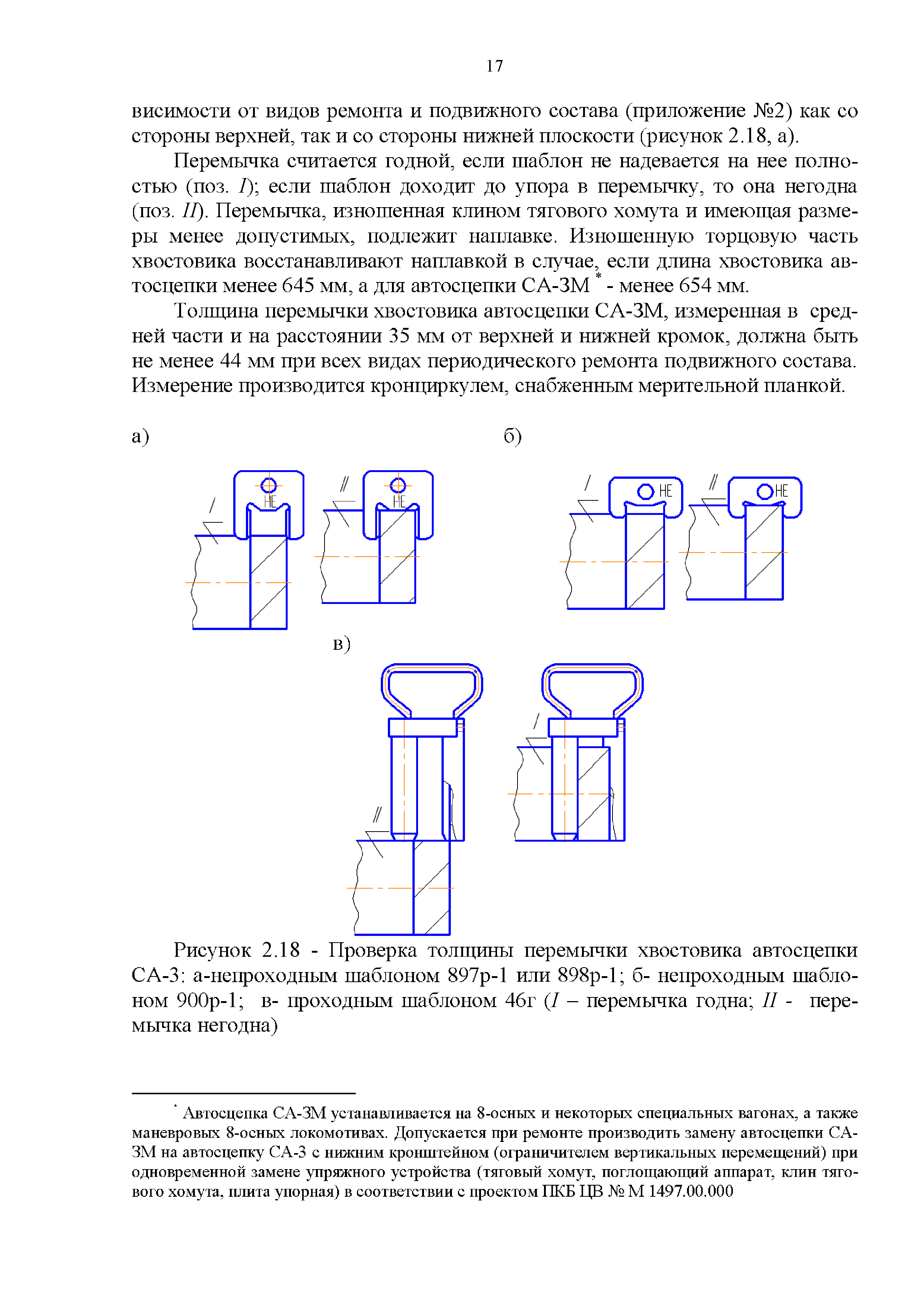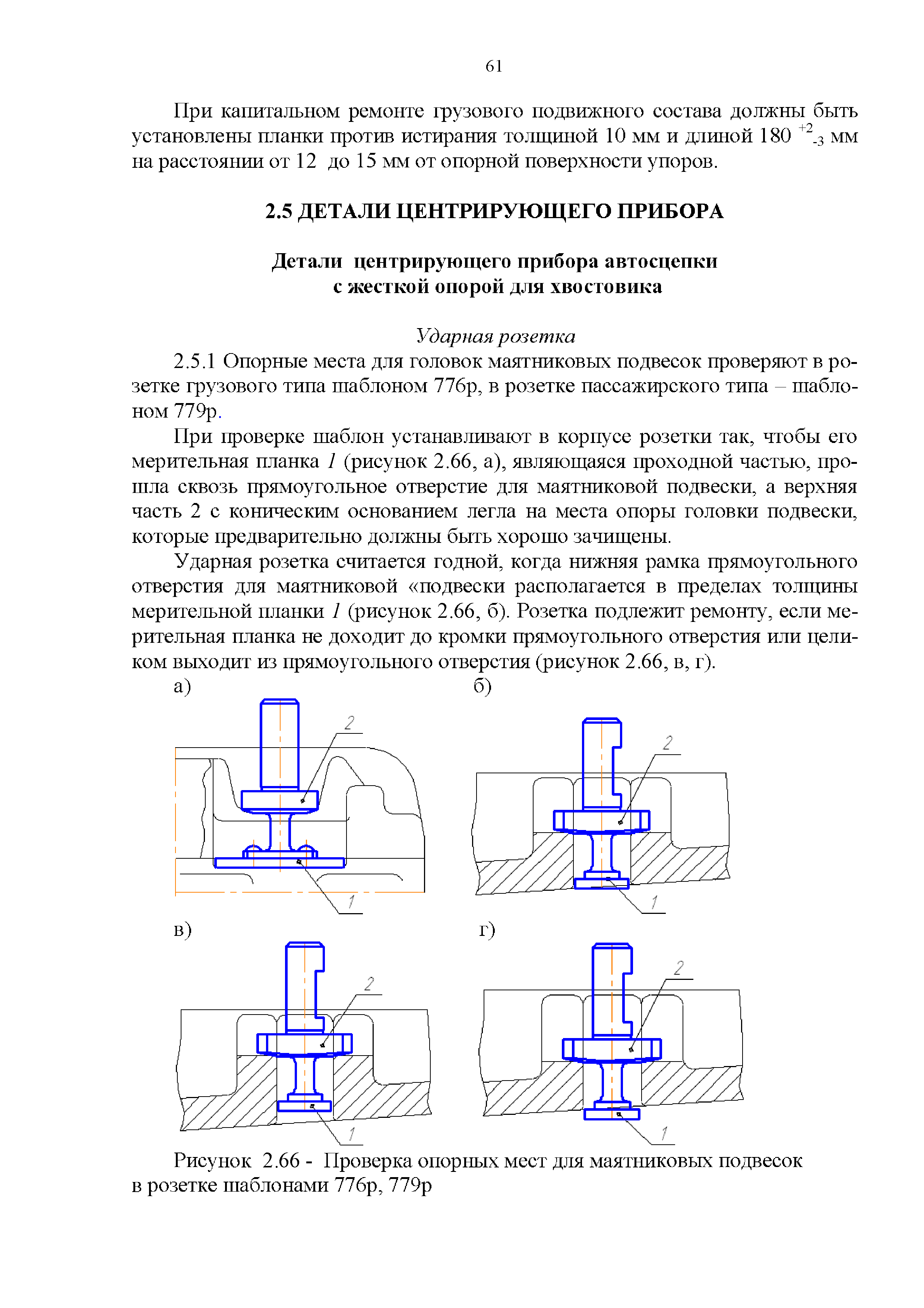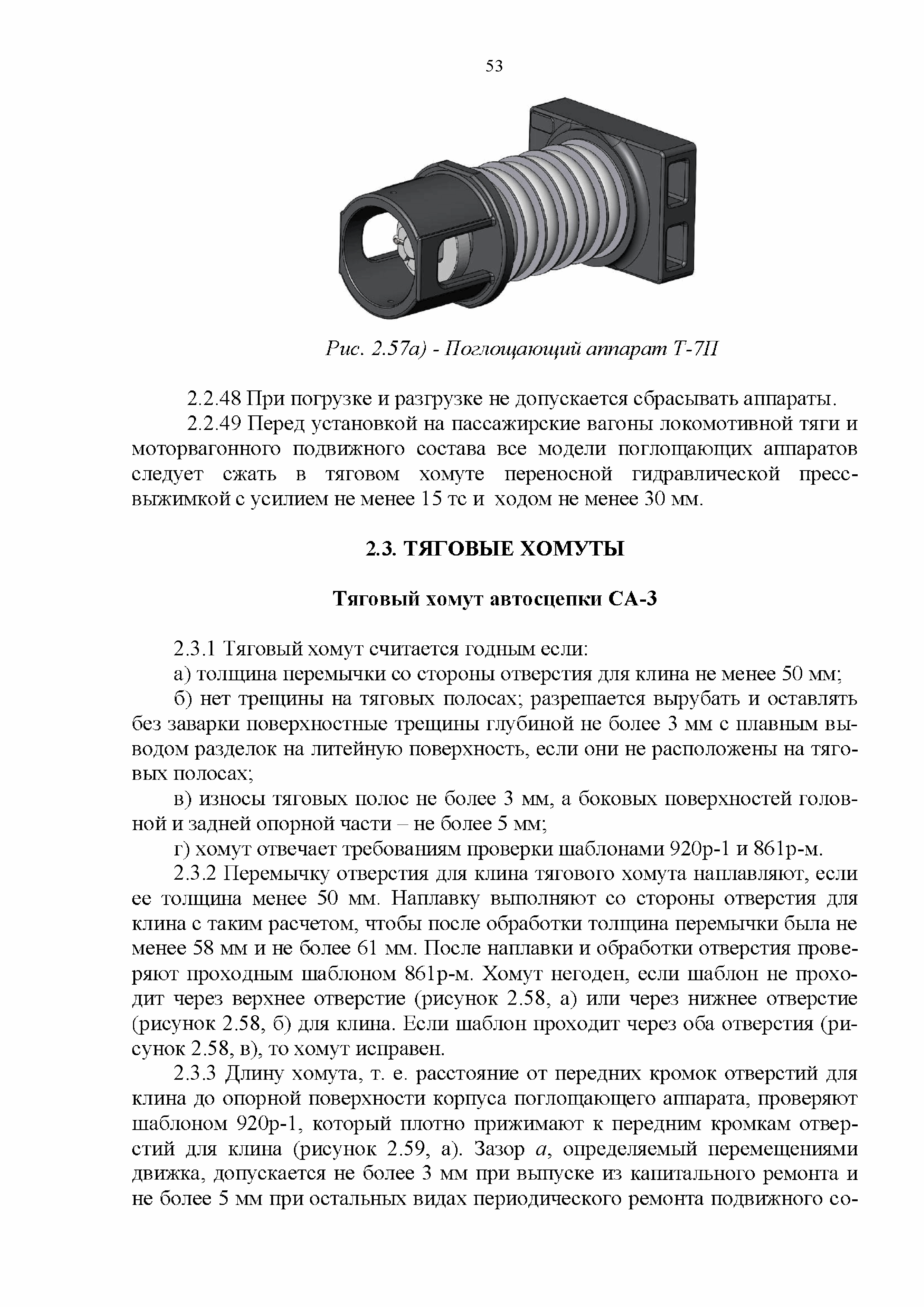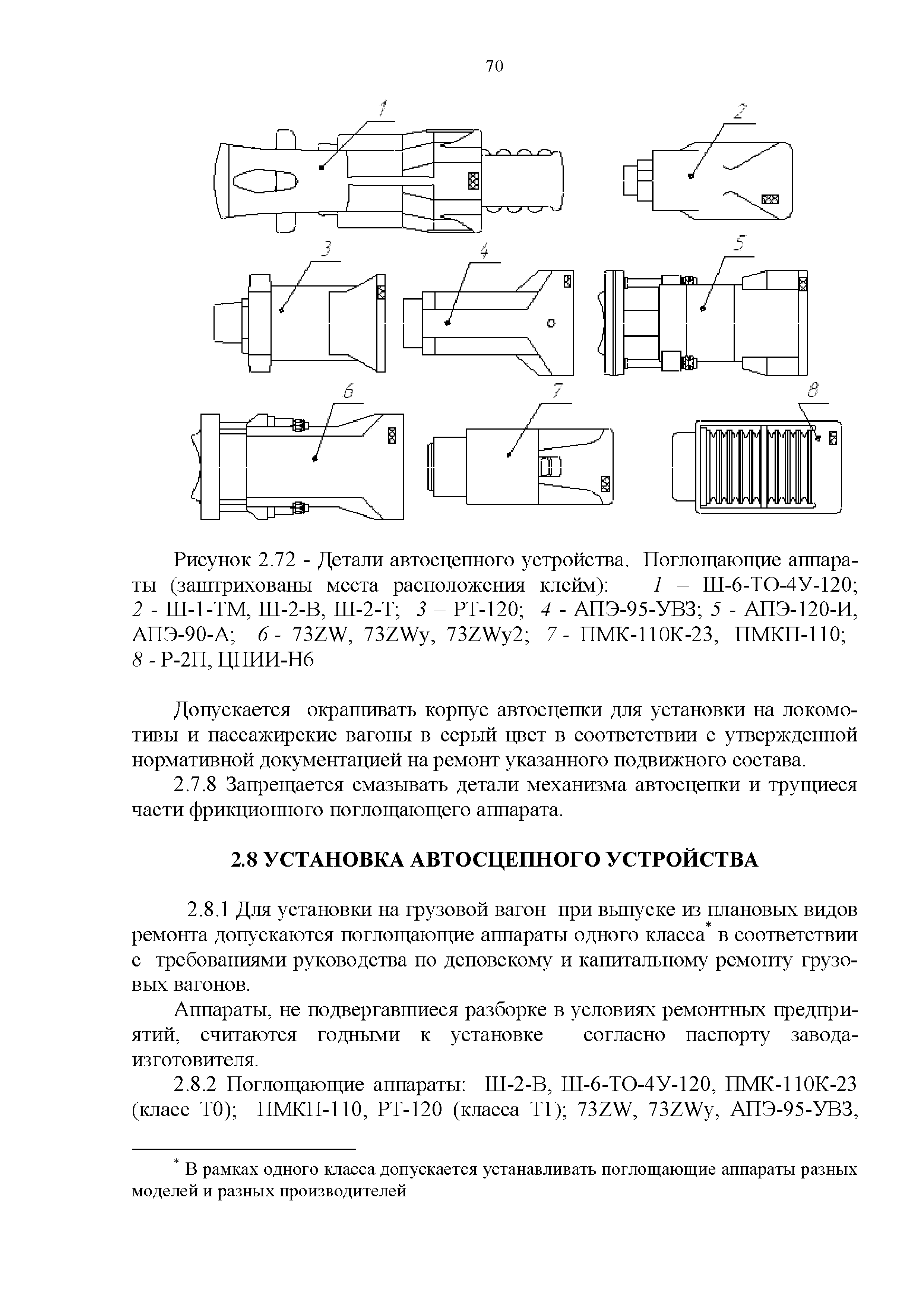 Инструкция по ремонту и обслуживанию автосцепного устройства подвижного состава железных дорог| Статус: | действует | | Название рус.: | Инструкция по ремонту и обслуживанию автосцепного устройства подвижного состава железных дорог | | Дата добавления в базу: | 01.02.2020 | | Дата актуализации: | 01.01.2021 | | Область применения: | Документ предназначен для работников контрольных пунктов автосцепки (КПА) депо и отделений по ремонту автосцепки вагоно- и локомотиворемонтных заводов, а также для специализированных подразделений предприятий по ремонту подвижного состава любой формы собственности, имеющих аттестат установленной формы, выданный железнодорожной администрацией. | | Оглавление: | 1 Общие положения 2 Полный осмотр 2.1 Автосцепка 2.2 Поглощающие аппараты 2.3. Тяговые хомуты 2.4 Клин, валик тягового хомута, упорная плита, передние и задние упоры, поддерживающая планка, планка против истирания 2.5 Детали центрирующего прибора 2.6 Расцепной привод 2.7 Клеймение и окраска отремонтированных и проверенных узлов и деталей автосцепного устройства 2.8 Установка автосцепного устройства 3 Наружный осмотр 4 Проверка автосцепного устройства при техническом обслуживании вагонов и локомотивов 5 Срок гарантии автосцепного устройства Приложение № 1. Примерный перечень оборудования и рекомендуемый технологической оснастки КПА и отделений автосцепки | | Утверждён: | 18.05.2010 Совет по железнодорожному транспорту Государств - участников Содружества (54)