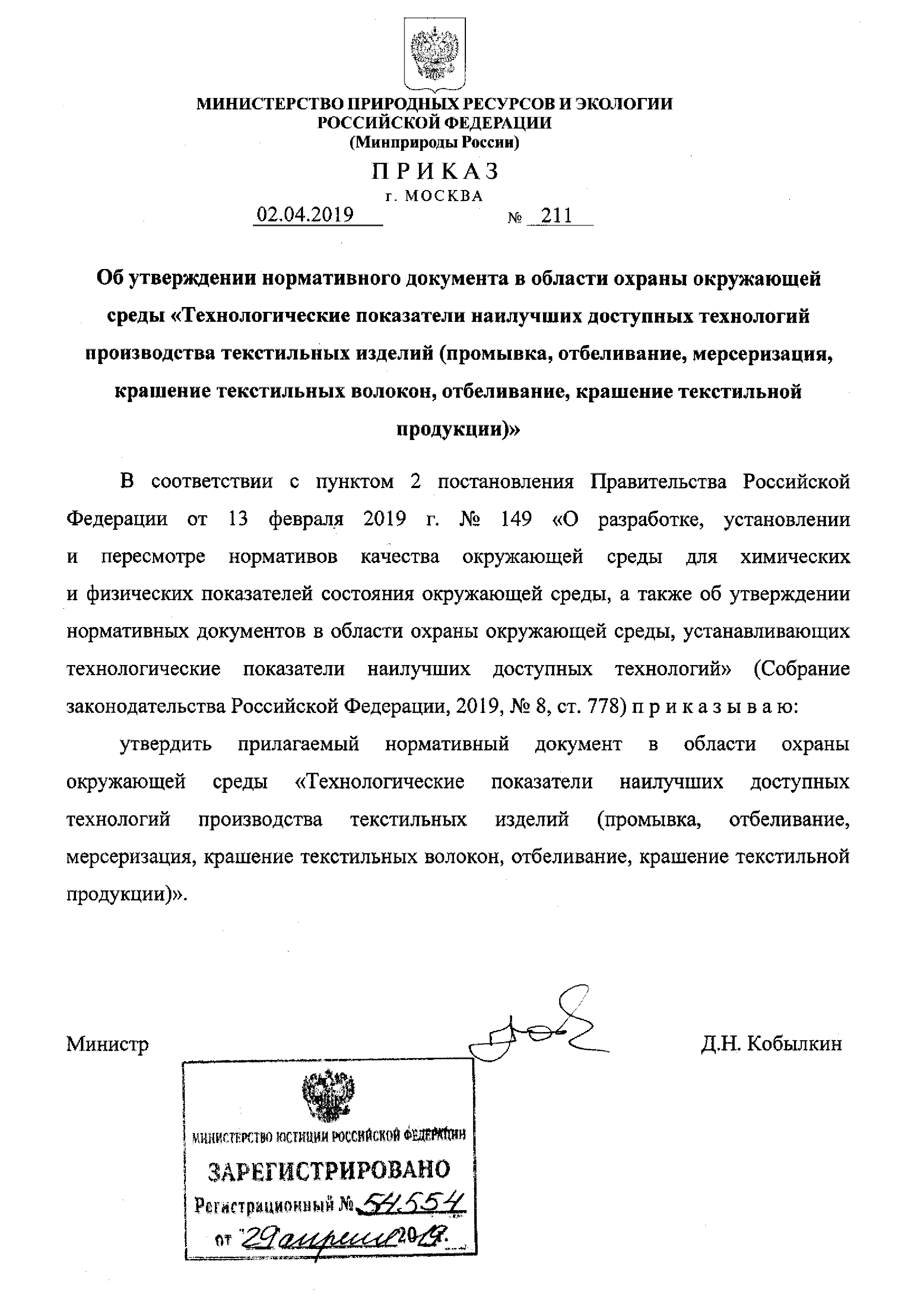 Нормативный документ в области охраны окружающей среды "Технологические показатели наилучших доступных технологий производства текстильных изделий (промывка, отбеливание, мерсеризация‚ крашение текстильных волокон, отбеливание, крашение текстильной продукции)"| Статус: | действует | | Название рус.: | Нормативный документ в области охраны окружающей среды "Технологические показатели наилучших доступных технологий производства текстильных изделий (промывка, отбеливание, мерсеризация‚ крашение текстильных волокон, отбеливание, крашение текстильной продукции)" | | Дата добавления в базу: | 01.02.2020 | | Дата актуализации: | 01.01.2021 | | Дата введения: | 11.05.2019 | | Утверждён: | 02.04.2019 Минприроды России (Russian Federation Minprirody 211)
