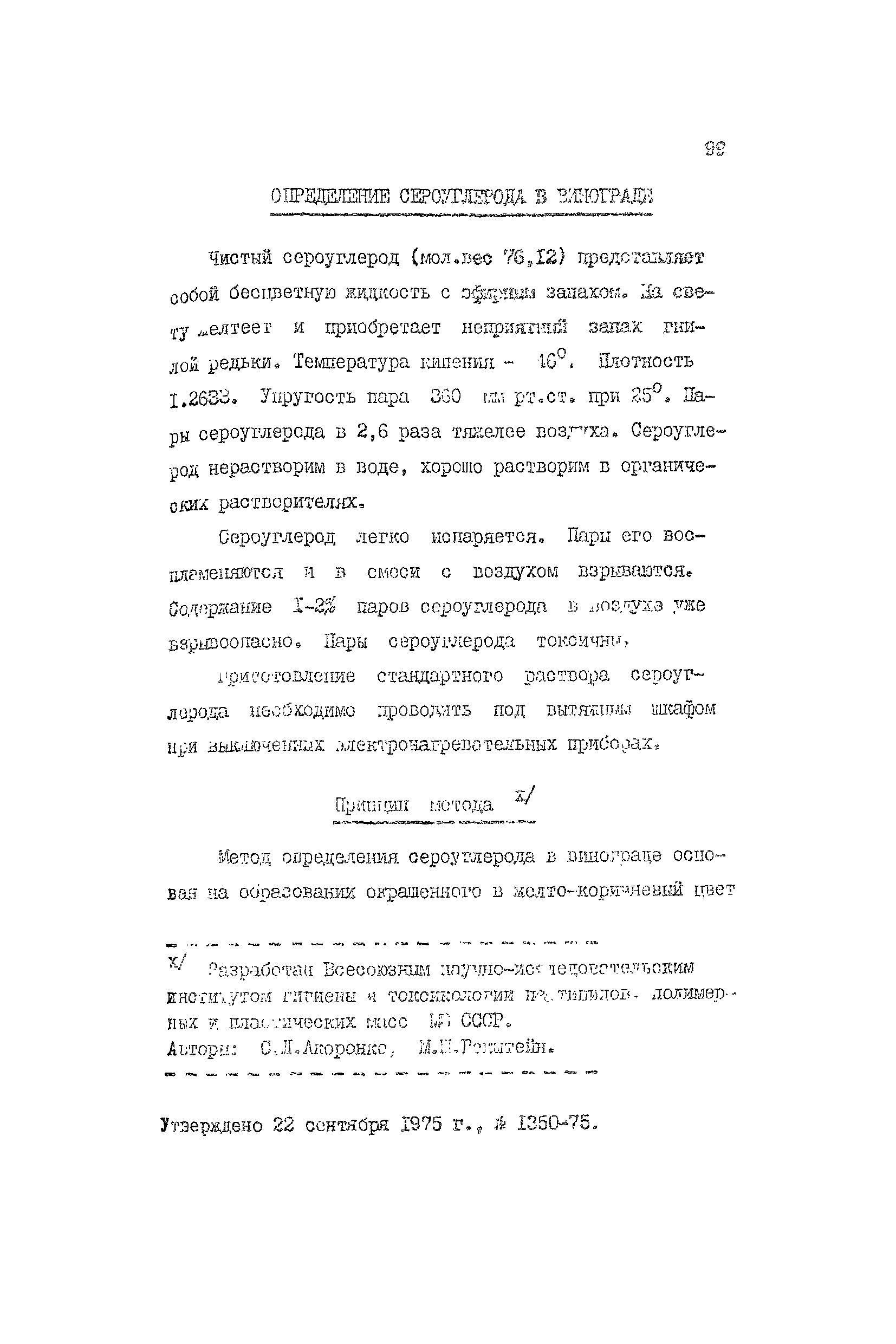 Определение сероуглерода в винограде| Статус: | действует | | Название рус.: | Определение сероуглерода в винограде | | Дата добавления в базу: | 01.02.2020 | | Дата актуализации: | 01.01.2021 | | Оглавление: | Принцип метода Реактивы и растворы Приготовление стандартного раствора Приборы и посуда Описание определения | | Разработан: | Всесоюзный научно-исследовательский институт гигиены и токсикологии пестицидов, полимерных и пластических масс
