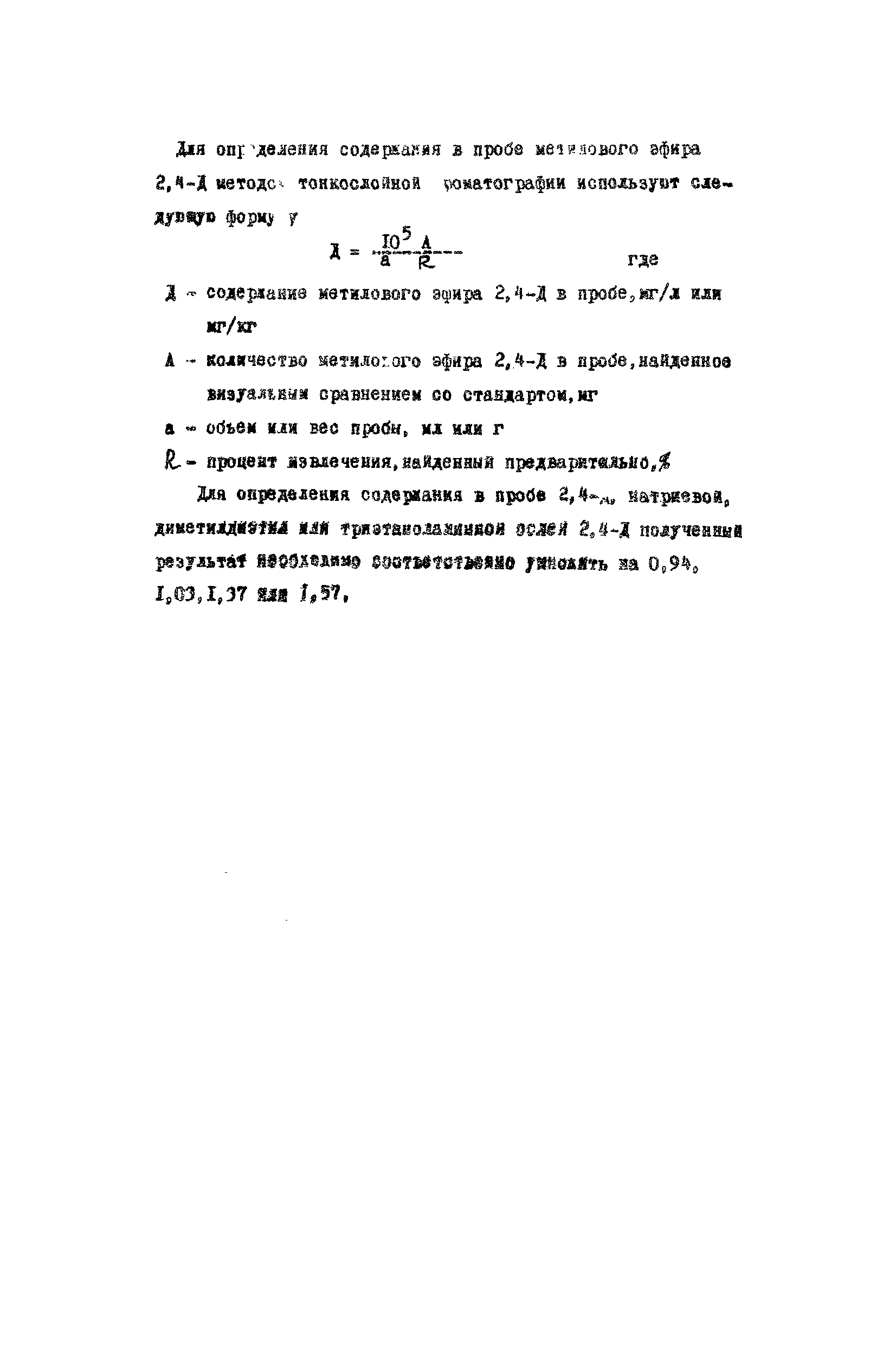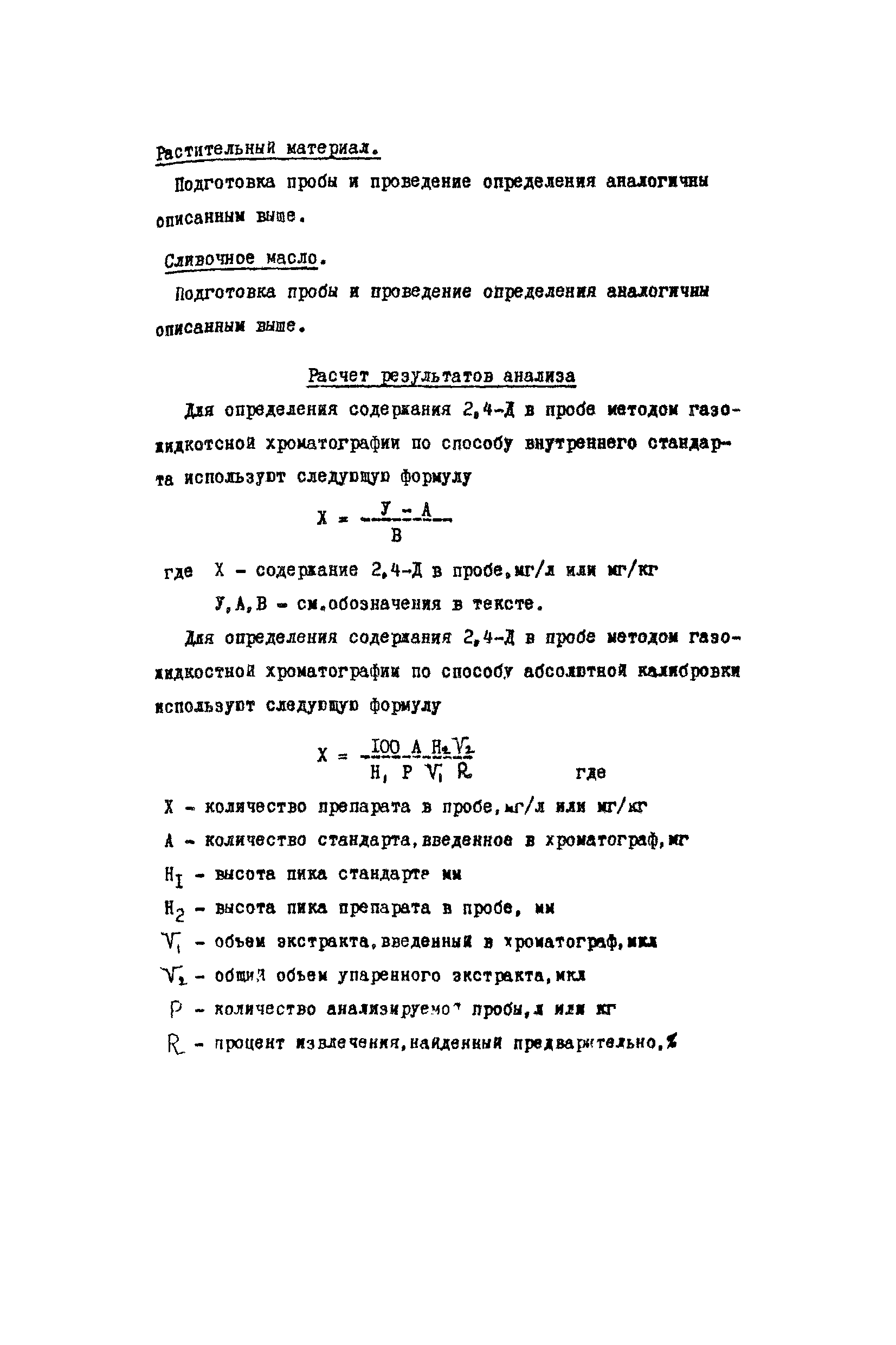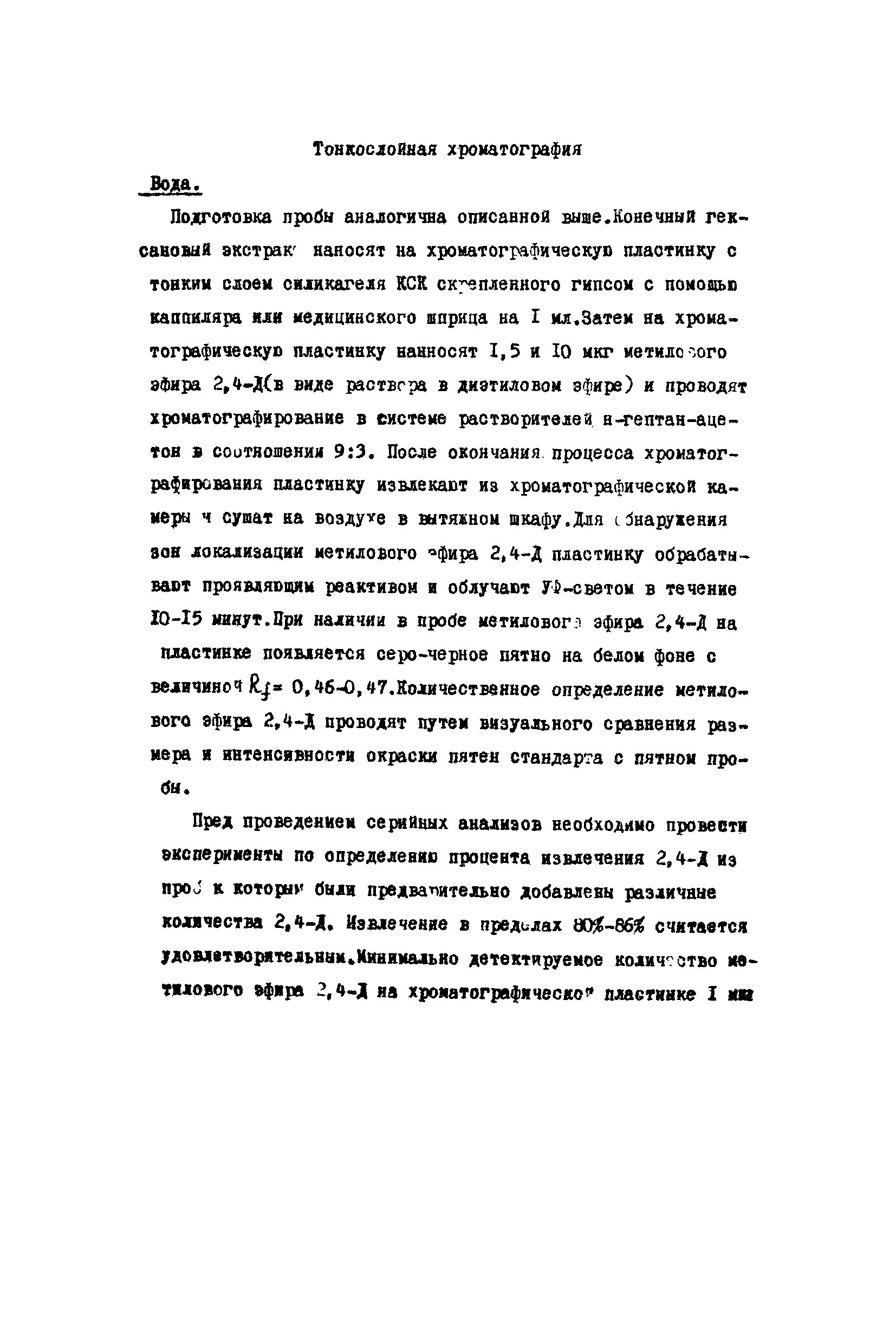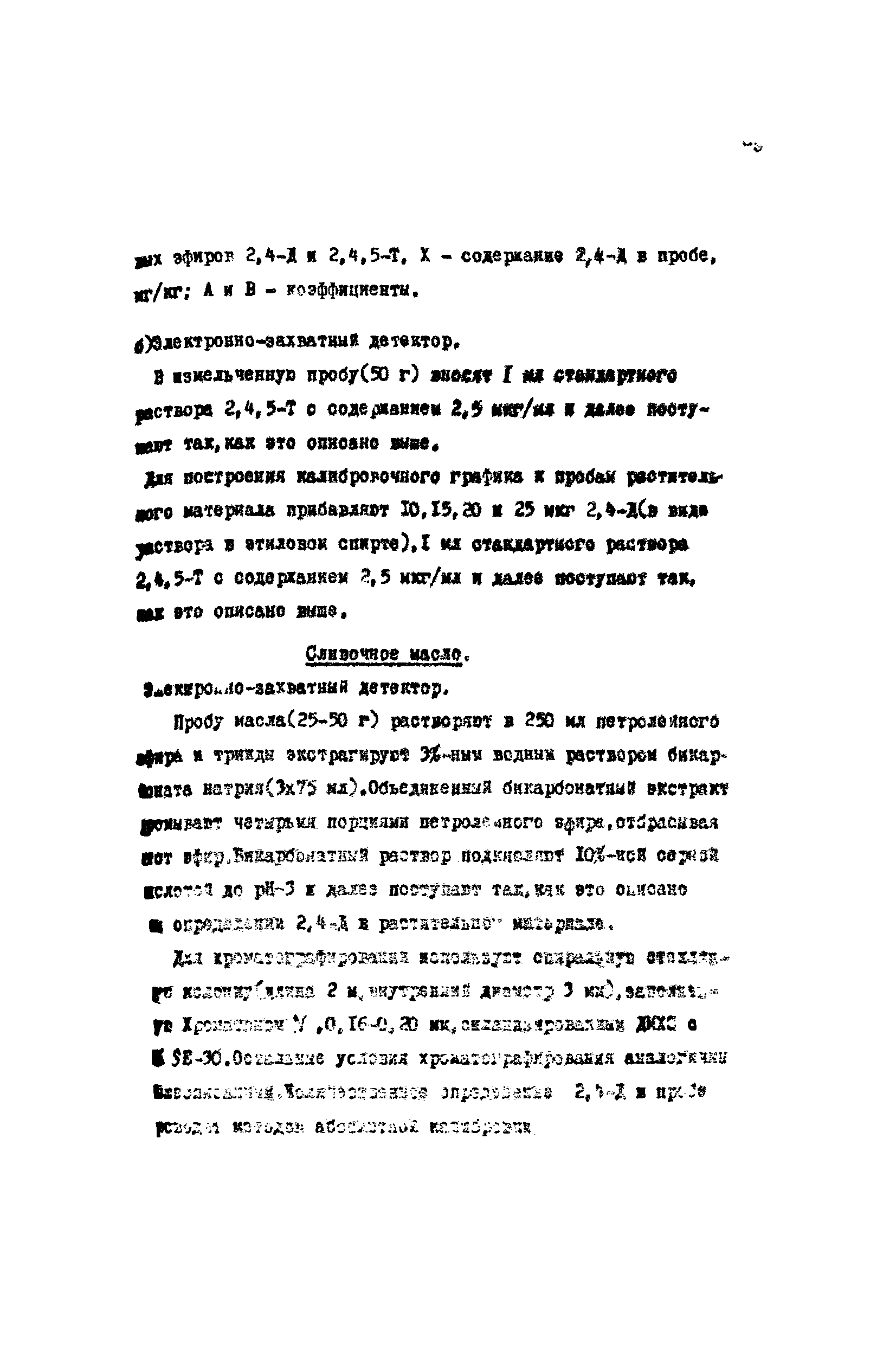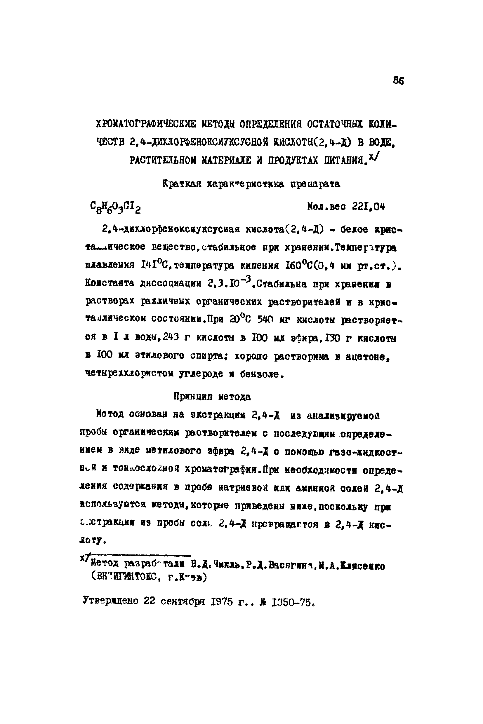 Хроматографические методы определения остаточных количеств 2,4-дихлорфеноксиуксусной кислоты (2,4-Д) в воде, растительном материале и продуктах питания| Статус: | действует | | Название рус.: | Хроматографические методы определения остаточных количеств 2,4-дихлорфеноксиуксусной кислоты (2,4-Д) в воде, растительном материале и продуктах питания | | Дата добавления в базу: | 01.02.2020 | | Дата актуализации: | 01.01.2021 | | Оглавление: | Краткая характеристика препарата Принцип метода Реактивы и растворы Приборы и посуда Ход анализа Вода Растительный материал Сливочное масло Тонкослойная хроматография Расчет результатов анализа | | Разработан: | ВНИИГИНТОКС