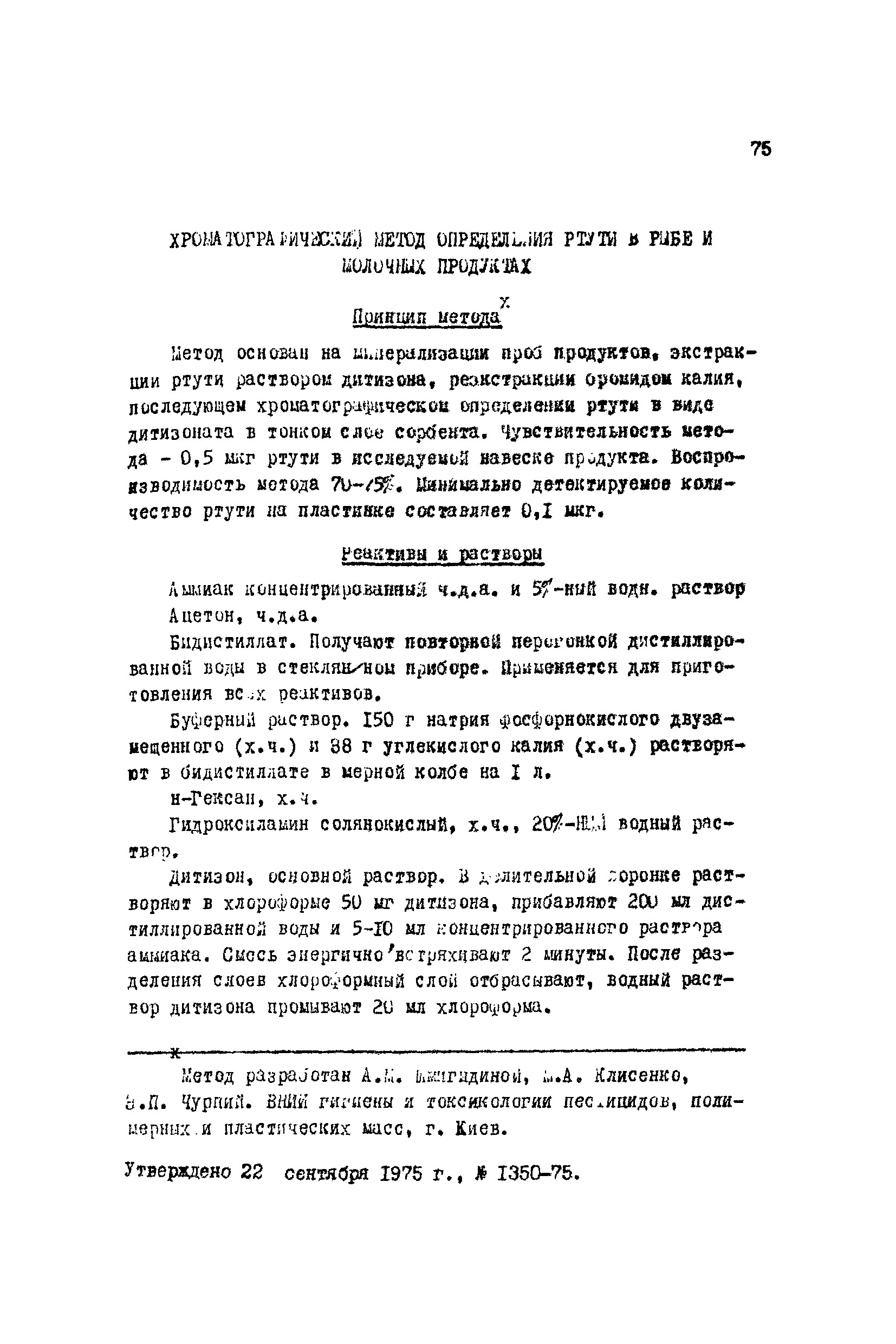 Хроматографический метод определения ртути в рыбе и молочных продуктах| Статус: | действует | | Название рус.: | Хроматографический метод определения ртути в рыбе и молочных продуктах | | Дата добавления в базу: | 01.02.2020 | | Дата актуализации: | 01.01.2021 | | Оглавление: | Принцип метода Реактивы и растворы Приготовление хроматографических пластин с закрепленным слоем сорбента Приборы и посуда Выделение ртути из проб Хроматографирование Вычисление результатов анализа | | Разработан: | ВНИИ гигиены и токсикологии пестицидов, полимерных и пластических масс