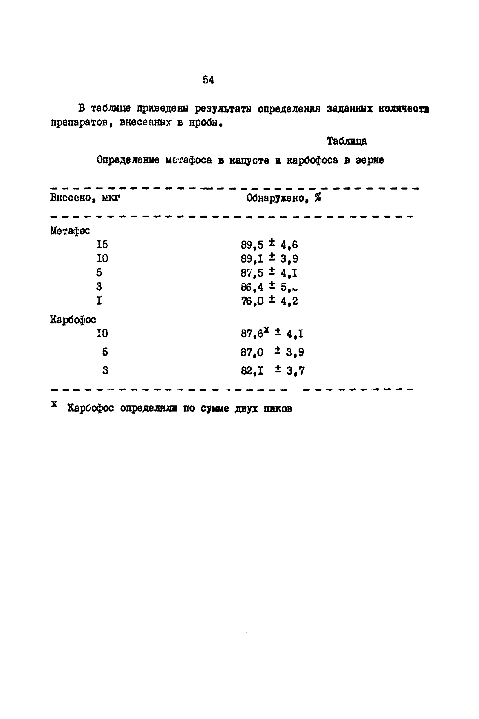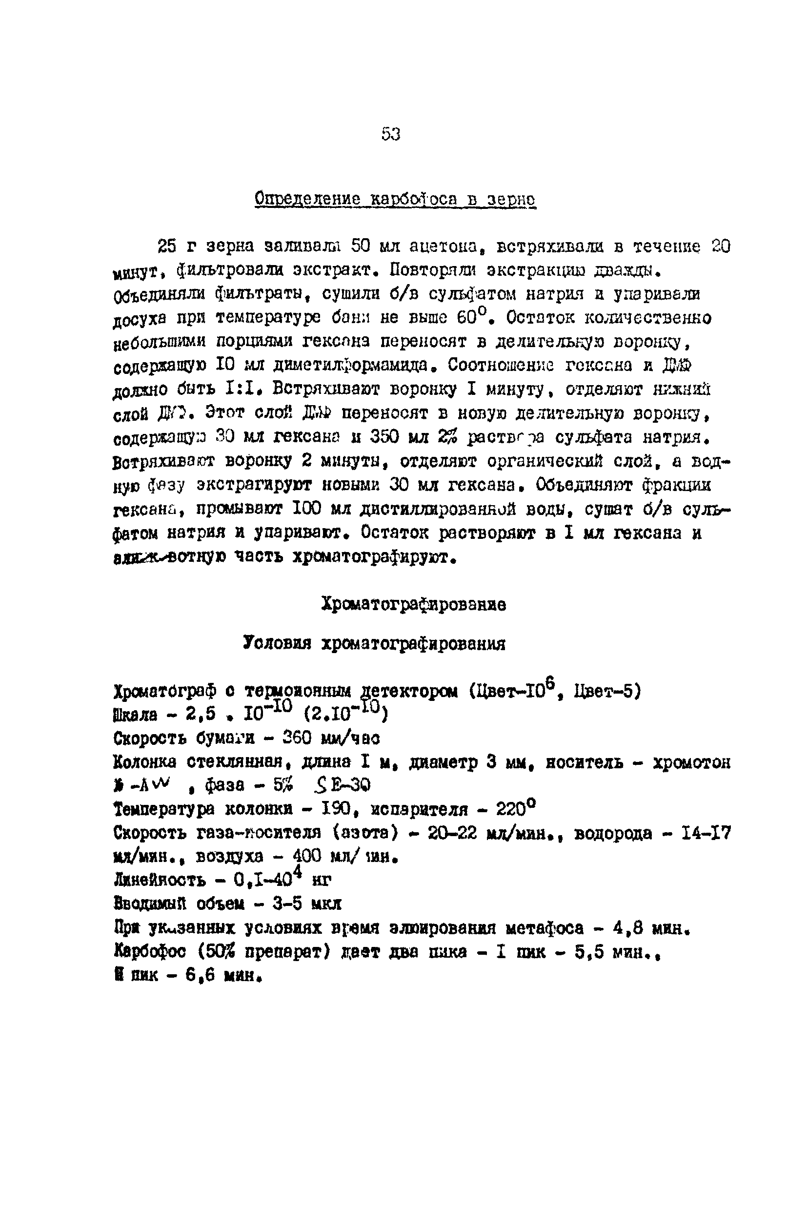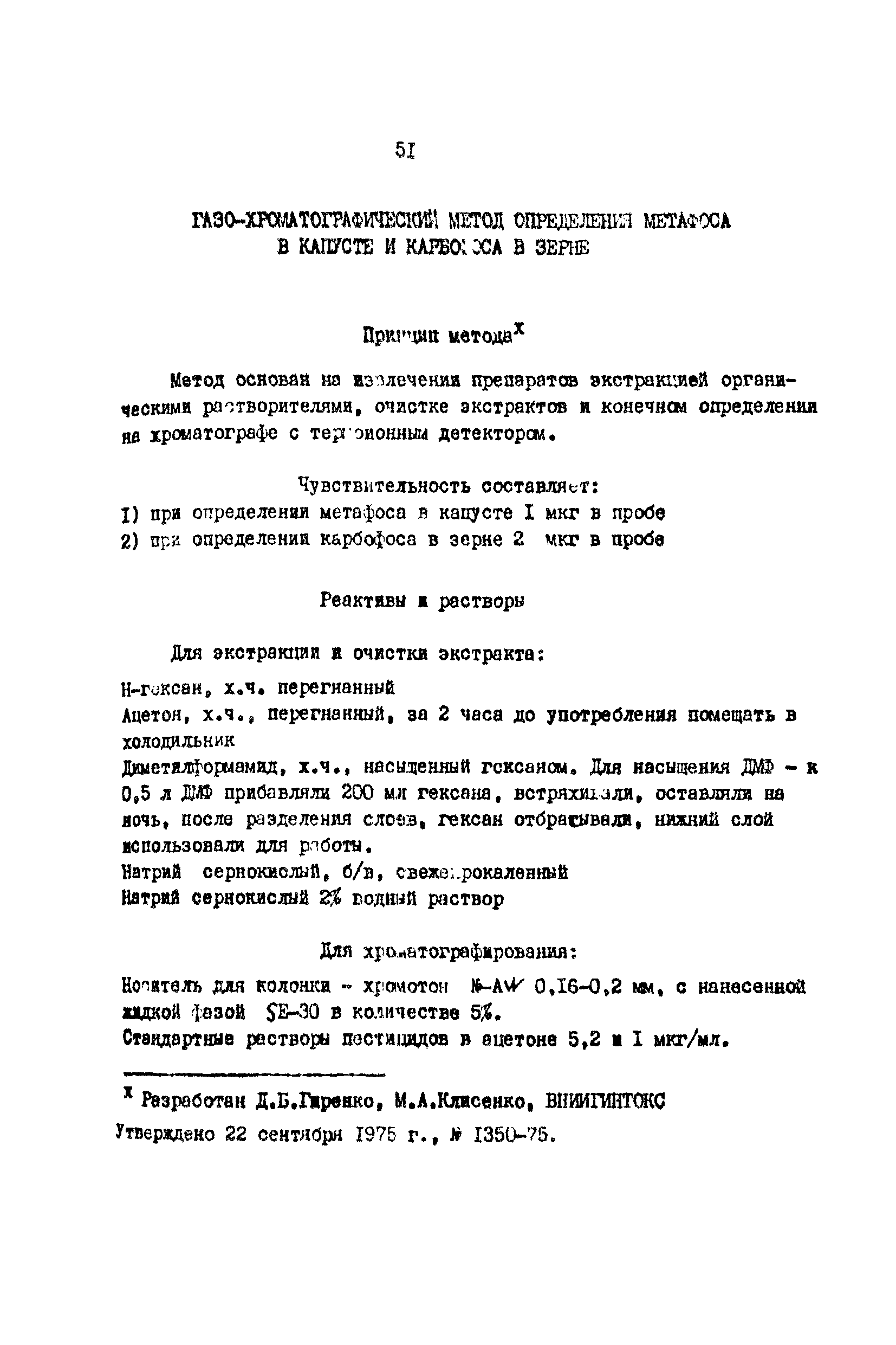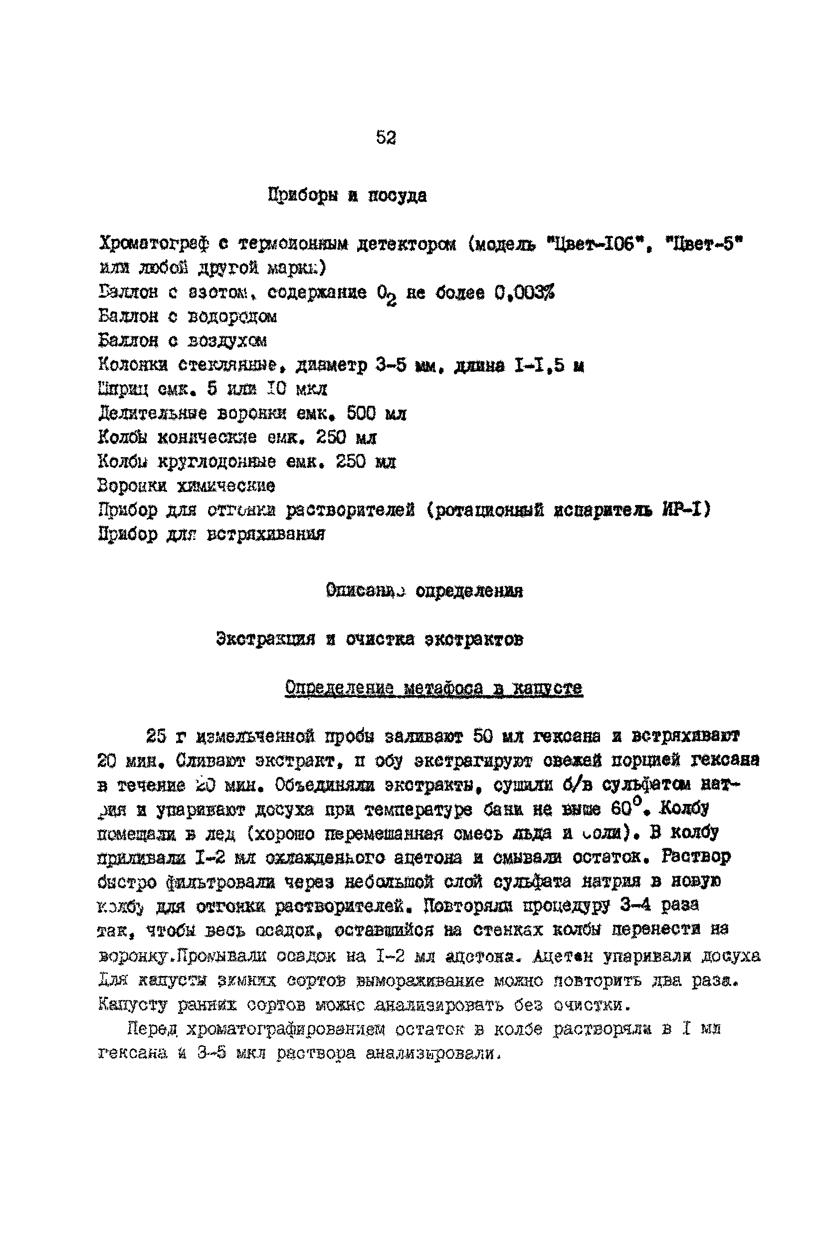 Газо-хроматографический метод определения метафоса в капусте и карбофоса в зерне| Статус: | действует | | Название рус.: | Газо-хроматографический метод определения метафоса в капусте и карбофоса в зерне | | Дата добавления в базу: | 01.02.2020 | | Дата актуализации: | 01.01.2021 | | Оглавление: | Принцип метода Реактивы и растворы Приборы и посуда Описание определения. Экстракция и очистка экстрактов. Определение метафоса в капусте Определение карбофоса в зерне Хроматографирование. Условия хроматографирования | | Разработан: | ВНИИГИНТОКС