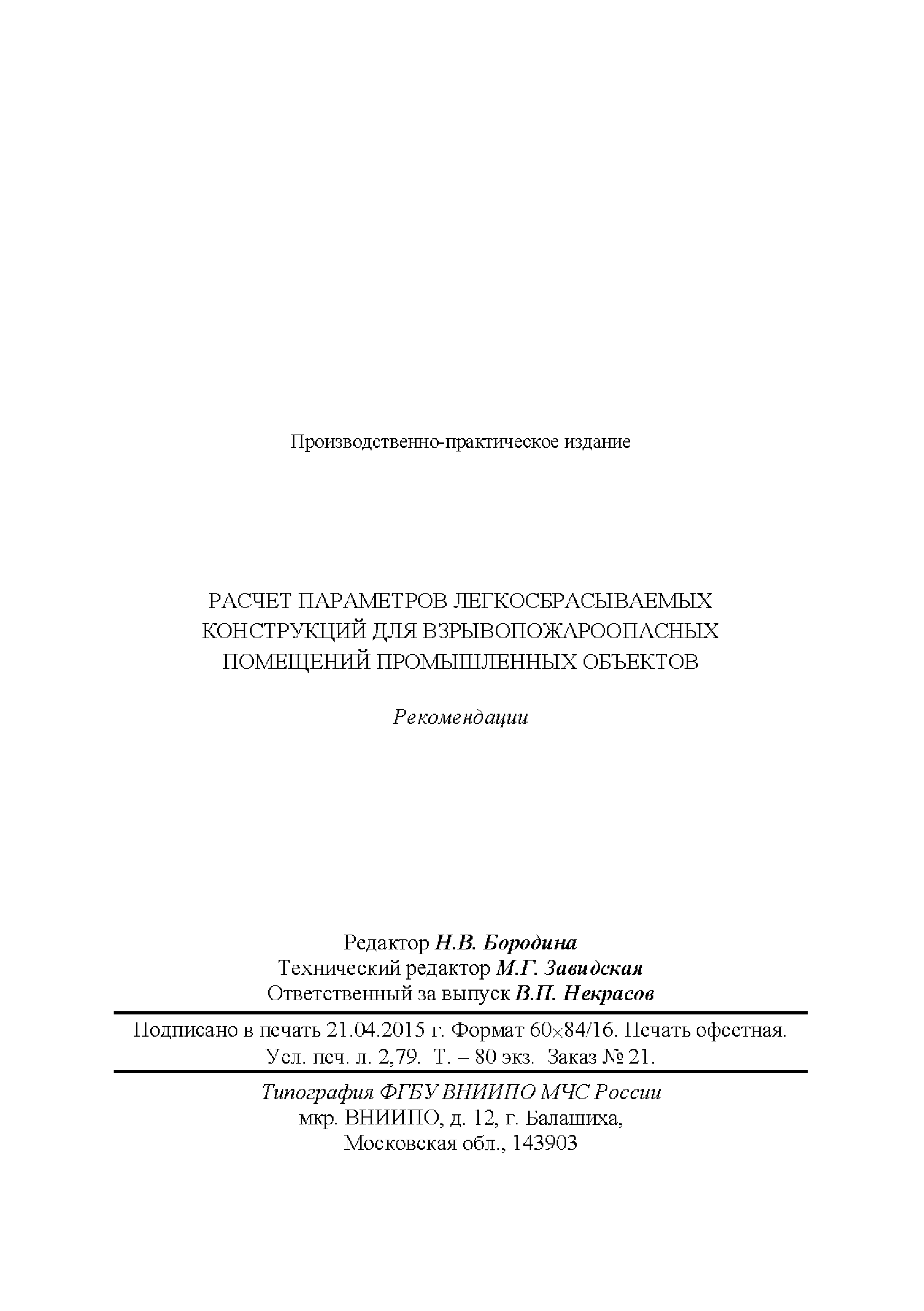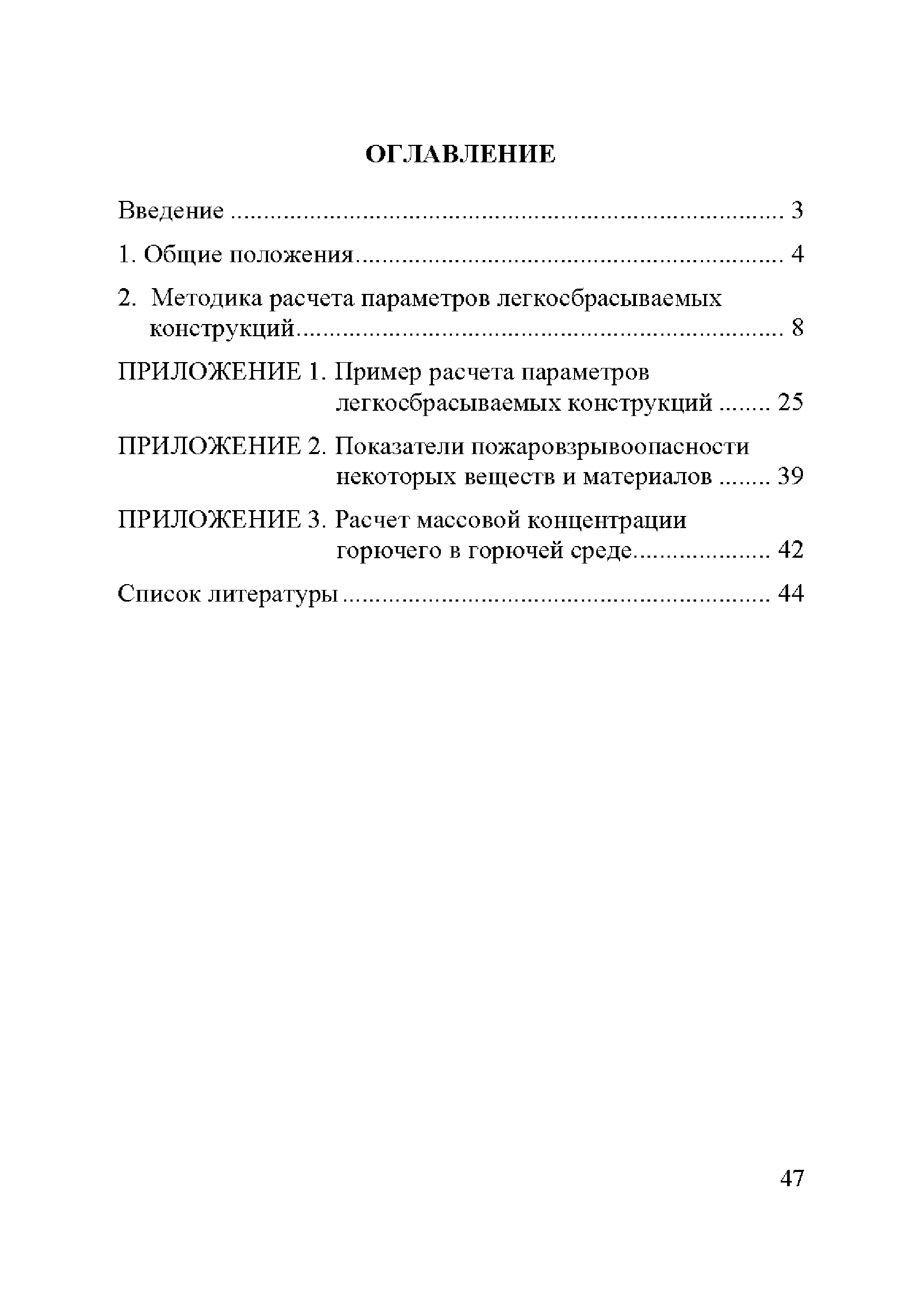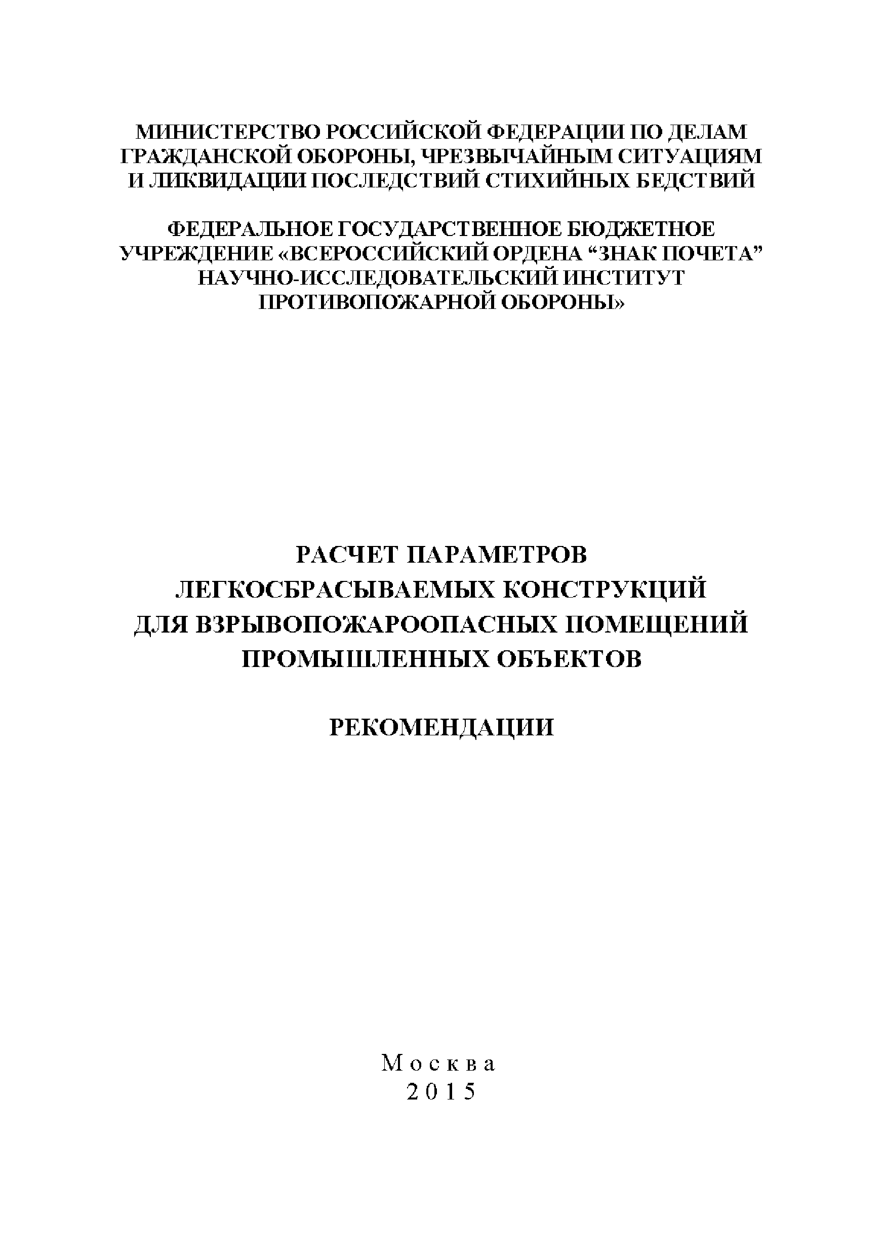| Оглавление: | Введение 1 Общие положения 2 Методика расчета параметров легкосбрасываемых конструкций Приложение 1. Пример расчета параметров легкосбрасываемых конструкций Приложение 2. Показатели пожаровзрывоопасности некоторых веществ и материалов Приложение 3. Расчет массовой концентрации горючего в горючей среде Список литературы |