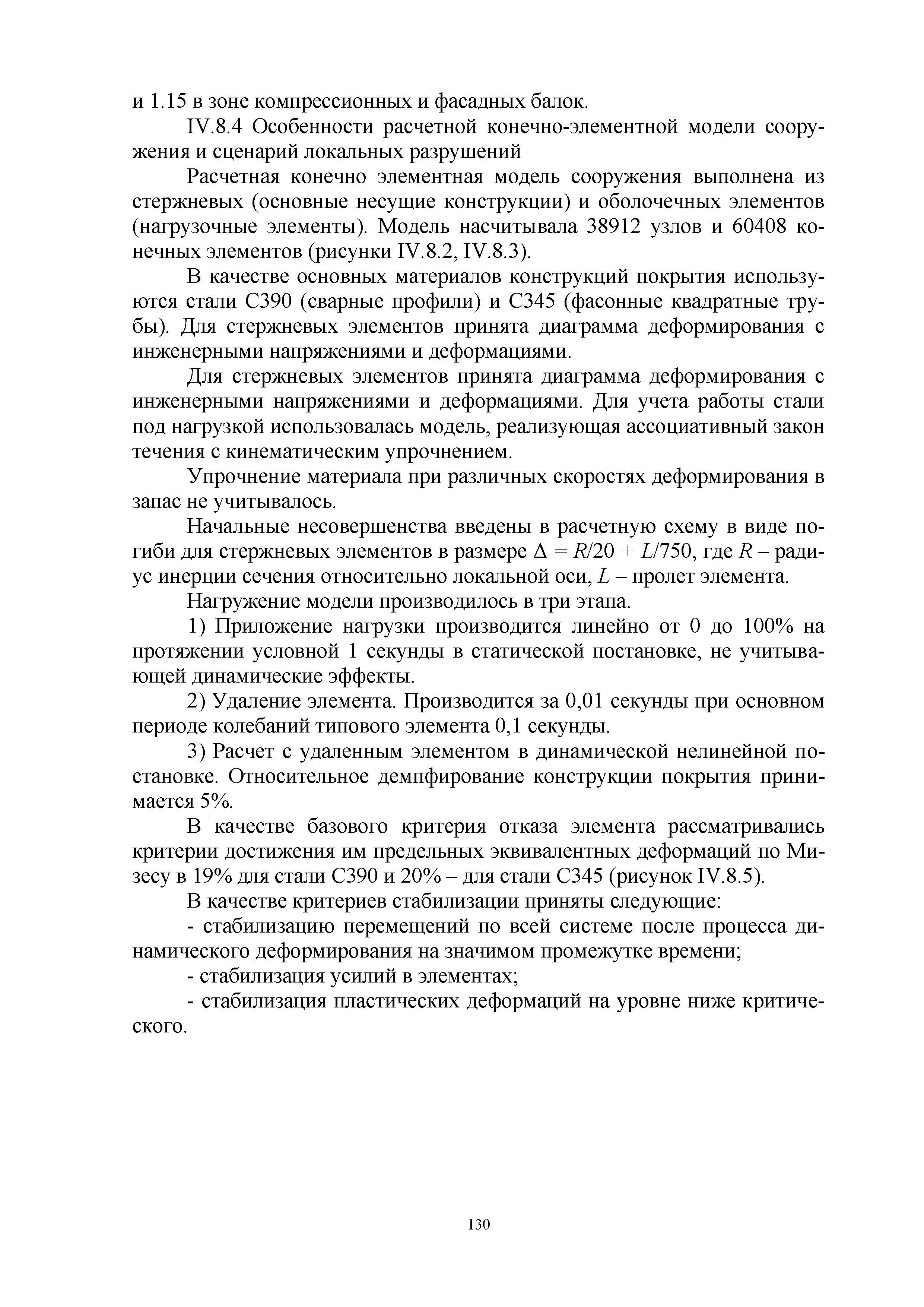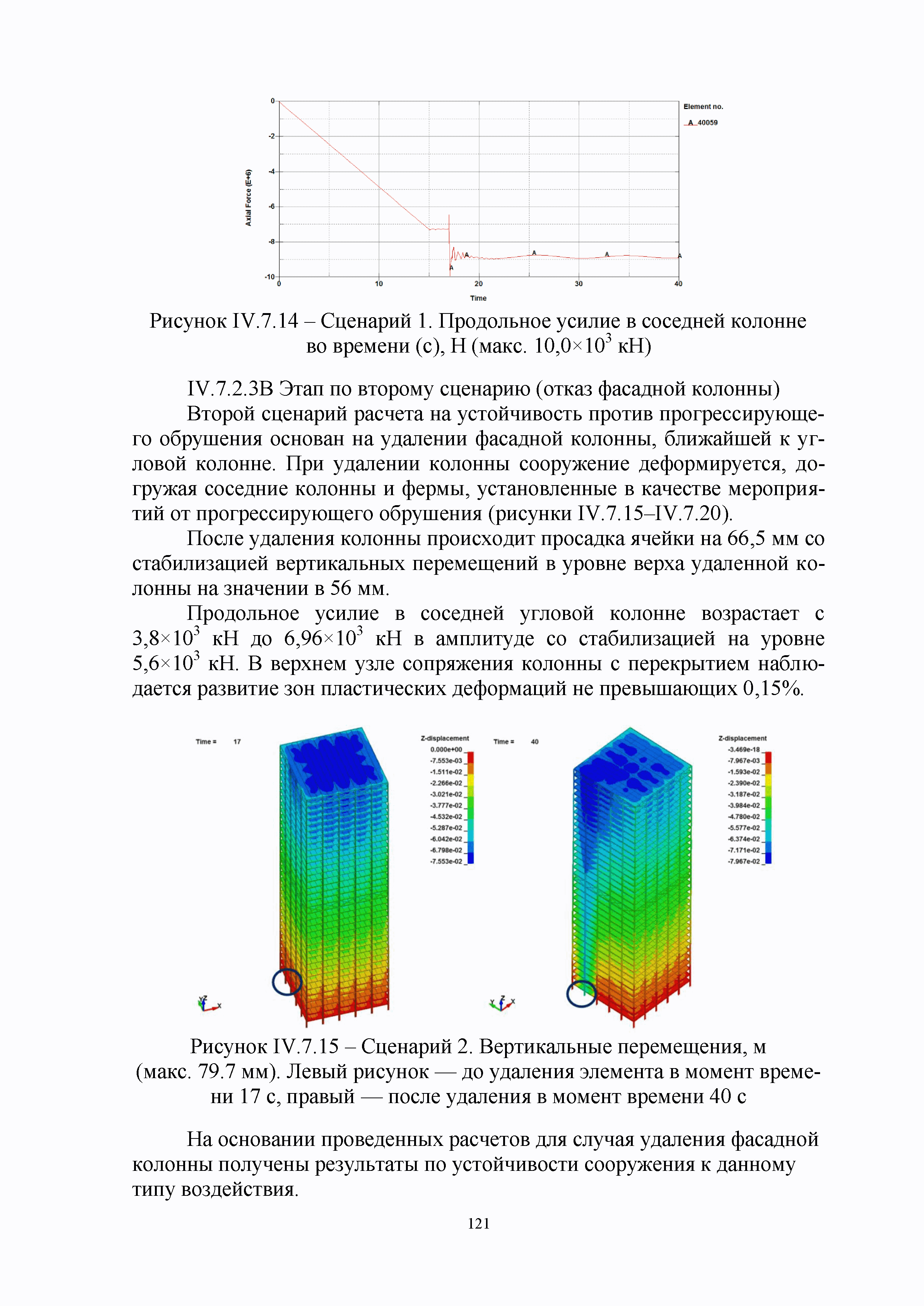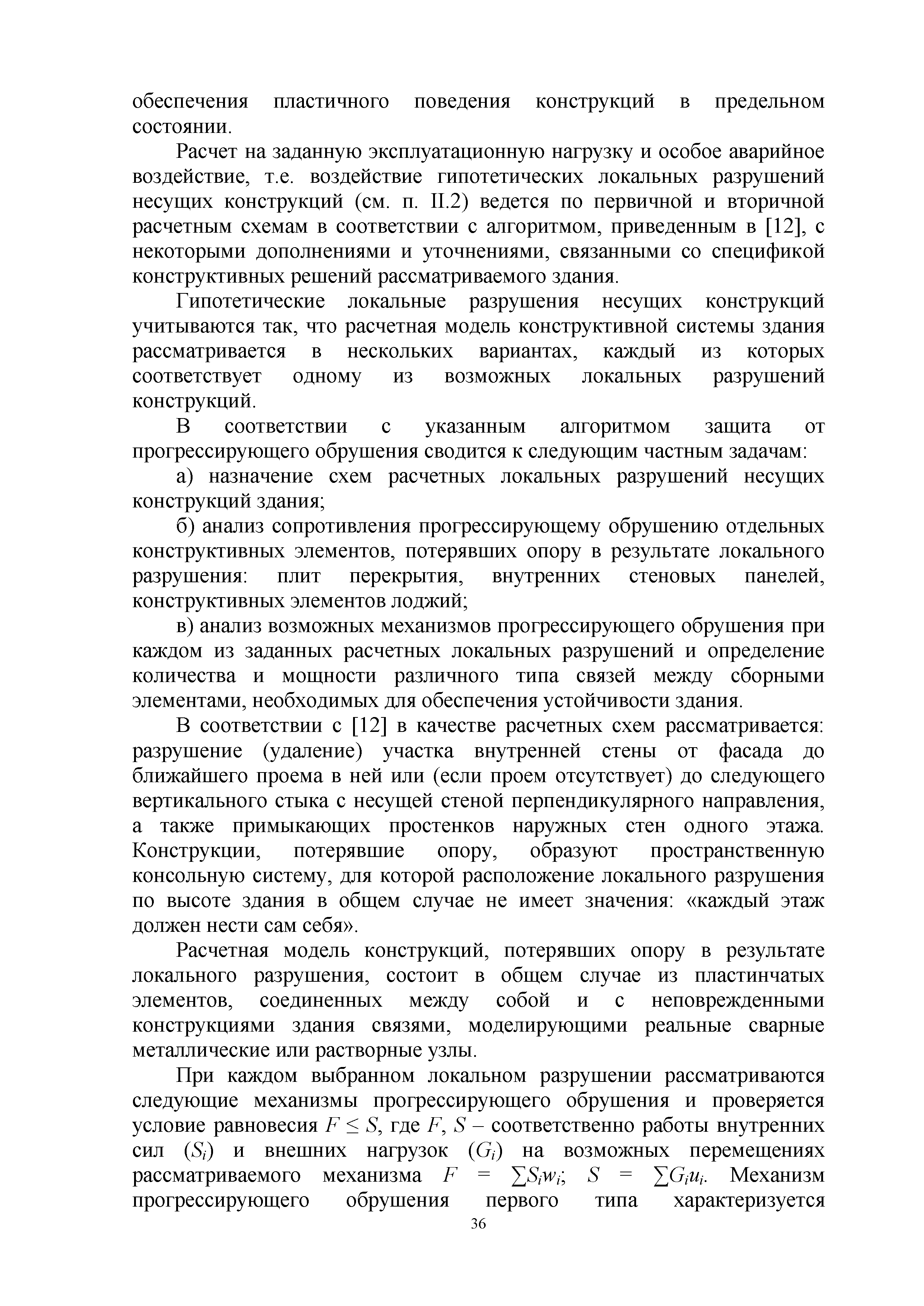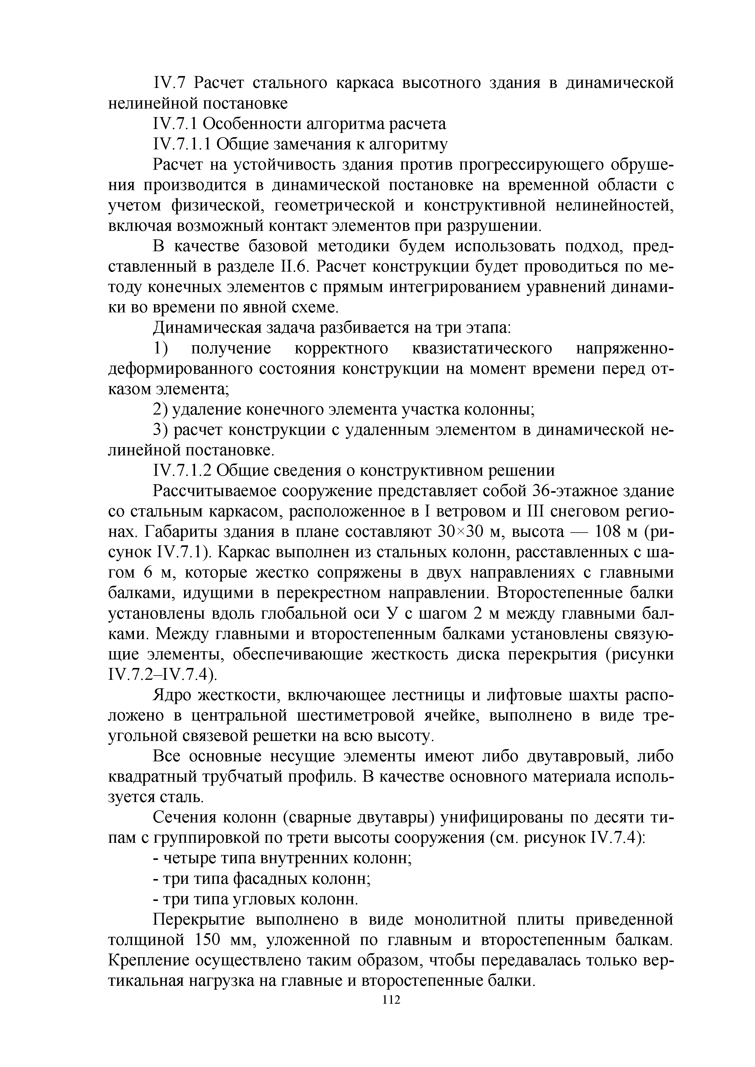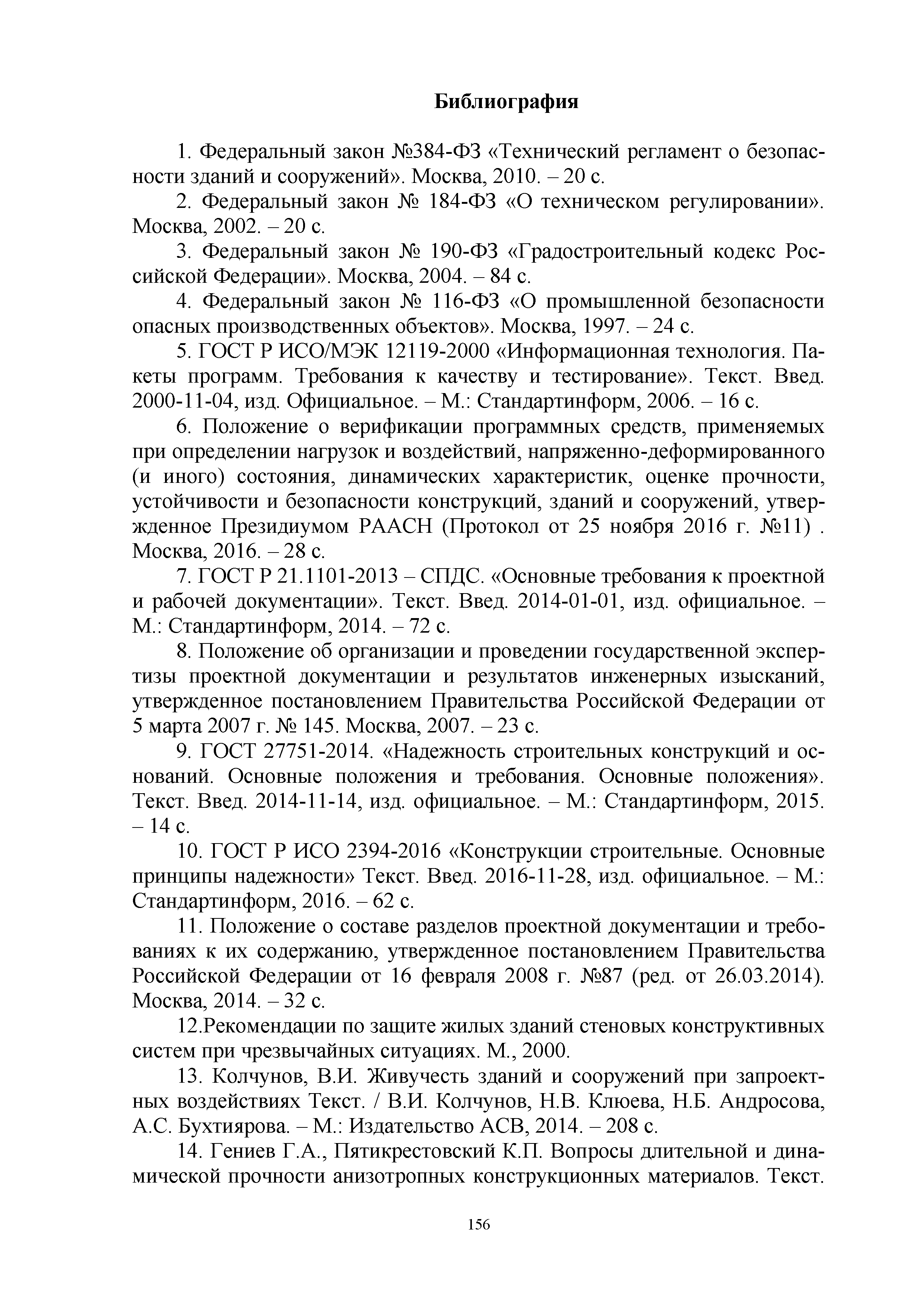 | Оглавление: | Введение 1 Основные положения 1.1 Область применения 1.2 Нормативные ссылки 1.3 Термины и определения 1.4 Общие требования II Исходные данные и методики расчета защиты прогрессирующего обрушения II.1 Характеристики строительных материалов, конструкций и критерии особого предельного состояния II.2 Нагрузки и воздействия II.3 Требования к расчетным моделям II.4 Расчет в квазистатической постановке II.5 Расчет кинематическим методом теории предельного равновесия II.6 Расчет в динамической постановке III Конструктивные мероприятия по защите зданий и сооружений различных конструктивных систем прогрессирующего обрушения III.1 Общие положения III.2 Многоэтажные каркасные здания III.3 Крупнопанельные, кирпичные и комбинированные конструкции зданий и сооружений III.4 Одноэтажные каркасные здания IV Примеры расчета по защите зданий и сооружений прогрессирующего обрушения IV.1 Расчет 17-этажного панельного жилого дома IV.2 Расчет фрагмента кирпичного здания храма IV.3 Расчет производственного шестиэтажного здания с рамно-связевым каркасом IV.3 Расчет каркаса одноэтажного производственного здания IV.4 Расчет каркаса многоэтажного здания с монолитным железобетонным каркасом IV. 5 Расчет защиты эксплуатируемого складчатого пространственного покрытия от прогрессирующего обрушения IV.6 Расчет защиты пространственного покрытия производственного здания из панелей-оболочек коммуникационного типа (КСО) от прогрессирующего обрушения IV.7 Расчет стального каркаса высотного здания в динамической нелинейной постановке IV.8 Расчет стального покрытия большепролетного сооружения в динамической нелинейной постановке Приложение А. Рекомендации по составу и оформлению отчетной документации по результатам расчетов строительных конструкций зданий и сооружений на прогрессирующее обрушение Библиография |
