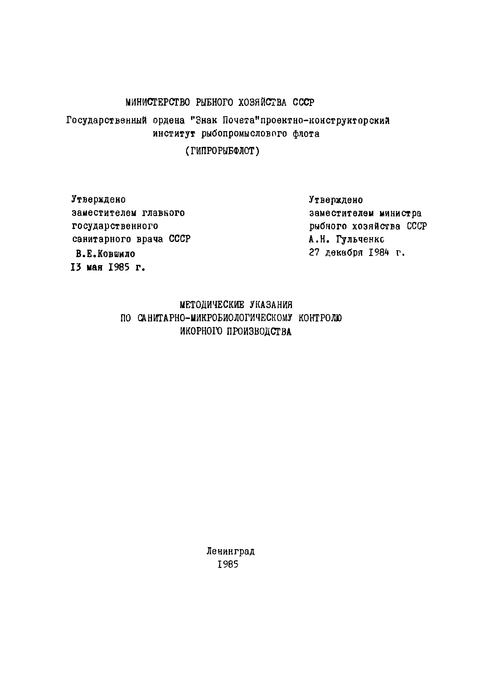 | Утверждён: | 13.05.1985 Заместитель Главного государственного санитарного врача CCCР 27.12.1984 Заместитель министра рыбного хозяйства СССР |