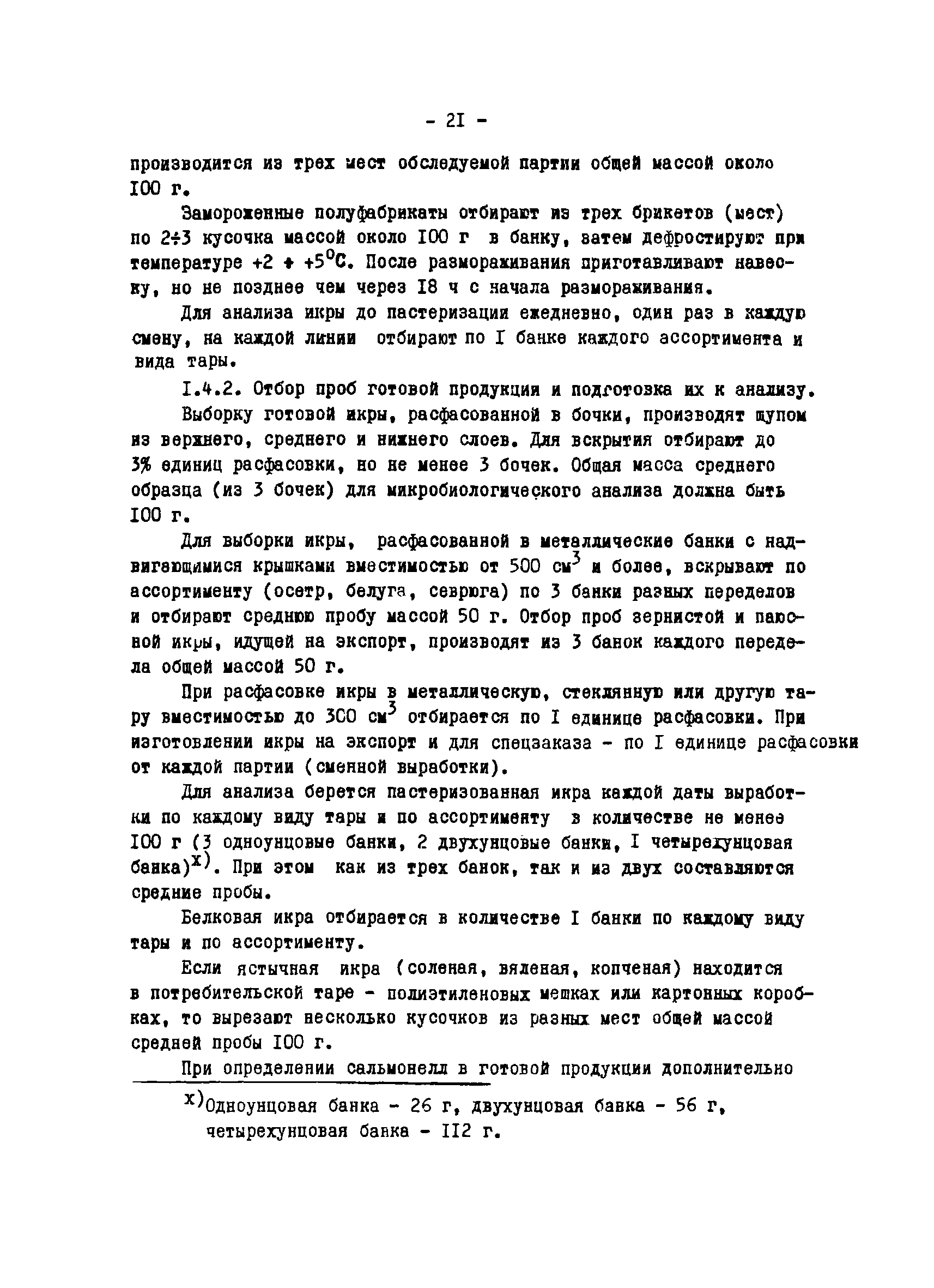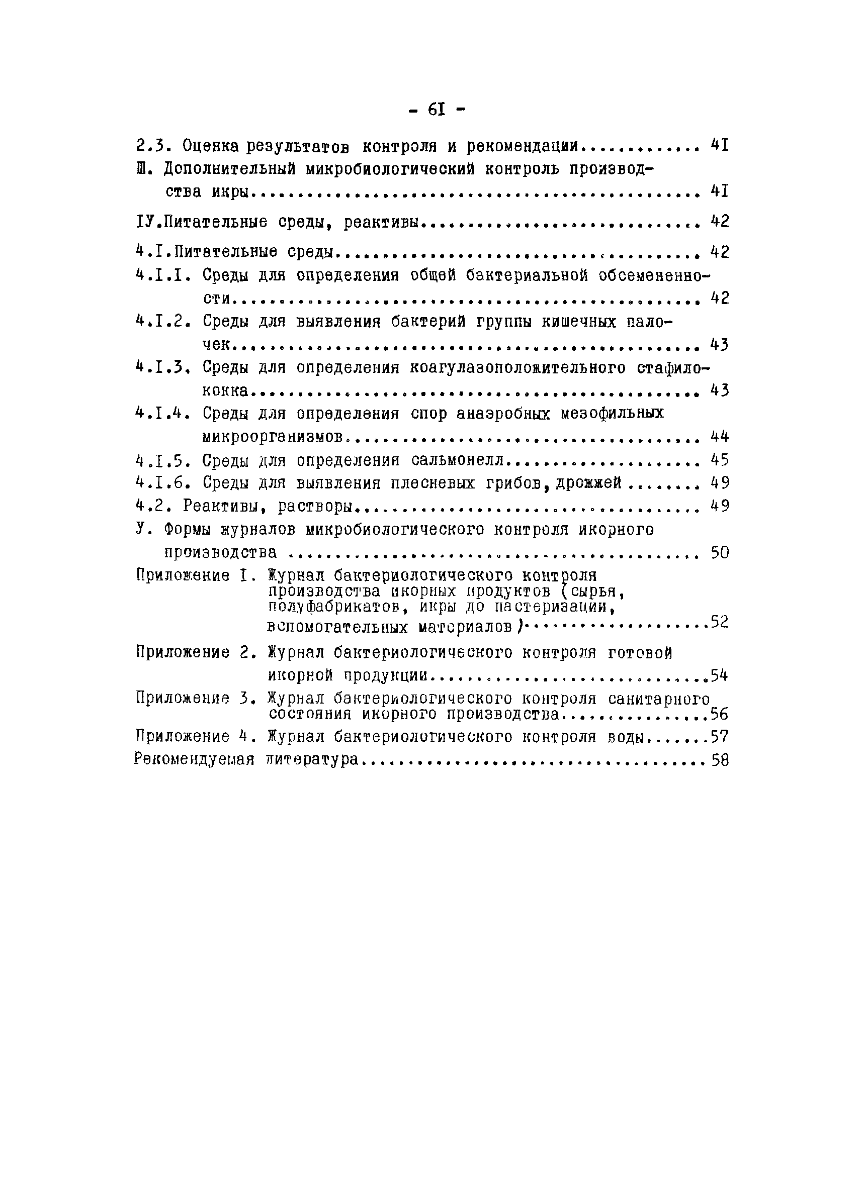 | Оглавление: | I. Профилактический микробиологический контроль производства икры (в том числе белковой) 1.1. Схема и периодичность контроля сырья и полуфабрикатов 1.2. Схема и периодичность контроля готовой продукции 1.3. Схема и периодичность контроля вспомогательных материалов 1.4. Отбор образцов и подготовка проб для анализа 1.5. Микробиологические исследования 1.6. Оценка результатов контроля и рекомендации II. Профилактический санитарно-микробиологический контроль икорного производства 2.1. Схема и периодичность контроля 2.2. Контроль санитарного состояния икорного производства 2.3. Оценка результатов контроля и рекомендации III. Дополнительный микробиологический контроль производства икры IV. Питательные среды, реактивы 4.1. Питательные среды 4.2. Реактивы, растворы V. Формы журналов микробиологического контроля икорного производства Приложение 1. Журнал бактериологического контроля производства икорных продуктов Приложение 2. Журнал бактериологического контроля готовой икорной продукции Приложение 3. Журнал бактериологического санитарного состояния икорного производства Приложение 4. Журнал бактериологического контроля воды Рекомендуемая литература |